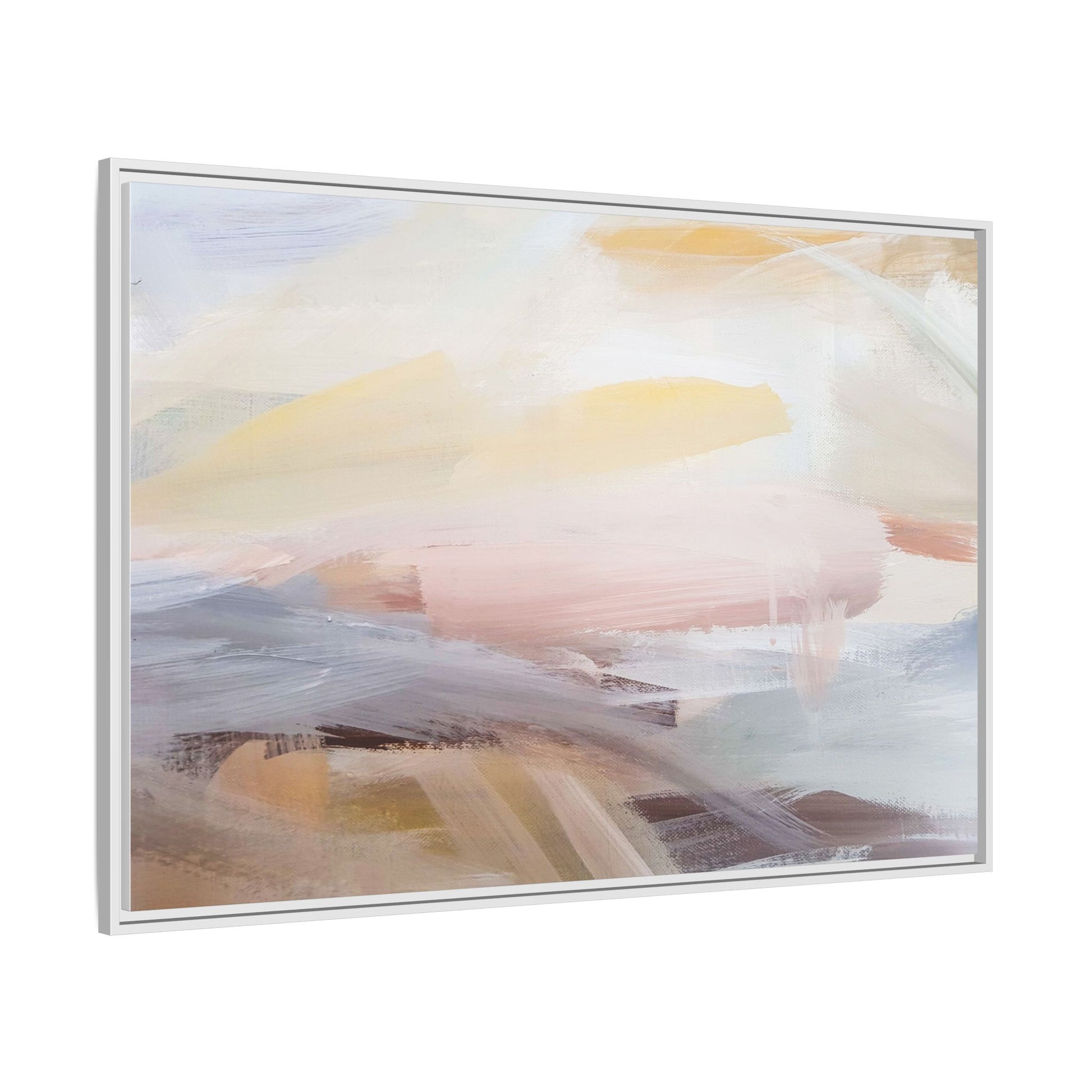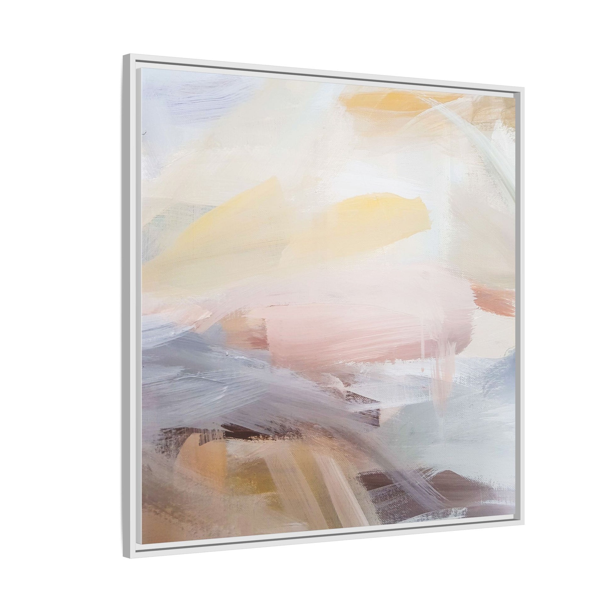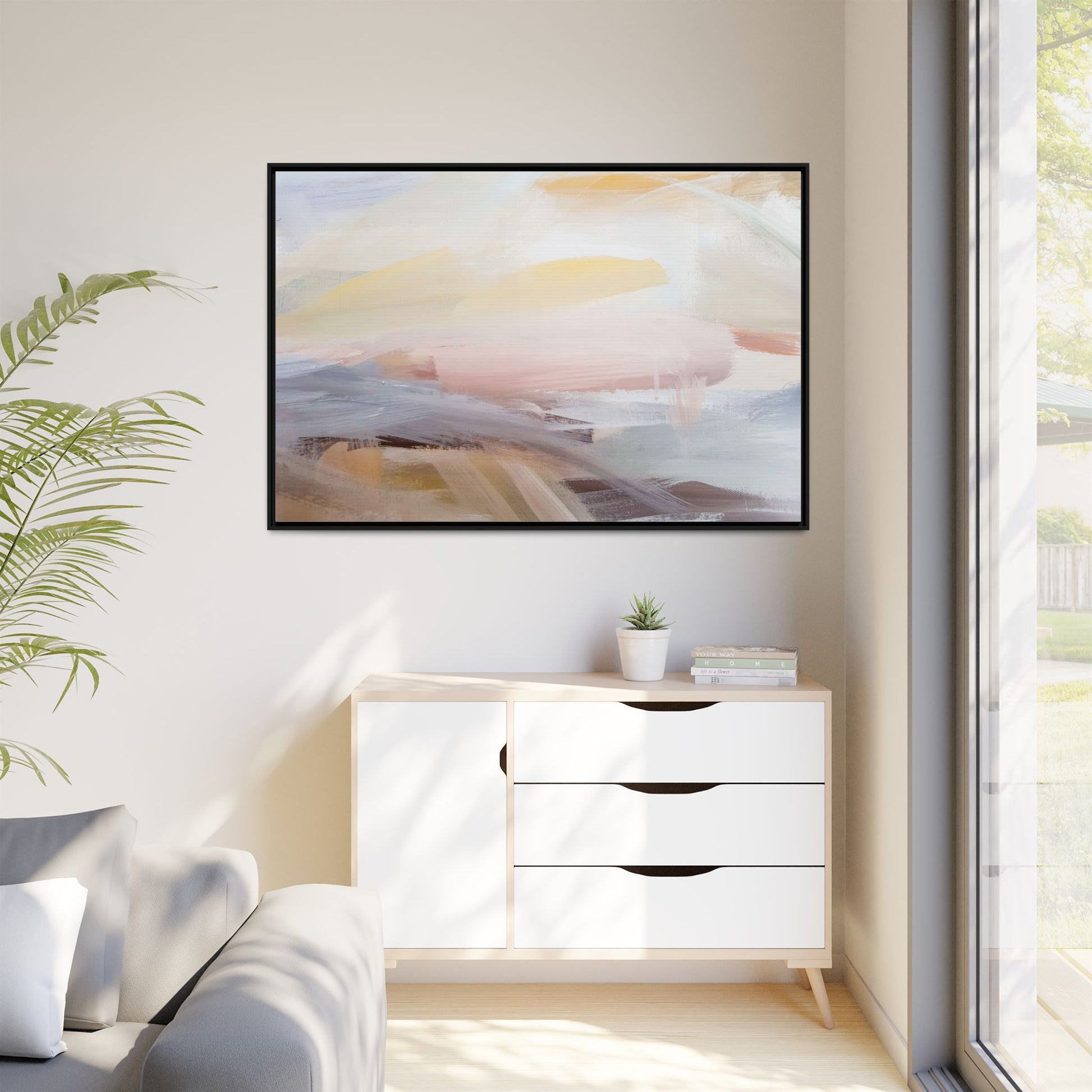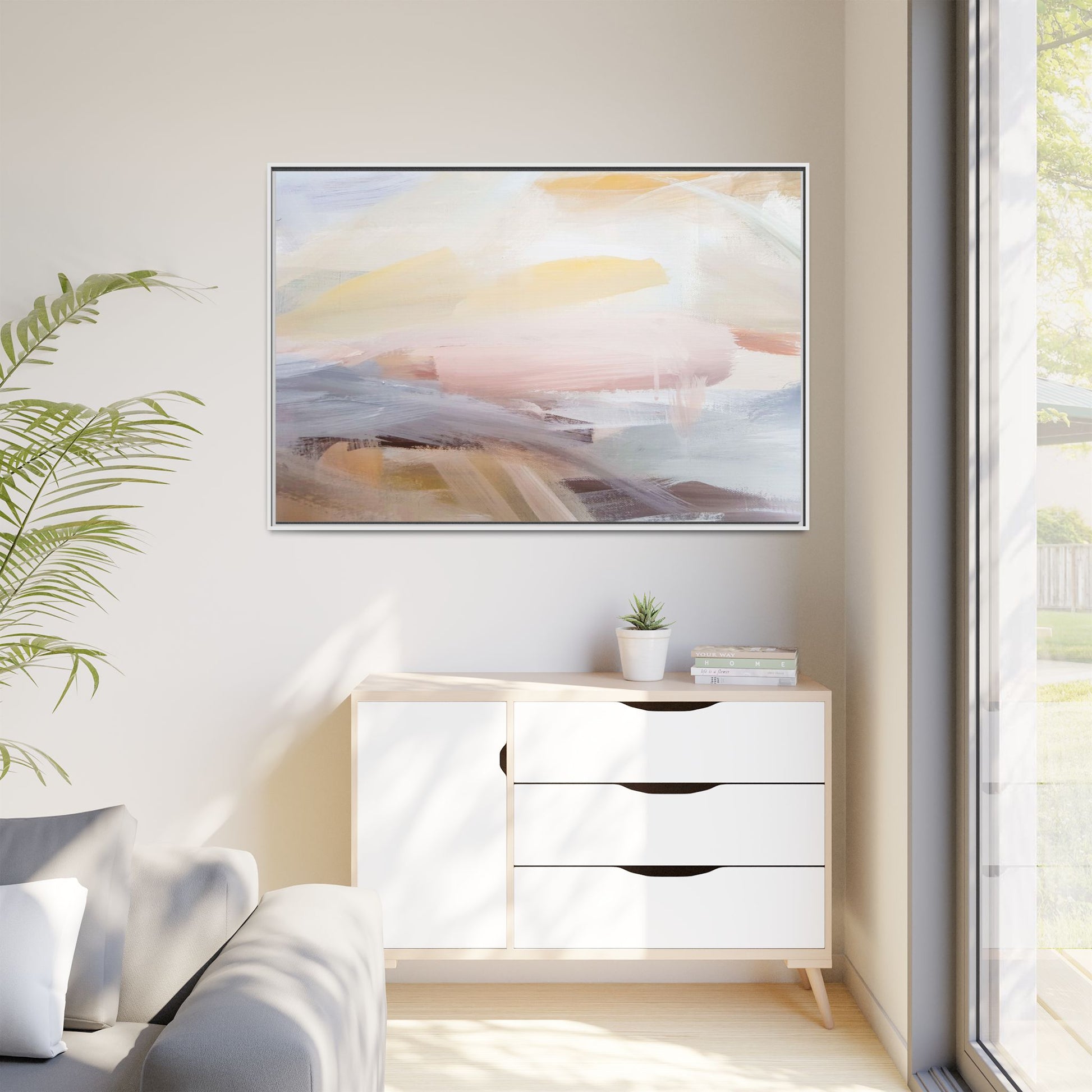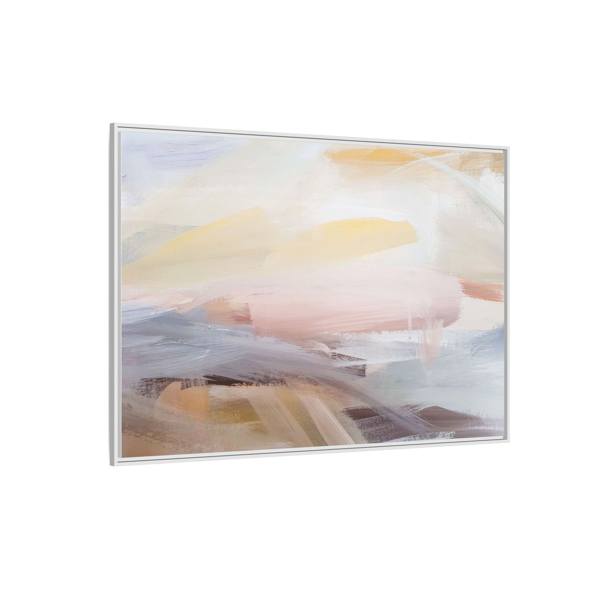 This captivating abstract painting showcases a delicate blend of soft, muted colors including pale yellows, blush pinks, cool blues, and subtle grays. The artwork features sweeping, layered brushstrokes that create a sense of movement and depth across the canvas, evoking a dreamlike and ethereal atmosphere. Textural elements are prominent, with visible brush marks and paint techniques that add dimension and visual interest to the composition. The color palette suggests a serene, contemplative mood, reminiscent of a misty landscape or a gentle sunrise. The overall style appears to be contemporary abstract, with an emphasis on fluid forms and harmonious color transitions that invite the viewer to interpret the piece through their own emotional lens.
