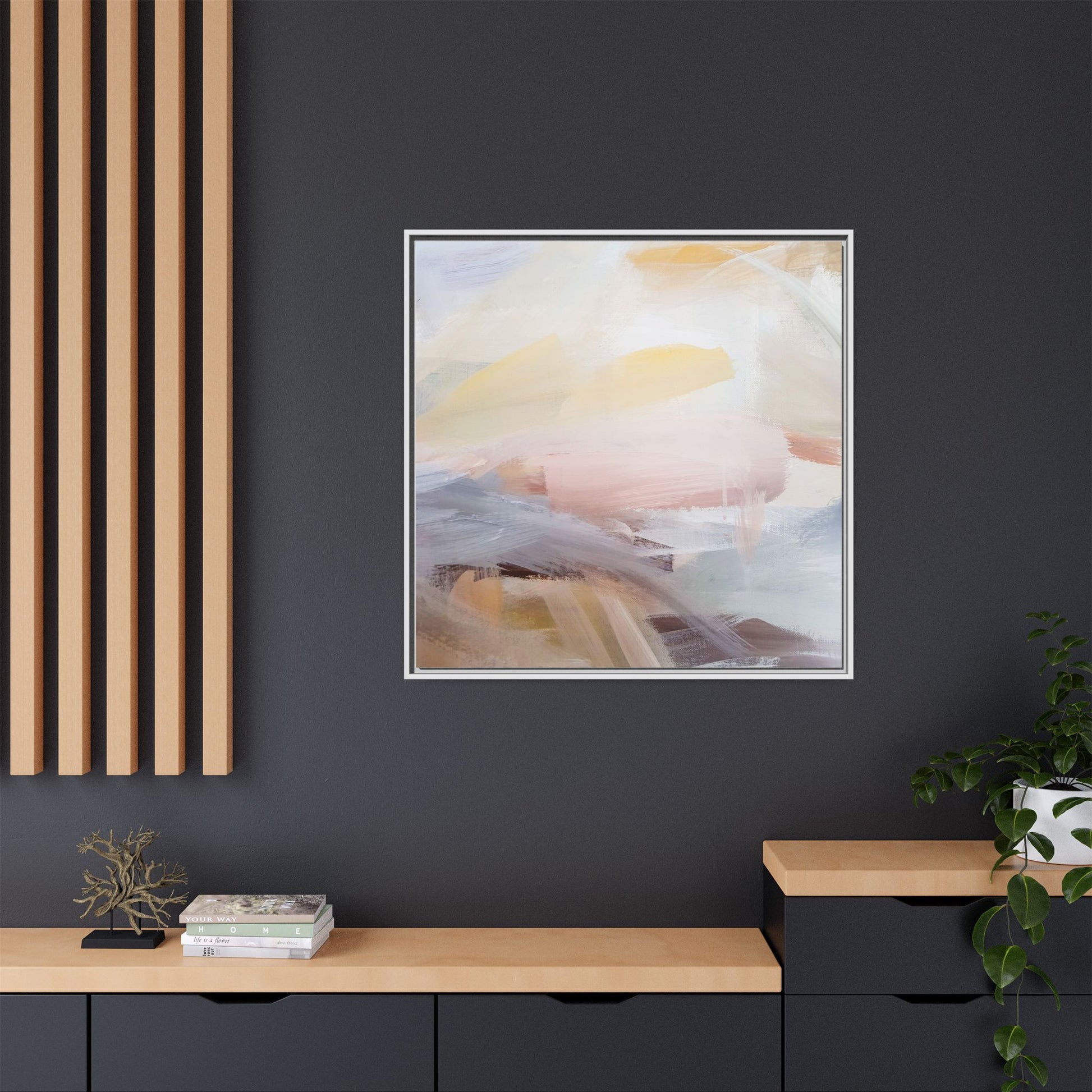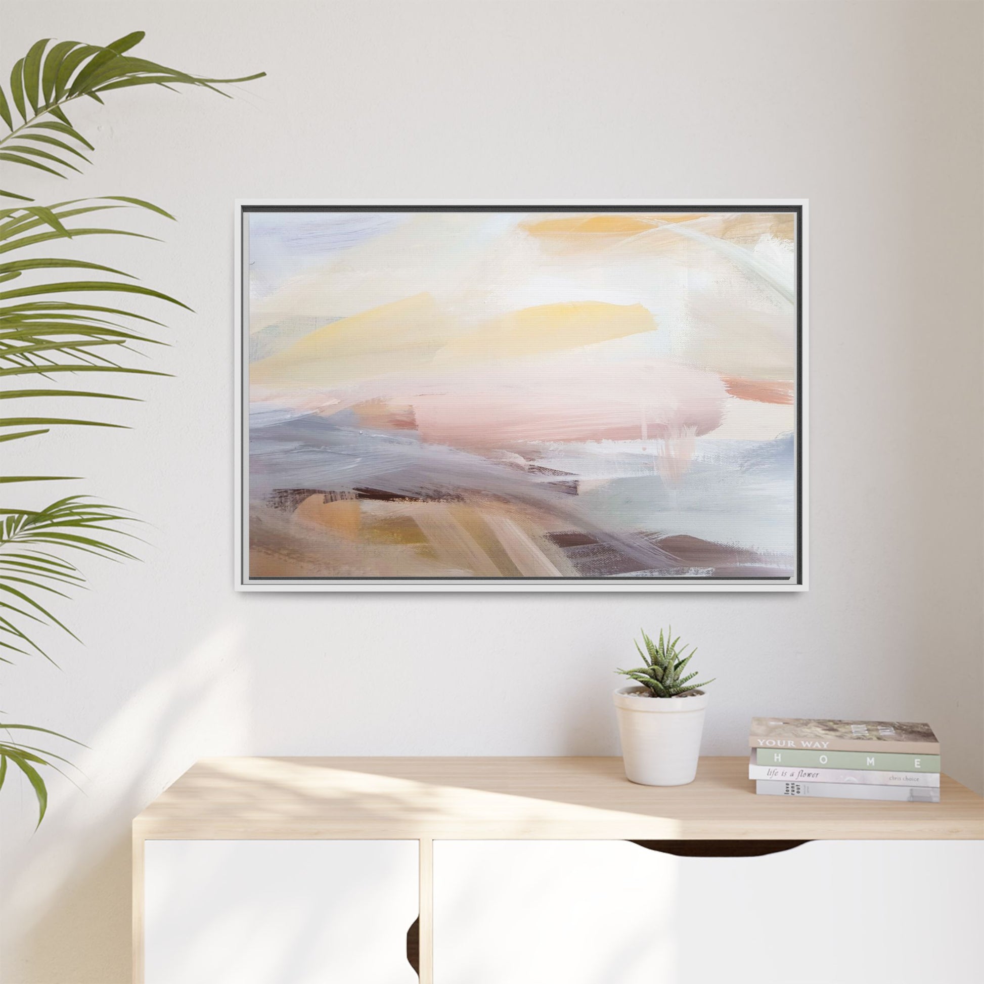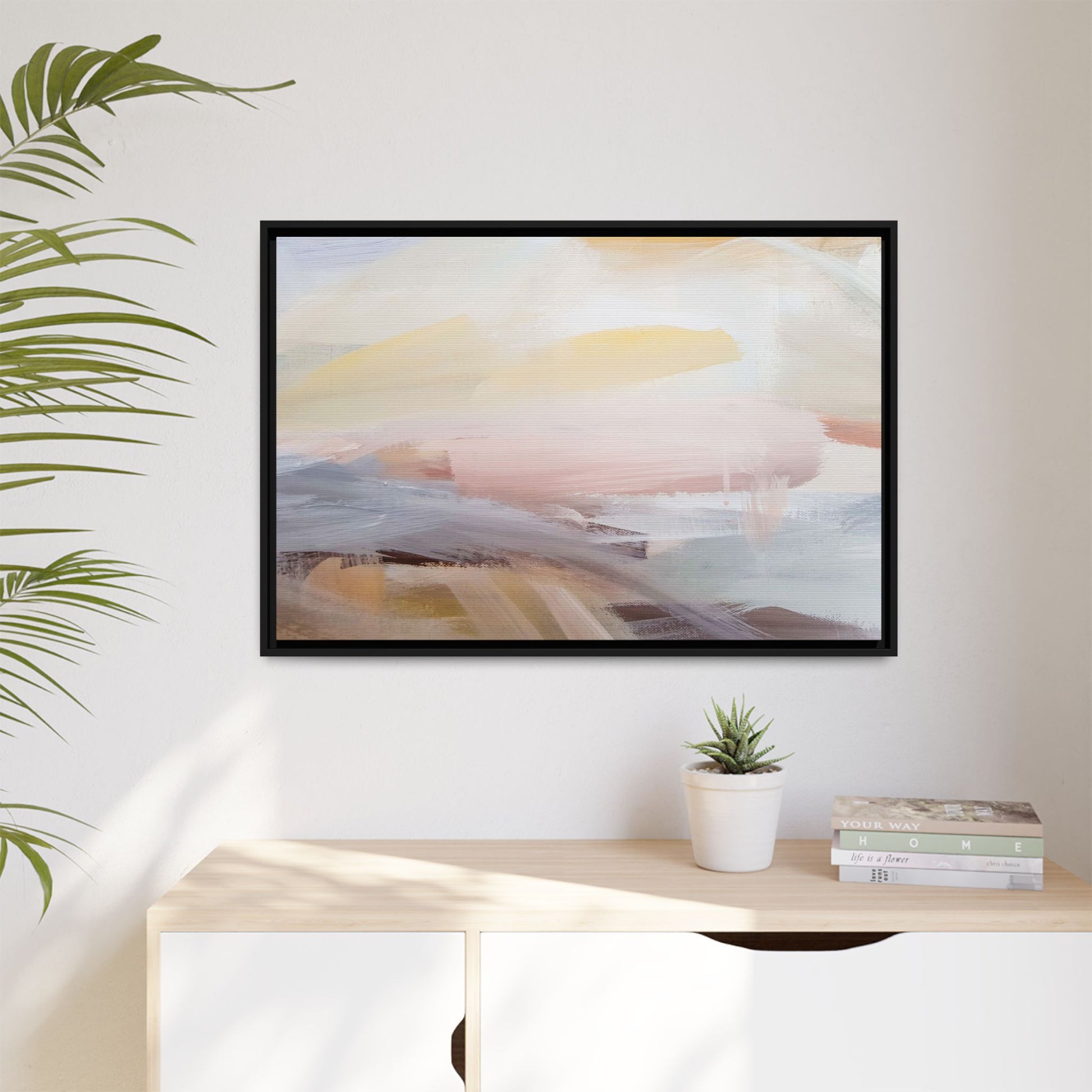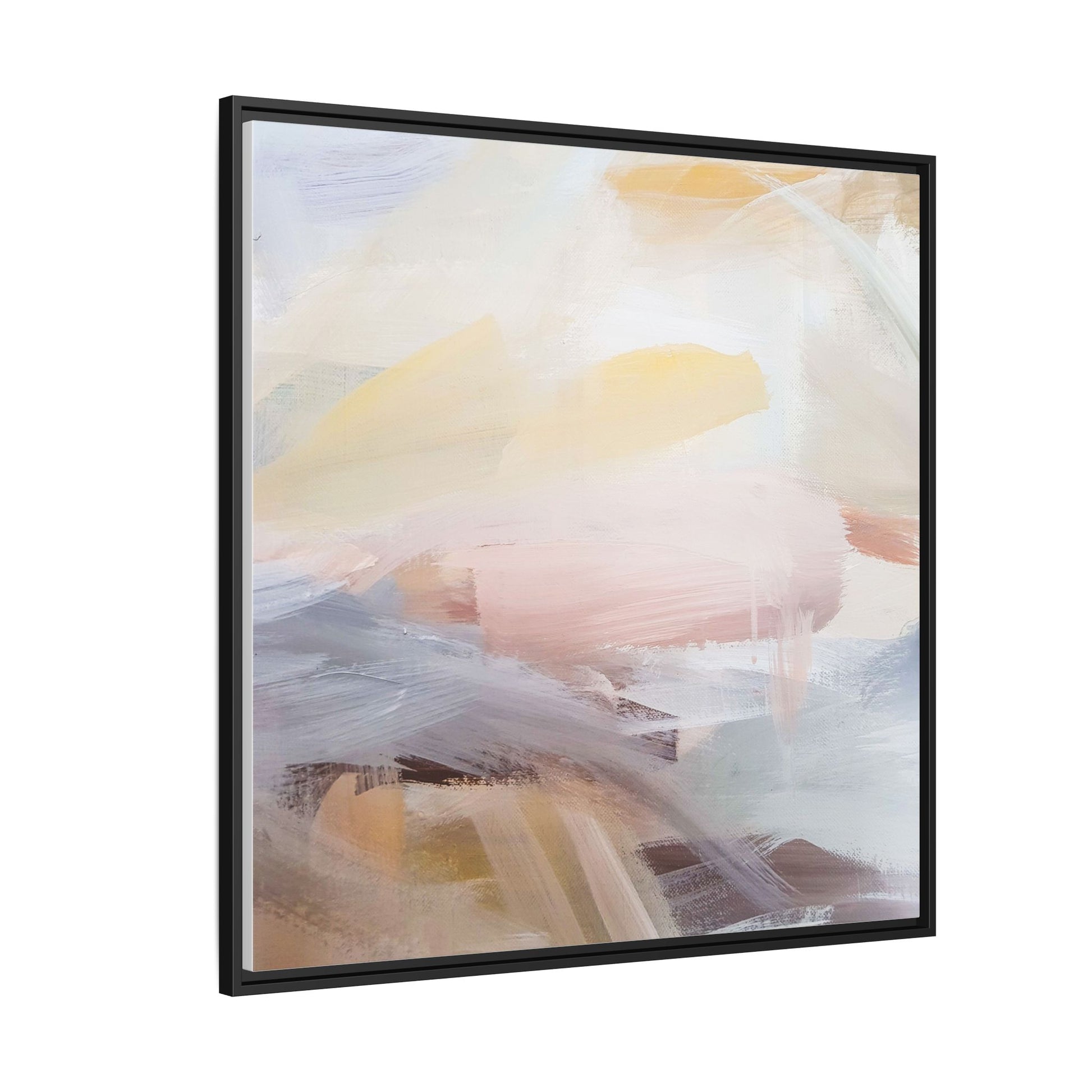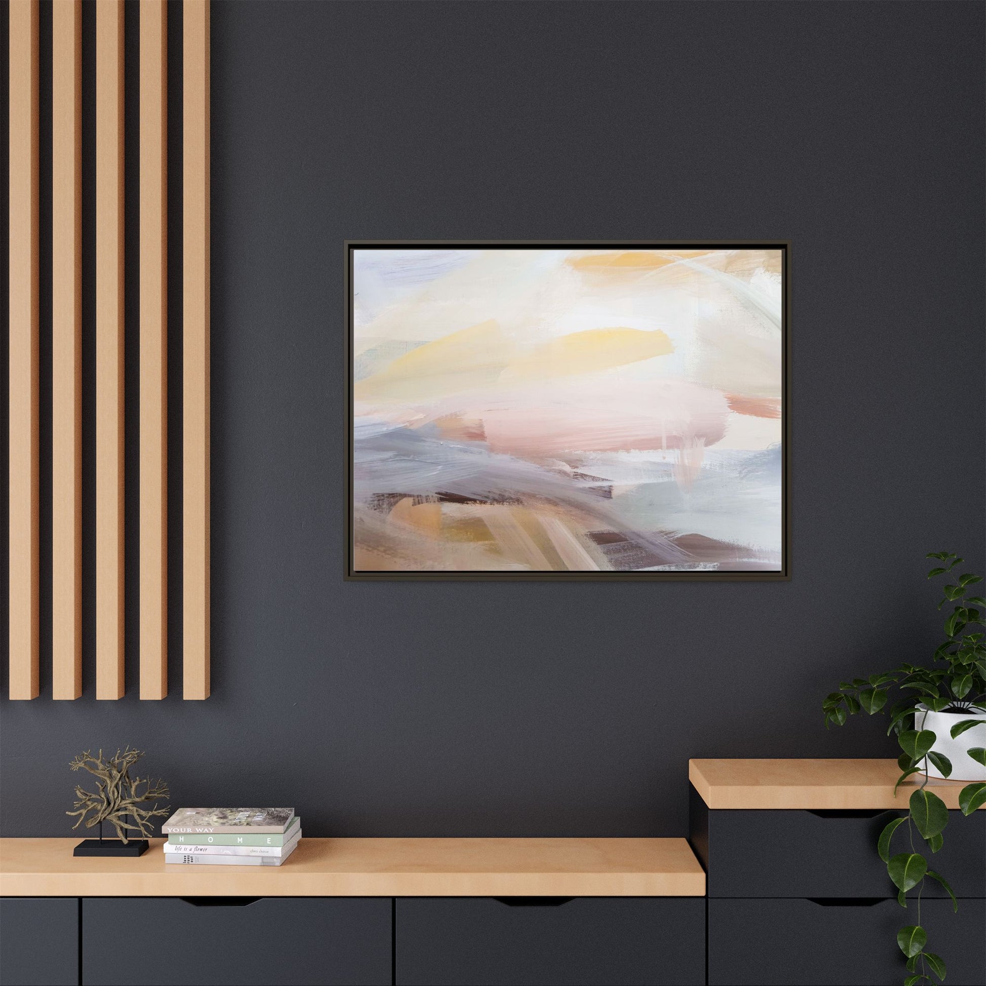 This captivating abstract painting showcases a delicate blend of soft, muted colors including pale yellows, blush pinks, cool blues, and subtle grays. The artwork features sweeping, layered brushstrokes that create a sense of movement and depth across the canvas, evoking a dreamlike and ethereal atmosphere. Textural elements are prominent, with visible brush marks and paint techniques that add dimension and visual interest to the composition. The color palette suggests a serene, contemplative mood, reminiscent of a misty landscape or a gentle sunrise. The overall style appears to be contemporary abstract, with an emphasis on fluid forms and harmonious color transitions that invite the viewer to interpret the piece through their own emotional lens.