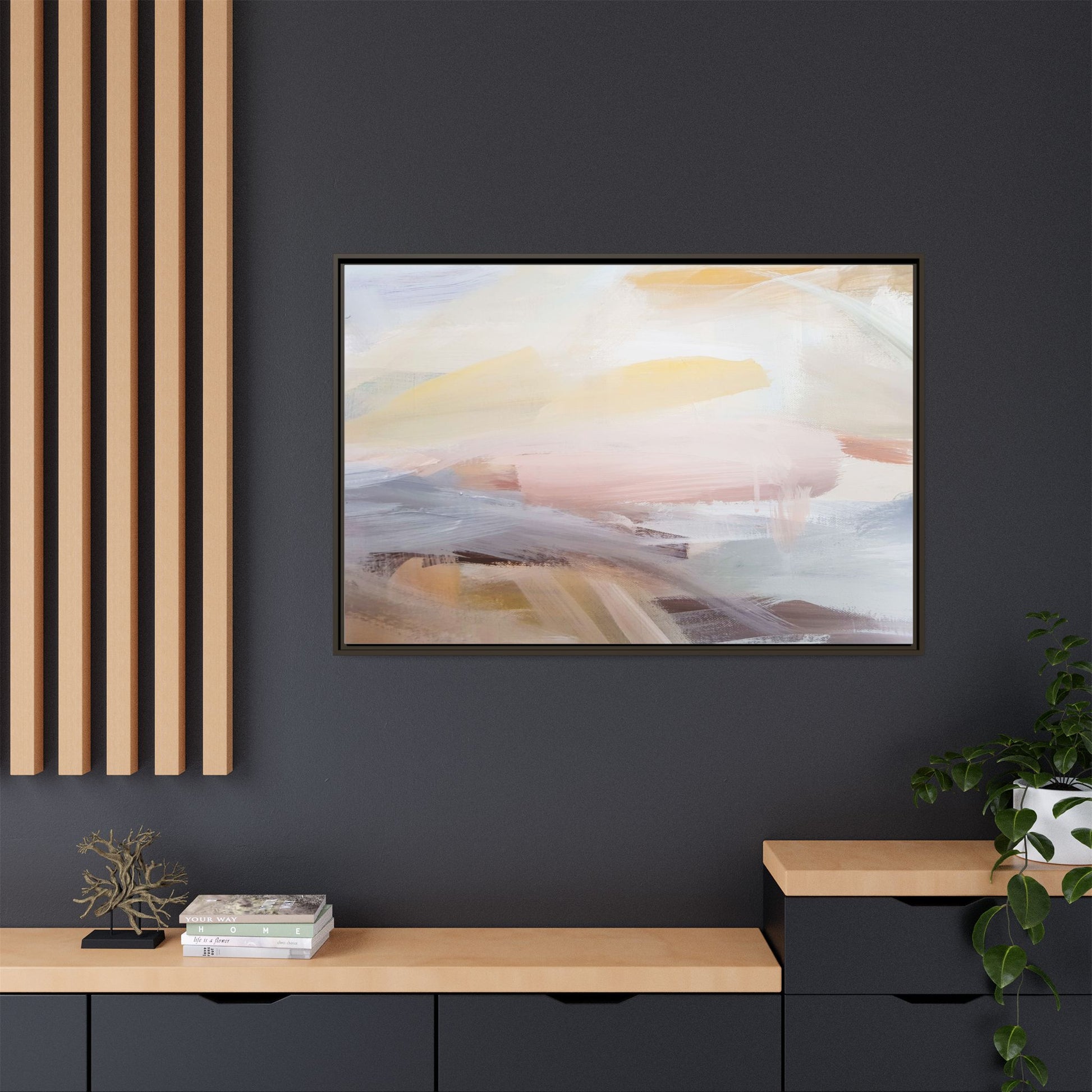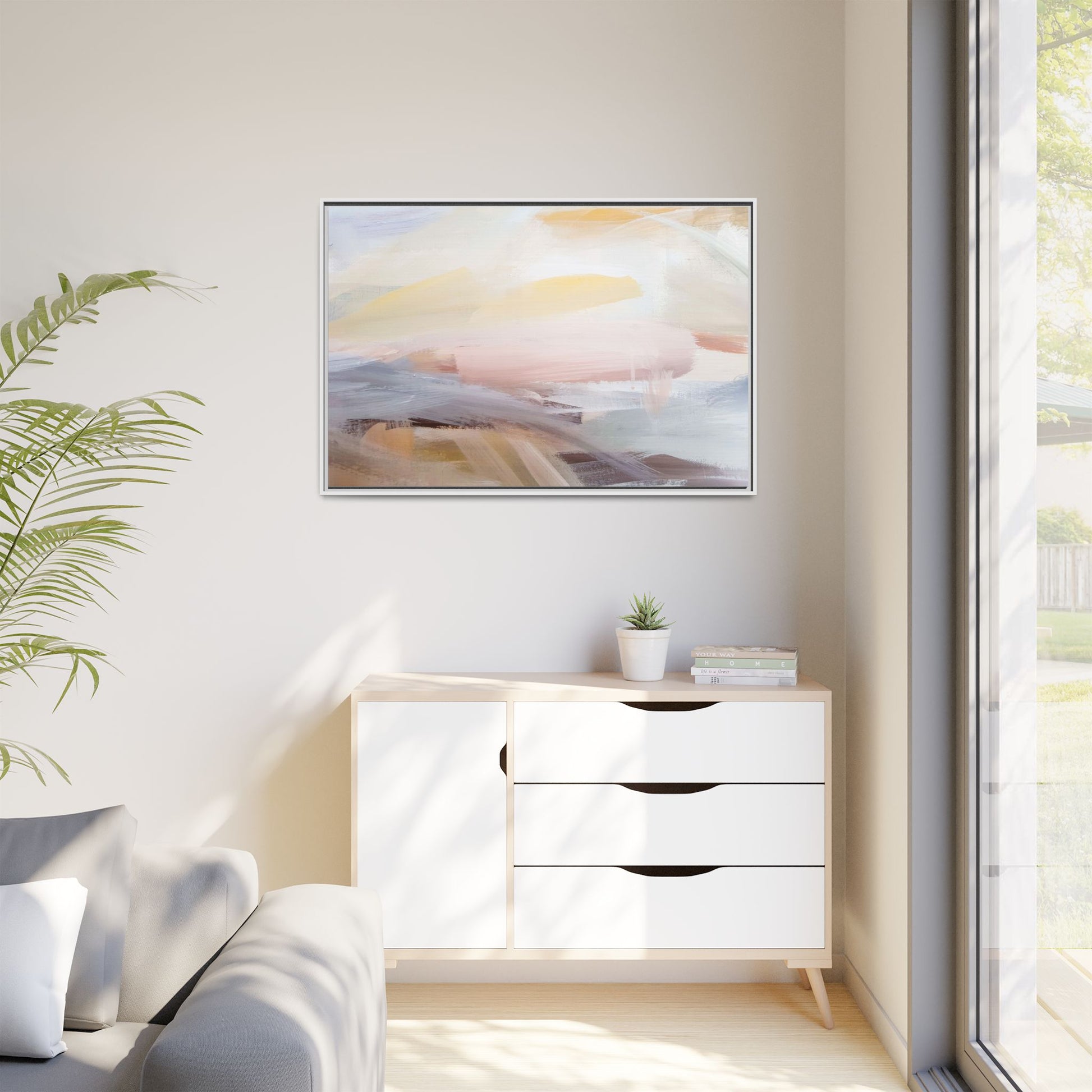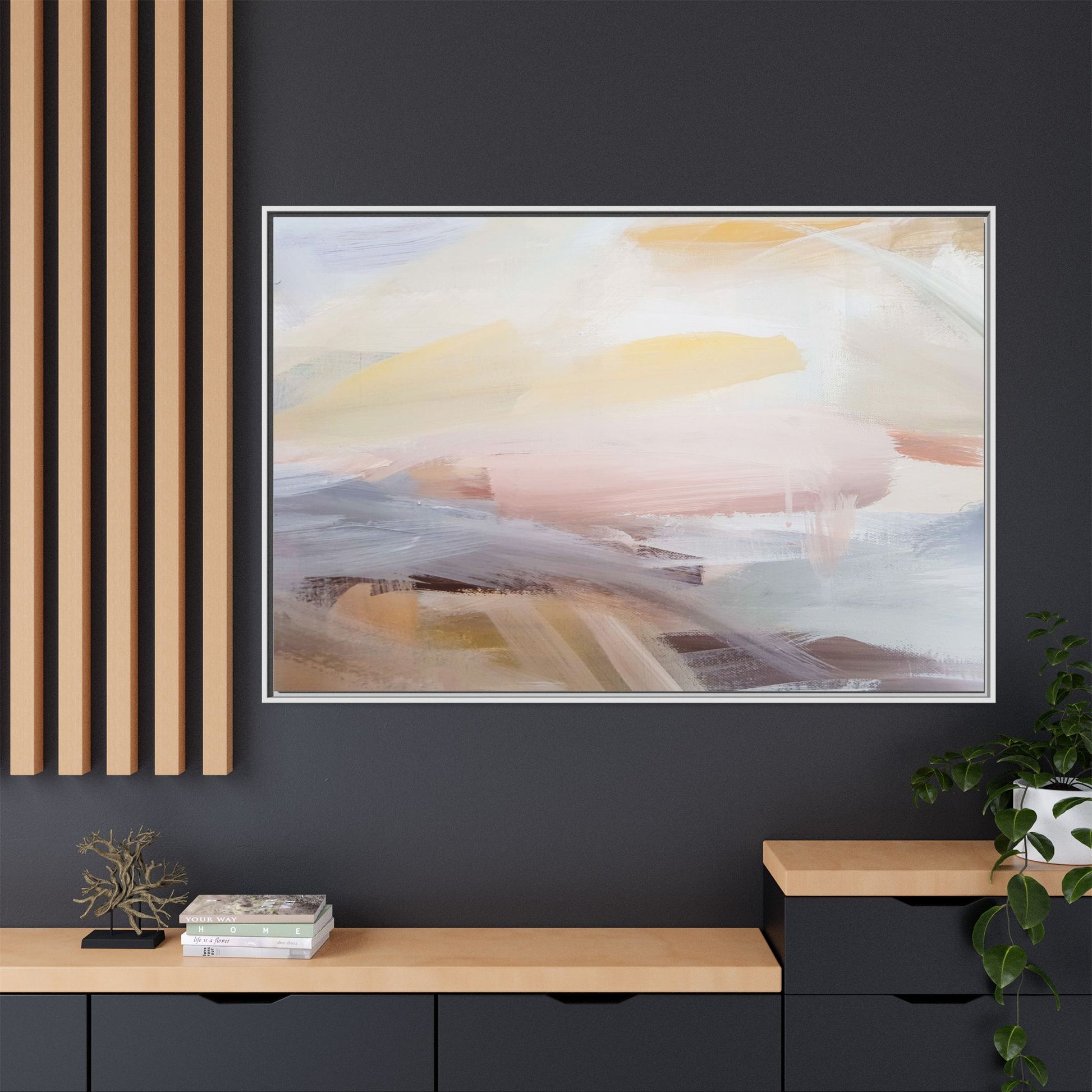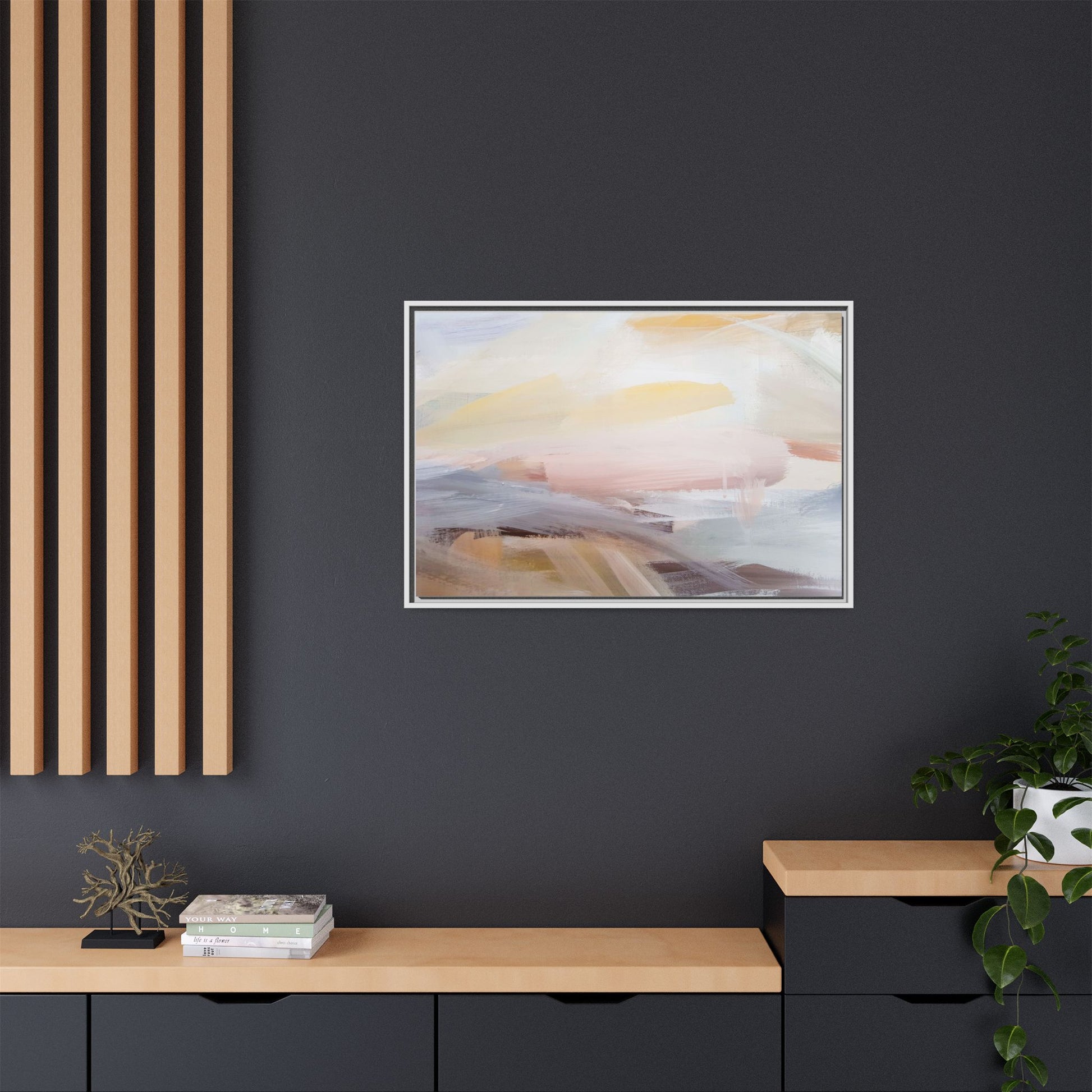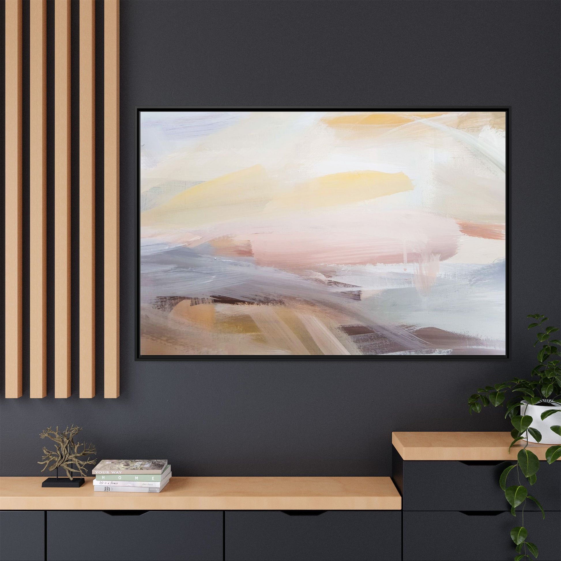 This captivating abstract painting showcases a delicate blend of soft, muted colors including pale yellows, blush pinks, cool blues, and subtle grays. The artwork features sweeping, layered brushstrokes that create a sense of movement and depth across the canvas, evoking a dreamlike and ethereal atmosphere. Textural elements are prominent, with visible brush marks and paint techniques that add dimension and visual interest to the composition. The color palette suggests a serene, contemplative mood, reminiscent of a misty landscape or a gentle sunrise. The overall style appears to be contemporary abstract, with an emphasis on fluid forms and harmonious color transitions that invite the viewer to interpret the piece through their own emotional lens.