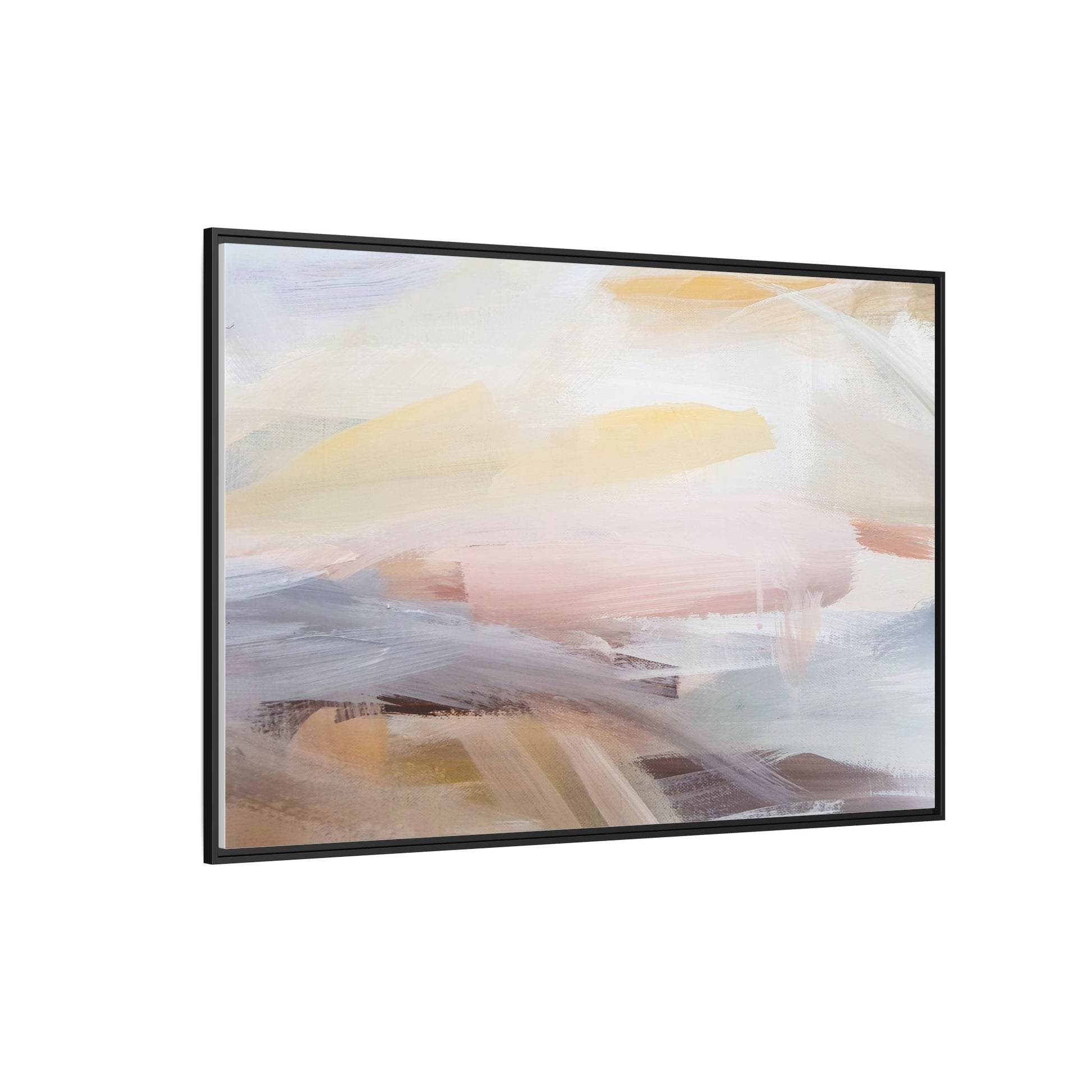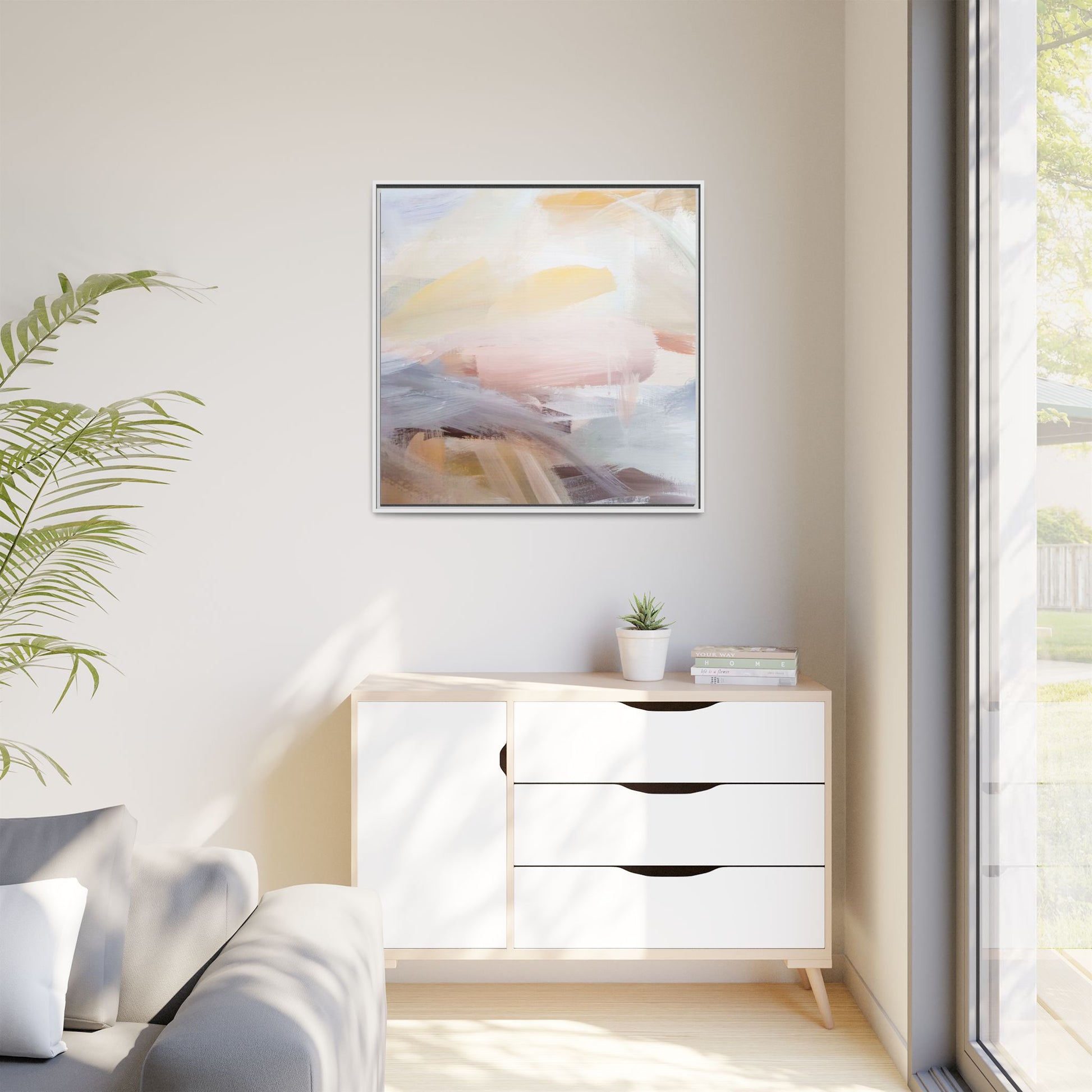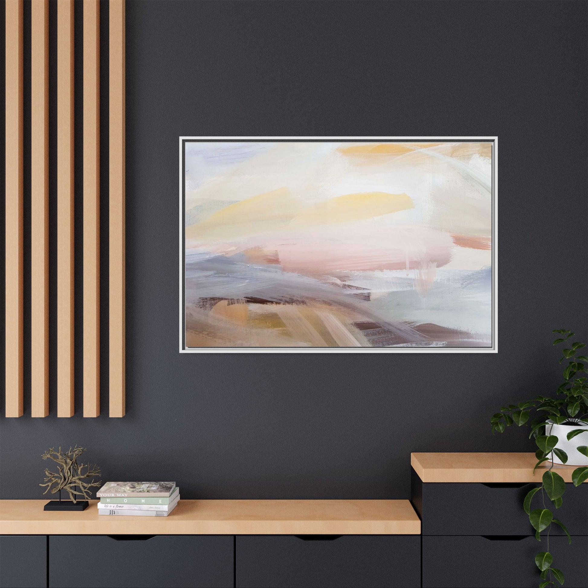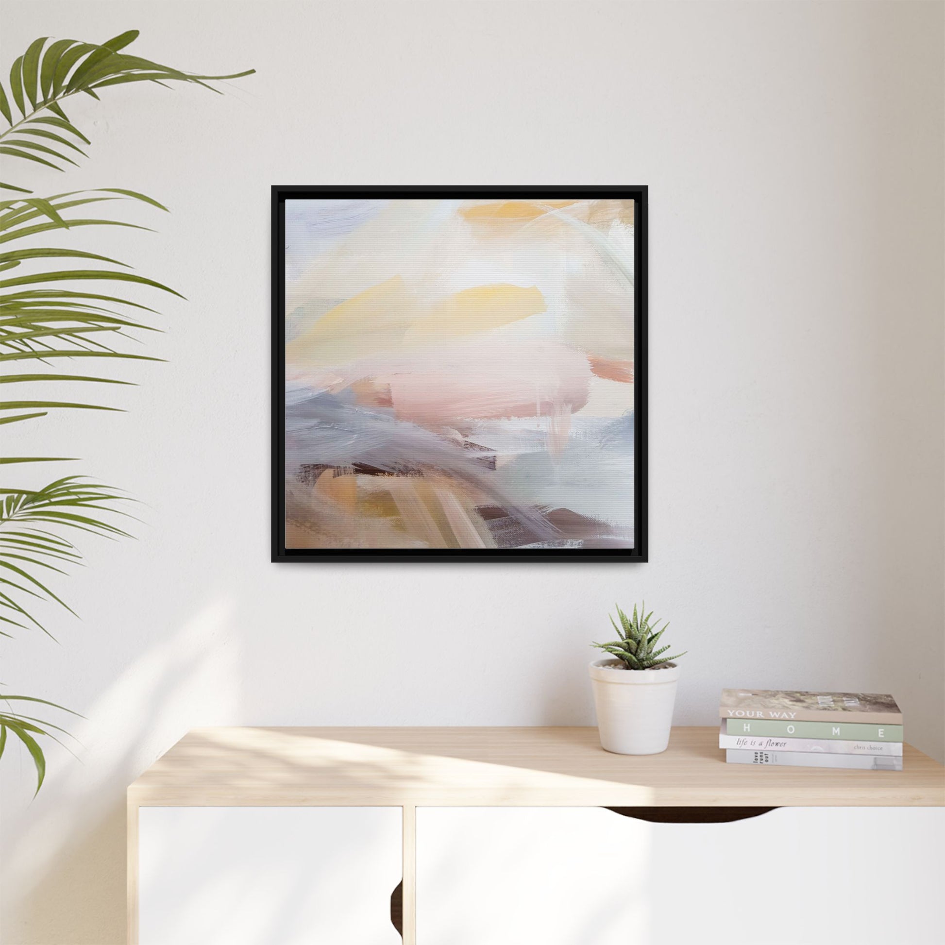 This captivating abstract painting showcases a delicate blend of soft, muted colors including pale yellows, blush pinks, cool blues, and subtle grays. The artwork features sweeping, layered brushstrokes that create a sense of movement and depth across the canvas, evoking a dreamlike and ethereal atmosphere. Textural elements are prominent, with visible brush marks and paint techniques that add dimension and visual interest to the composition. The color palette suggests a serene, contemplative mood, reminiscent of a misty landscape or a gentle sunrise. The overall style appears to be contemporary abstract, with an emphasis on fluid forms and harmonious color transitions that invite the viewer to interpret the piece through their own emotional lens.
