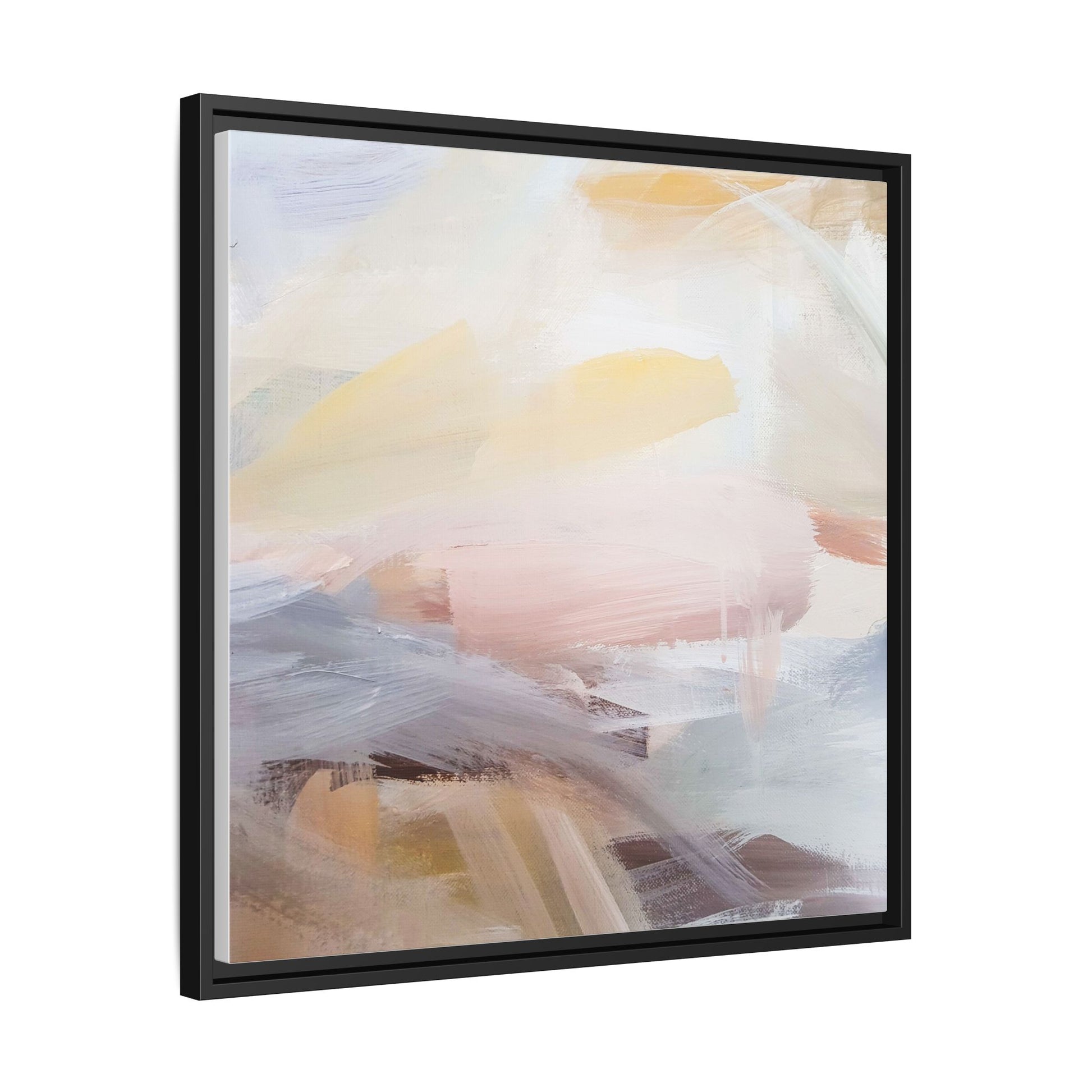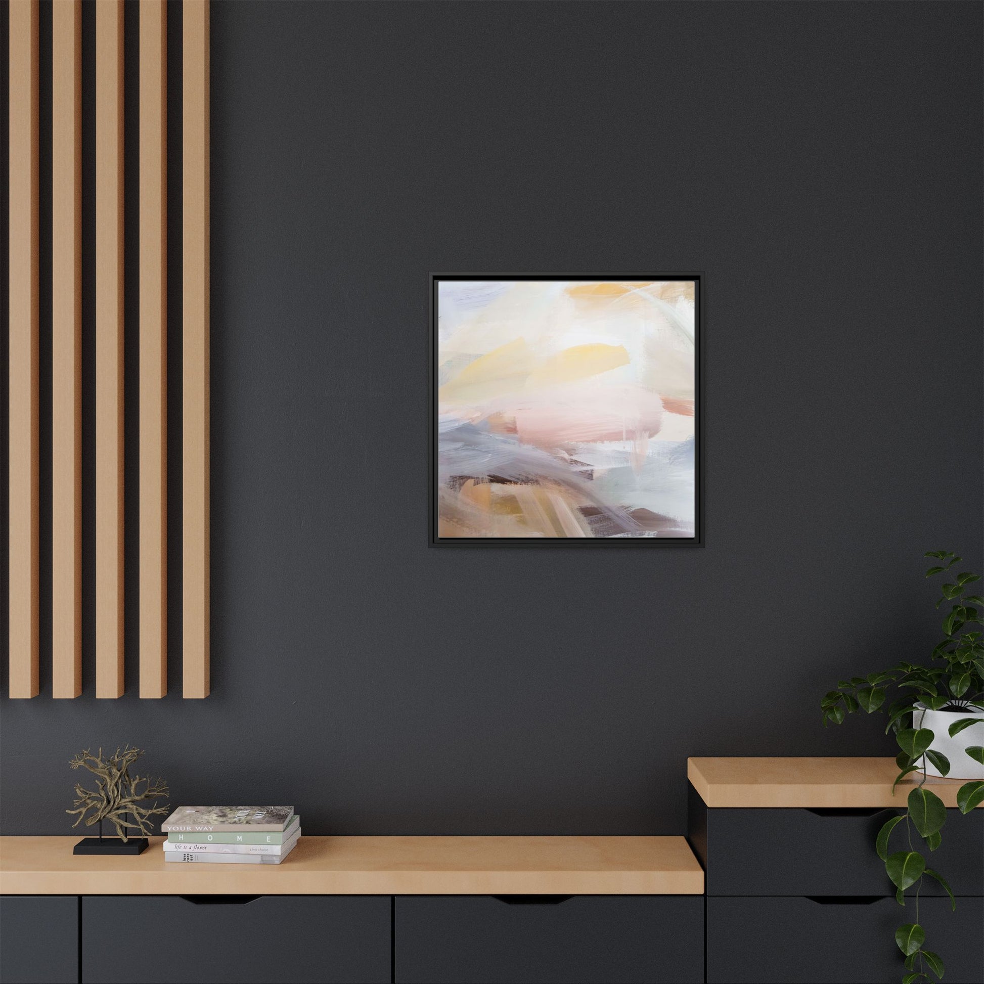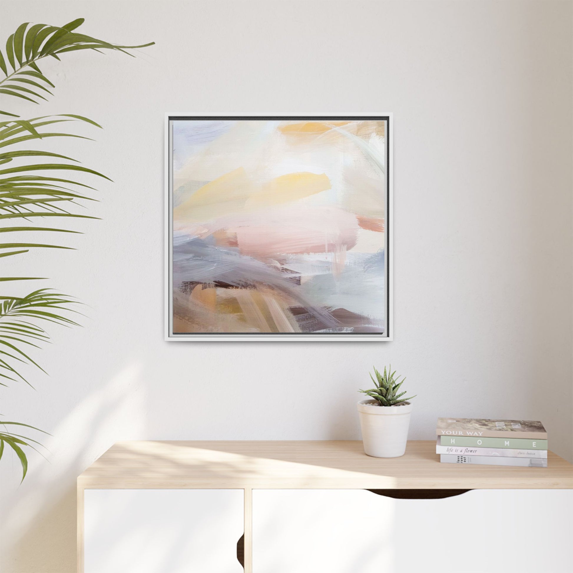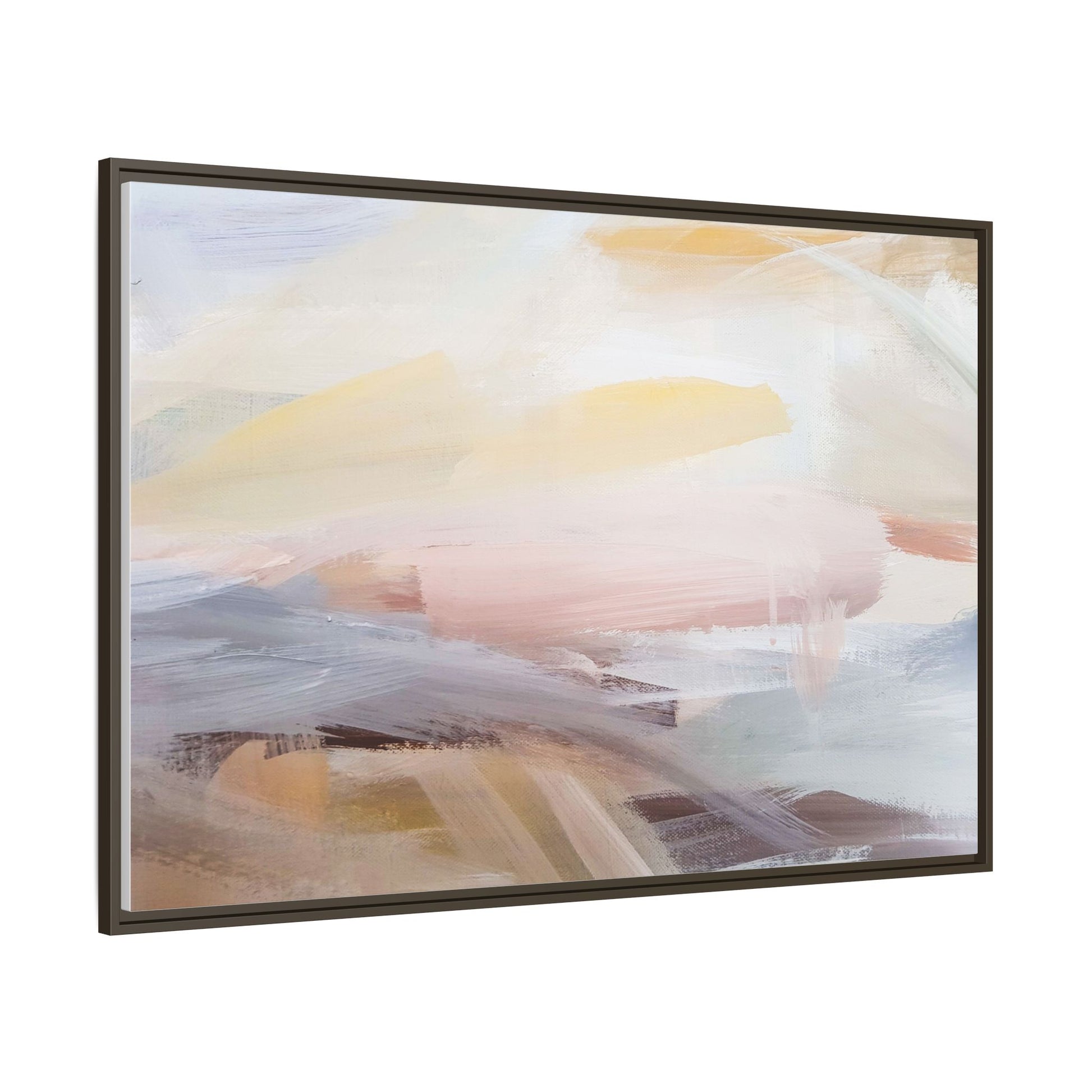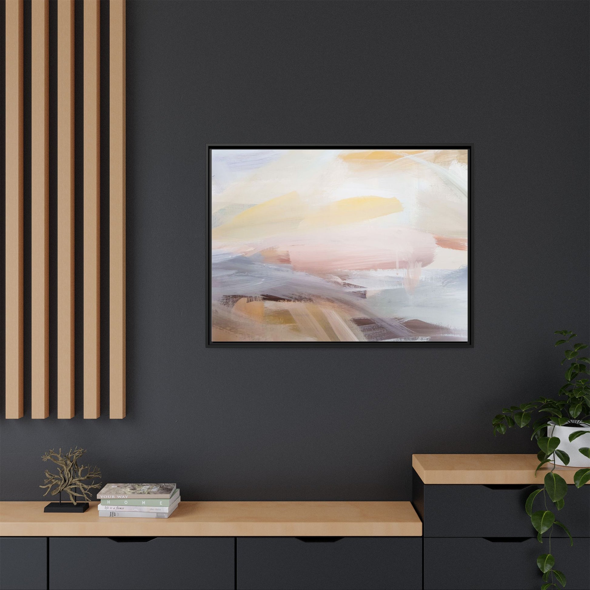 This captivating abstract painting showcases a delicate blend of soft, muted colors including pale yellows, blush pinks, cool blues, and subtle grays. The artwork features sweeping, layered brushstrokes that create a sense of movement and depth across the canvas, evoking a dreamlike and ethereal atmosphere. Textural elements are prominent, with visible brush marks and paint techniques that add dimension and visual interest to the composition. The color palette suggests a serene, contemplative mood, reminiscent of a misty landscape or a gentle sunrise. The overall style appears to be contemporary abstract, with an emphasis on fluid forms and harmonious color transitions that invite the viewer to interpret the piece through their own emotional lens.