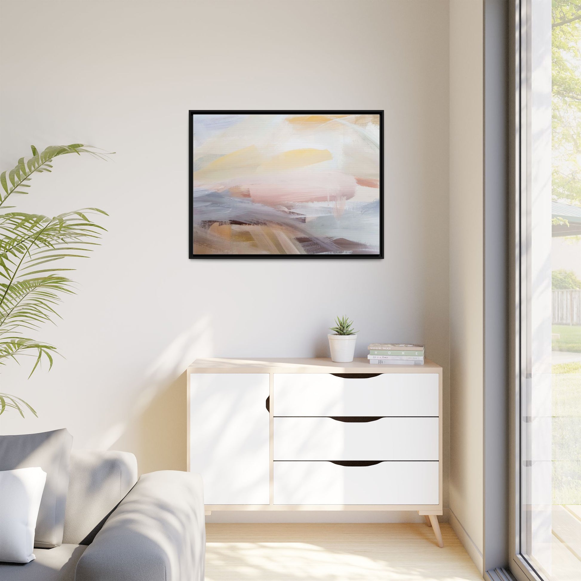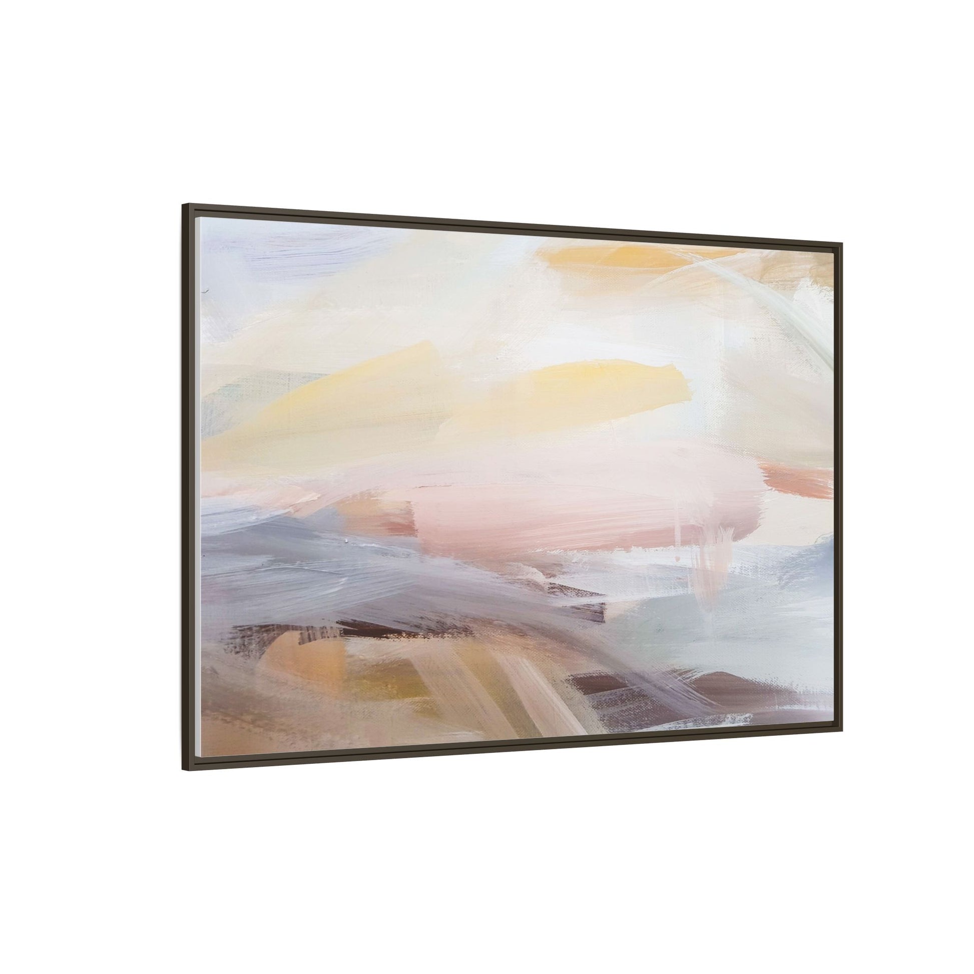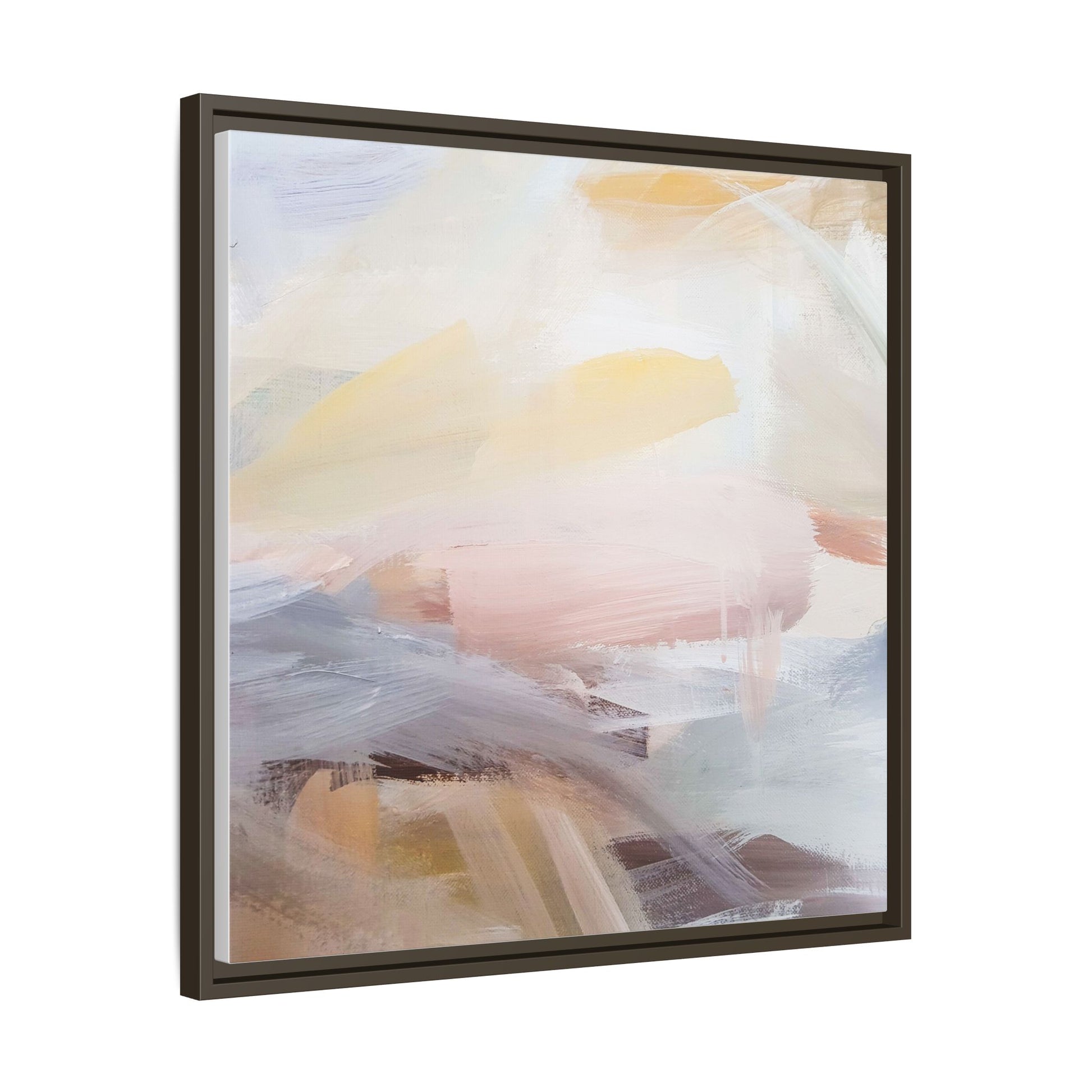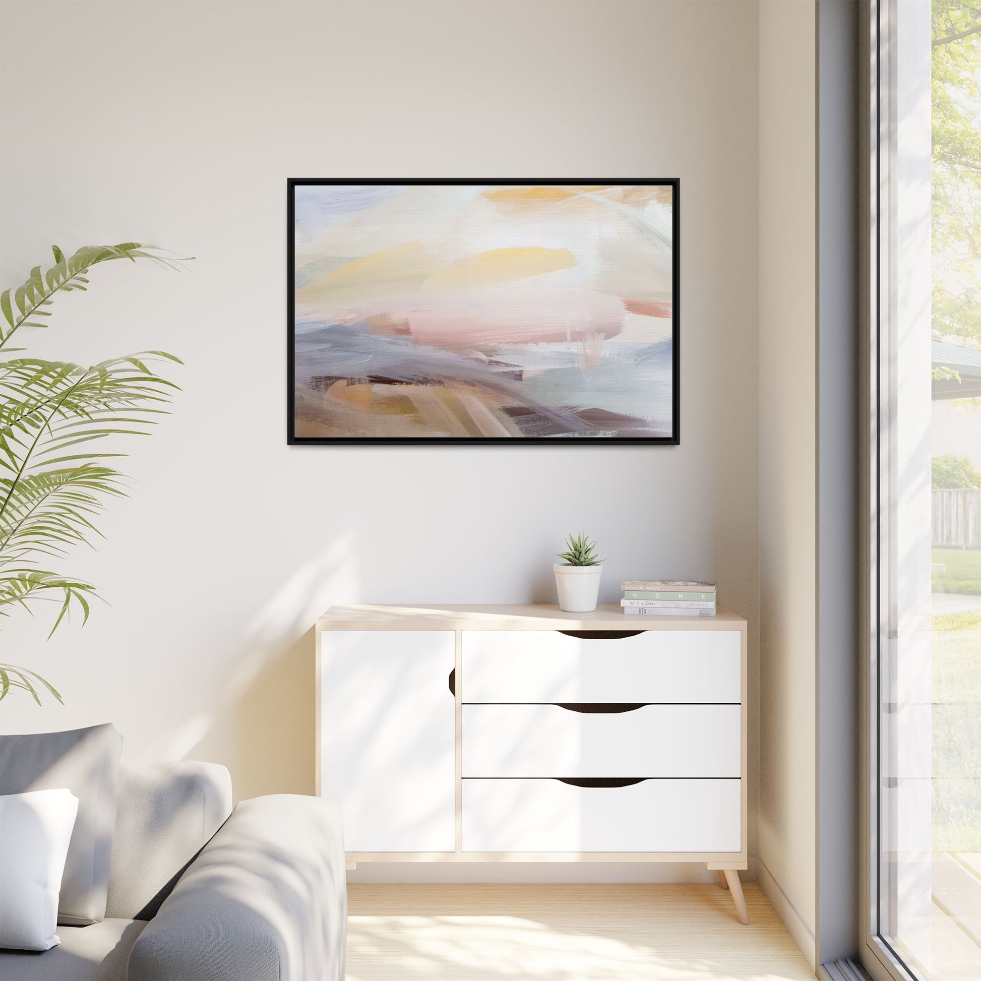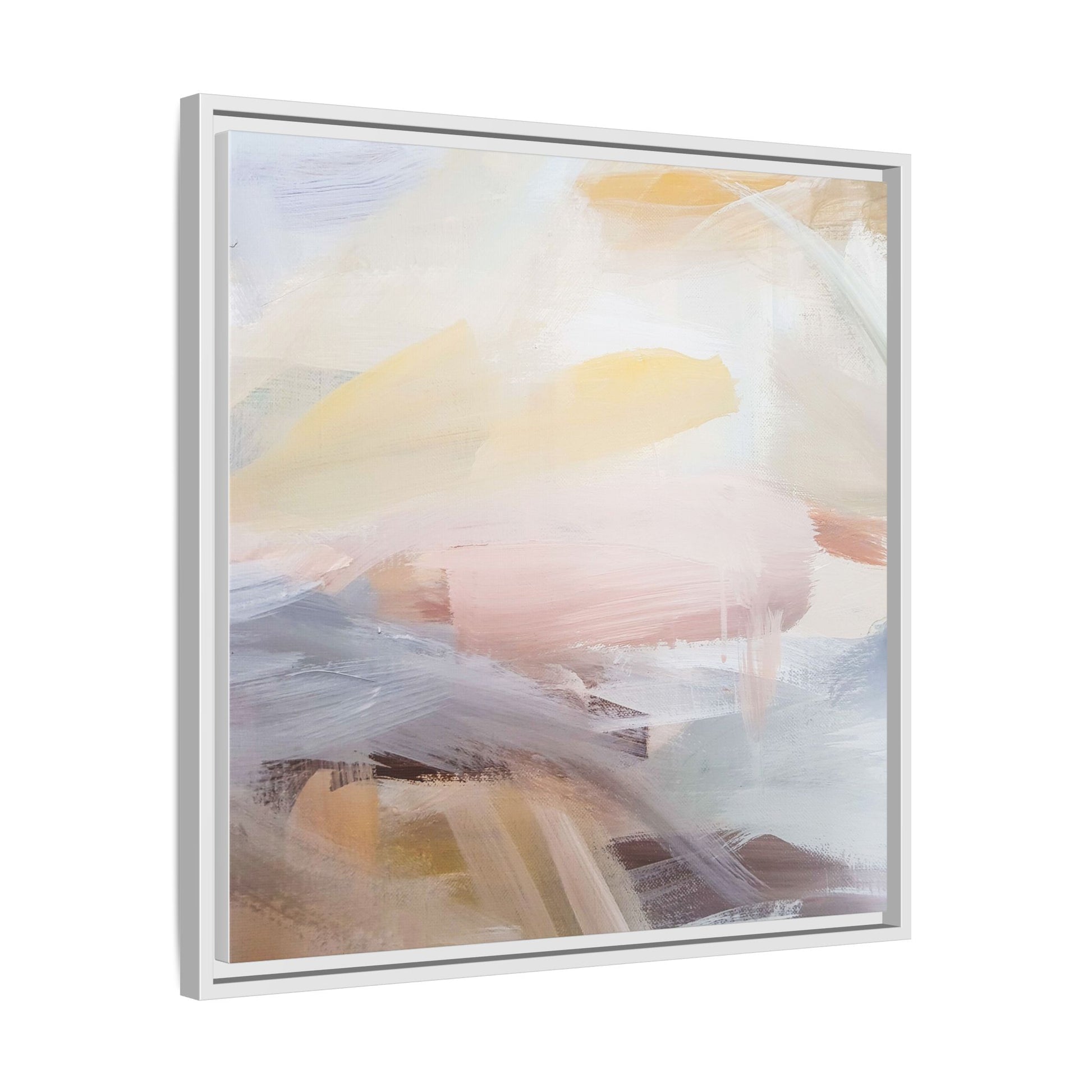 This captivating abstract painting showcases a delicate blend of soft, muted colors including pale yellows, blush pinks, cool blues, and subtle grays. The artwork features sweeping, layered brushstrokes that create a sense of movement and depth across the canvas, evoking a dreamlike and ethereal atmosphere. Textural elements are prominent, with visible brush marks and paint techniques that add dimension and visual interest to the composition. The color palette suggests a serene, contemplative mood, reminiscent of a misty landscape or a gentle sunrise. The overall style appears to be contemporary abstract, with an emphasis on fluid forms and harmonious color transitions that invite the viewer to interpret the piece through their own emotional lens.