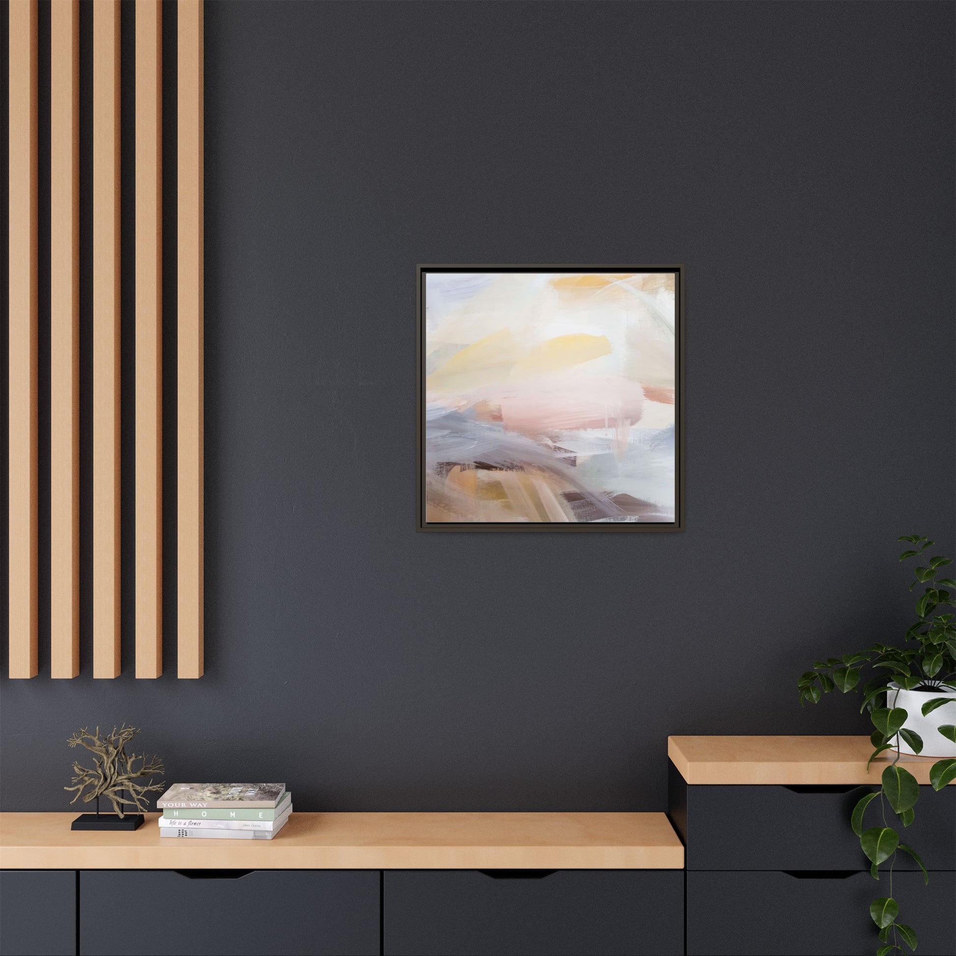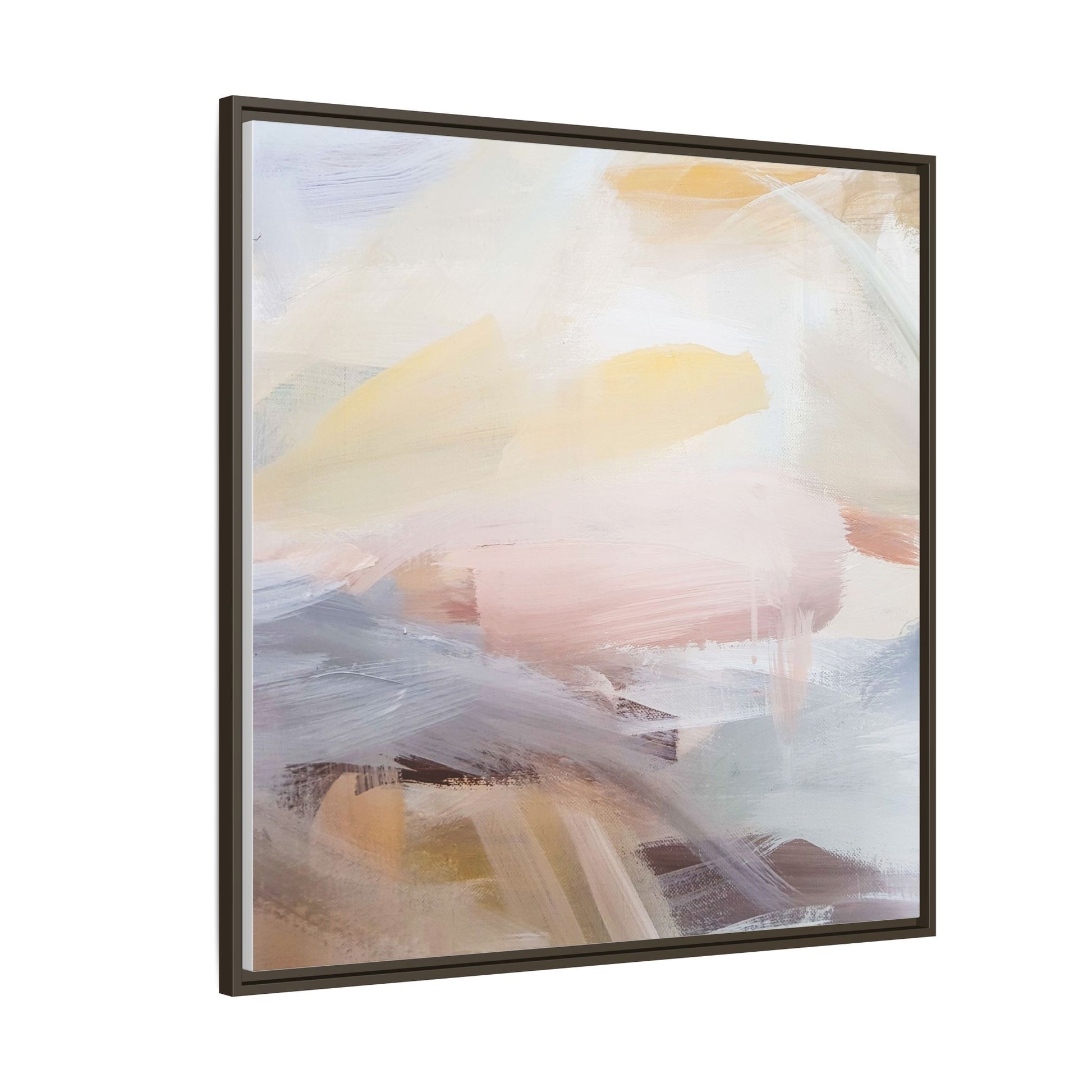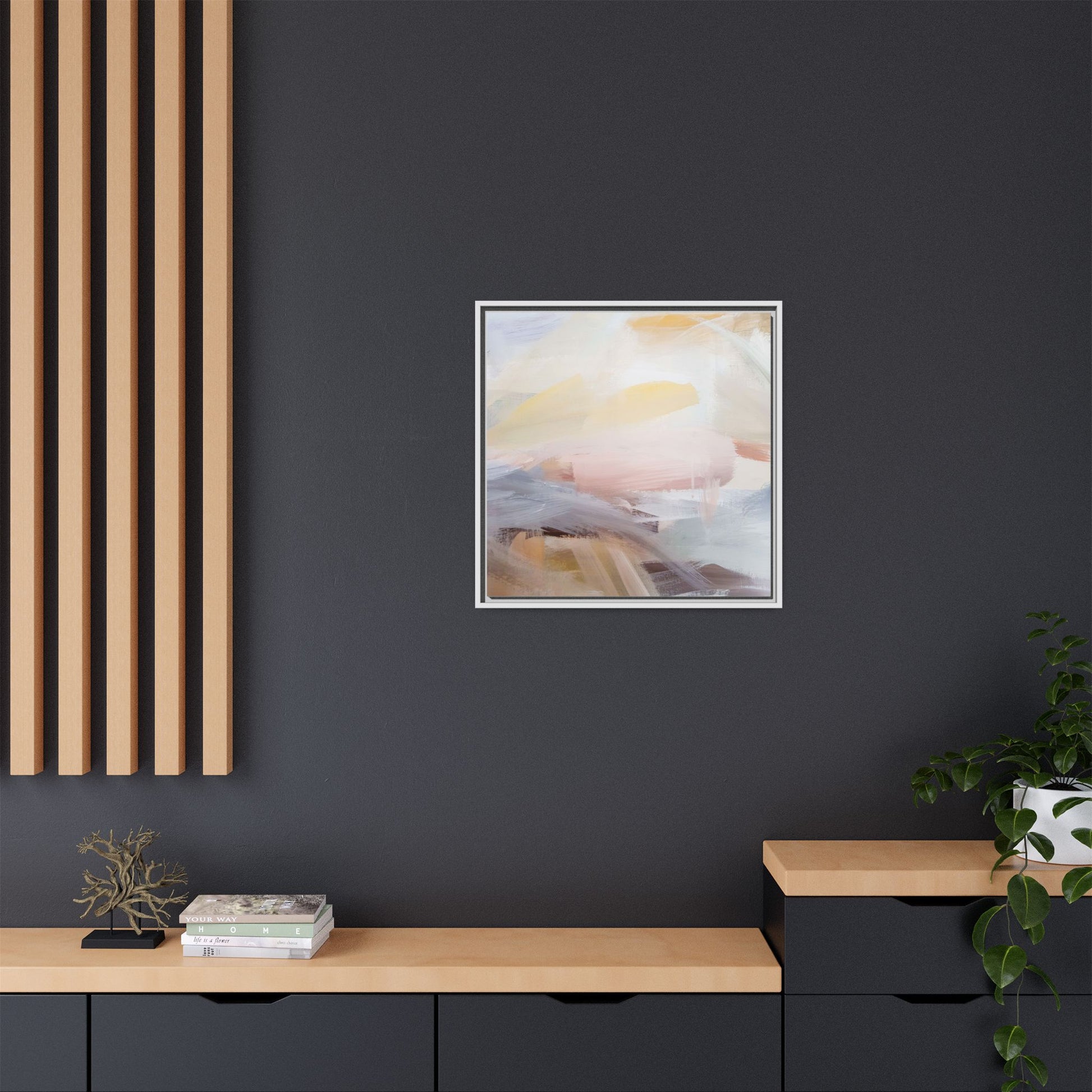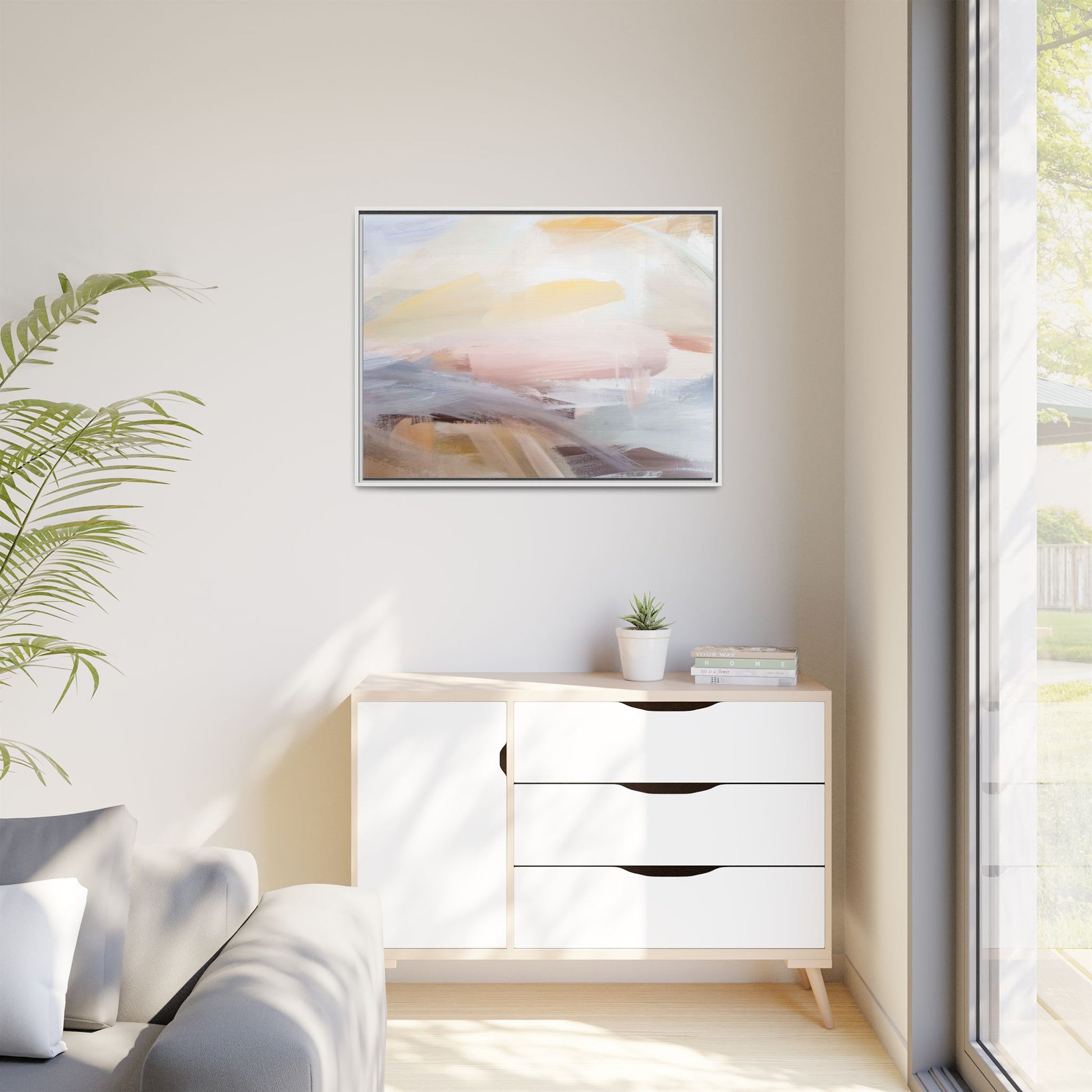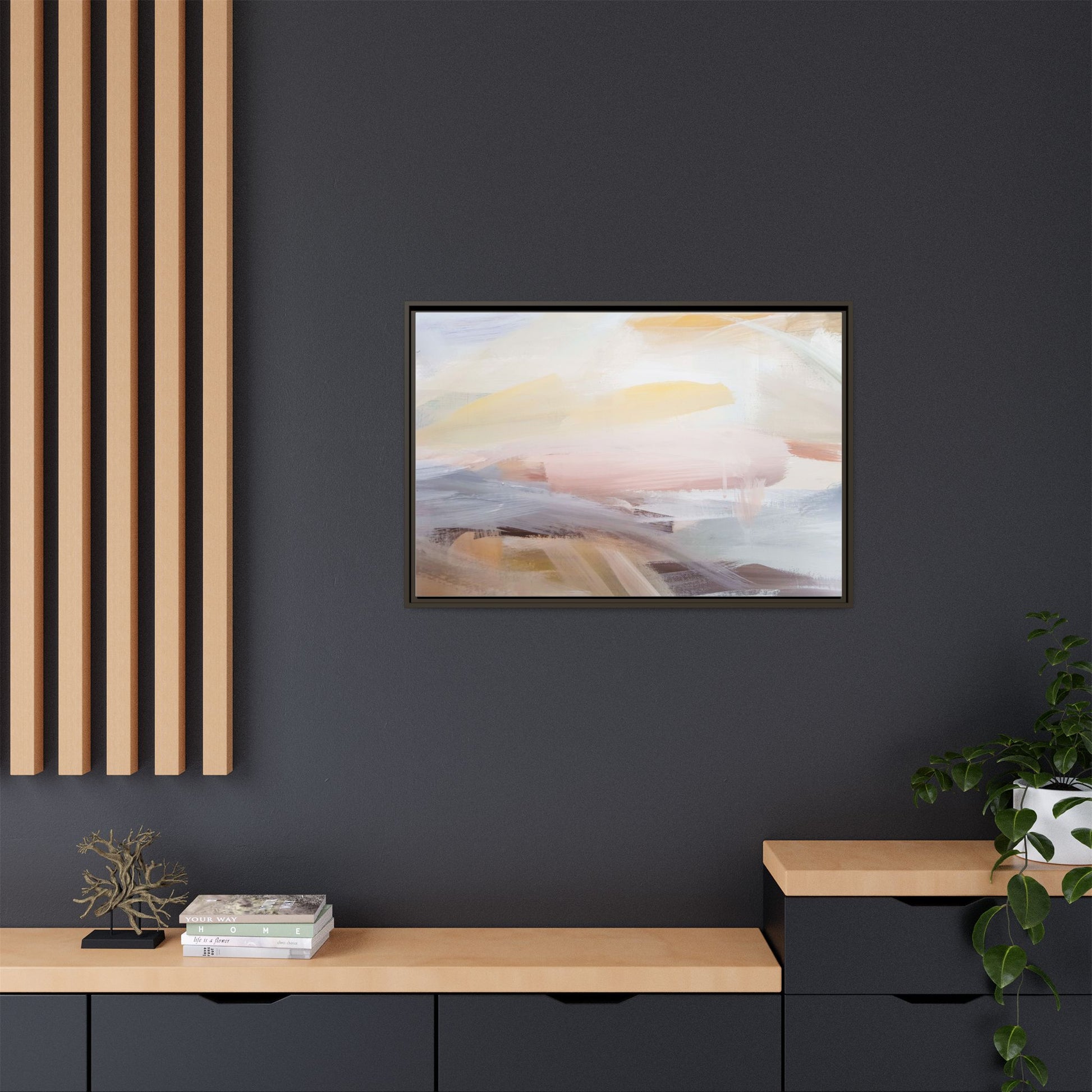 This captivating abstract painting showcases a delicate blend of soft, muted colors including pale yellows, blush pinks, cool blues, and subtle grays. The artwork features sweeping, layered brushstrokes that create a sense of movement and depth across the canvas, evoking a dreamlike and ethereal atmosphere. Textural elements are prominent, with visible brush marks and paint techniques that add dimension and visual interest to the composition. The color palette suggests a serene, contemplative mood, reminiscent of a misty landscape or a gentle sunrise. The overall style appears to be contemporary abstract, with an emphasis on fluid forms and harmonious color transitions that invite the viewer to interpret the piece through their own emotional lens.