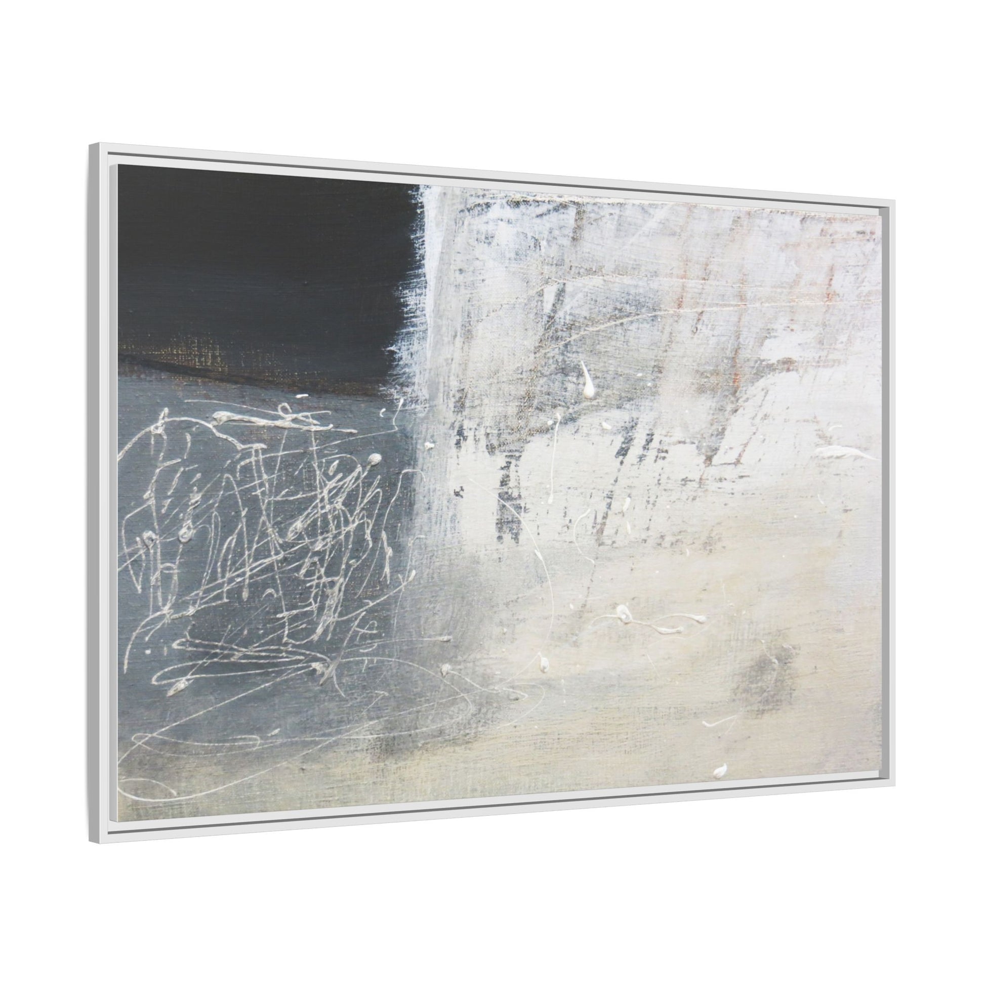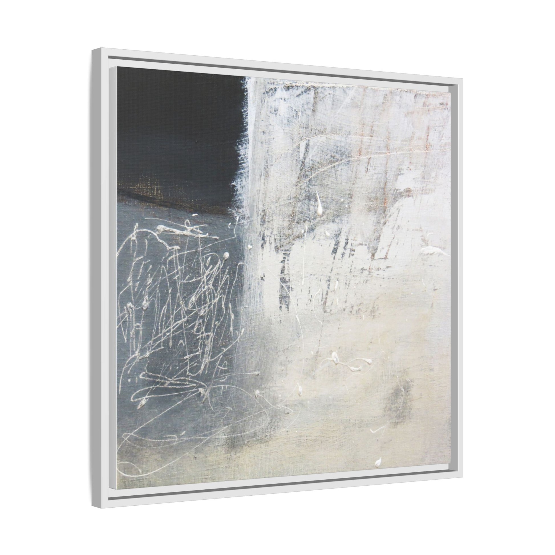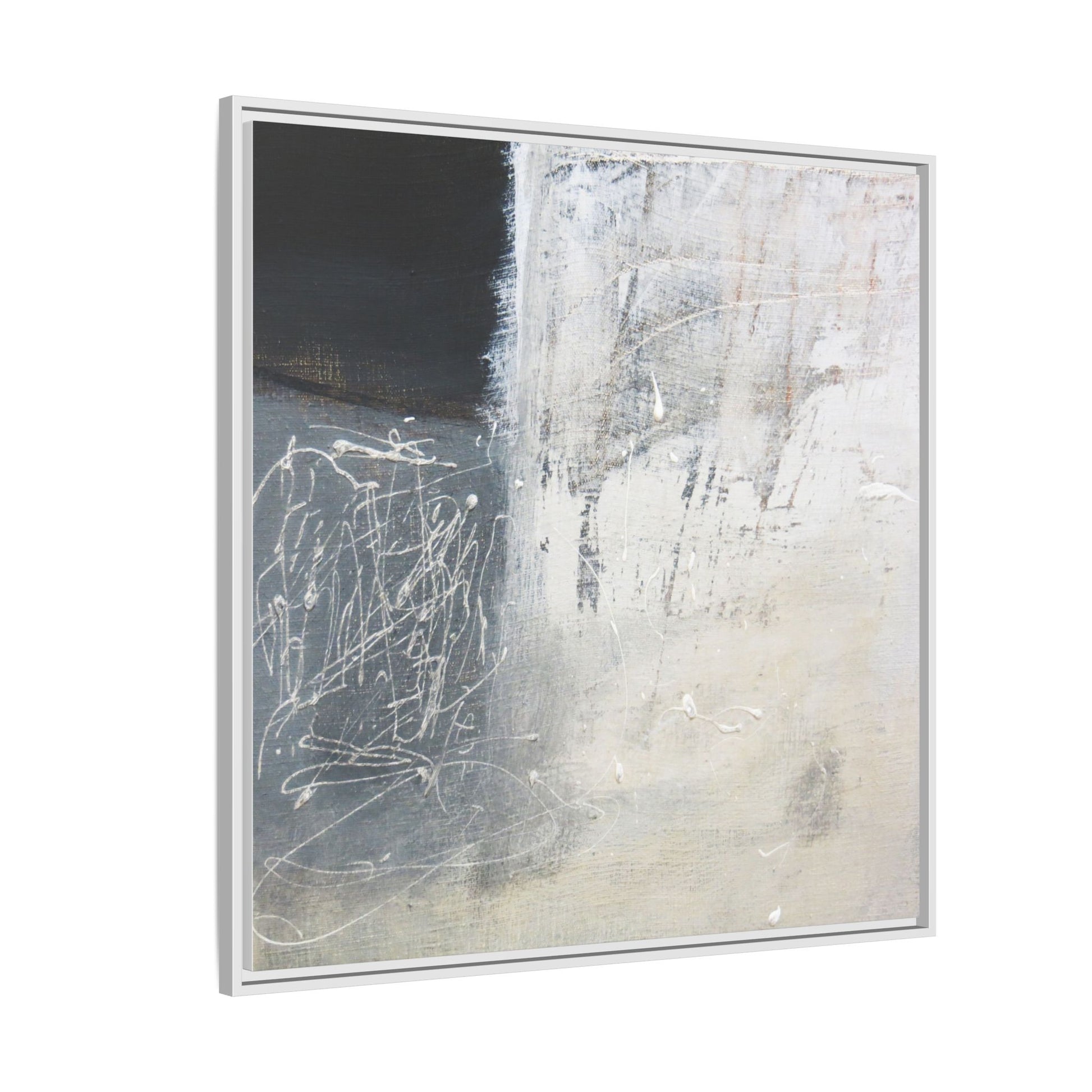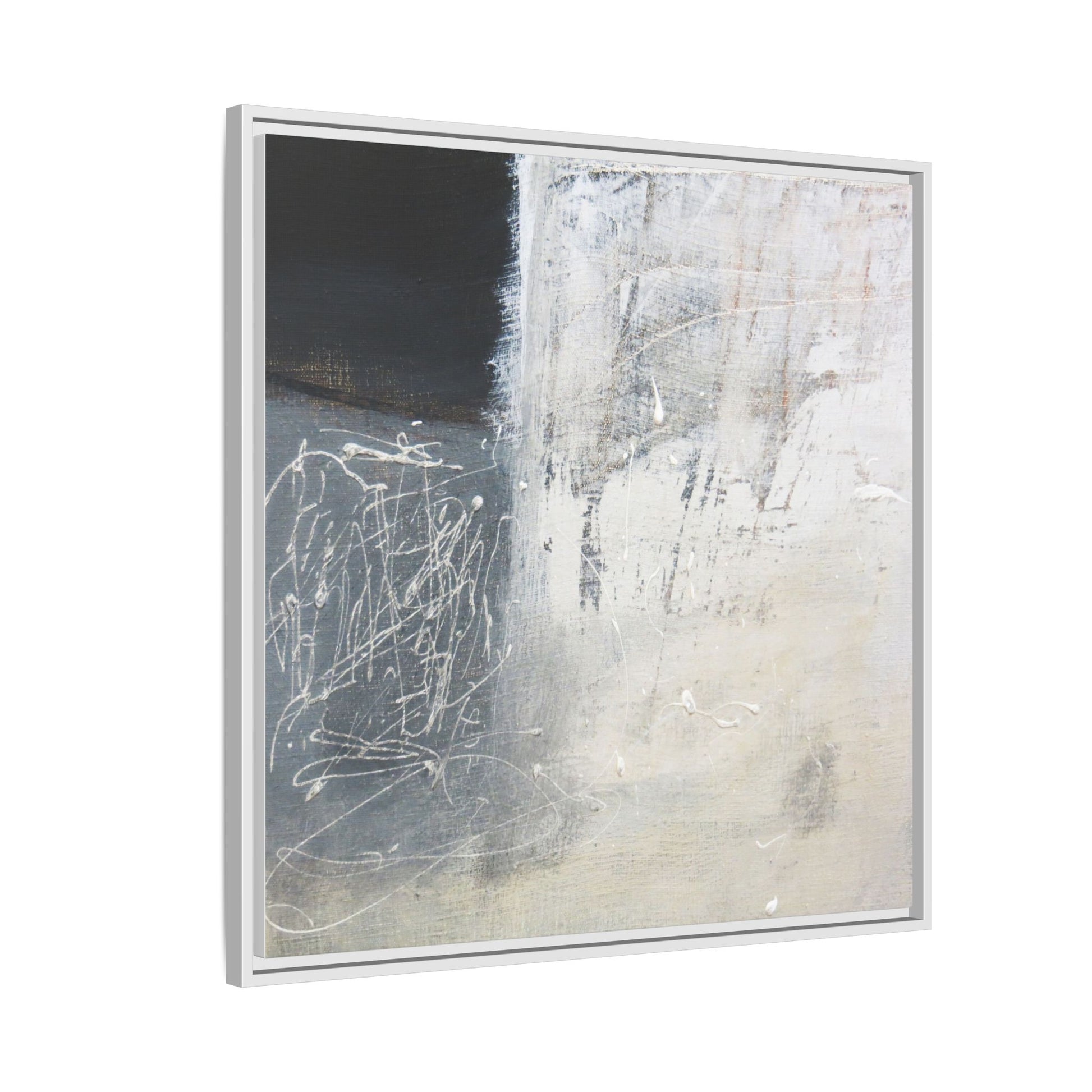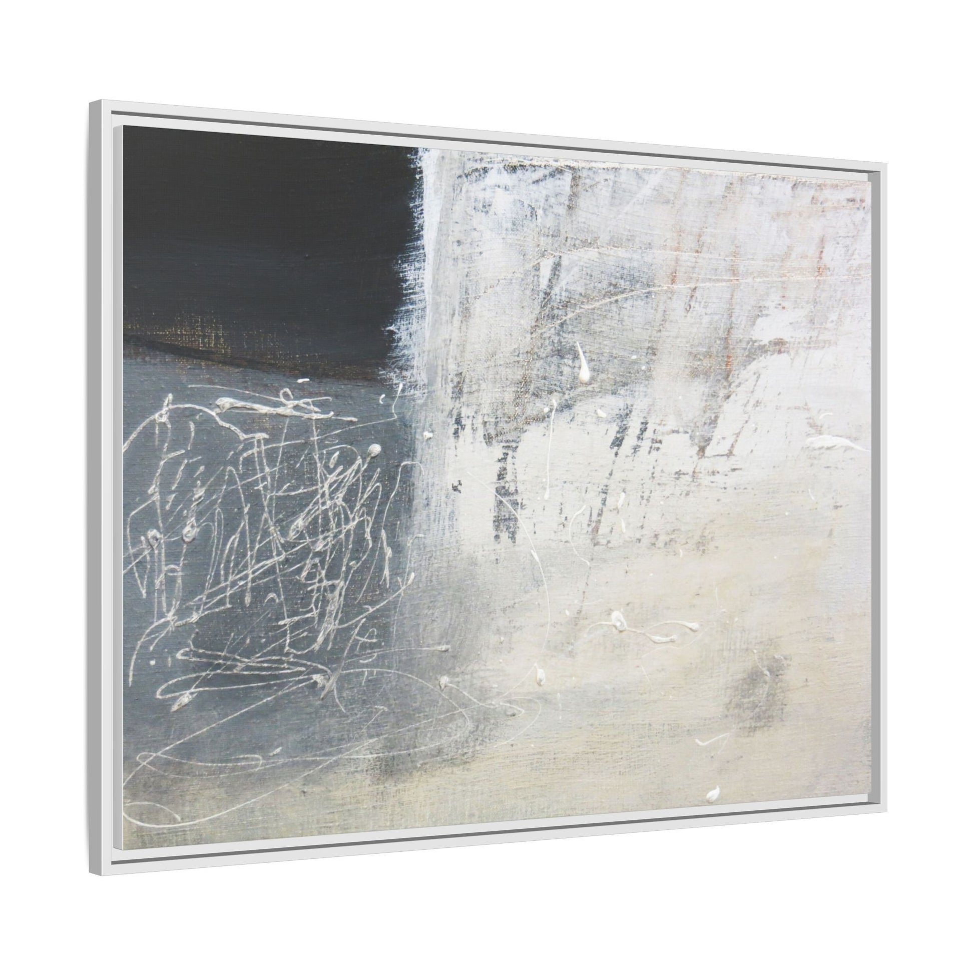 This abstract artwork features a textured, layered composition with a predominantly gray and white color palette. The image appears to be a mixed media piece with scratched and scraped surfaces, creating intricate linear patterns and textural depth. On the left side, there are dense, chaotic white scribble-like marks against a darker background, contrasting with the more muted and worn textures on the right side. The painting exhibits a weathered, almost industrial aesthetic with multiple layers of paint that have been deliberately distressed and manipulated. The overall effect suggests a sense of movement and complexity, with subtle variations in tone and texture that draw the viewer's eye across the canvas.