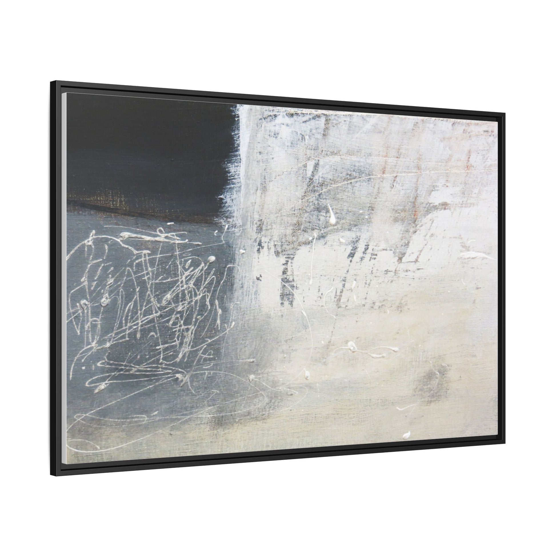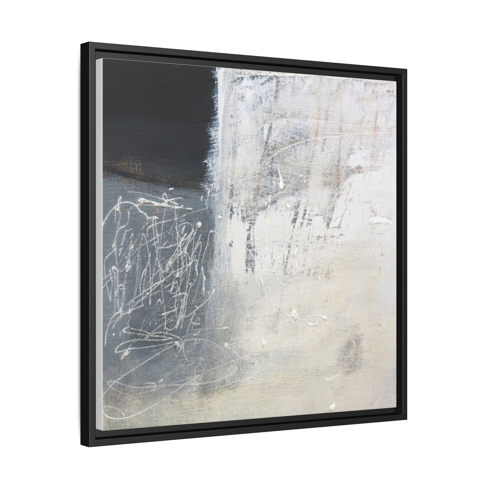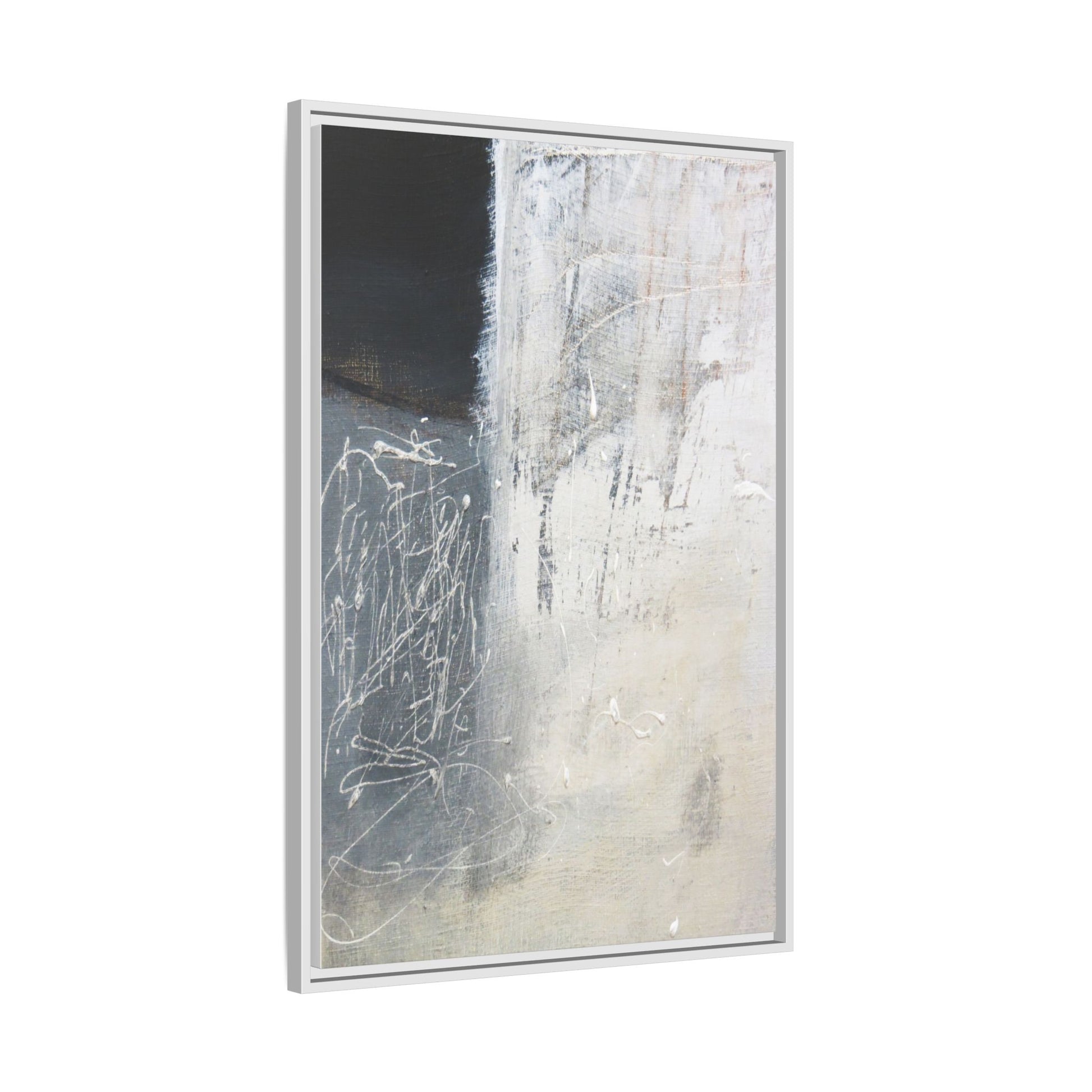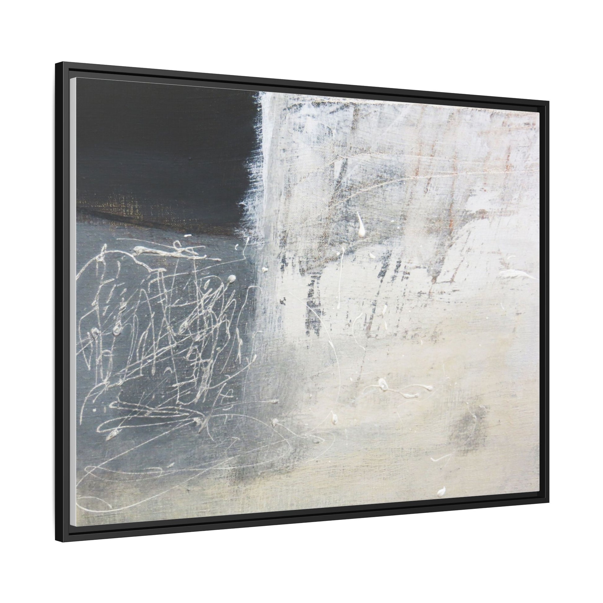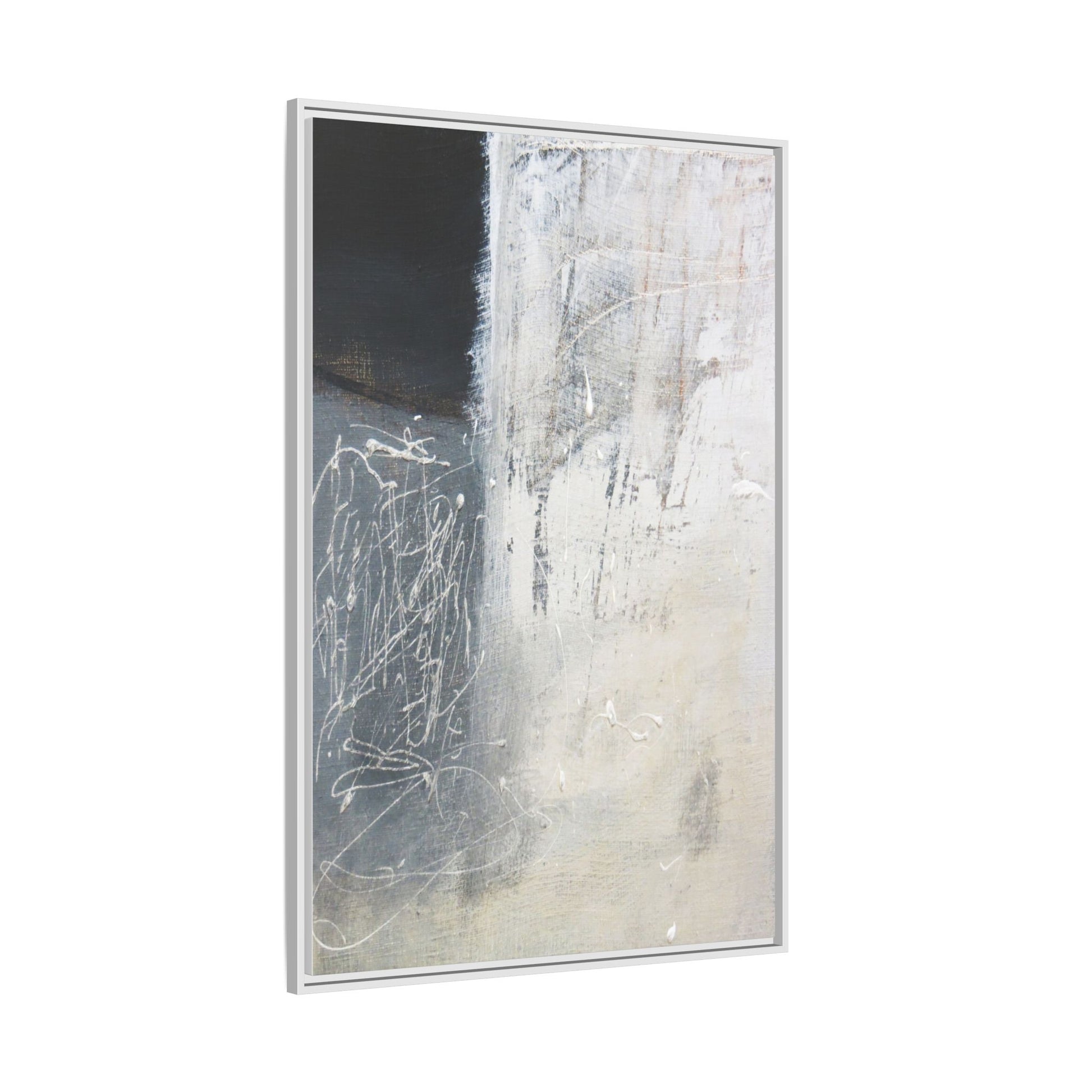 This abstract artwork features a textured, layered composition with a predominantly gray and white color palette. The image appears to be a mixed media piece with scratched and scraped surfaces, creating intricate linear patterns and textural depth. On the left side, there are dense, chaotic white scribble-like marks against a darker background, contrasting with the more muted and worn textures on the right side. The painting exhibits a weathered, almost industrial aesthetic with multiple layers of paint that have been deliberately distressed and manipulated. The overall effect suggests a sense of movement and complexity, with subtle variations in tone and texture that draw the viewer's eye across the canvas.