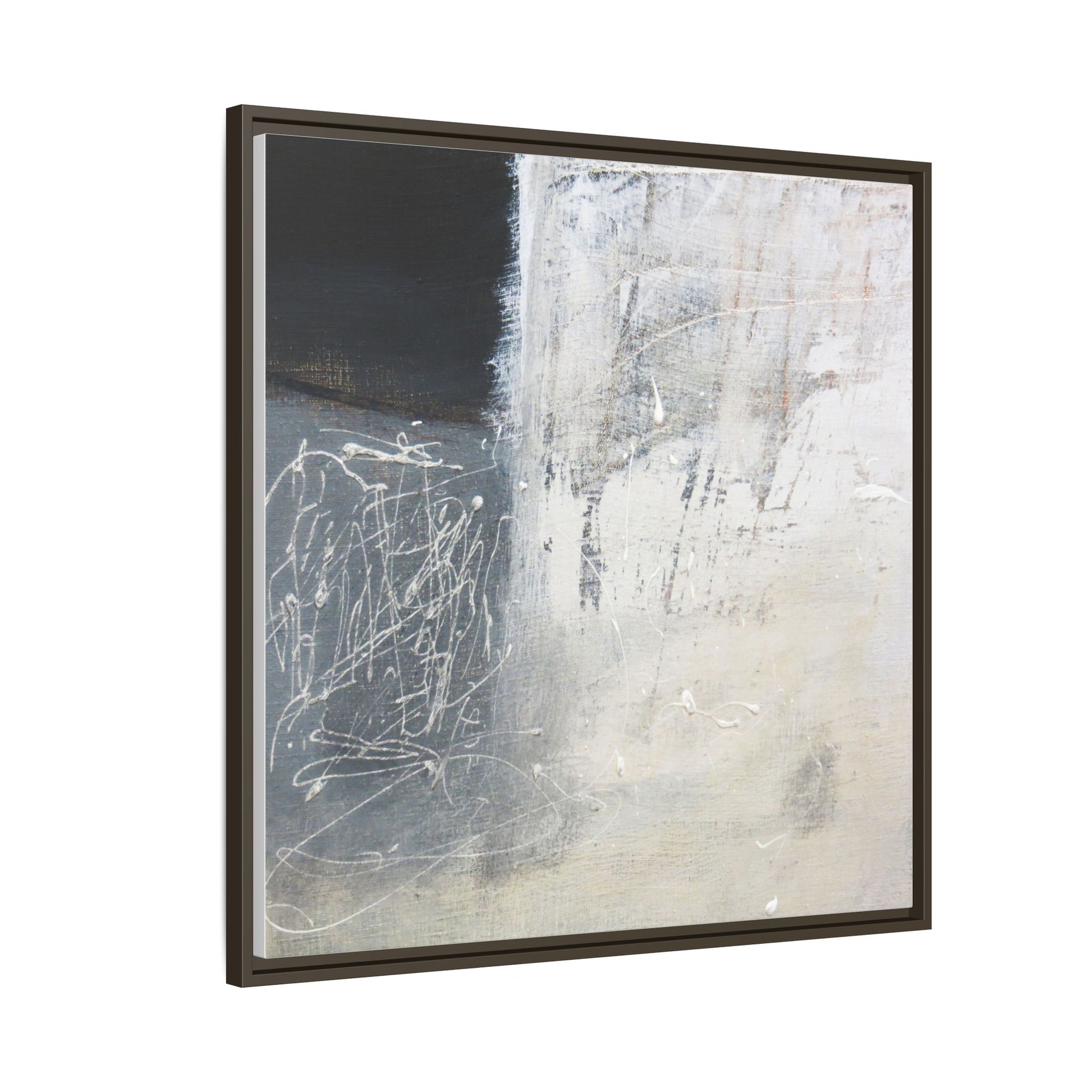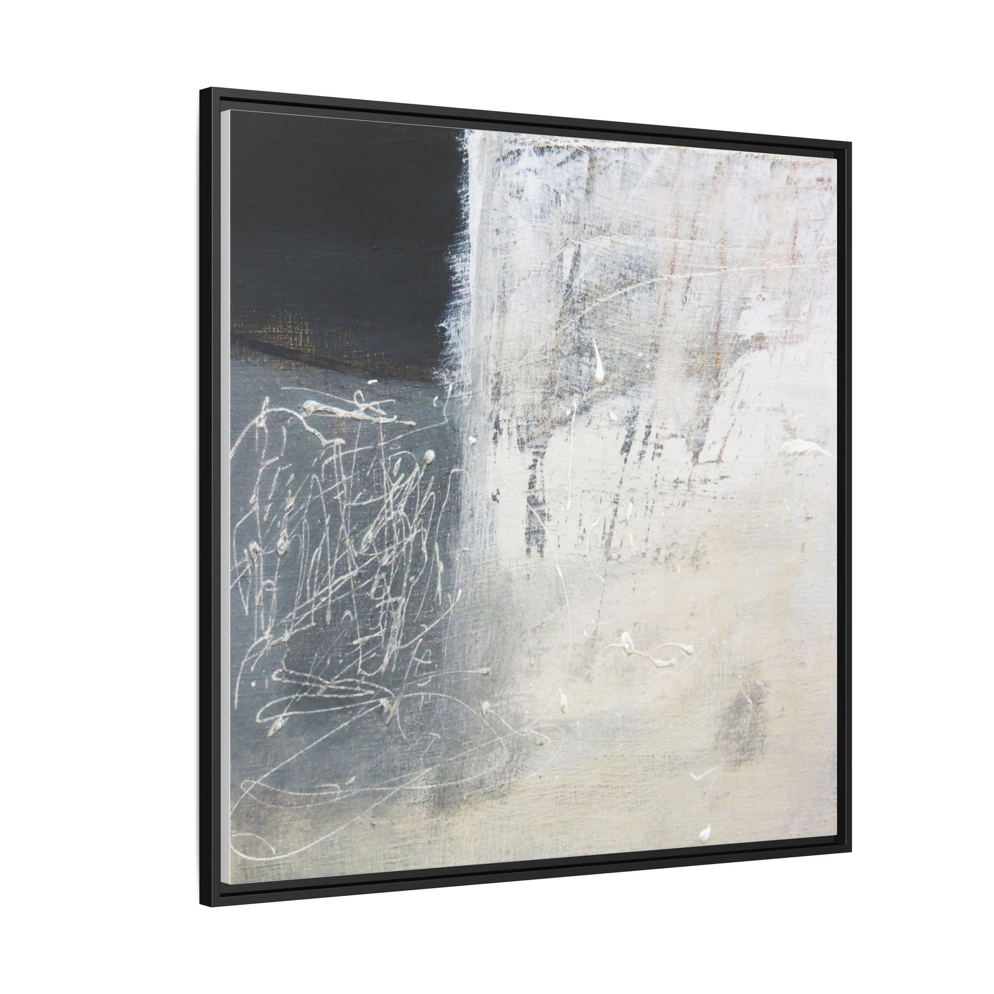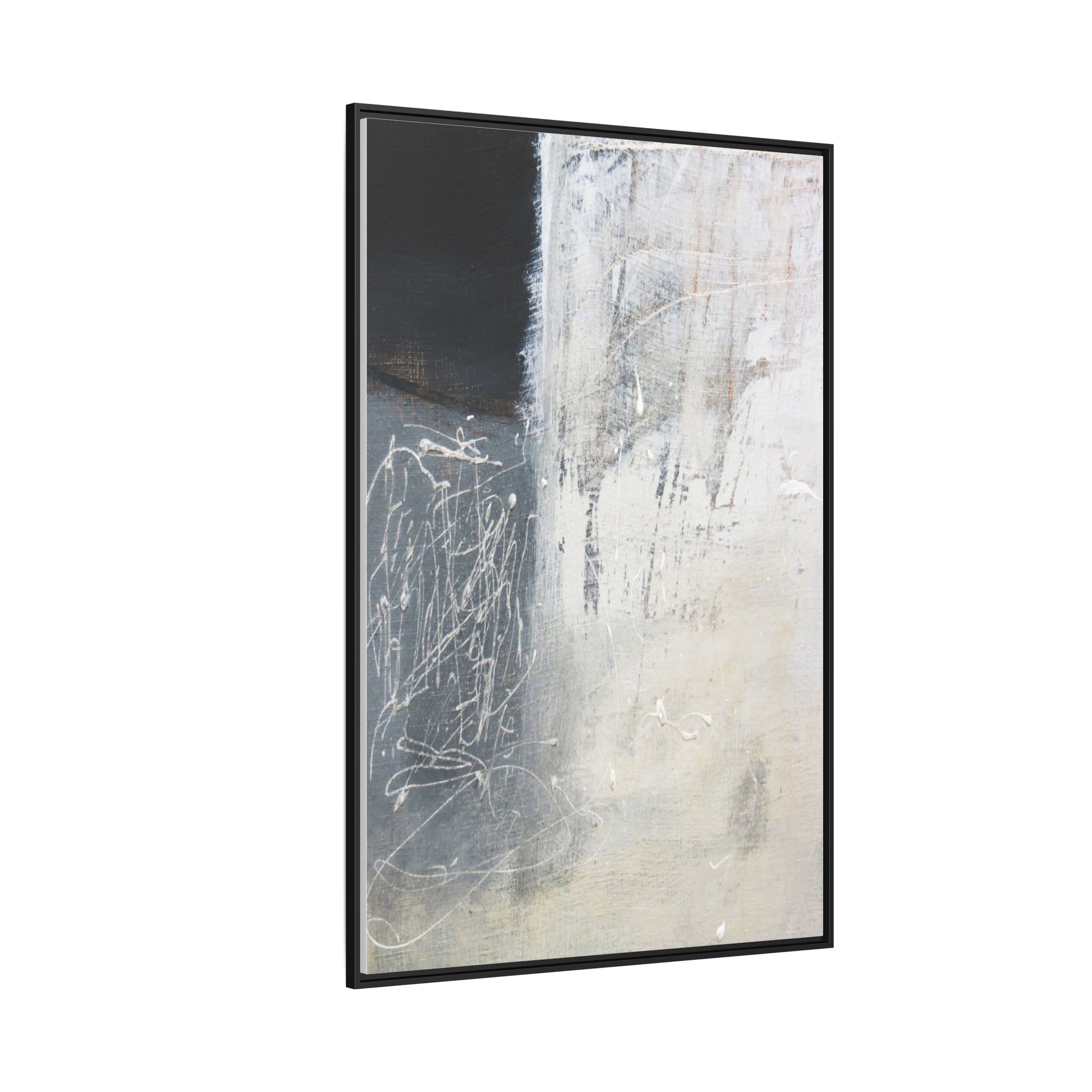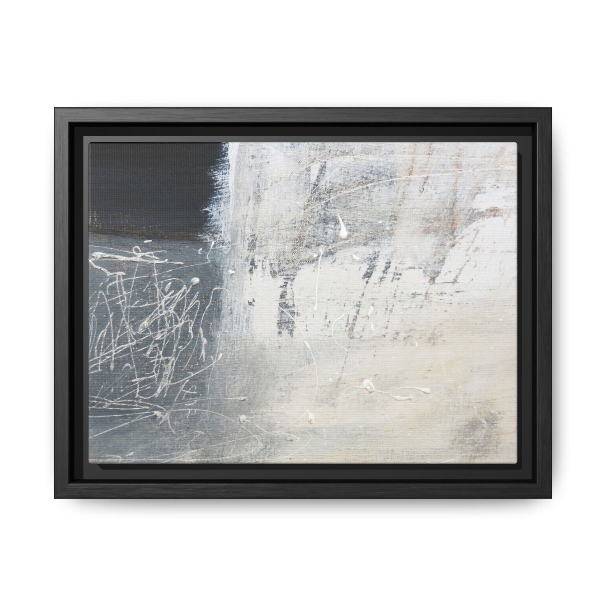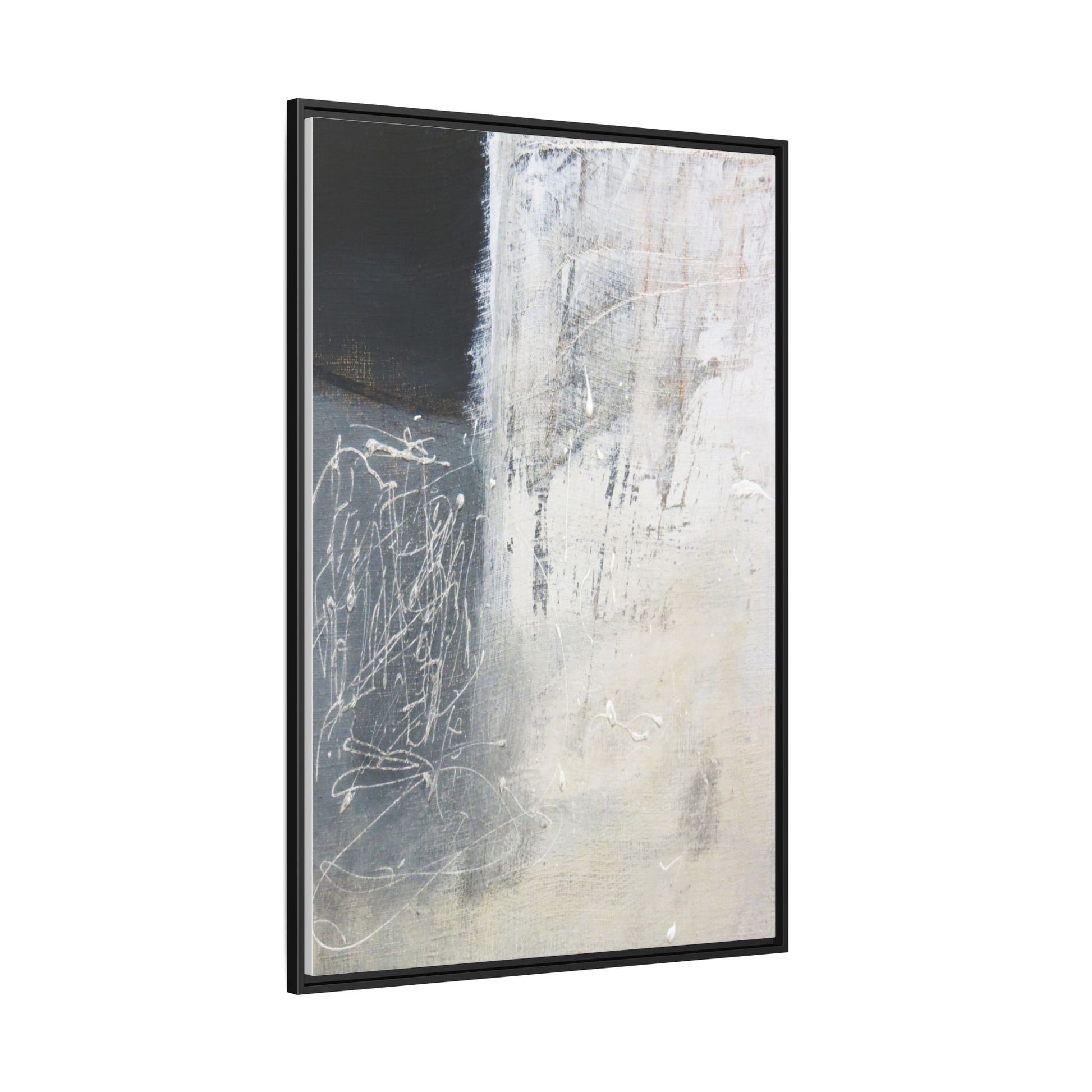 This abstract artwork features a textured, layered composition with a predominantly gray and white color palette. The image appears to be a mixed media piece with scratched and scraped surfaces, creating intricate linear patterns and textural depth. On the left side, there are dense, chaotic white scribble-like marks against a darker background, contrasting with the more muted and worn textures on the right side. The painting exhibits a weathered, almost industrial aesthetic with multiple layers of paint that have been deliberately distressed and manipulated. The overall effect suggests a sense of movement and complexity, with subtle variations in tone and texture that draw the viewer's eye across the canvas.