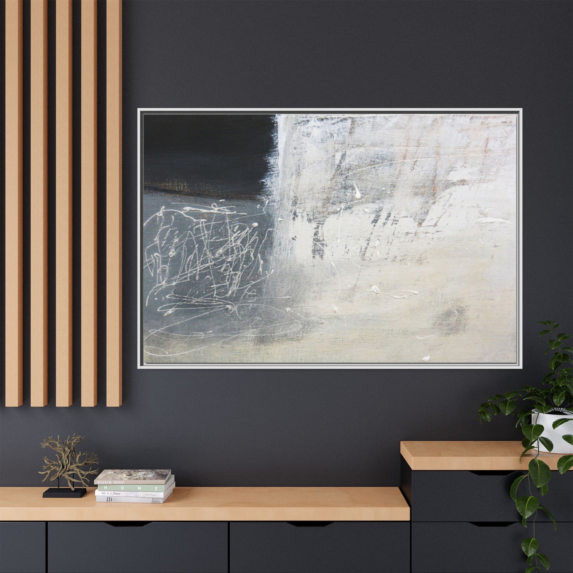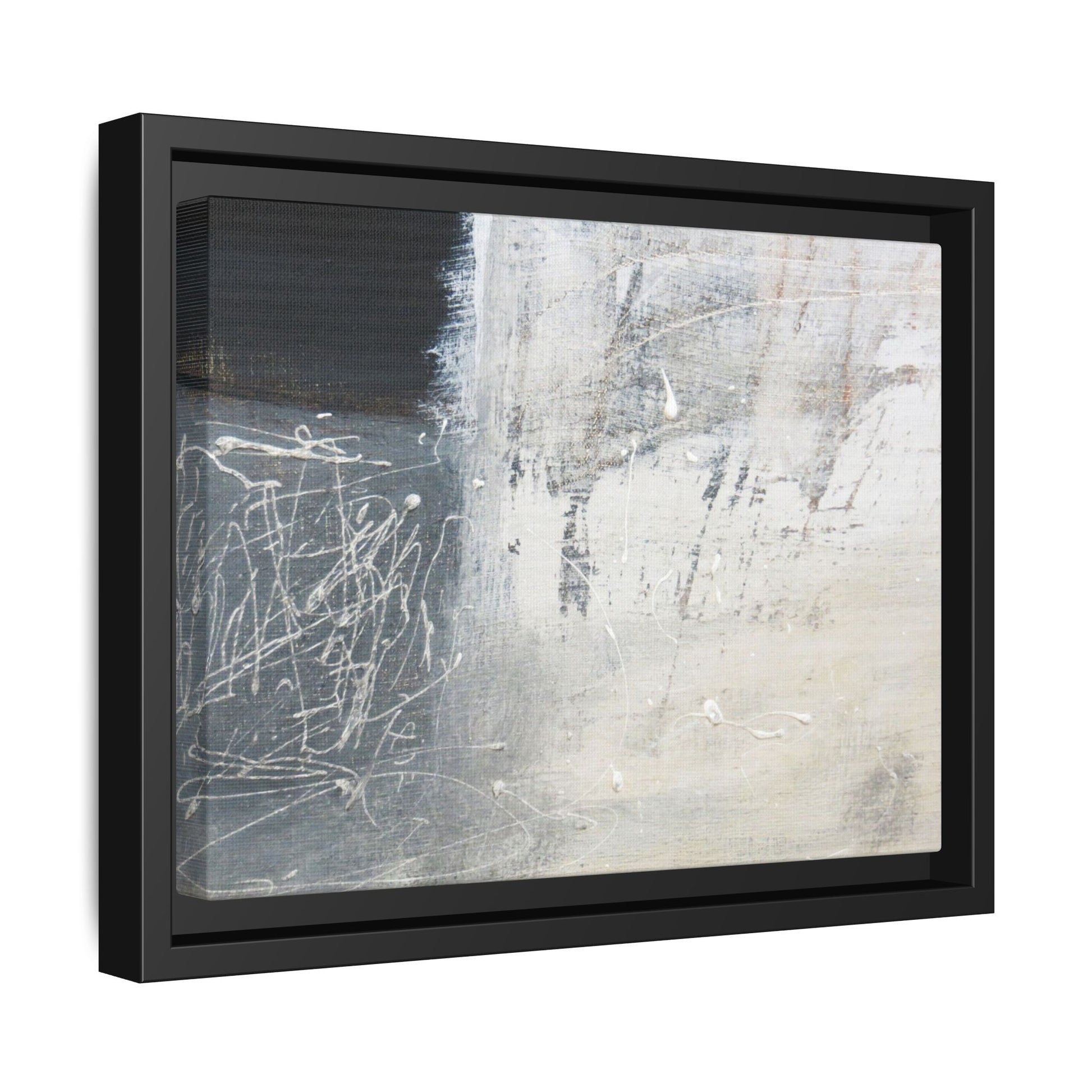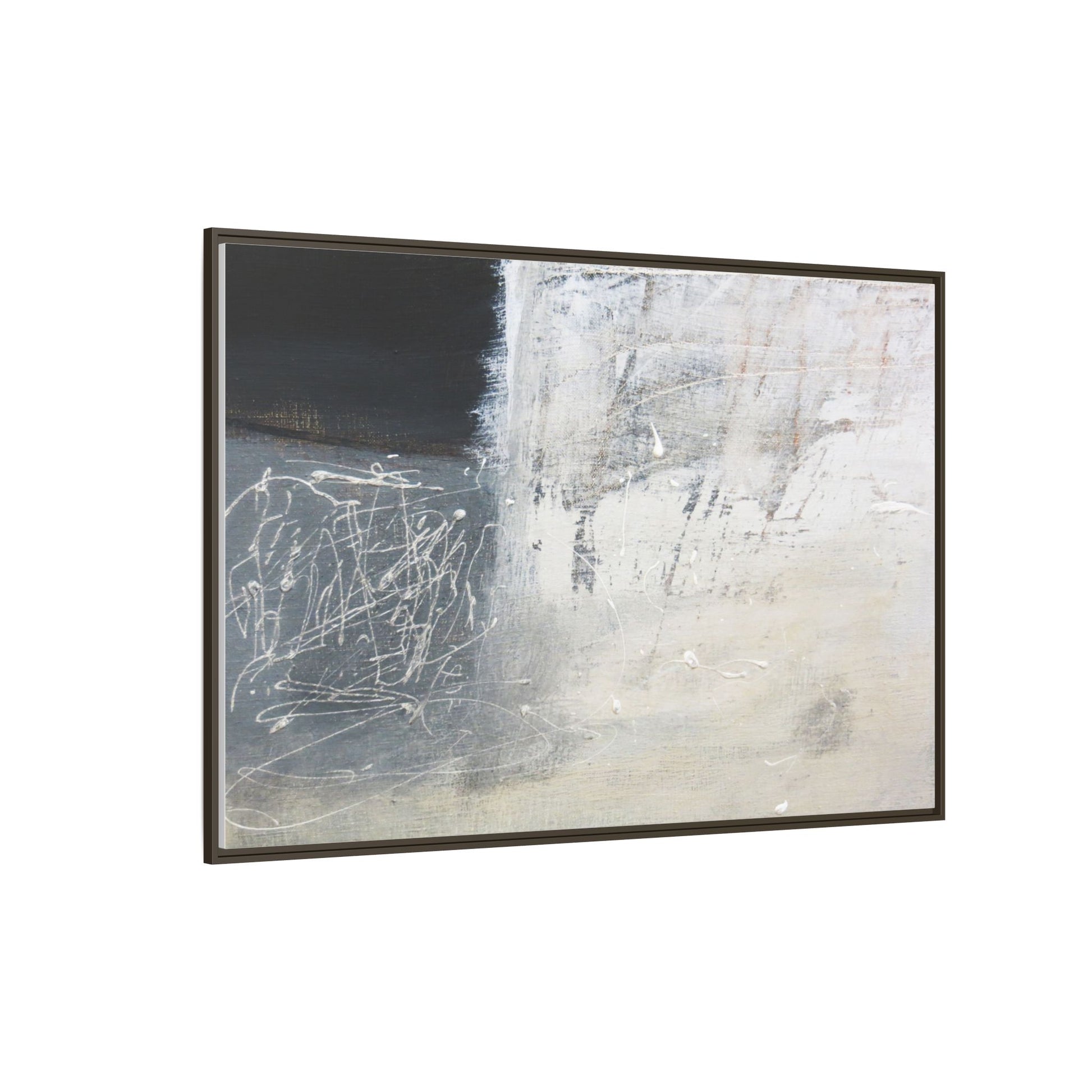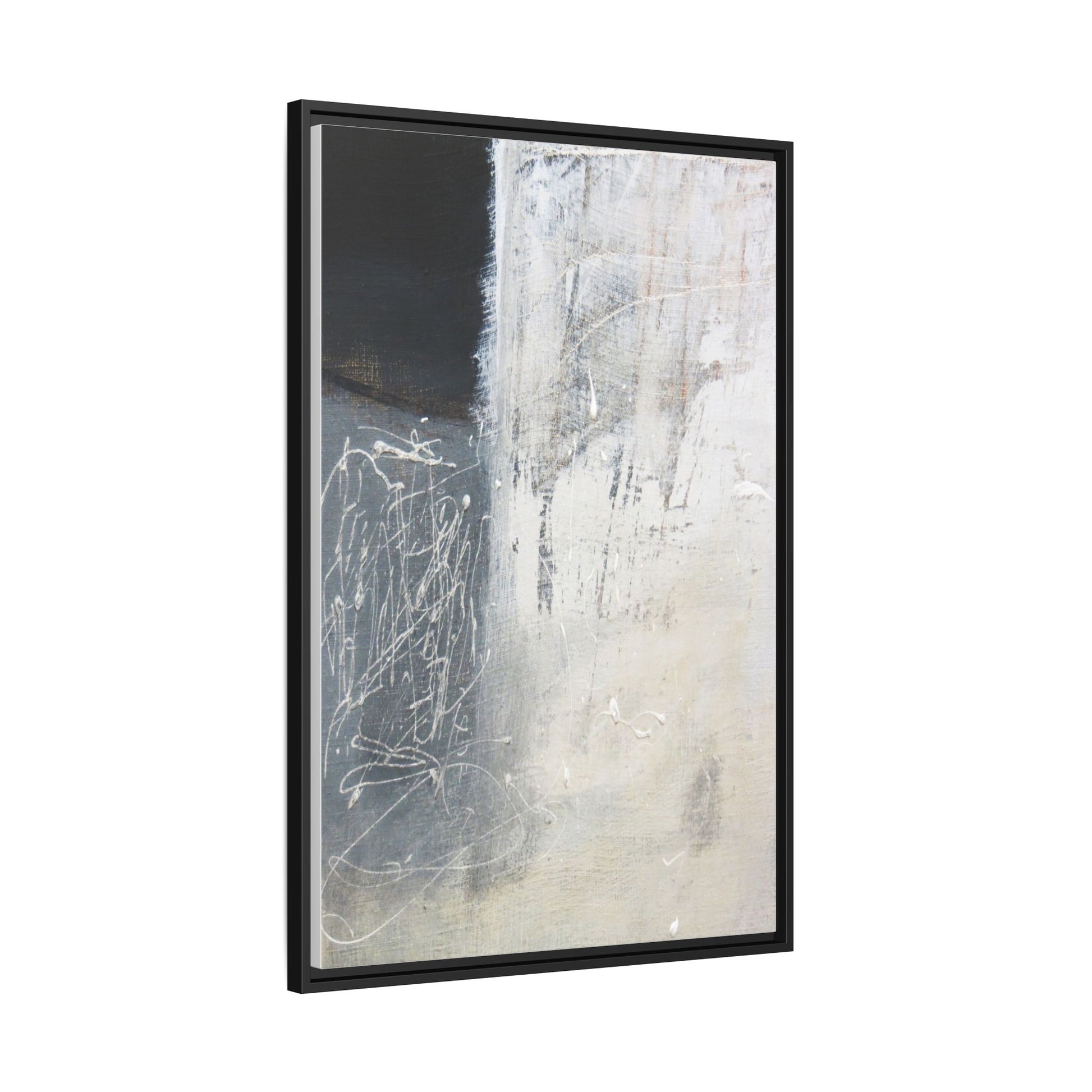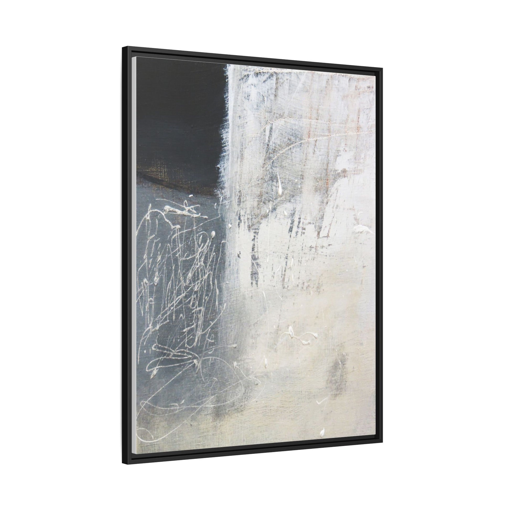 This abstract artwork features a textured, layered composition with a predominantly gray and white color palette. The image appears to be a mixed media piece with scratched and scraped surfaces, creating intricate linear patterns and textural depth. On the left side, there are dense, chaotic white scribble-like marks against a darker background, contrasting with the more muted and worn textures on the right side. The painting exhibits a weathered, almost industrial aesthetic with multiple layers of paint that have been deliberately distressed and manipulated. The overall effect suggests a sense of movement and complexity, with subtle variations in tone and texture that draw the viewer's eye across the canvas.