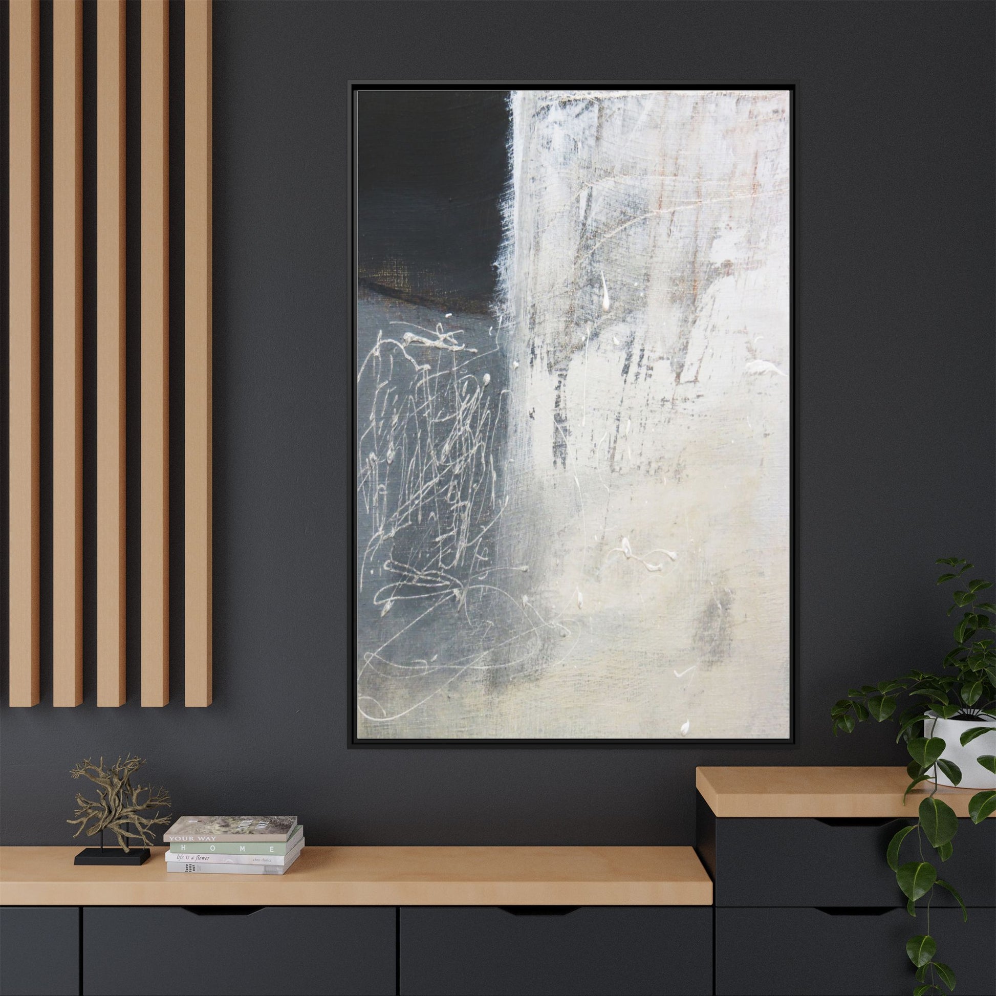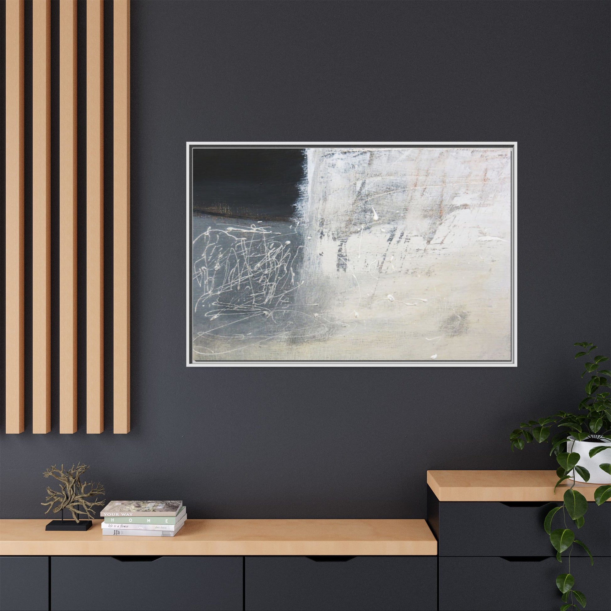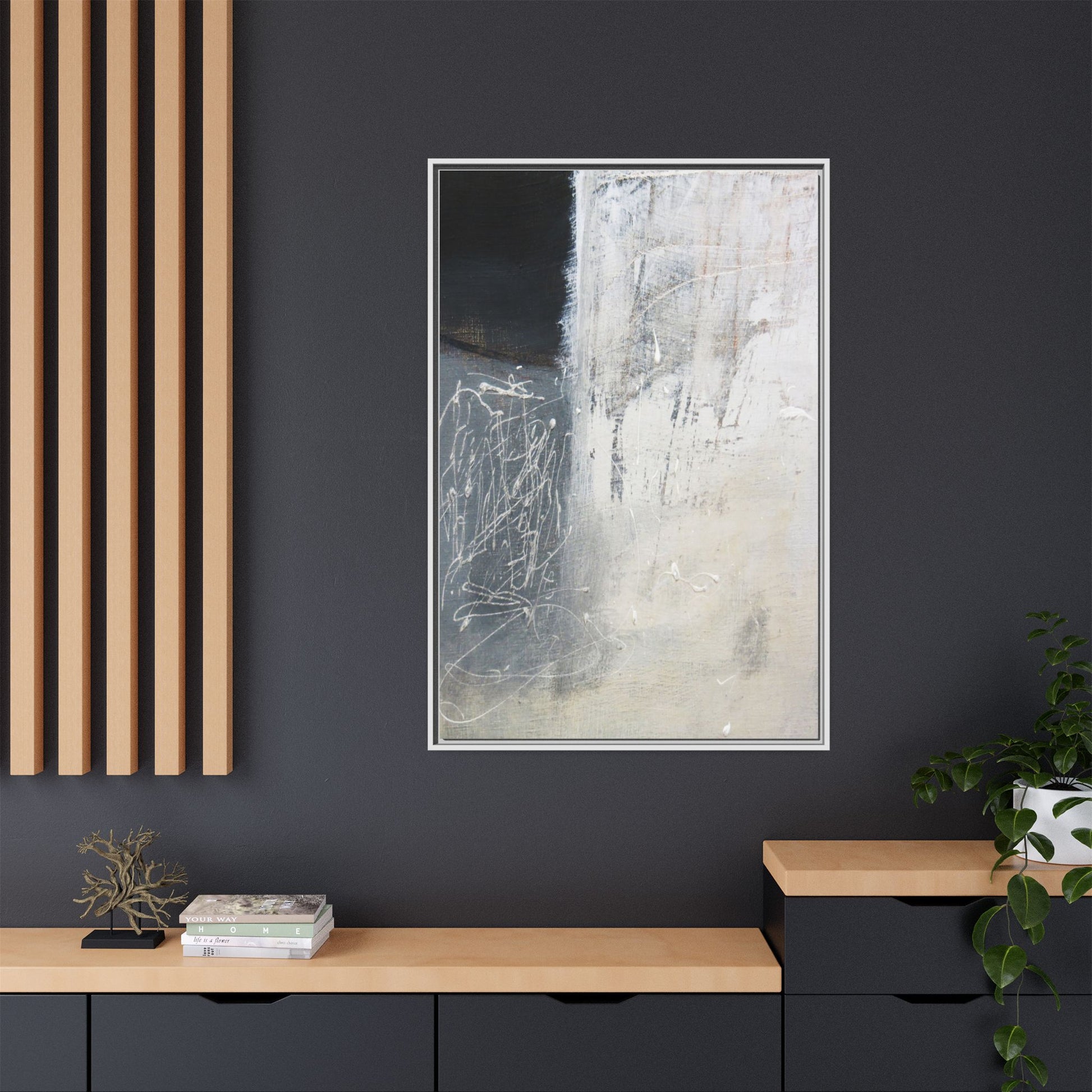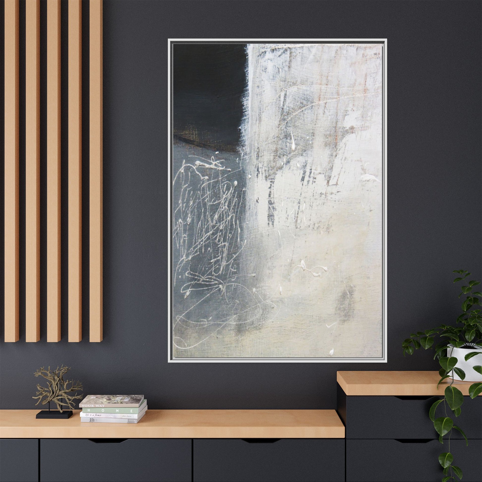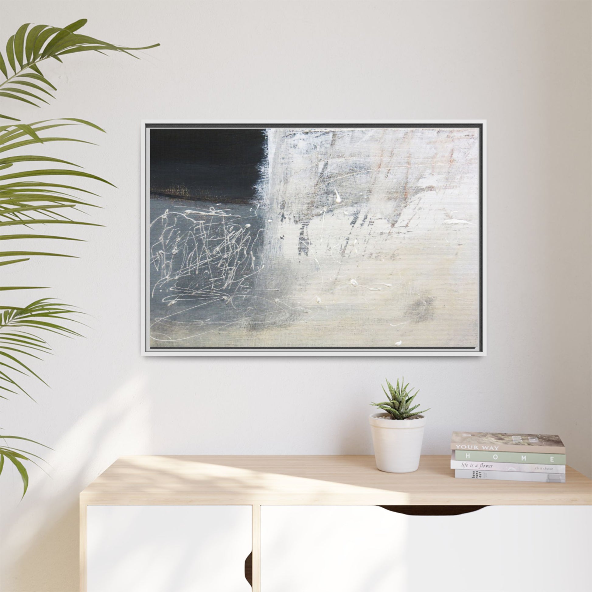 This abstract artwork features a textured, layered composition with a predominantly gray and white color palette. The image appears to be a mixed media piece with scratched and scraped surfaces, creating intricate linear patterns and textural depth. On the left side, there are dense, chaotic white scribble-like marks against a darker background, contrasting with the more muted and worn textures on the right side. The painting exhibits a weathered, almost industrial aesthetic with multiple layers of paint that have been deliberately distressed and manipulated. The overall effect suggests a sense of movement and complexity, with subtle variations in tone and texture that draw the viewer's eye across the canvas.