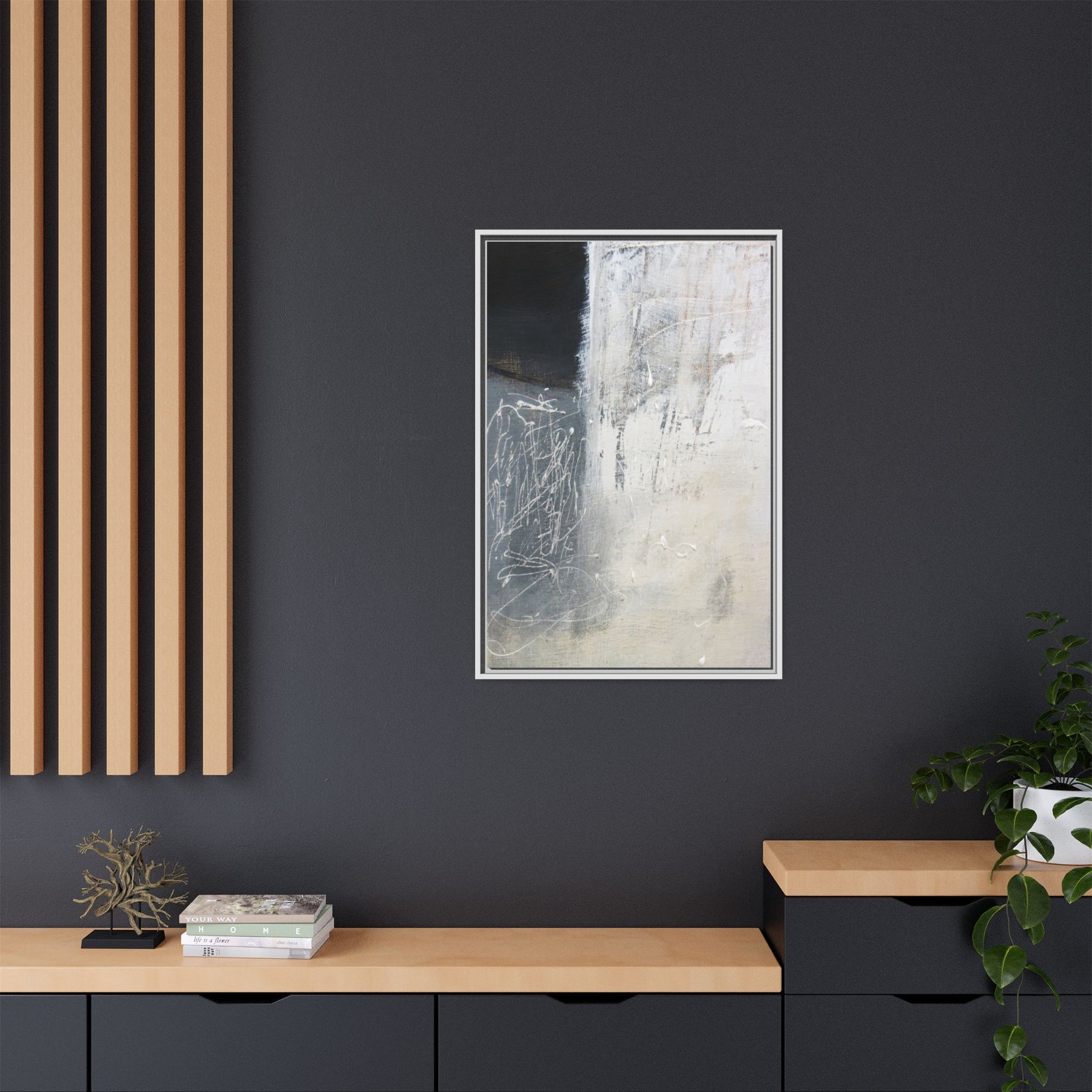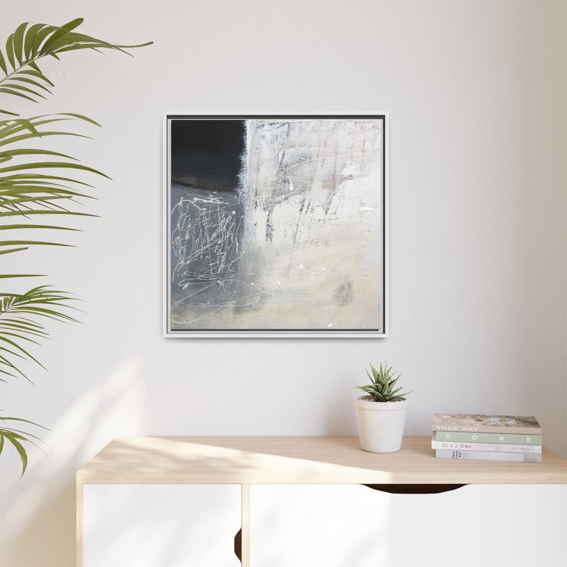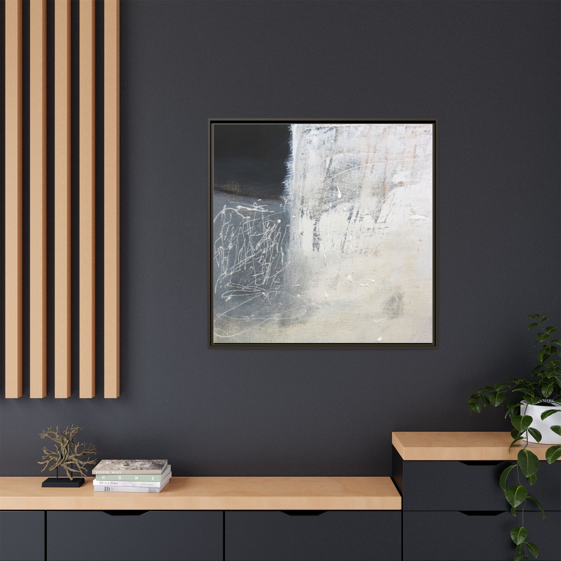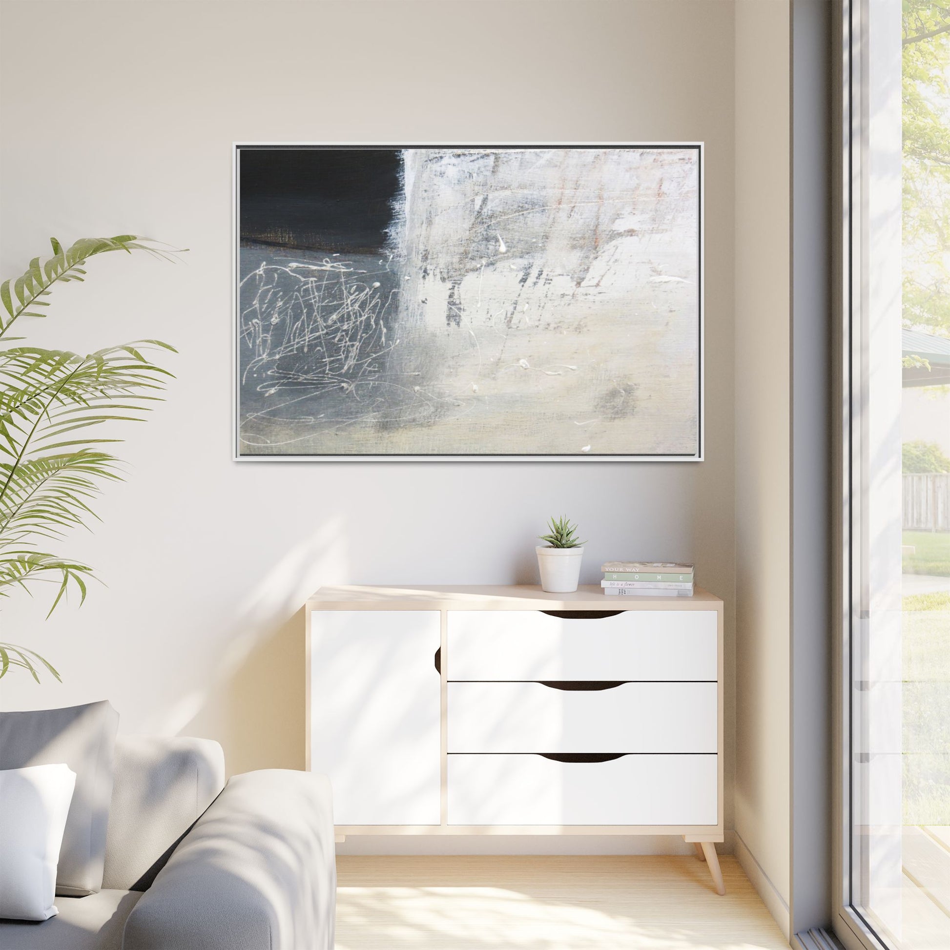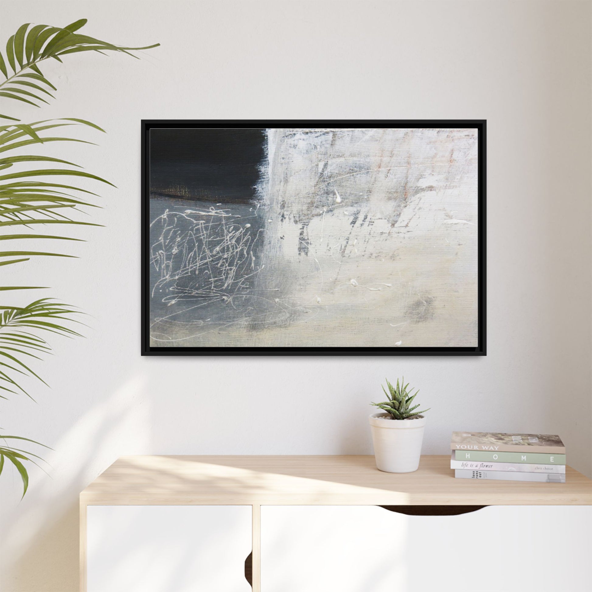 This abstract artwork features a textured, layered composition with a predominantly gray and white color palette. The image appears to be a mixed media piece with scratched and scraped surfaces, creating intricate linear patterns and textural depth. On the left side, there are dense, chaotic white scribble-like marks against a darker background, contrasting with the more muted and worn textures on the right side. The painting exhibits a weathered, almost industrial aesthetic with multiple layers of paint that have been deliberately distressed and manipulated. The overall effect suggests a sense of movement and complexity, with subtle variations in tone and texture that draw the viewer's eye across the canvas.