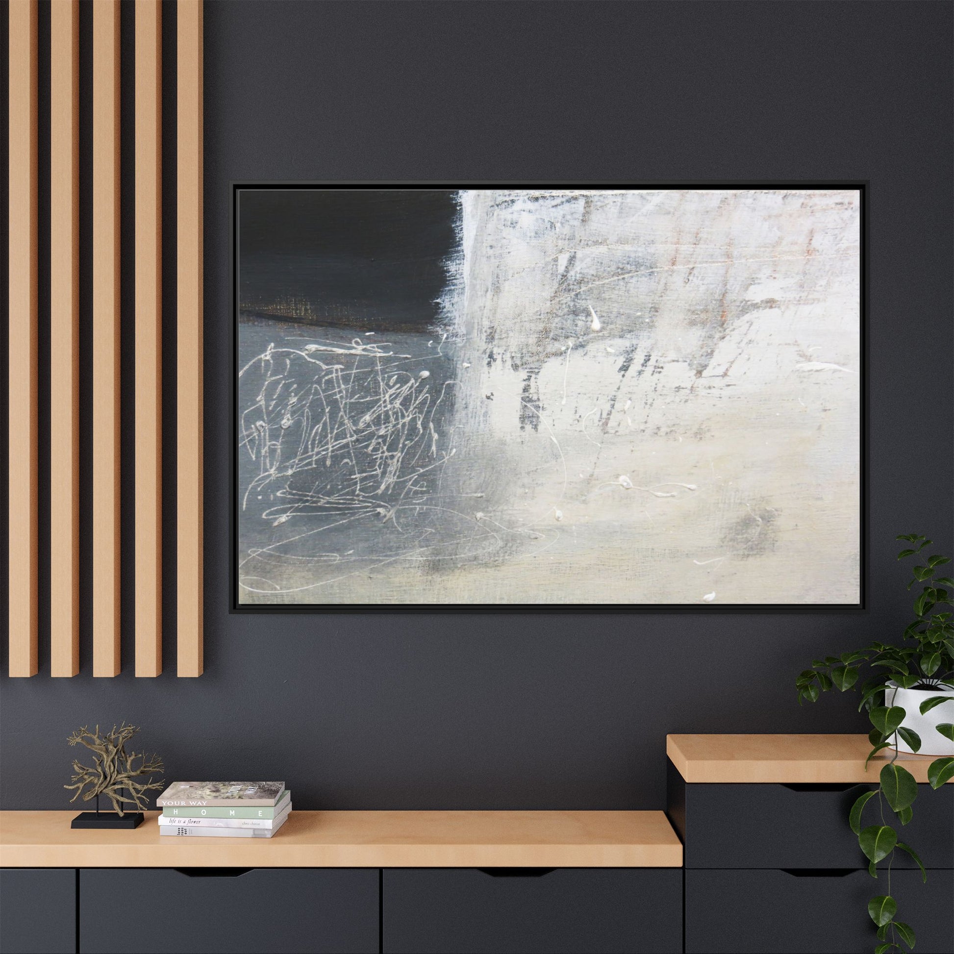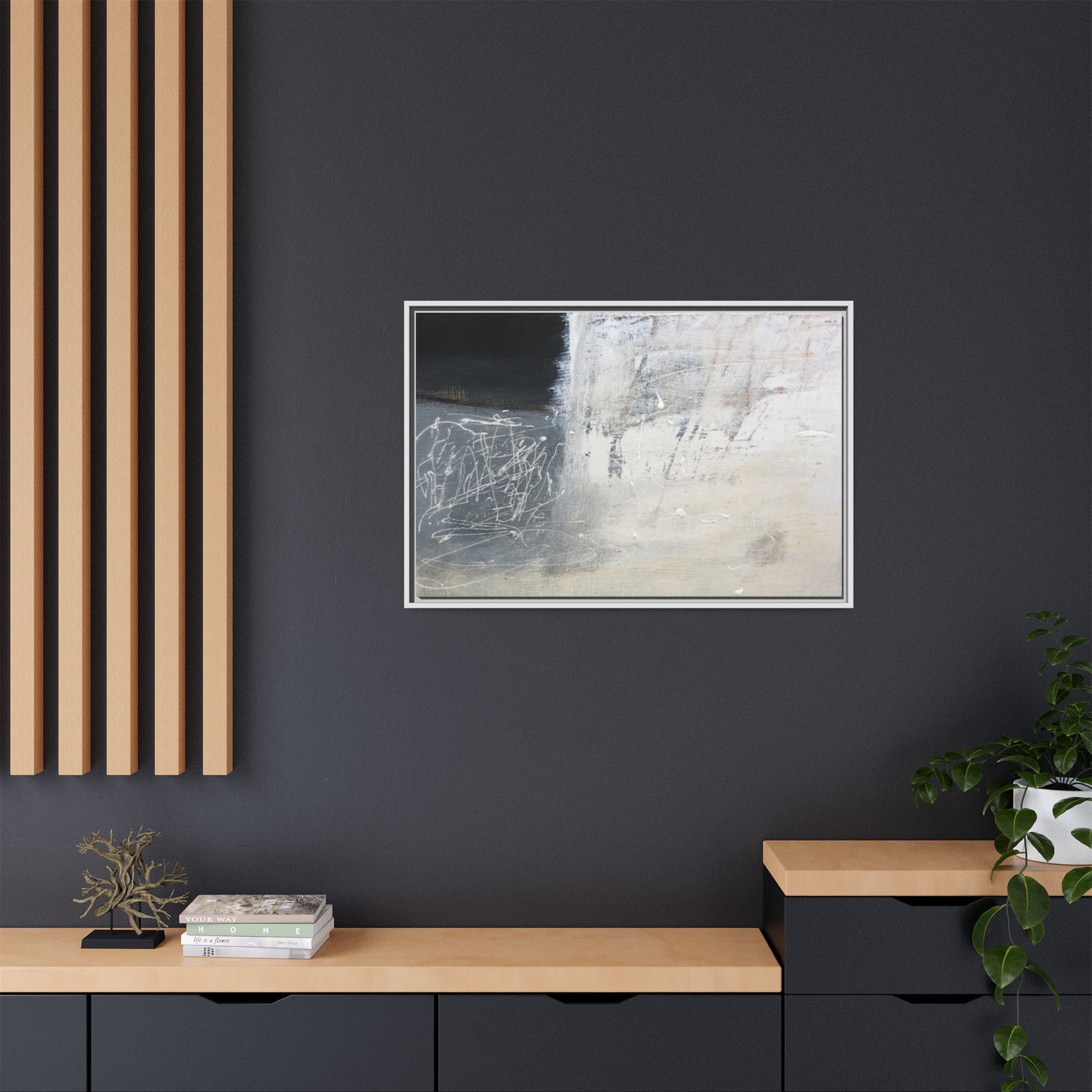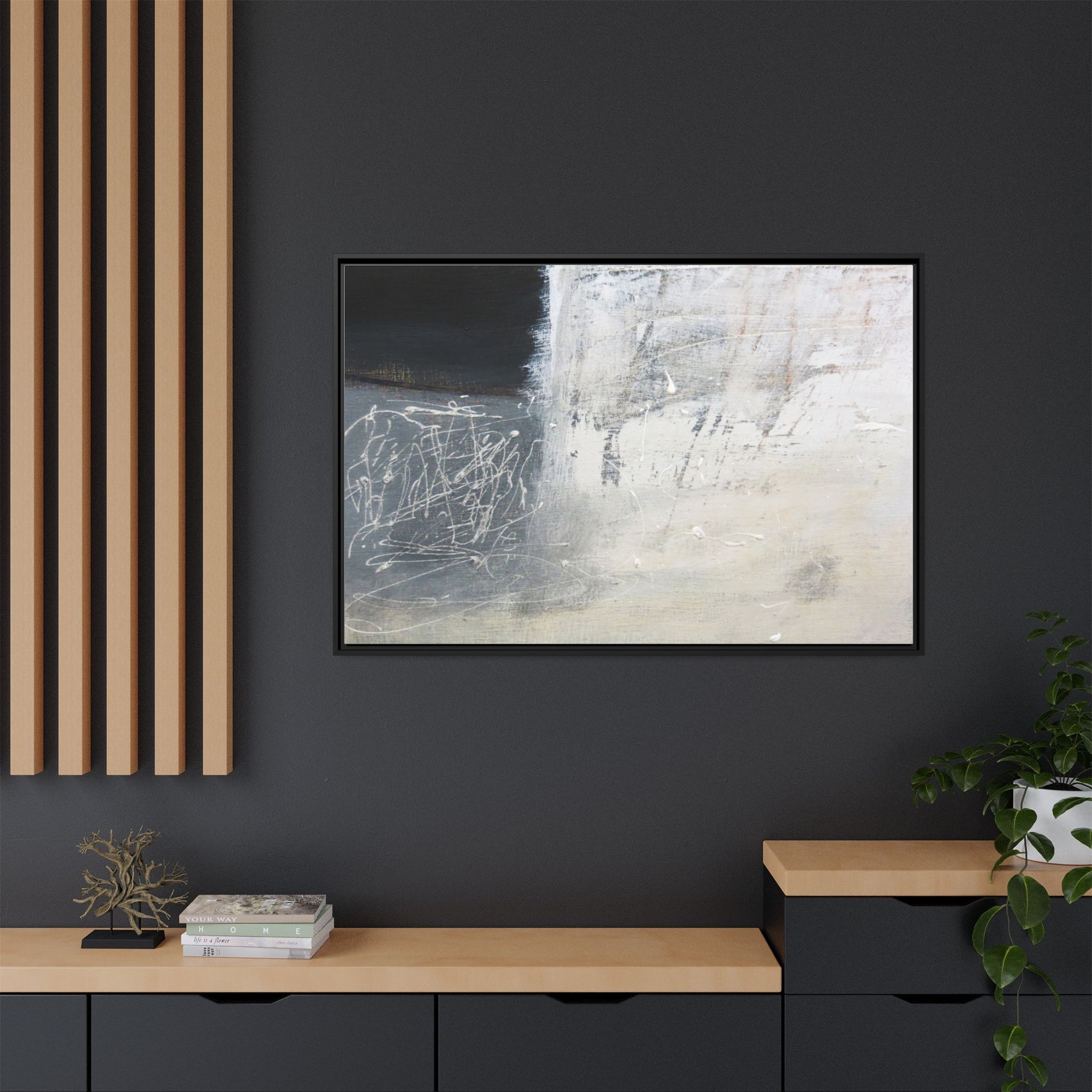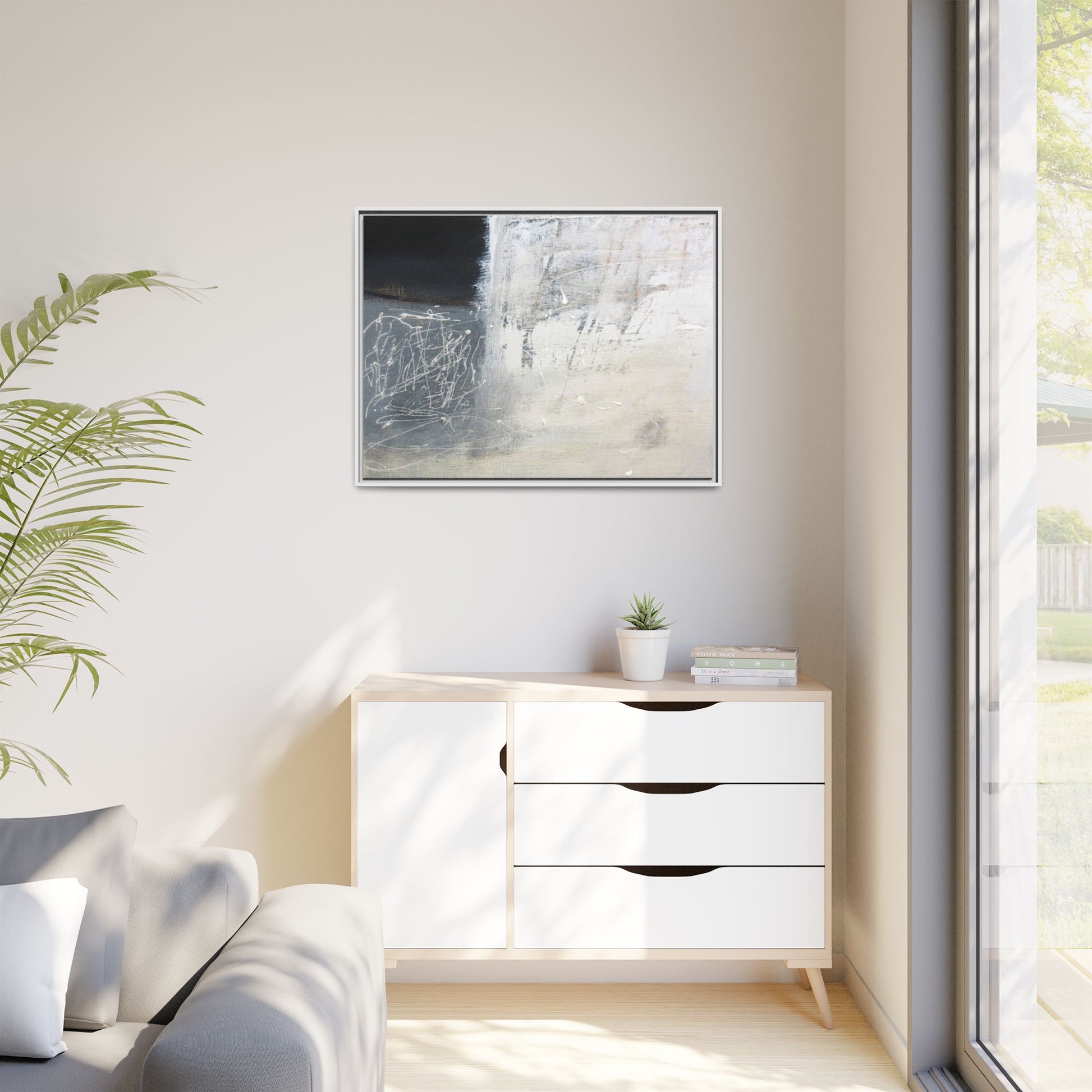 This abstract artwork features a textured, layered composition with a predominantly gray and white color palette. The image appears to be a mixed media piece with scratched and scraped surfaces, creating intricate linear patterns and textural depth. On the left side, there are dense, chaotic white scribble-like marks against a darker background, contrasting with the more muted and worn textures on the right side. The painting exhibits a weathered, almost industrial aesthetic with multiple layers of paint that have been deliberately distressed and manipulated. The overall effect suggests a sense of movement and complexity, with subtle variations in tone and texture that draw the viewer's eye across the canvas.