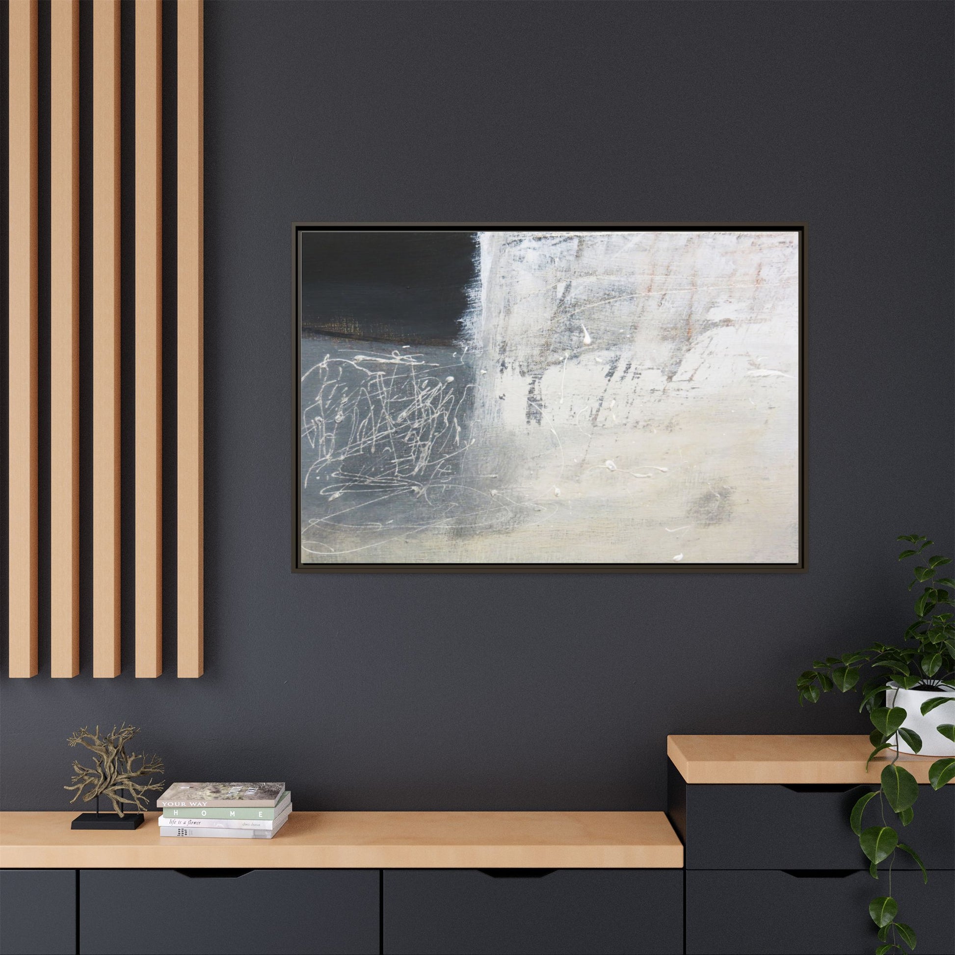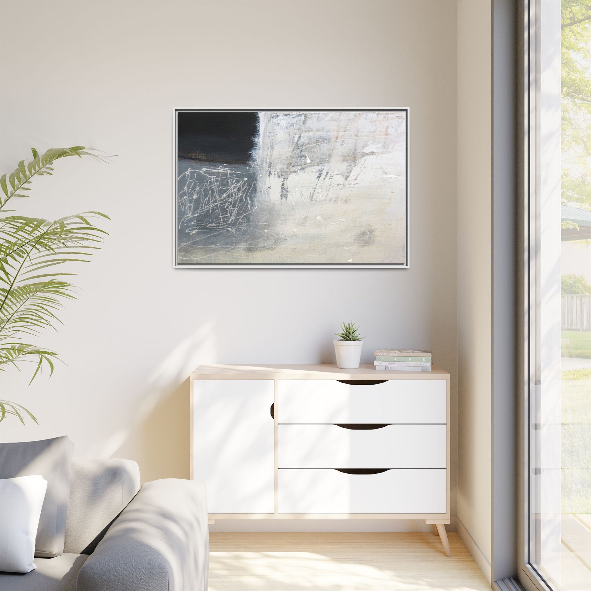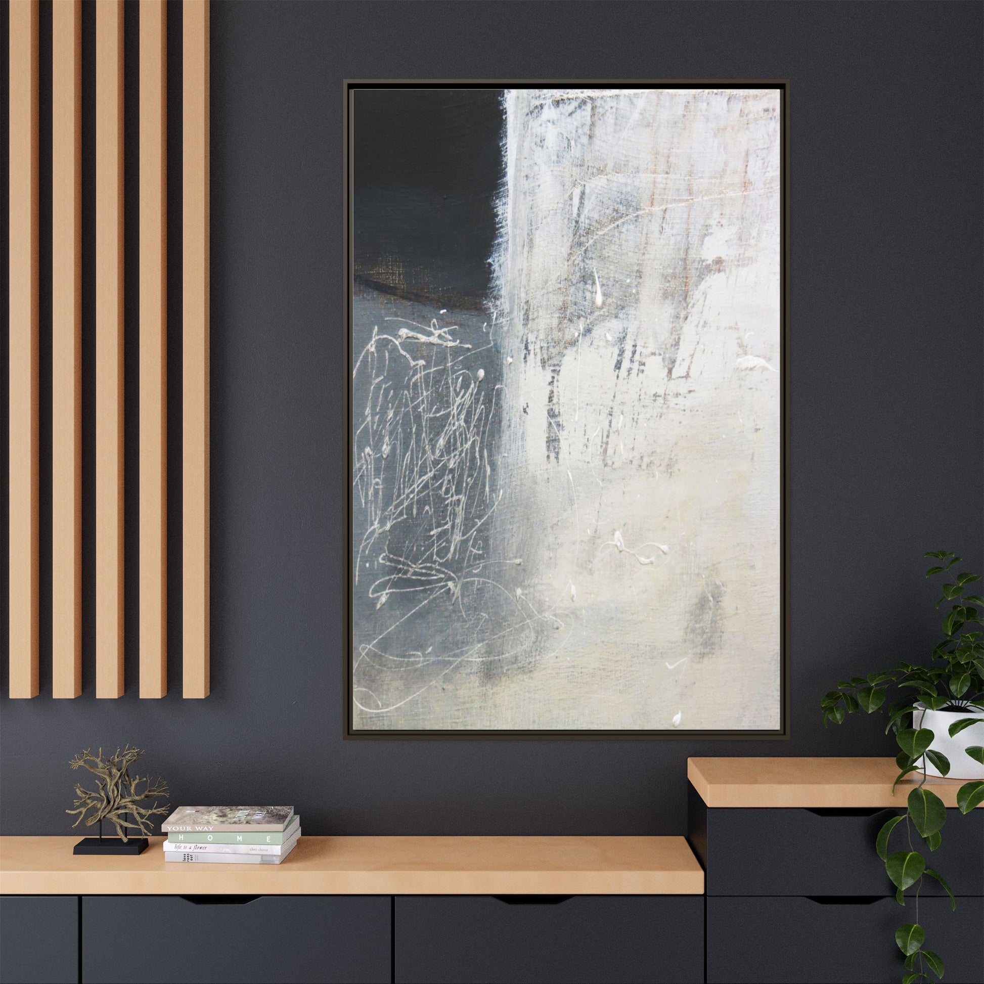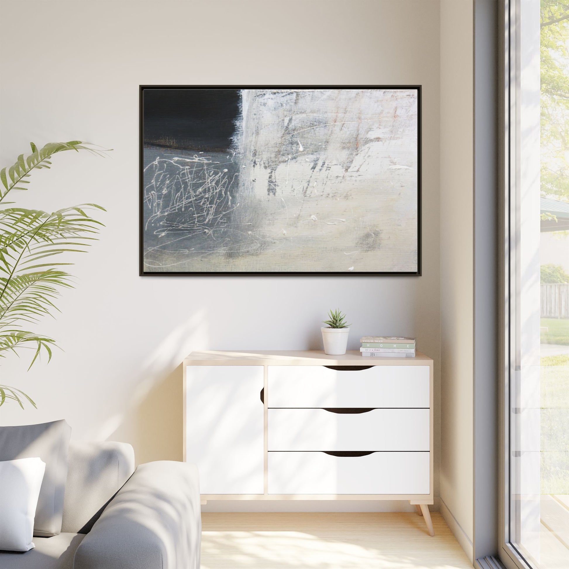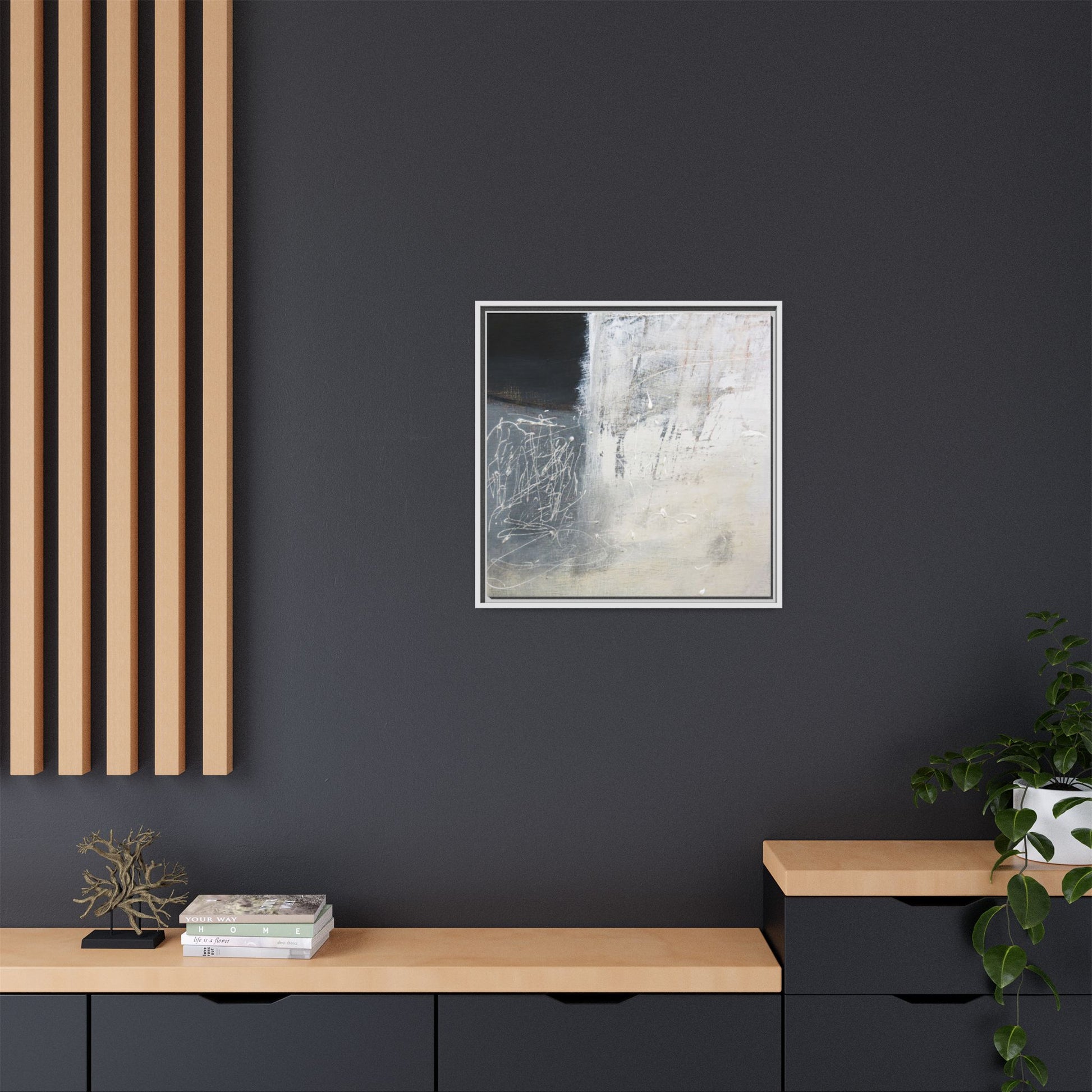 This abstract artwork features a textured, layered composition with a predominantly gray and white color palette. The image appears to be a mixed media piece with scratched and scraped surfaces, creating intricate linear patterns and textural depth. On the left side, there are dense, chaotic white scribble-like marks against a darker background, contrasting with the more muted and worn textures on the right side. The painting exhibits a weathered, almost industrial aesthetic with multiple layers of paint that have been deliberately distressed and manipulated. The overall effect suggests a sense of movement and complexity, with subtle variations in tone and texture that draw the viewer's eye across the canvas.