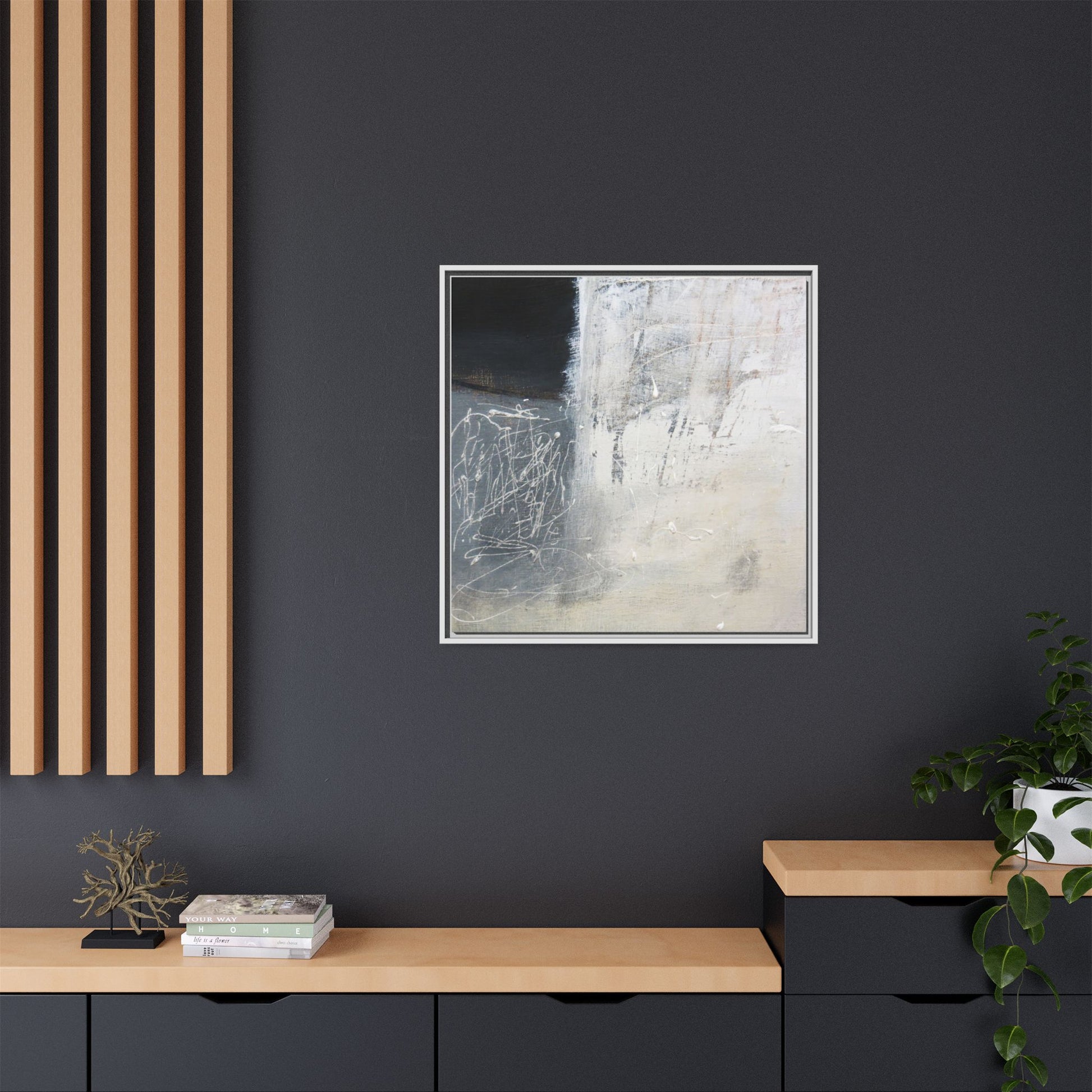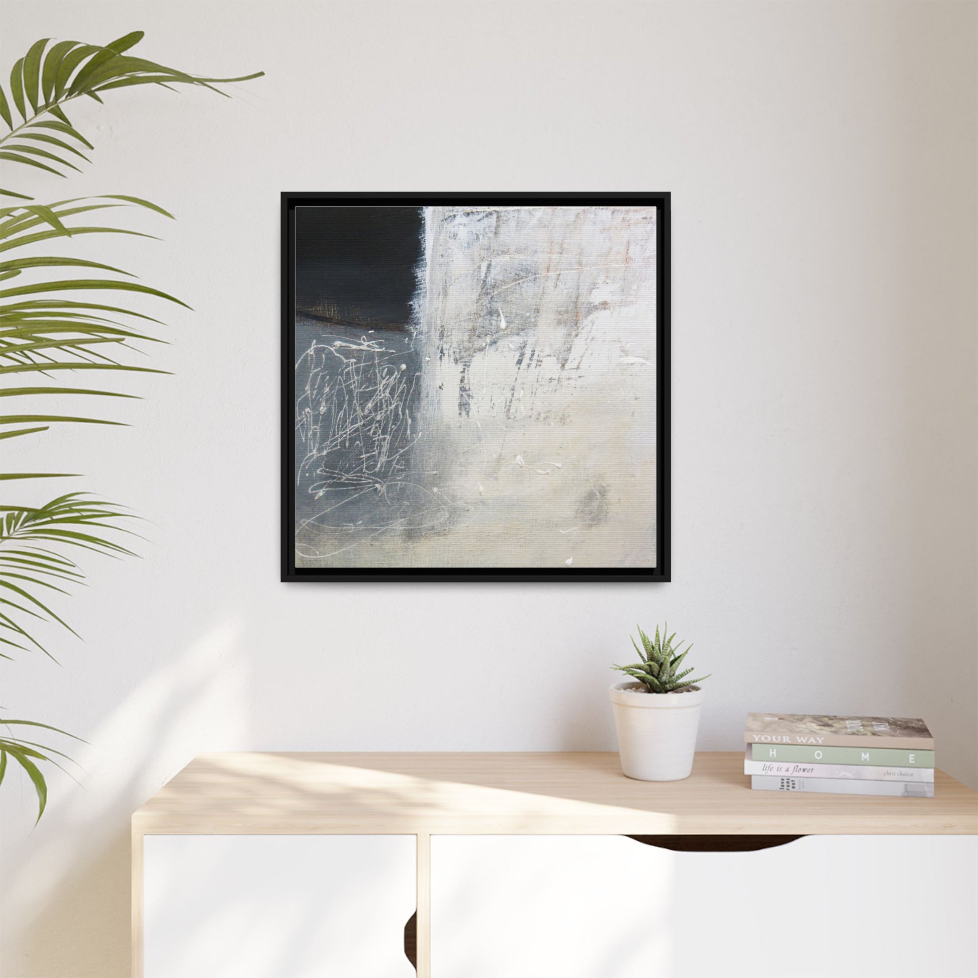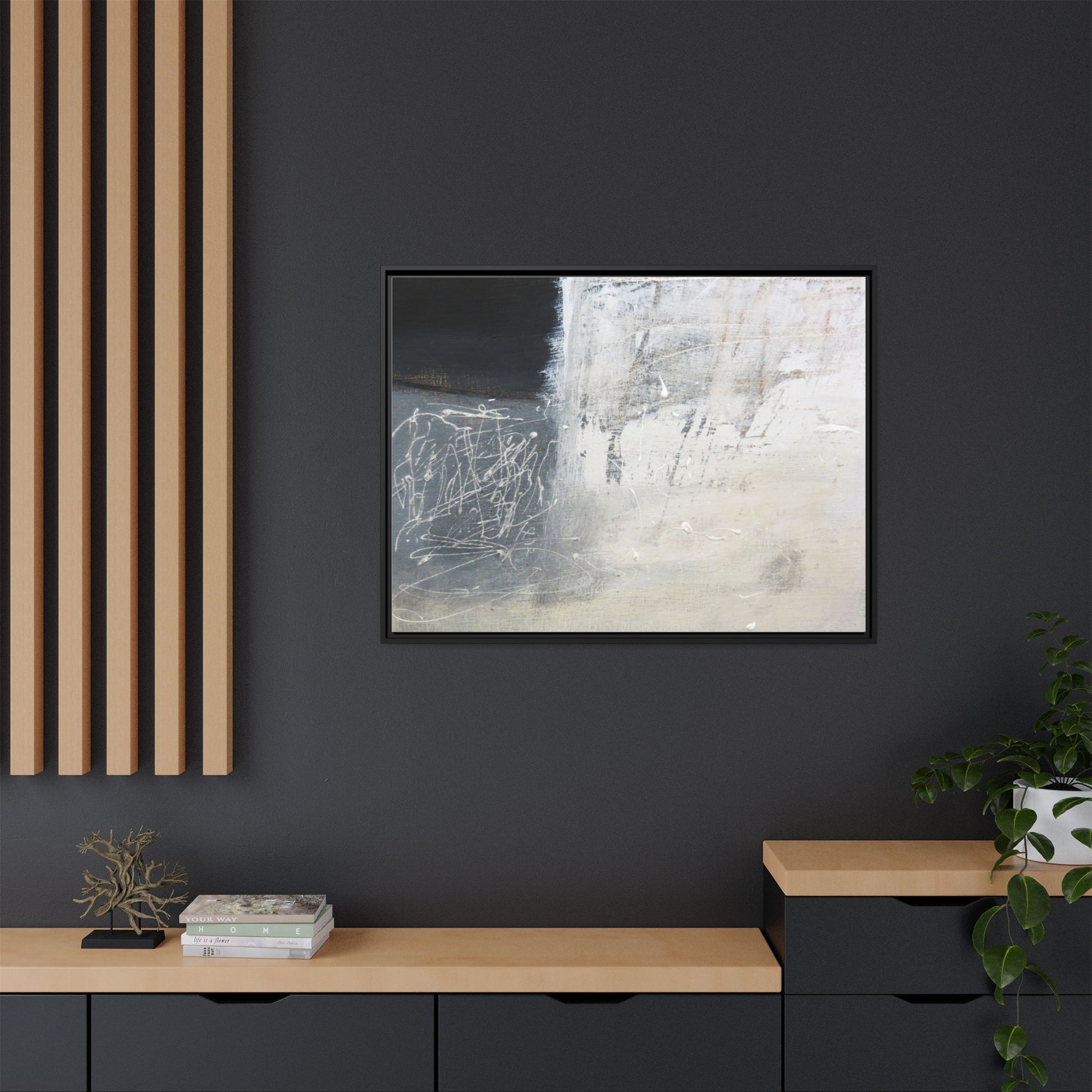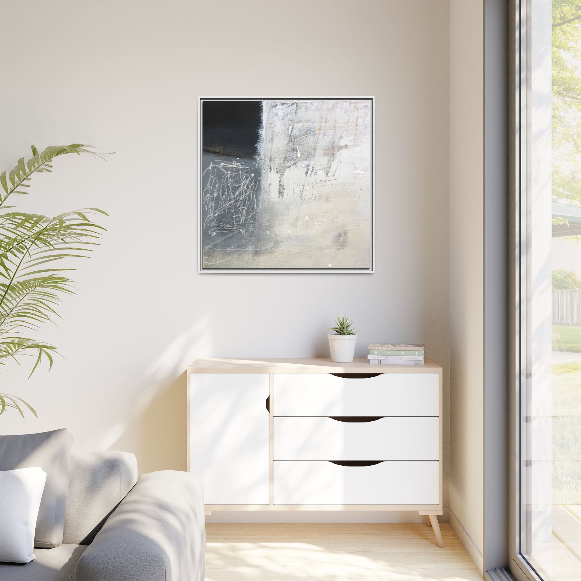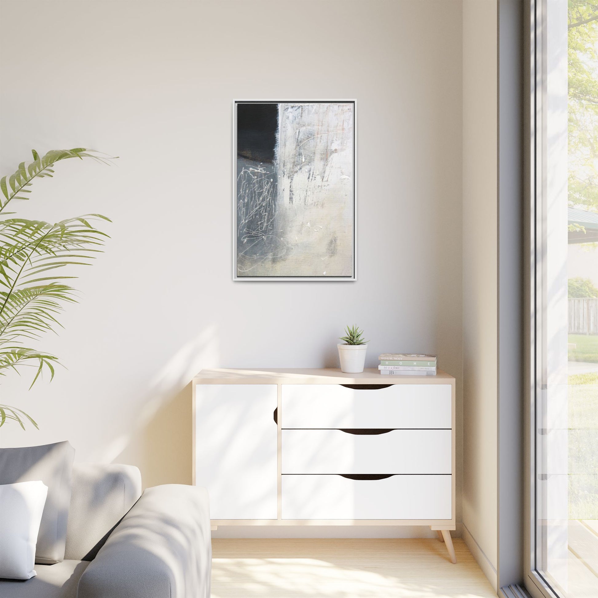 This abstract artwork features a textured, layered composition with a predominantly gray and white color palette. The image appears to be a mixed media piece with scratched and scraped surfaces, creating intricate linear patterns and textural depth. On the left side, there are dense, chaotic white scribble-like marks against a darker background, contrasting with the more muted and worn textures on the right side. The painting exhibits a weathered, almost industrial aesthetic with multiple layers of paint that have been deliberately distressed and manipulated. The overall effect suggests a sense of movement and complexity, with subtle variations in tone and texture that draw the viewer's eye across the canvas.
