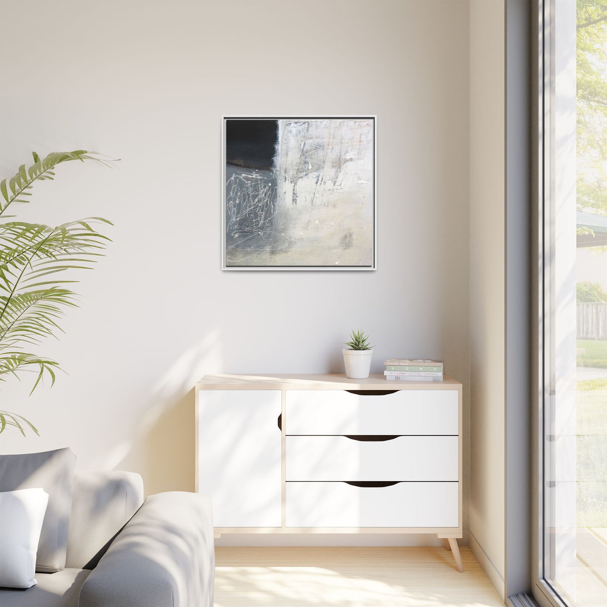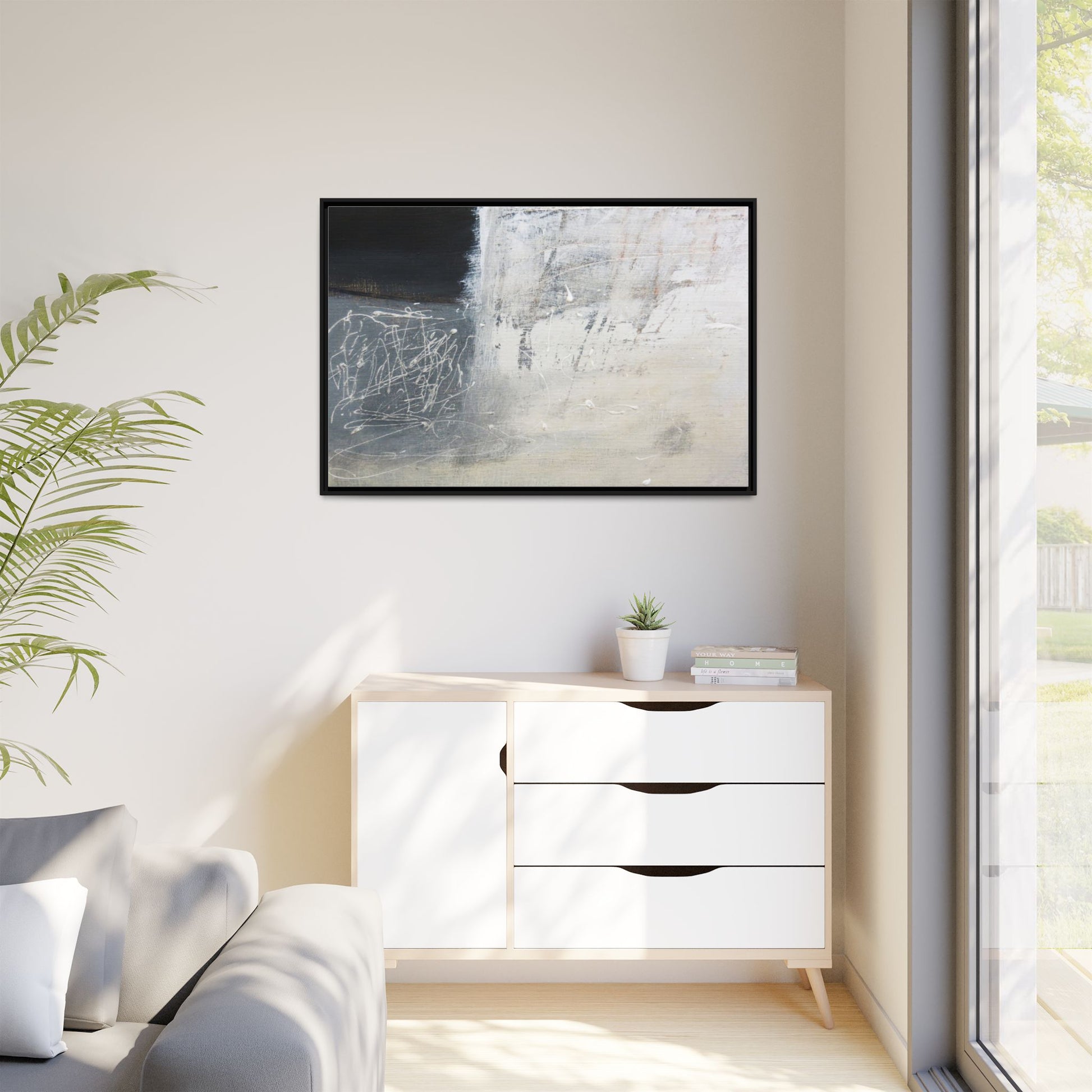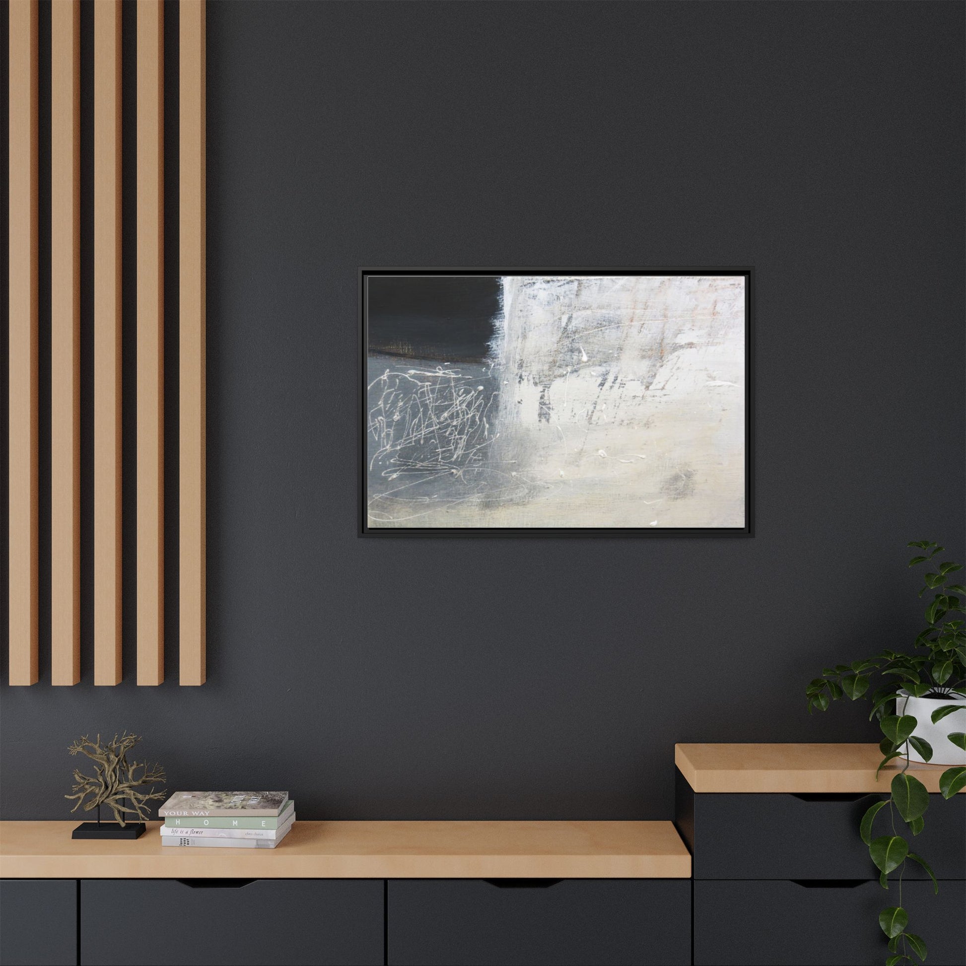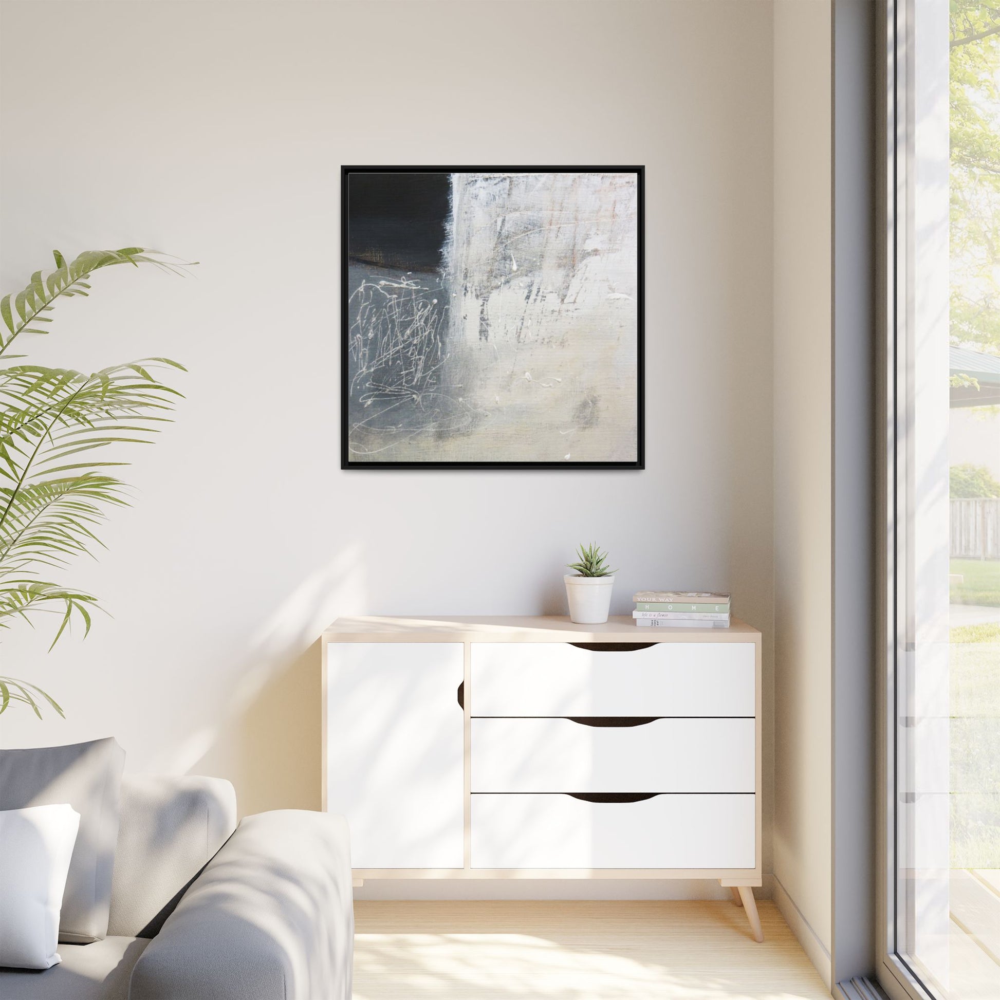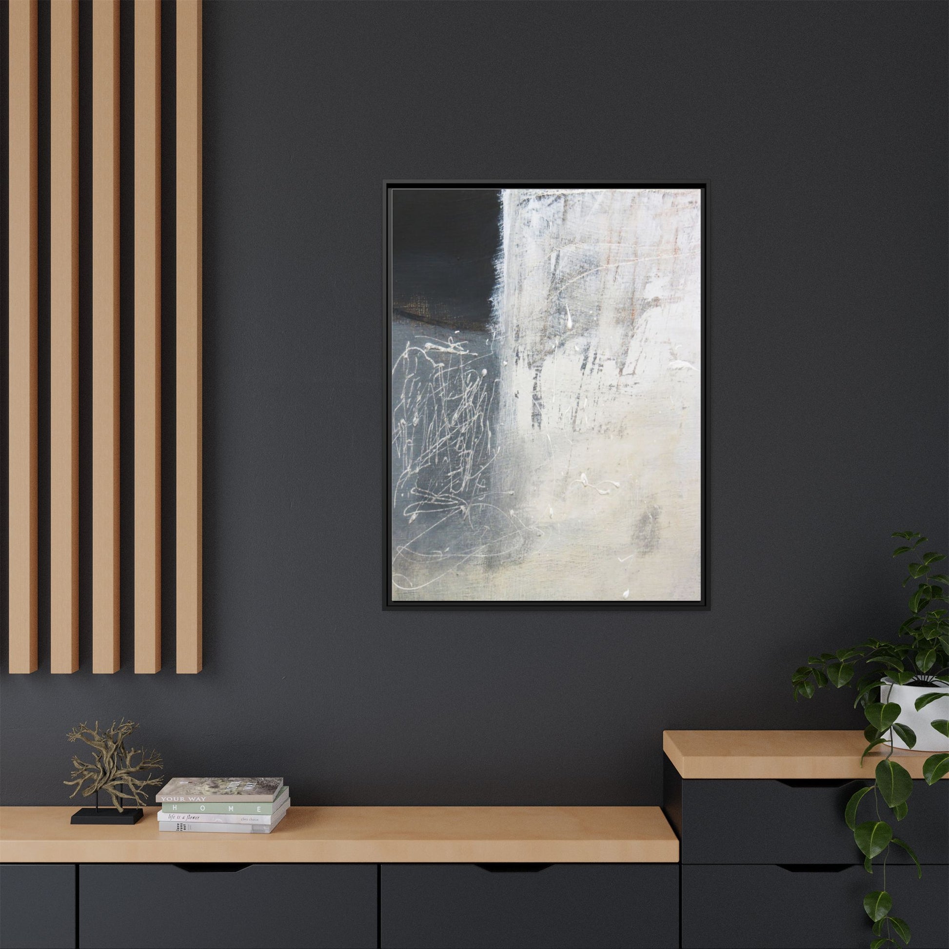 This abstract artwork features a textured, layered composition with a predominantly gray and white color palette. The image appears to be a mixed media piece with scratched and scraped surfaces, creating intricate linear patterns and textural depth. On the left side, there are dense, chaotic white scribble-like marks against a darker background, contrasting with the more muted and worn textures on the right side. The painting exhibits a weathered, almost industrial aesthetic with multiple layers of paint that have been deliberately distressed and manipulated. The overall effect suggests a sense of movement and complexity, with subtle variations in tone and texture that draw the viewer's eye across the canvas.