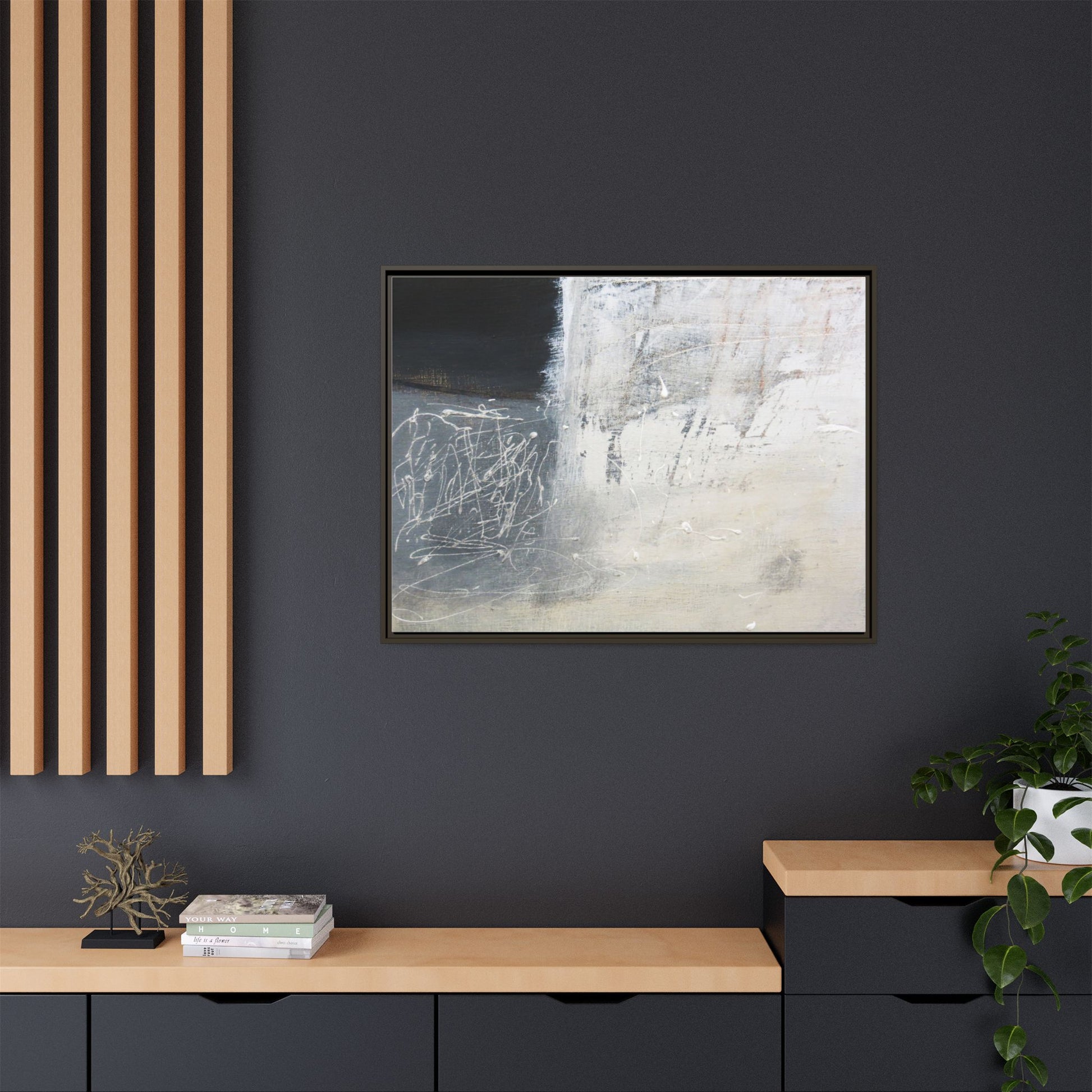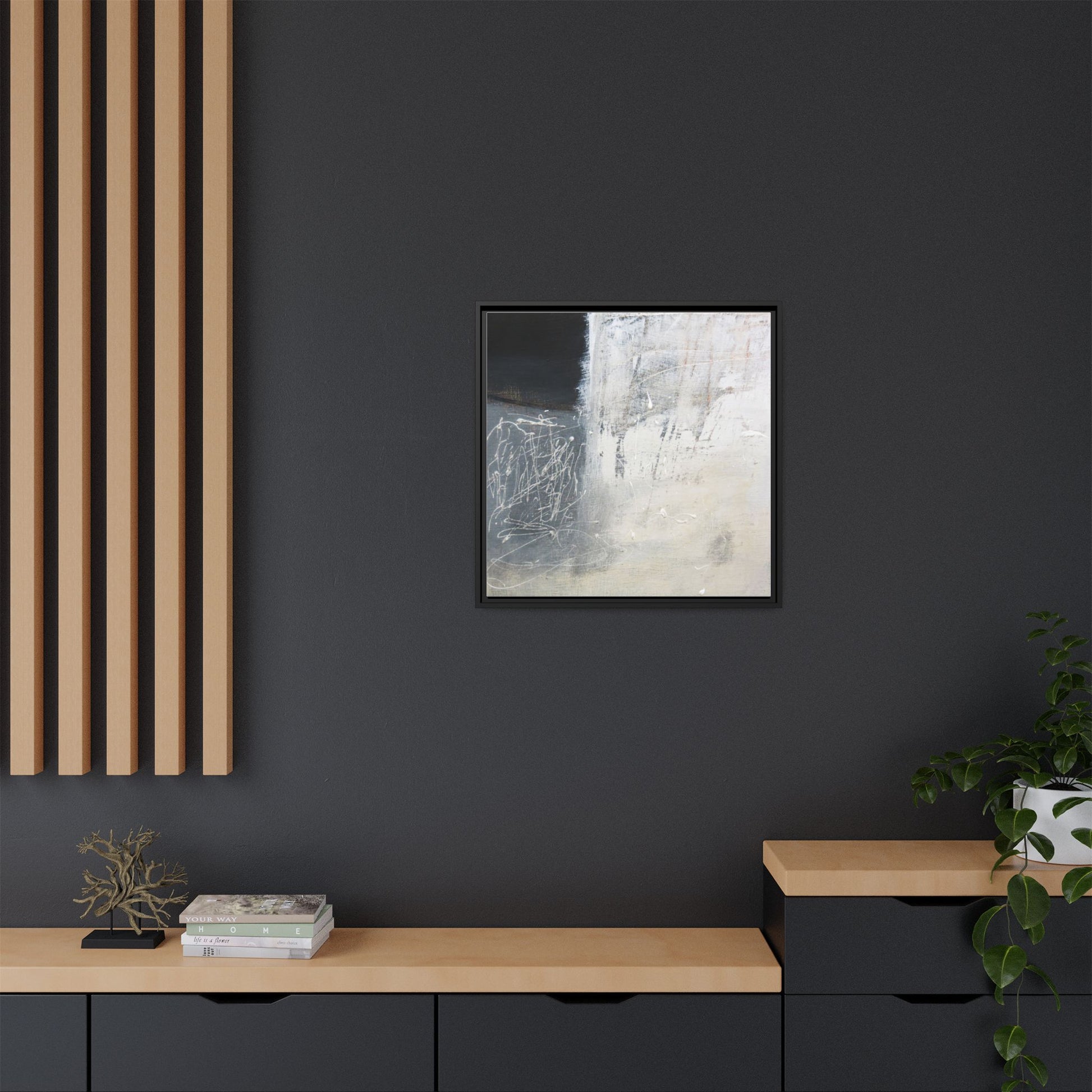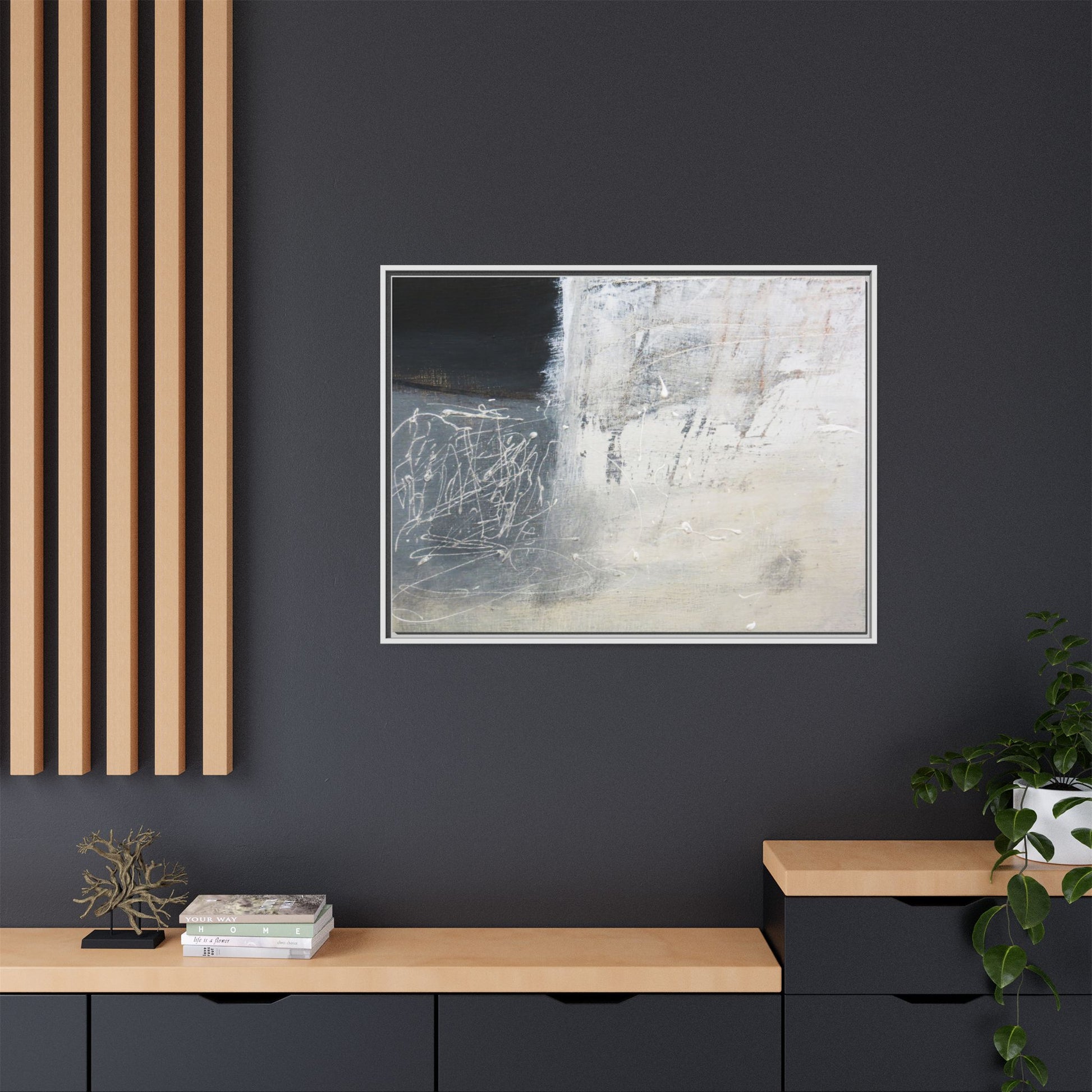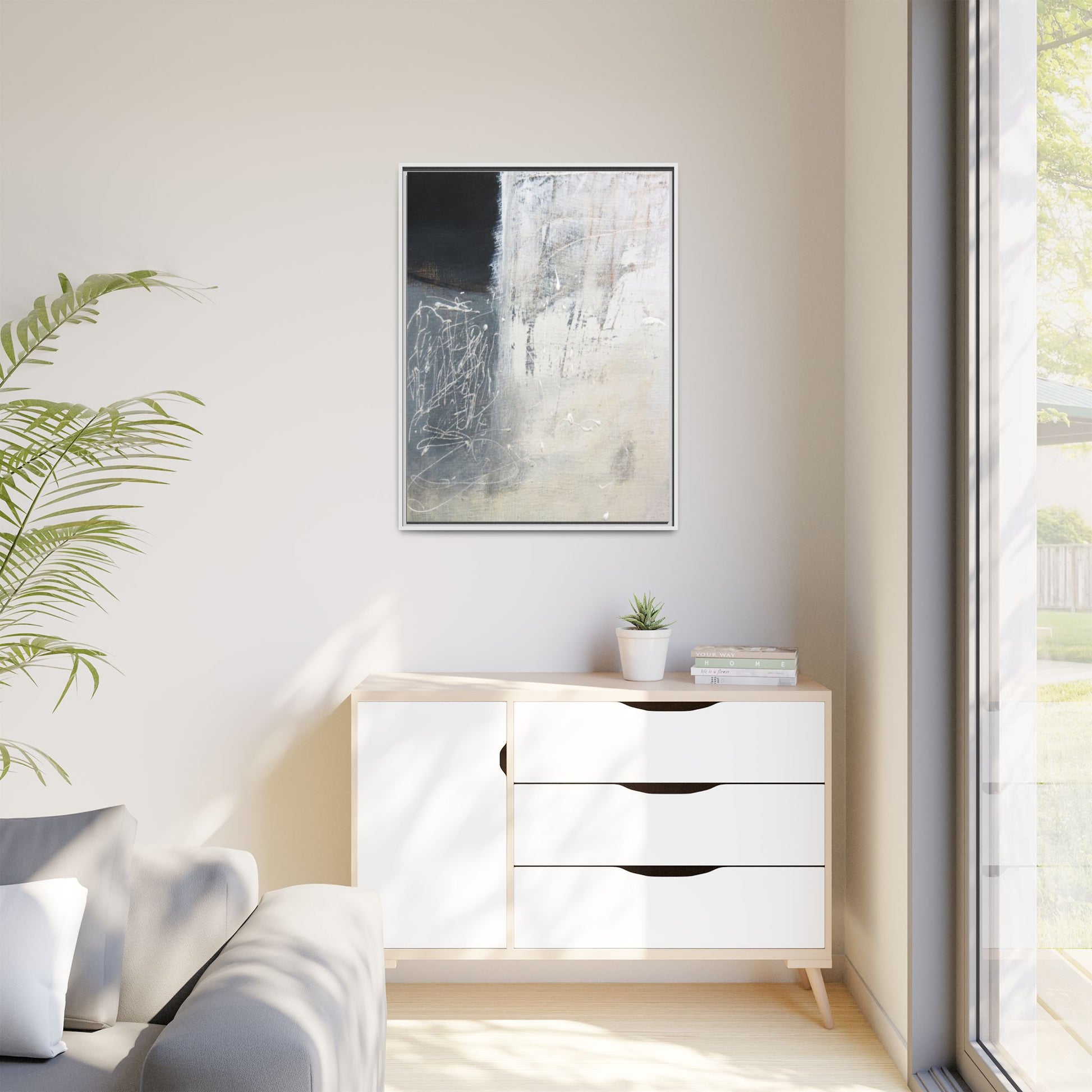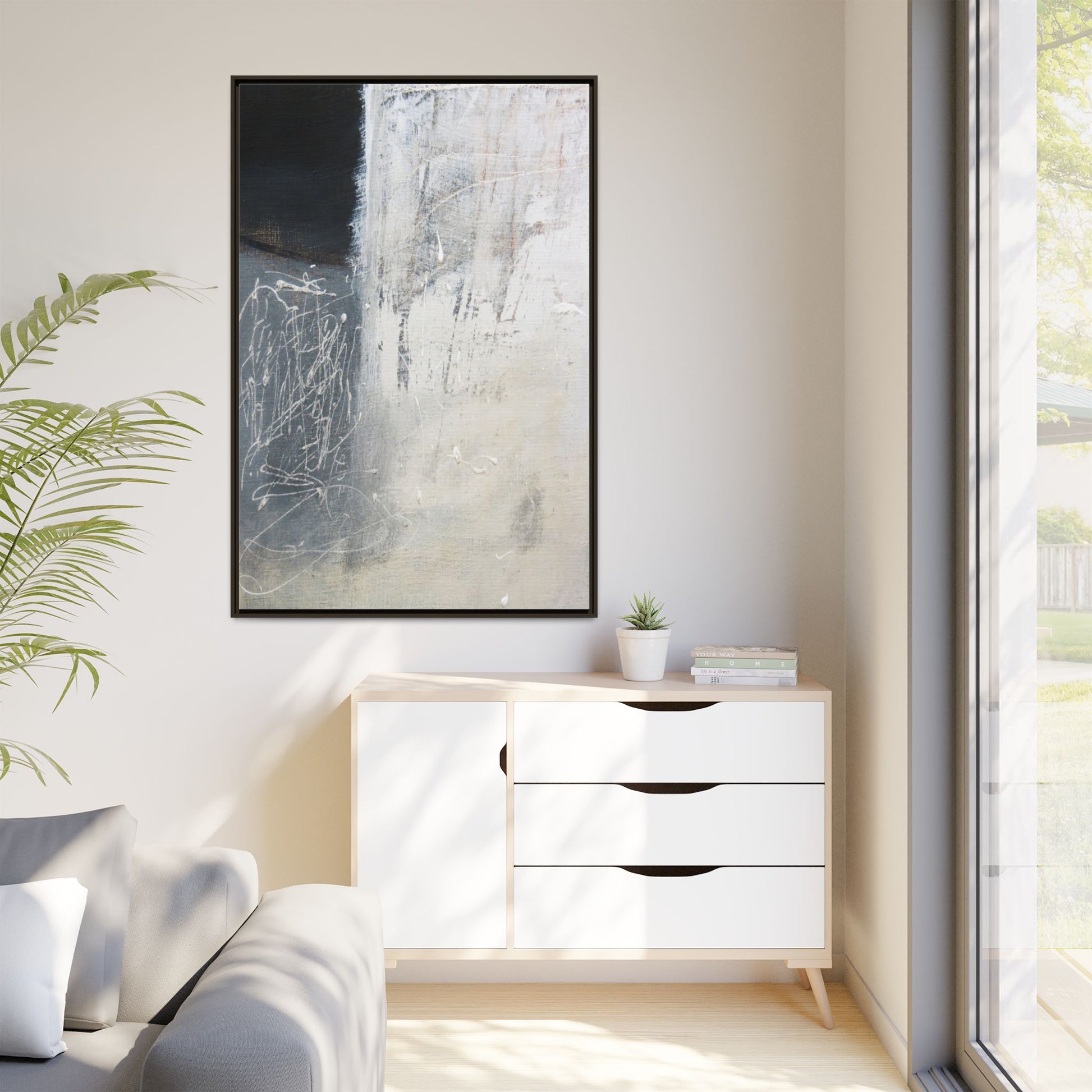 This abstract artwork features a textured, layered composition with a predominantly gray and white color palette. The image appears to be a mixed media piece with scratched and scraped surfaces, creating intricate linear patterns and textural depth. On the left side, there are dense, chaotic white scribble-like marks against a darker background, contrasting with the more muted and worn textures on the right side. The painting exhibits a weathered, almost industrial aesthetic with multiple layers of paint that have been deliberately distressed and manipulated. The overall effect suggests a sense of movement and complexity, with subtle variations in tone and texture that draw the viewer's eye across the canvas.