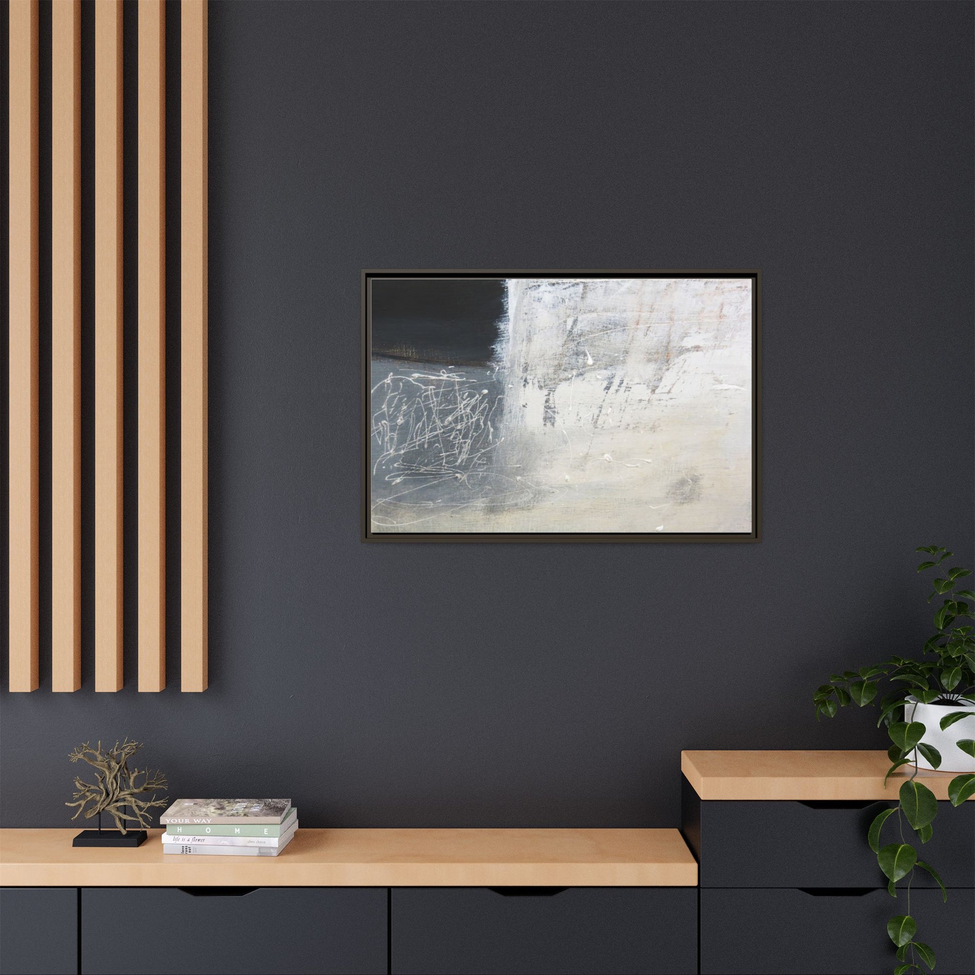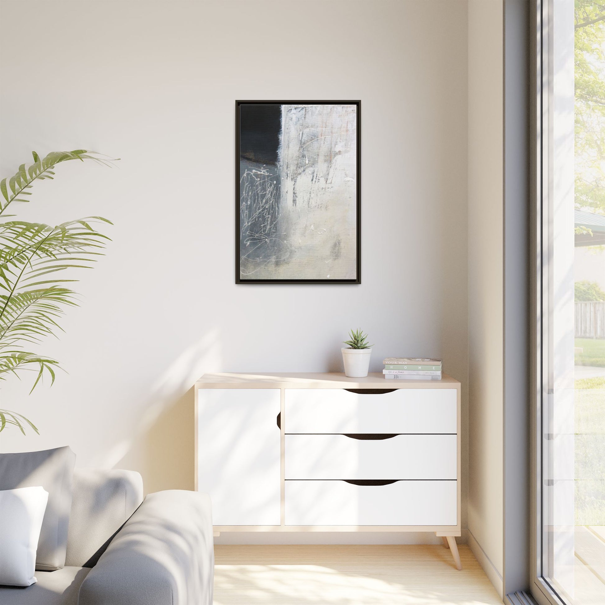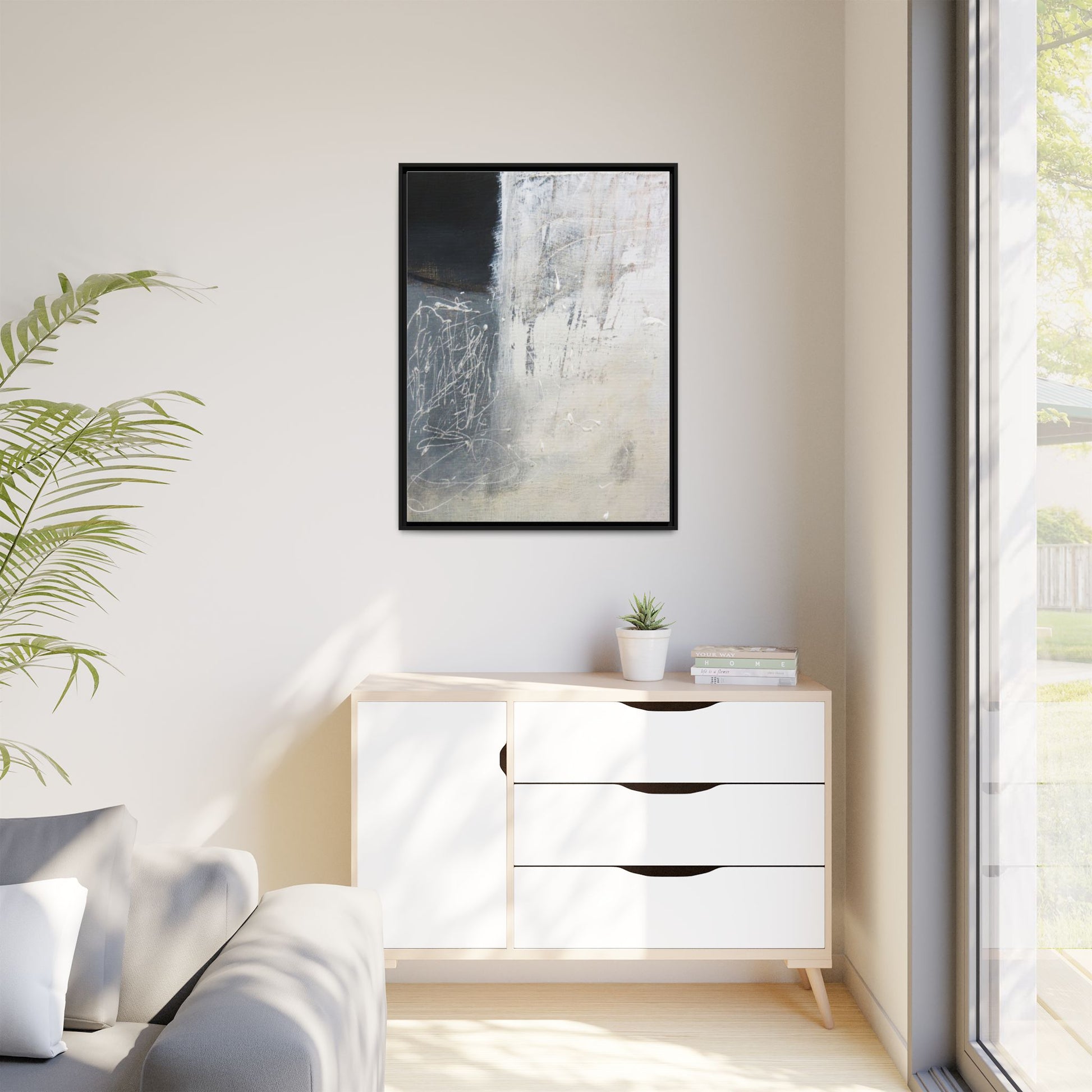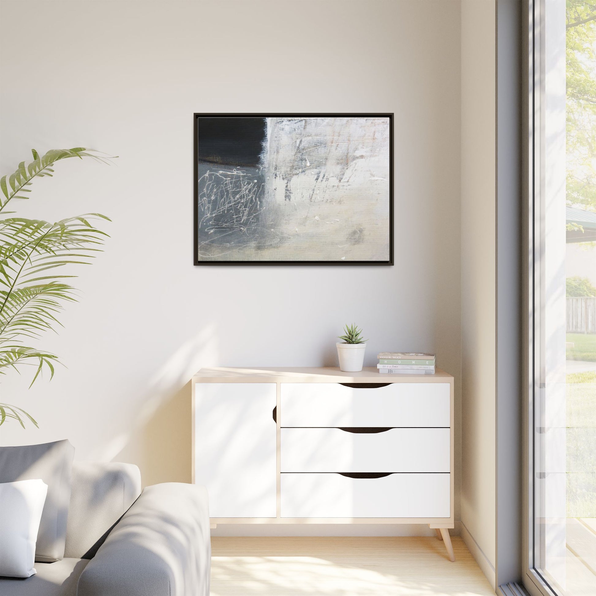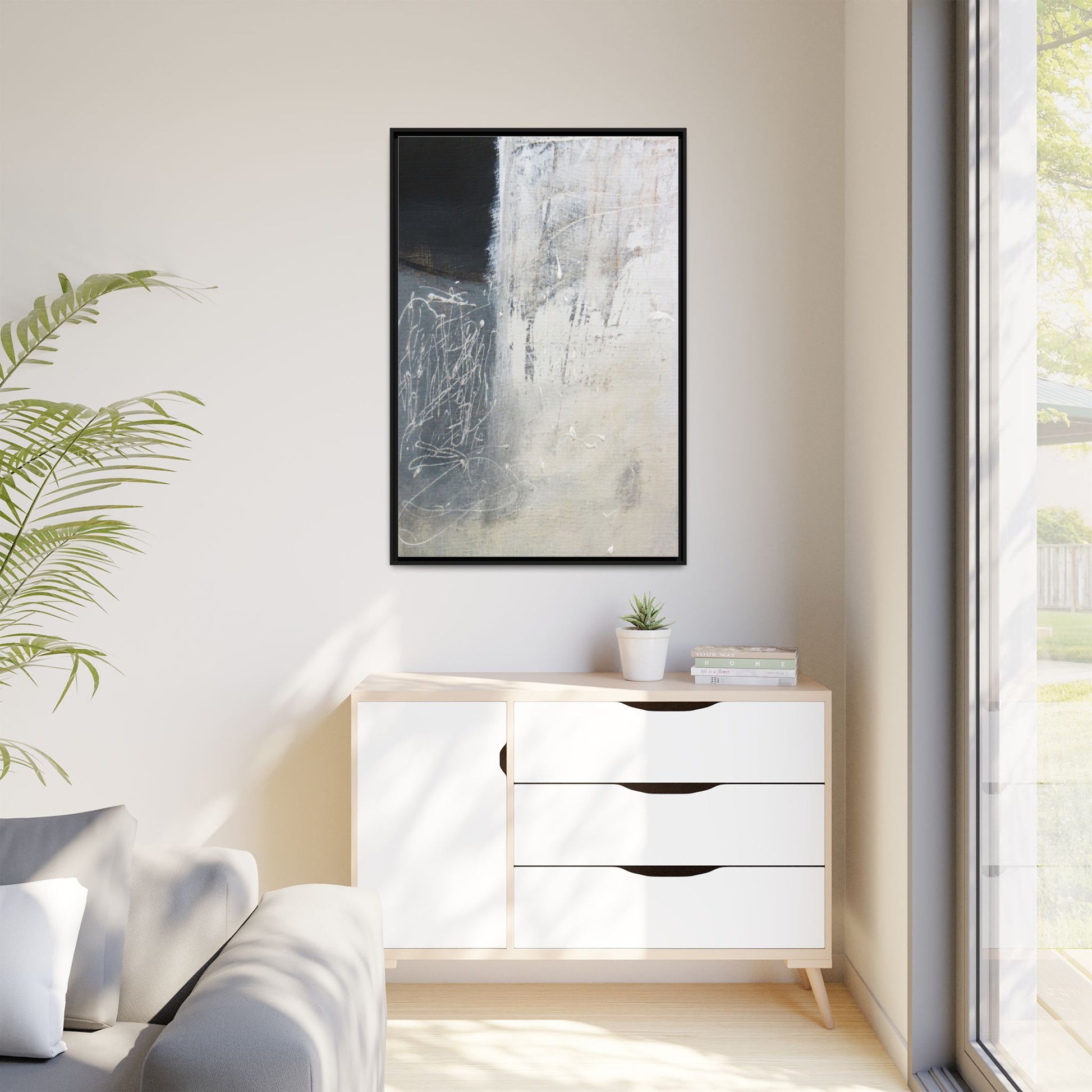 This abstract artwork features a textured, layered composition with a predominantly gray and white color palette. The image appears to be a mixed media piece with scratched and scraped surfaces, creating intricate linear patterns and textural depth. On the left side, there are dense, chaotic white scribble-like marks against a darker background, contrasting with the more muted and worn textures on the right side. The painting exhibits a weathered, almost industrial aesthetic with multiple layers of paint that have been deliberately distressed and manipulated. The overall effect suggests a sense of movement and complexity, with subtle variations in tone and texture that draw the viewer's eye across the canvas.
