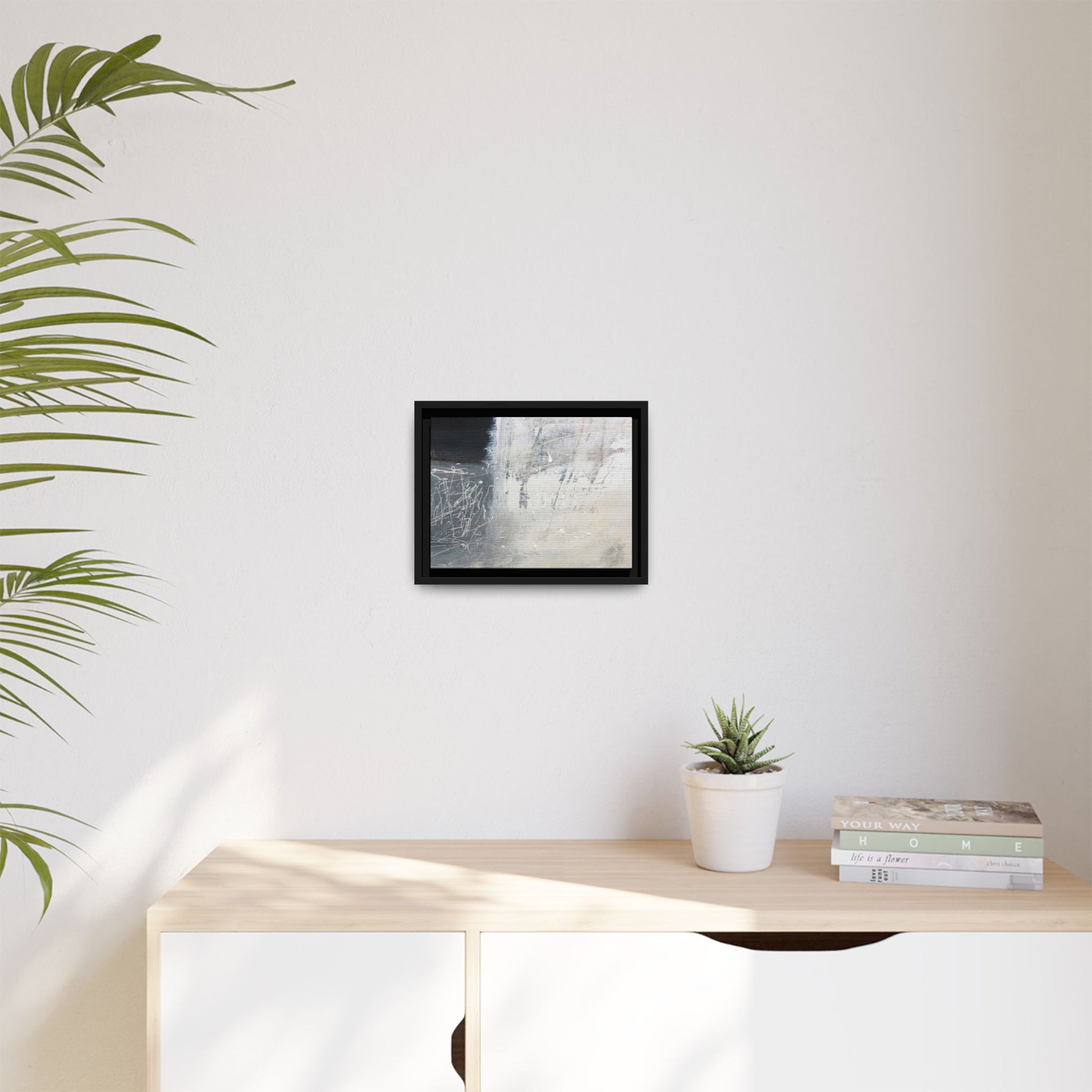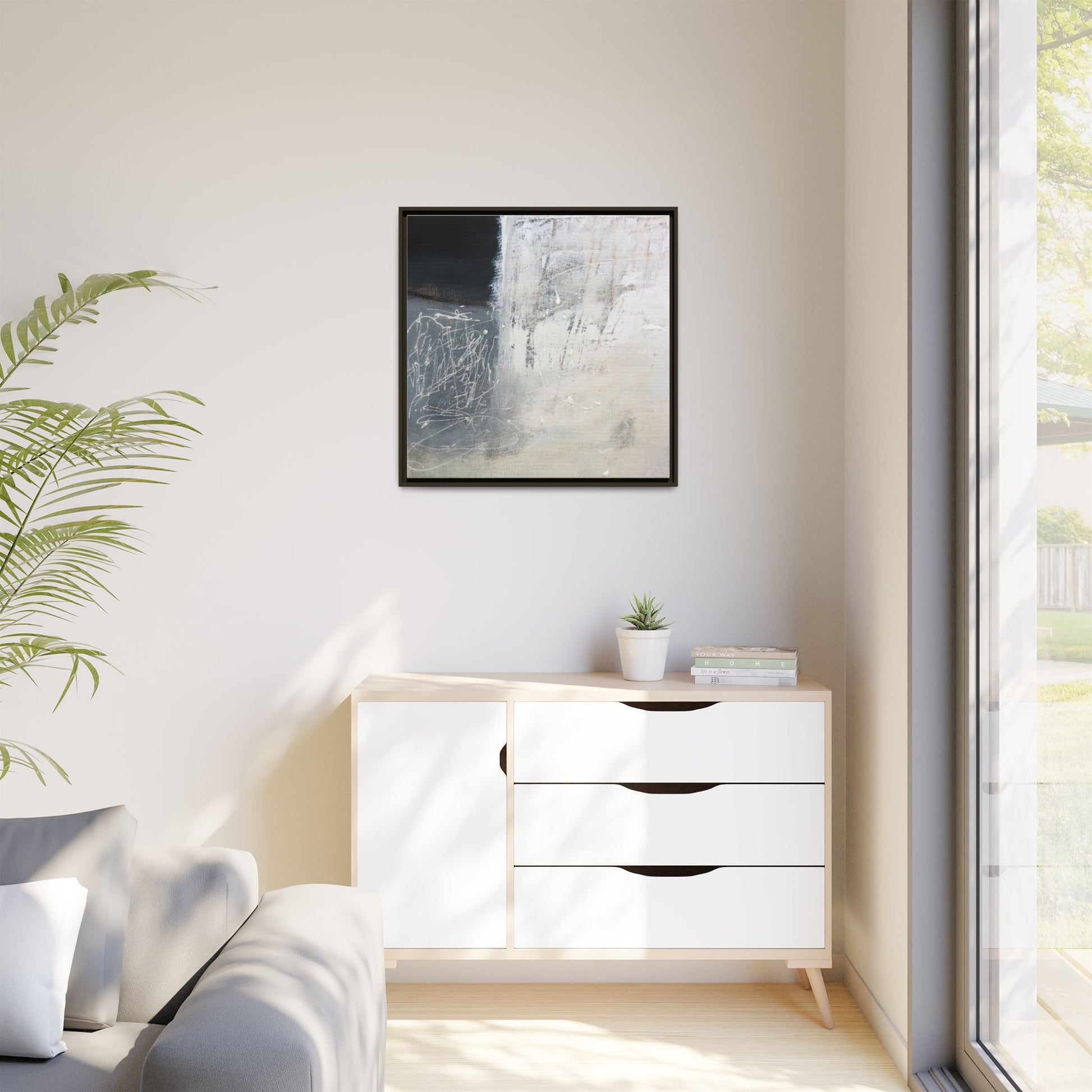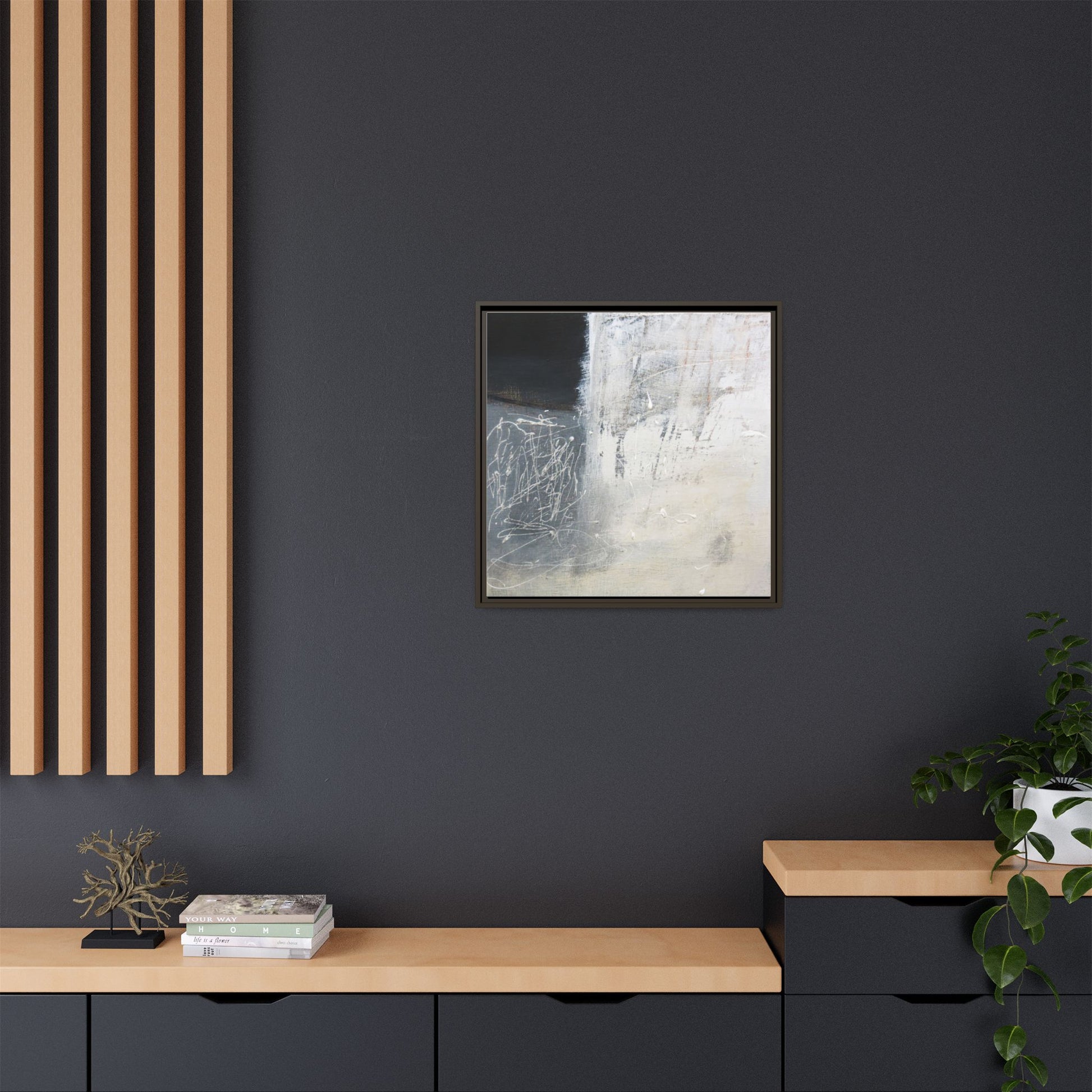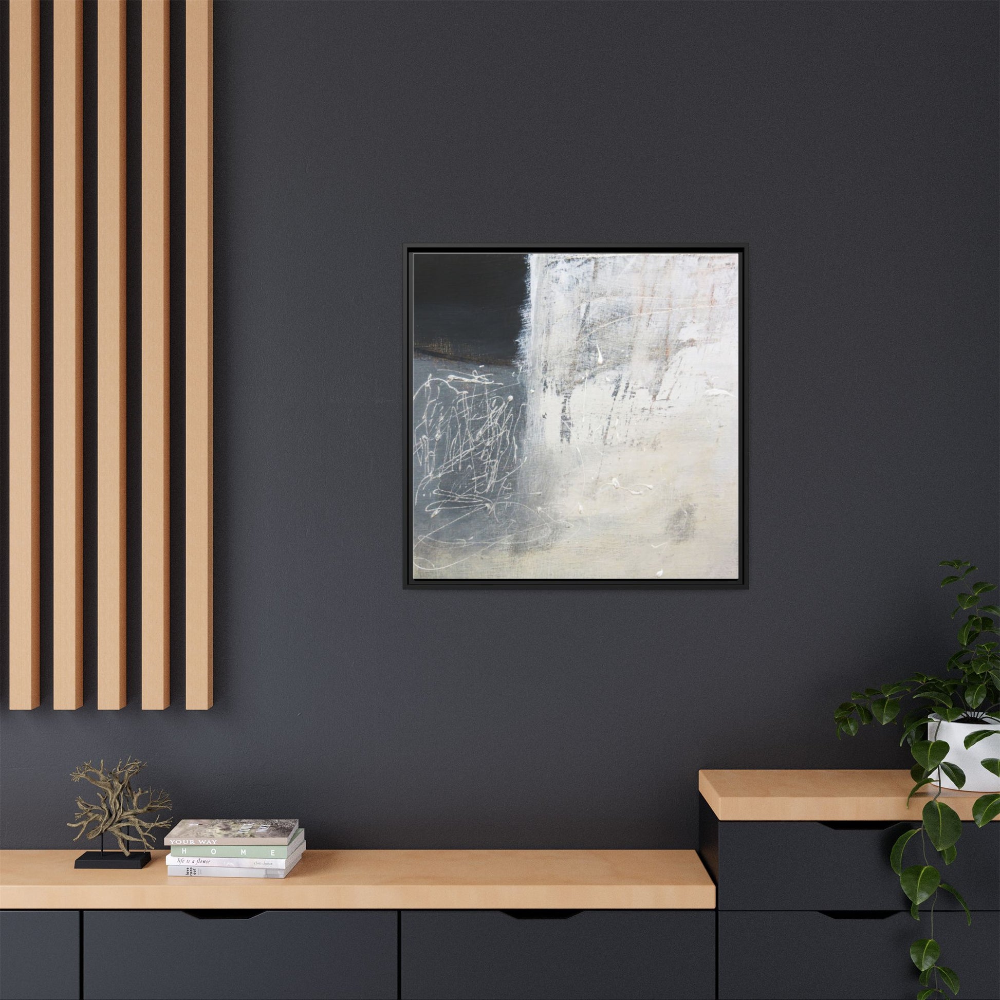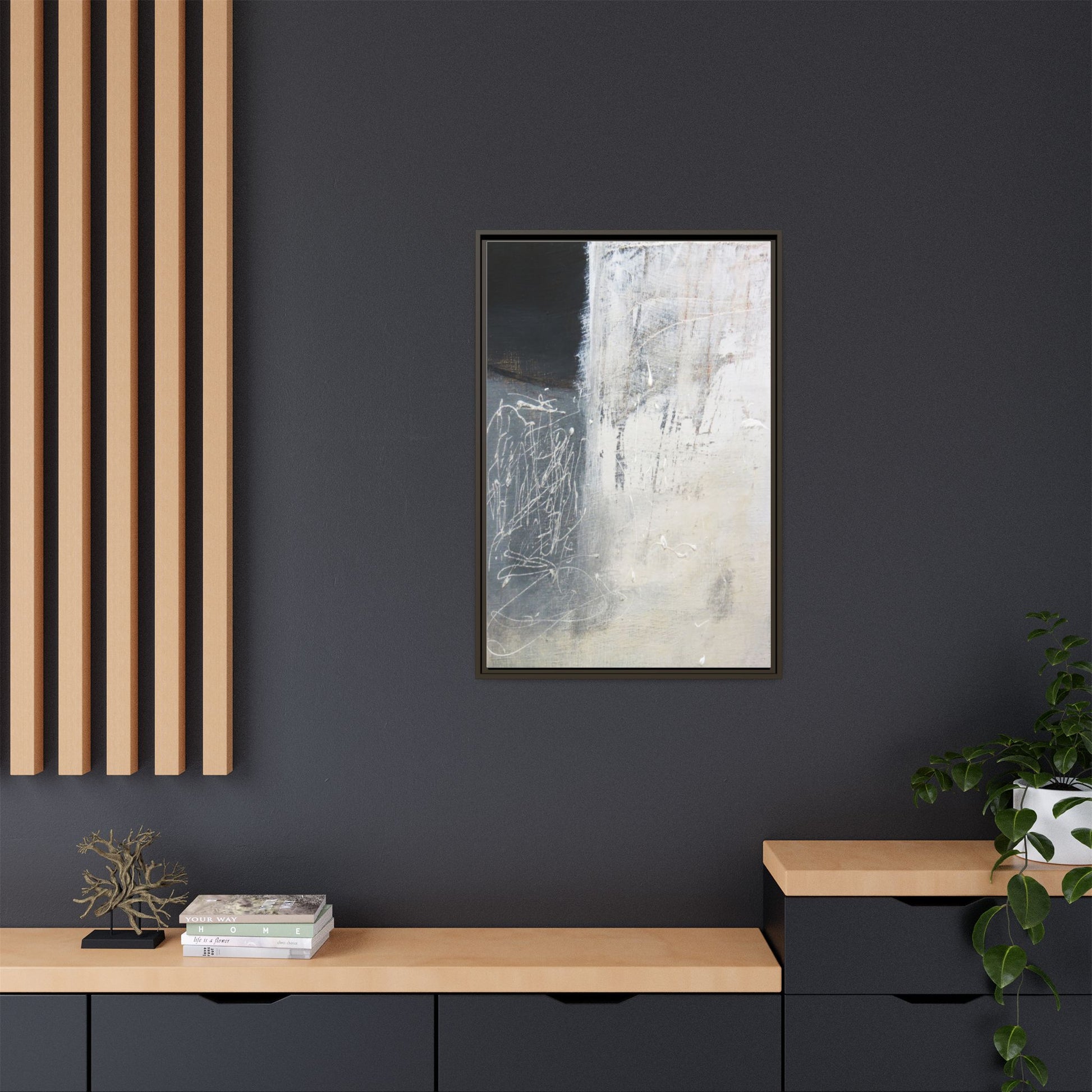 This abstract artwork features a textured, layered composition with a predominantly gray and white color palette. The image appears to be a mixed media piece with scratched and scraped surfaces, creating intricate linear patterns and textural depth. On the left side, there are dense, chaotic white scribble-like marks against a darker background, contrasting with the more muted and worn textures on the right side. The painting exhibits a weathered, almost industrial aesthetic with multiple layers of paint that have been deliberately distressed and manipulated. The overall effect suggests a sense of movement and complexity, with subtle variations in tone and texture that draw the viewer's eye across the canvas.