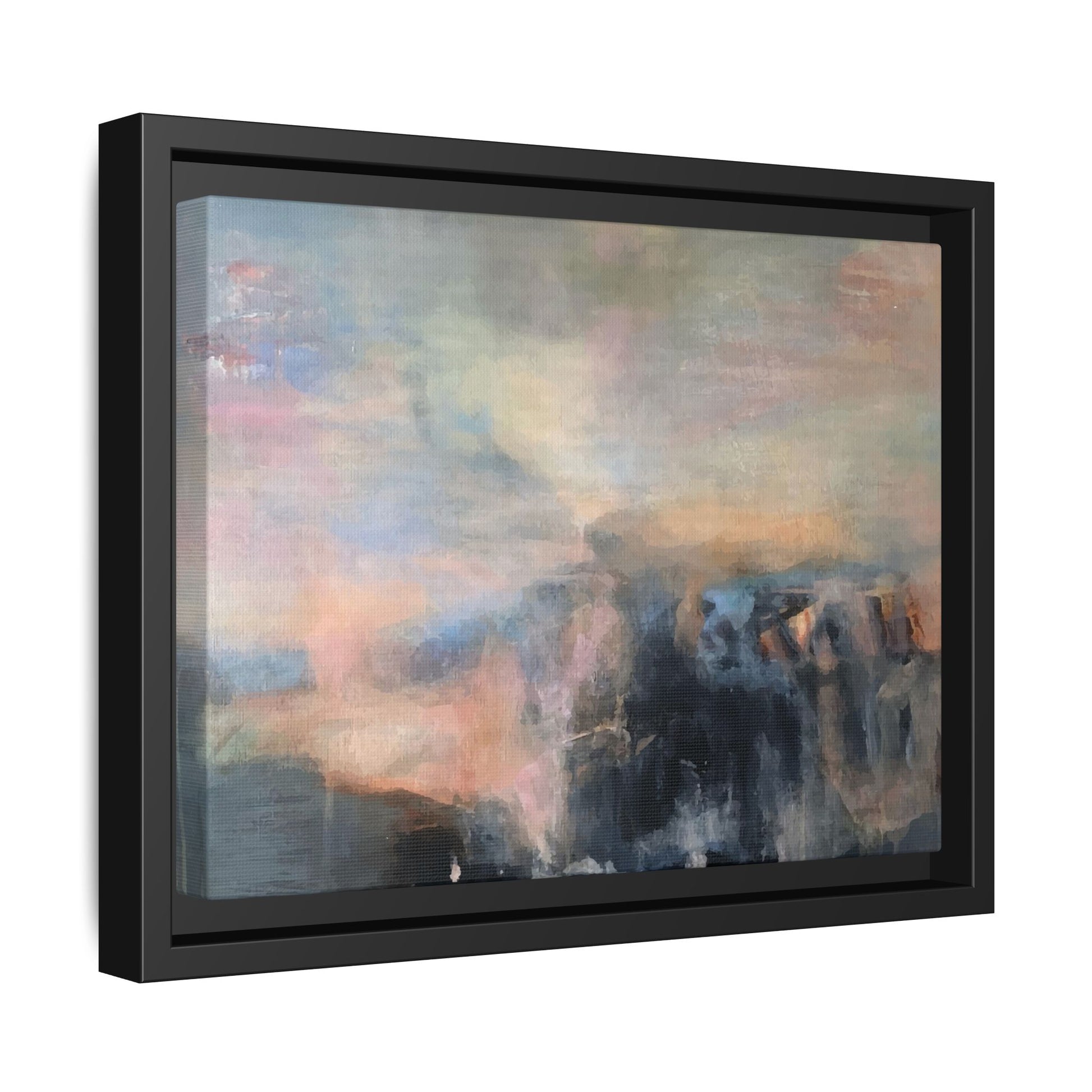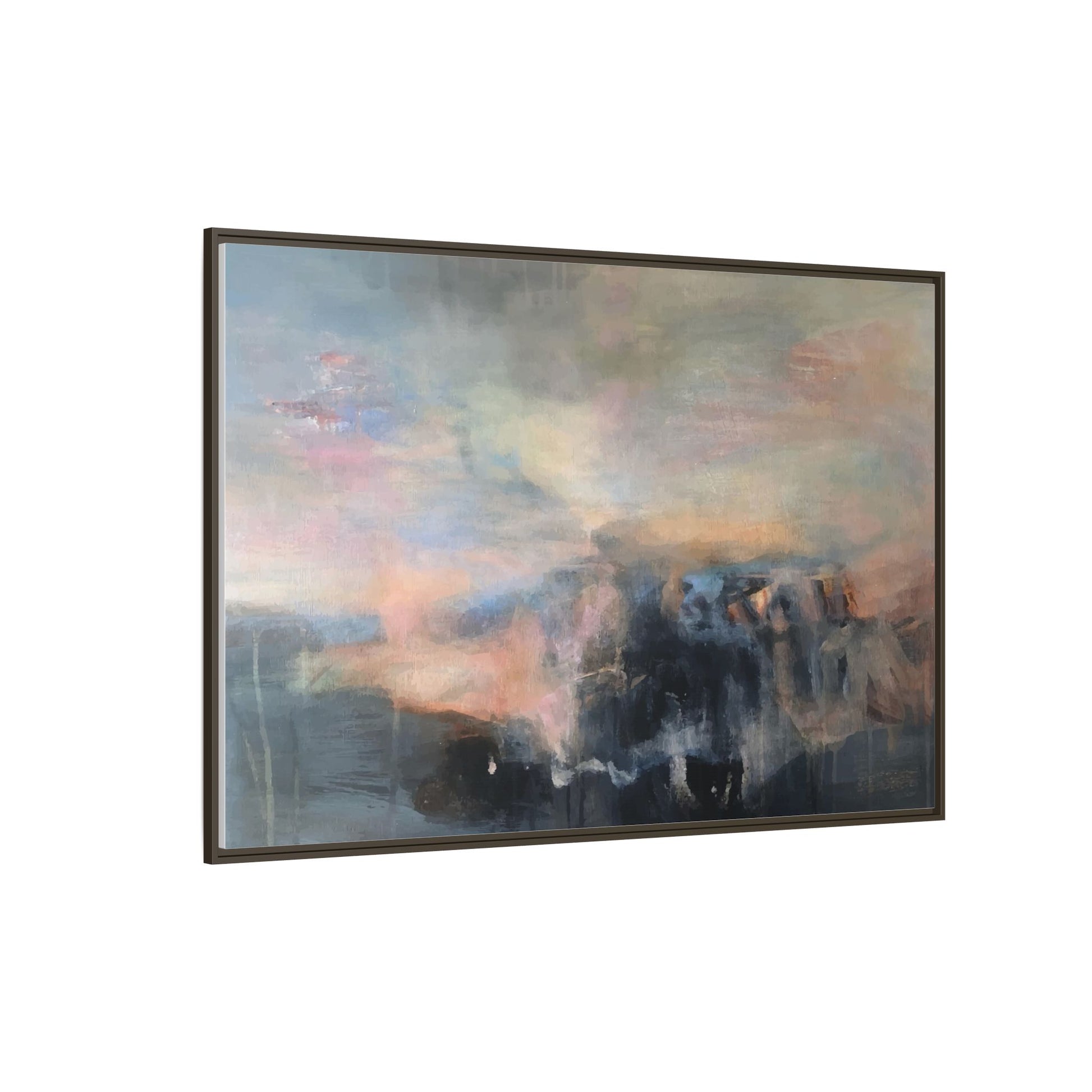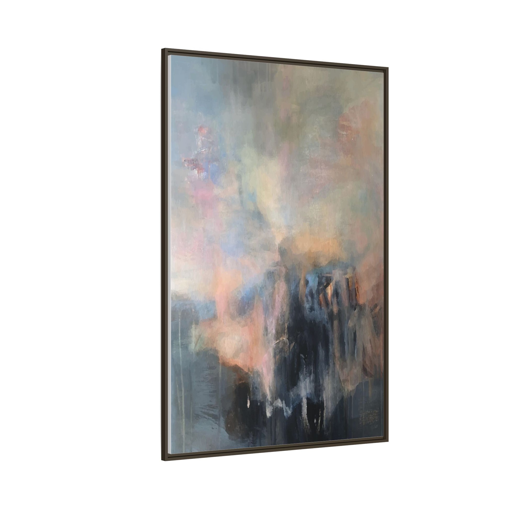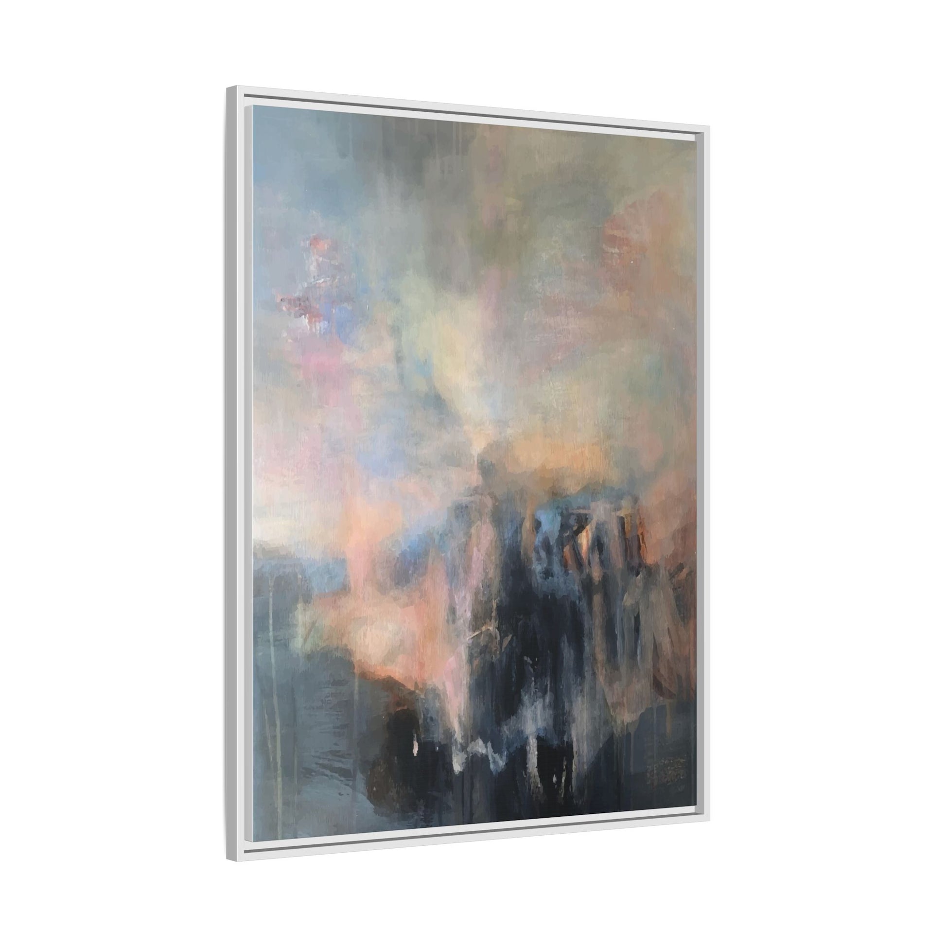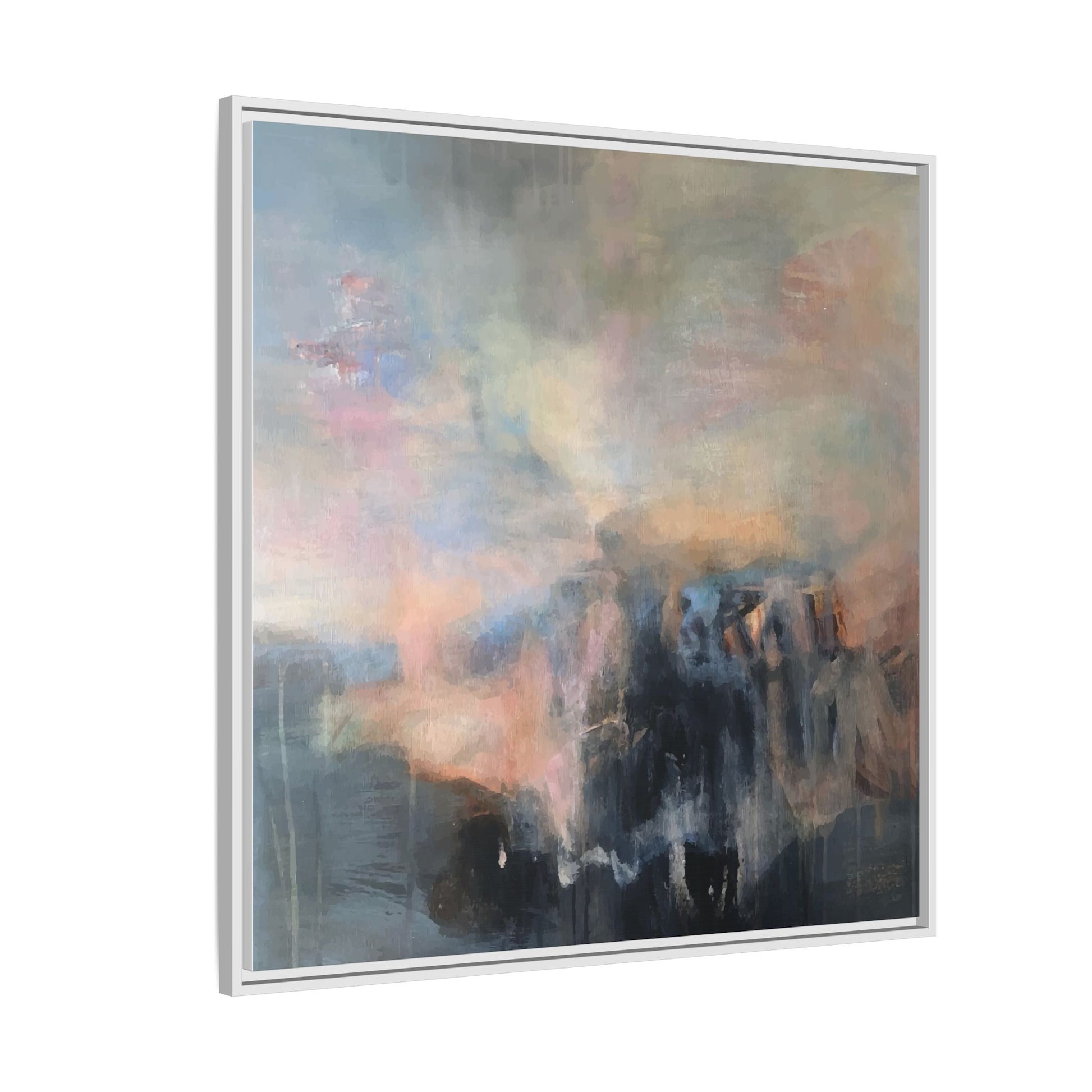 This evocative abstract landscape painting captures a dreamlike atmospheric scene with soft, blended colors and ethereal textures. The artwork employs a muted palette of blues, grays, pinks, and warm oranges, creating a sense of depth and emotional resonance. Blurred, impressionistic forms suggest distant mountains or rocky terrain, with smoky, translucent layers that seem to drift and merge across the canvas. The painting's style evokes a sense of tranquility and introspection, with delicate brushstrokes and a misty, almost luminous quality that blurs the boundaries between sky, land, and horizon. The composition invites contemplation, allowing viewers to interpret the shifting, ephemeral landscape through their own emotional lens.