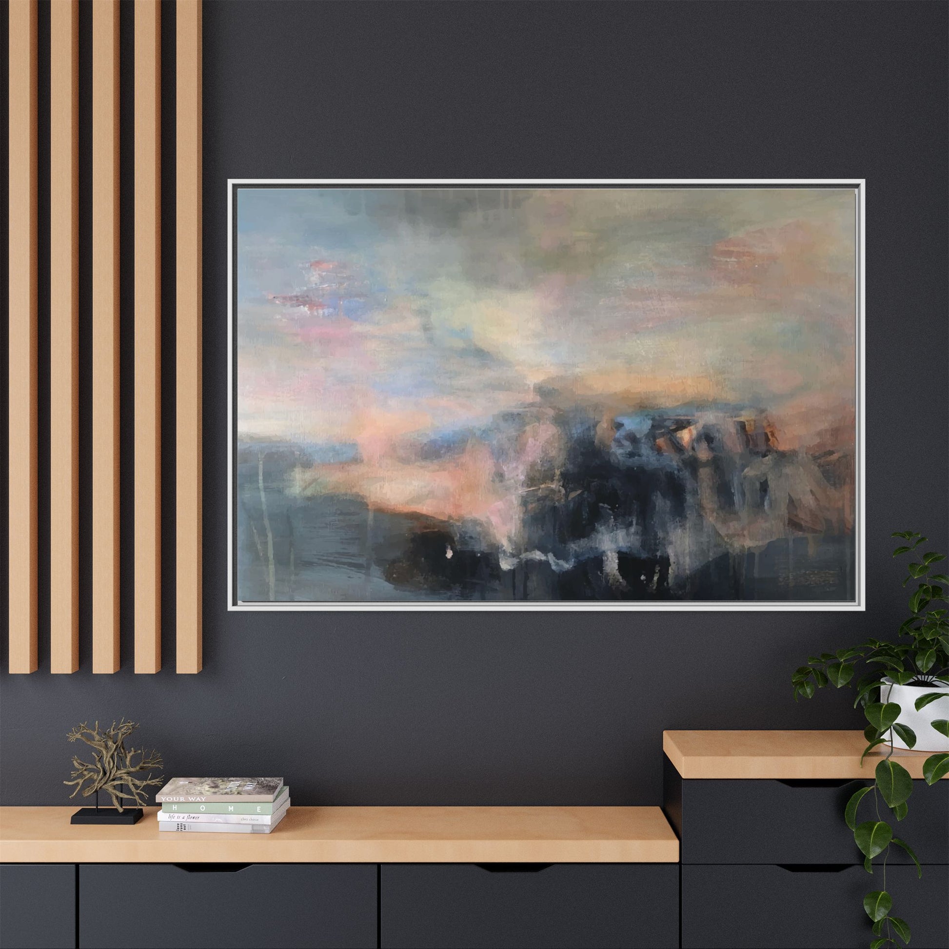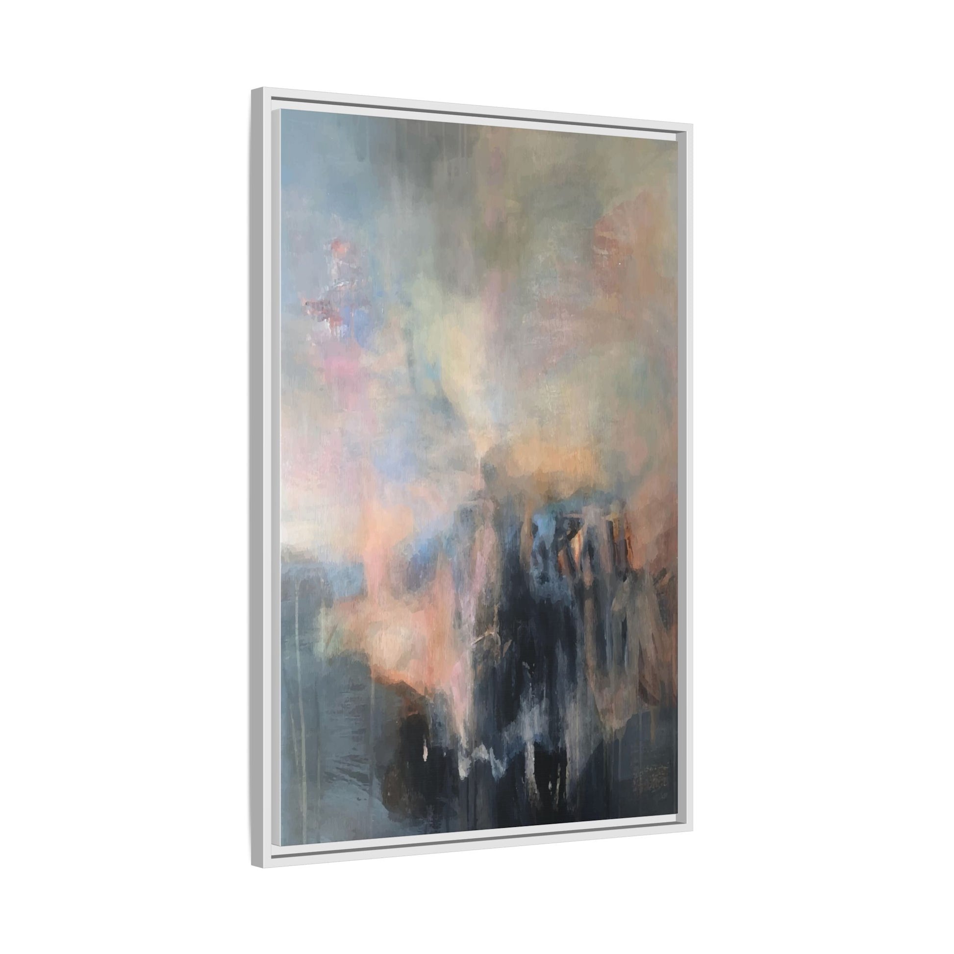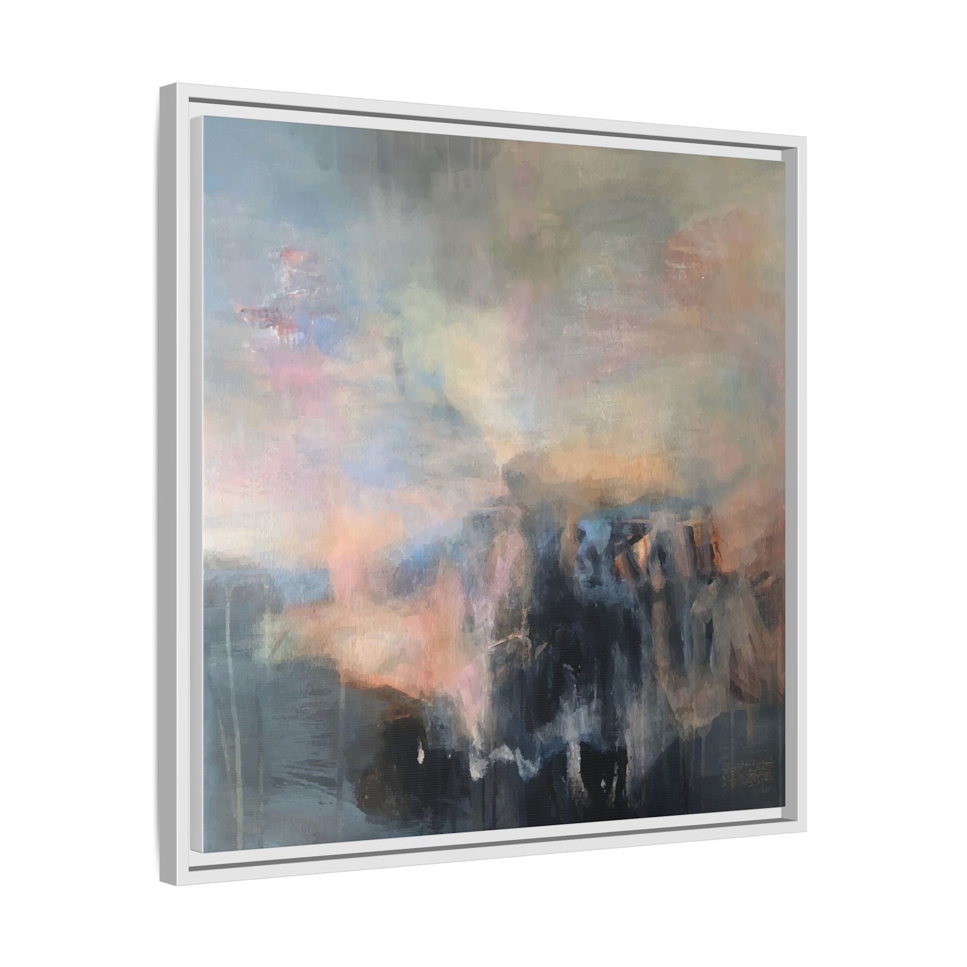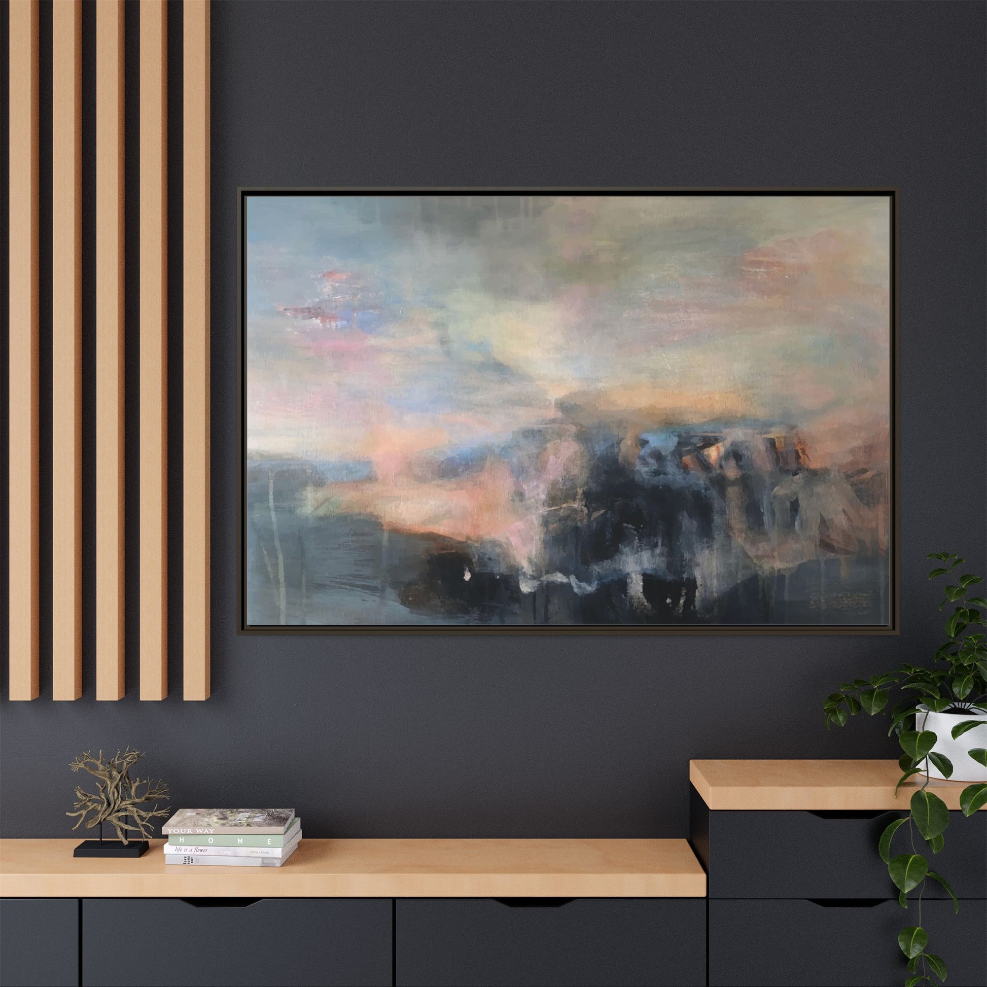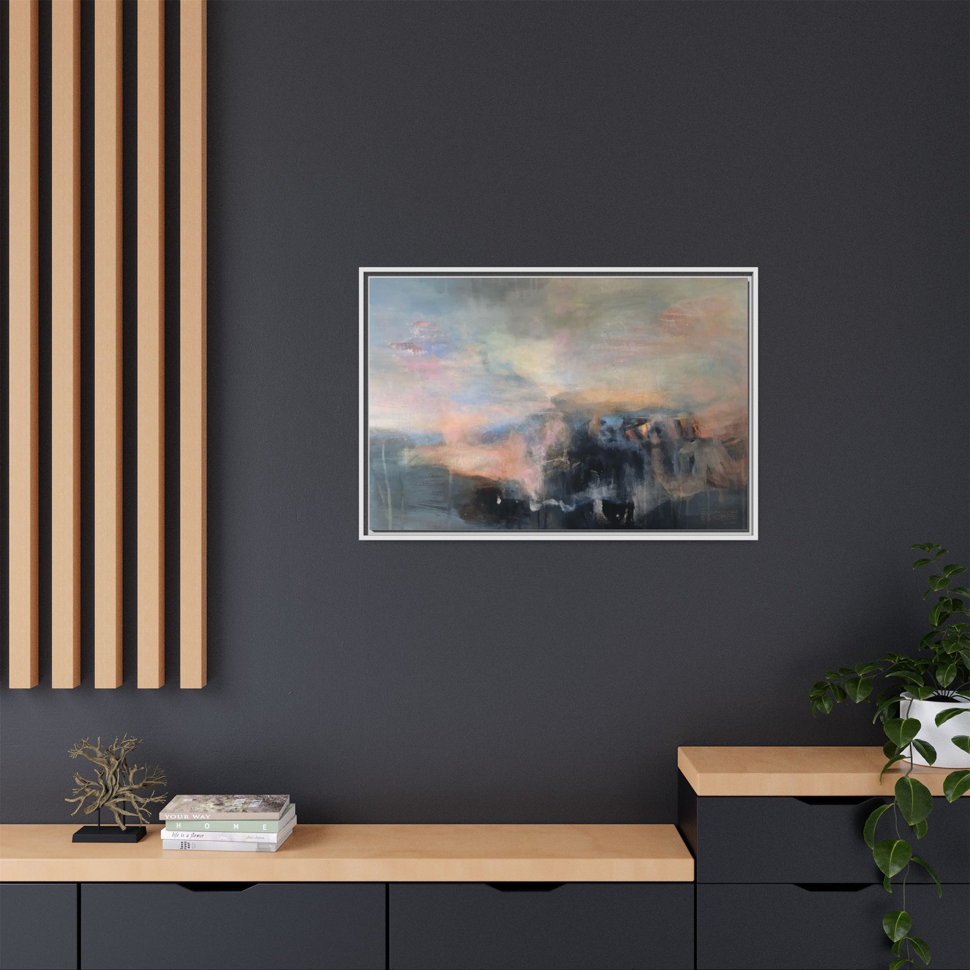 This evocative abstract landscape painting captures a dreamlike atmospheric scene with soft, blended colors and ethereal textures. The artwork employs a muted palette of blues, grays, pinks, and warm oranges, creating a sense of depth and emotional resonance. Blurred, impressionistic forms suggest distant mountains or rocky terrain, with smoky, translucent layers that seem to drift and merge across the canvas. The painting's style evokes a sense of tranquility and introspection, with delicate brushstrokes and a misty, almost luminous quality that blurs the boundaries between sky, land, and horizon. The composition invites contemplation, allowing viewers to interpret the shifting, ephemeral landscape through their own emotional lens.
