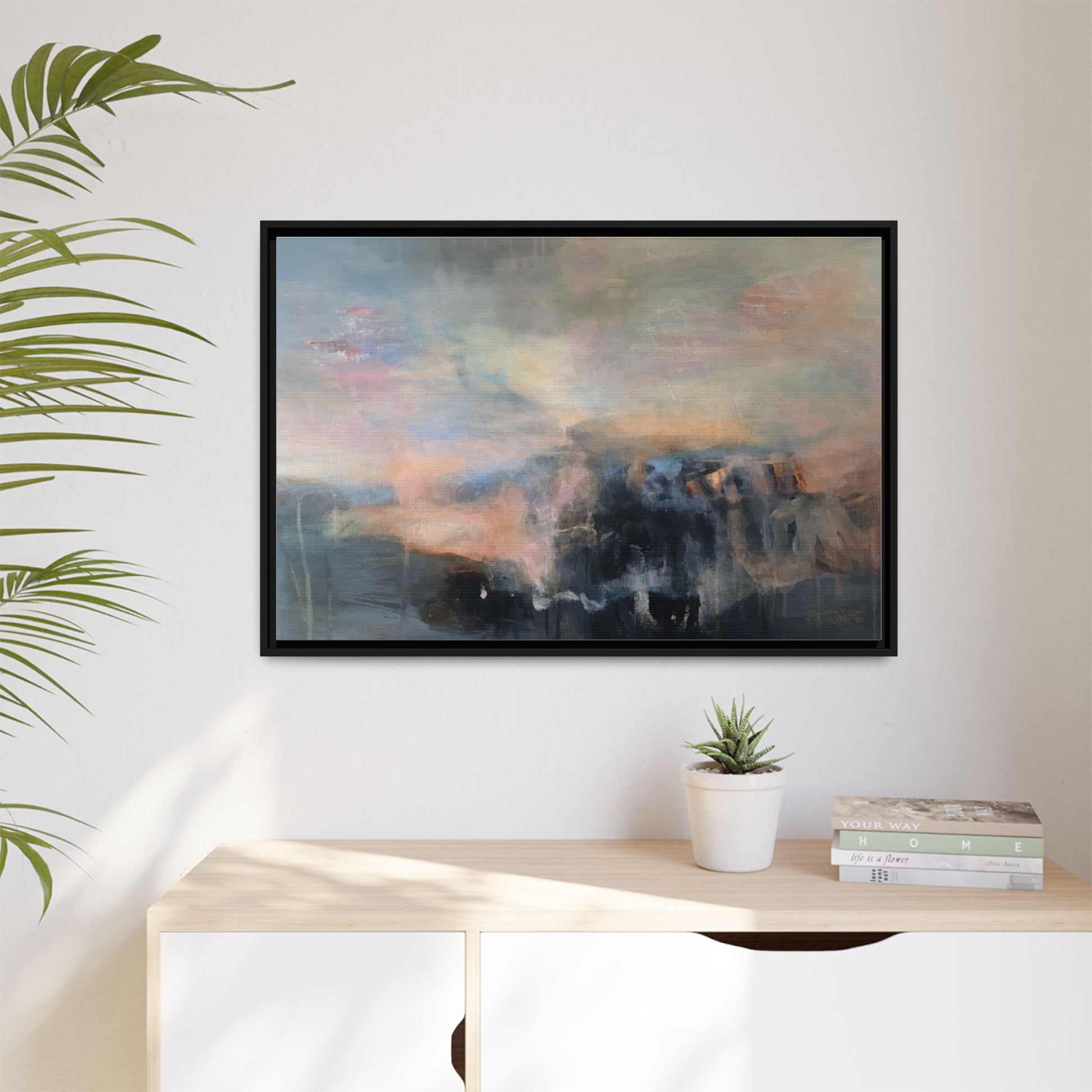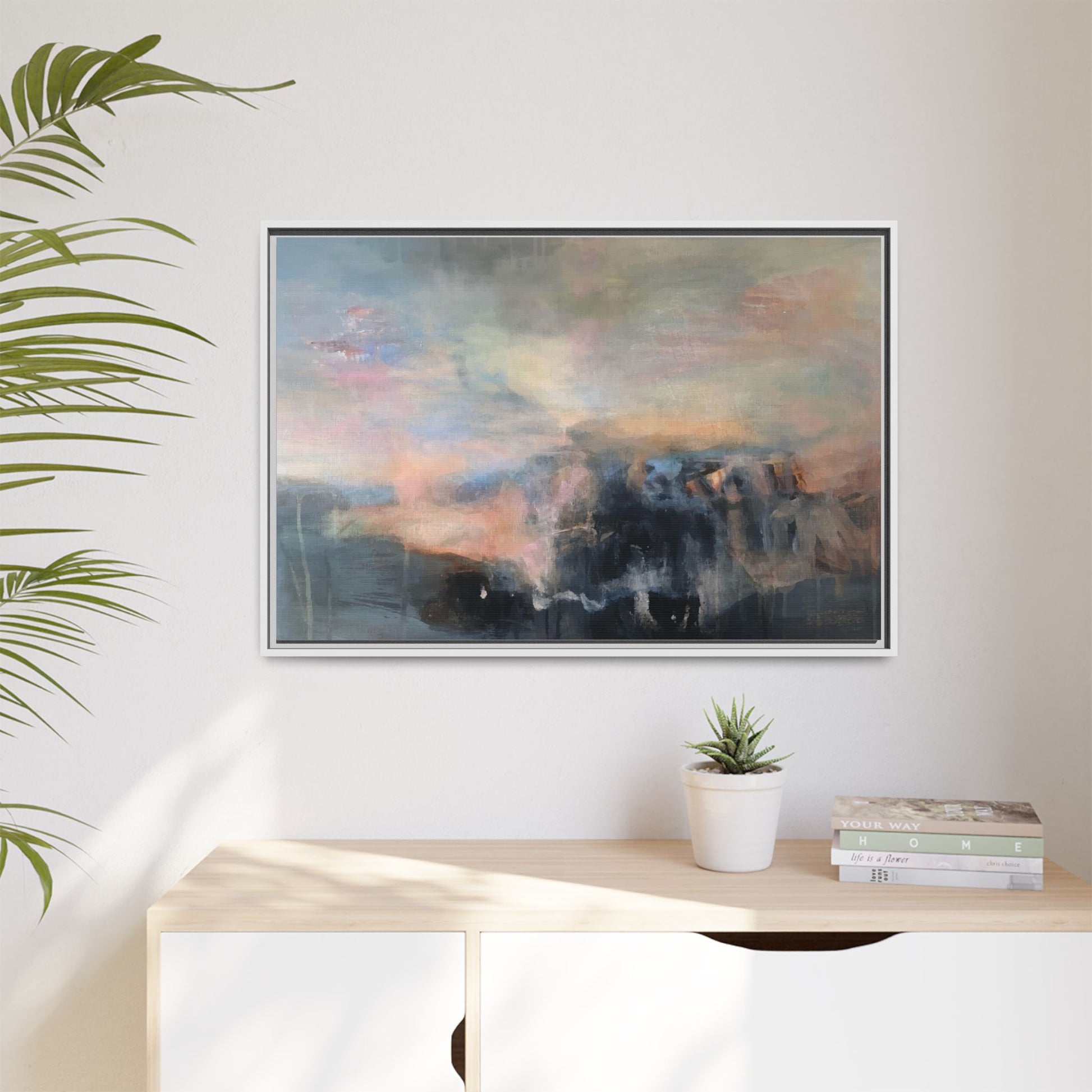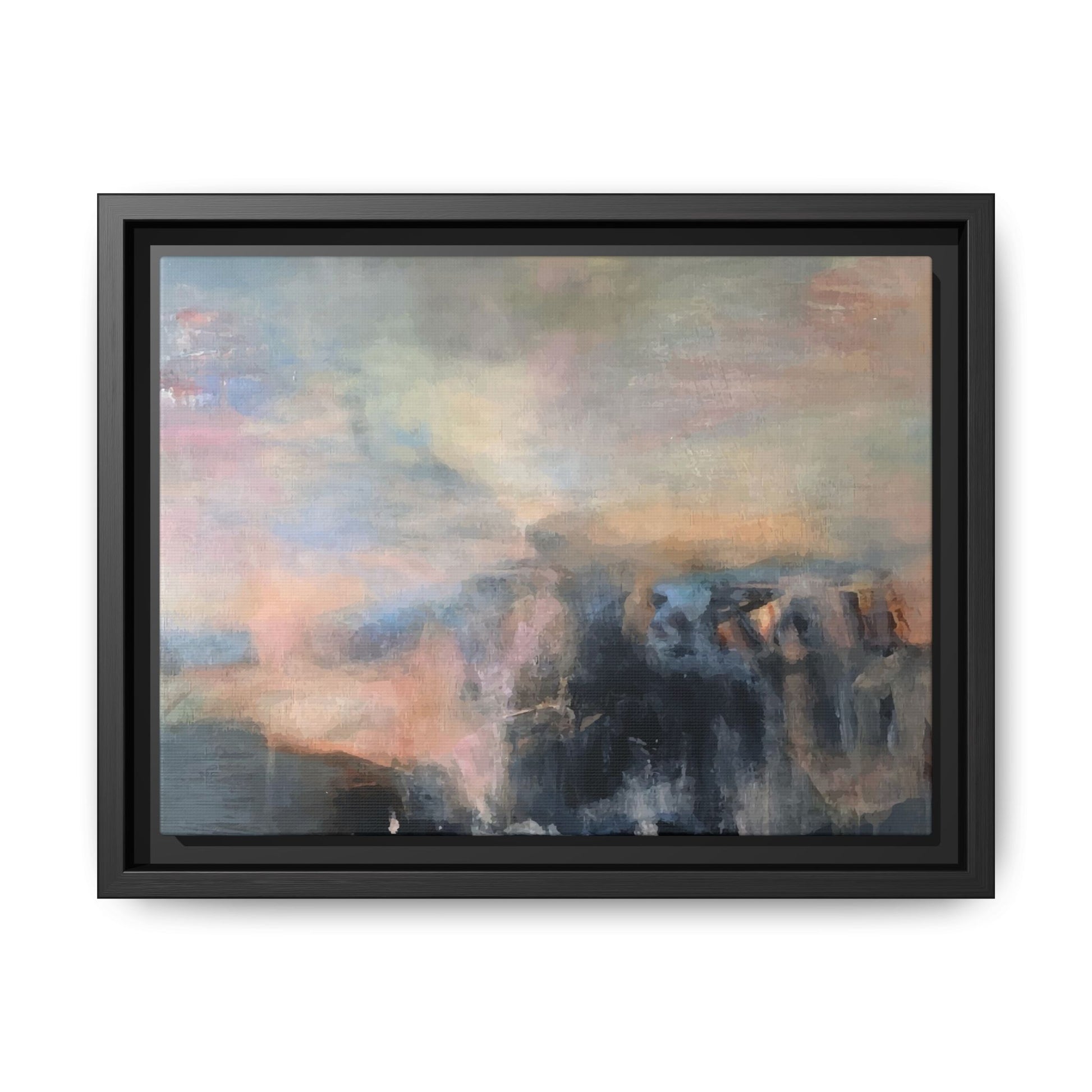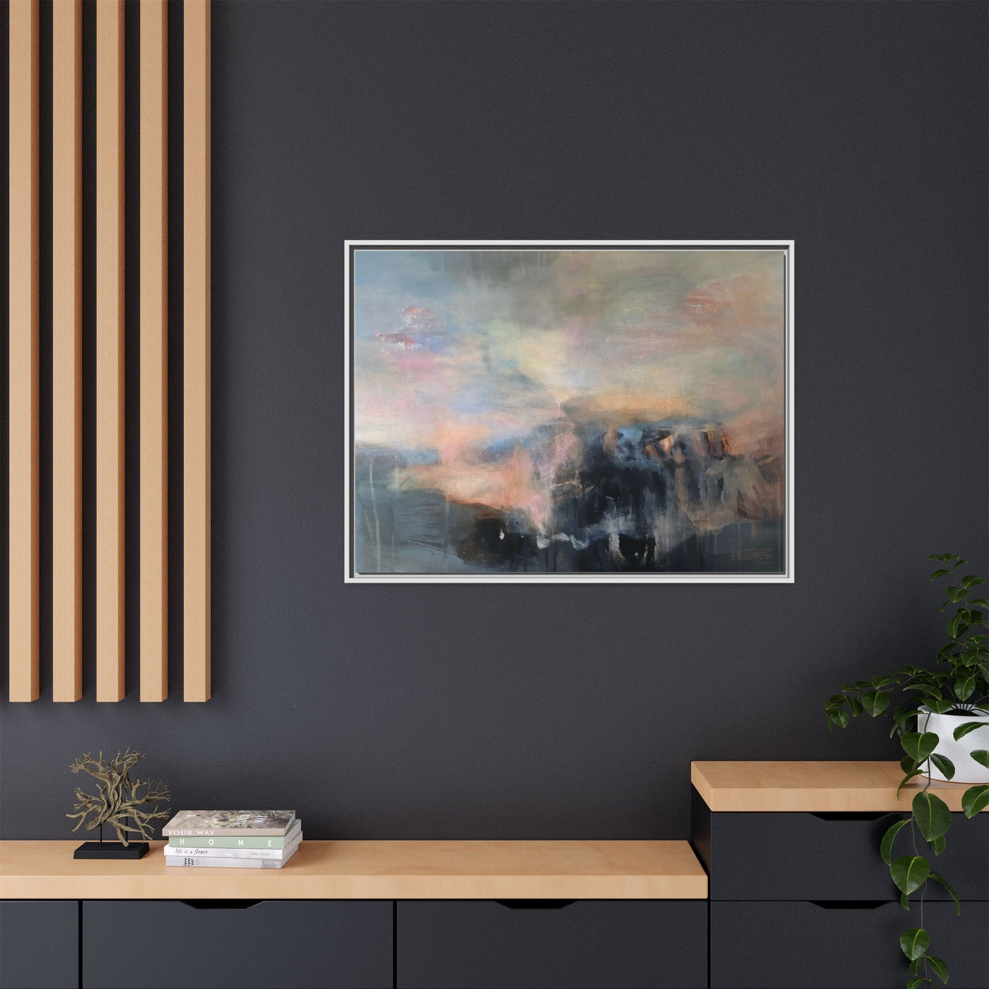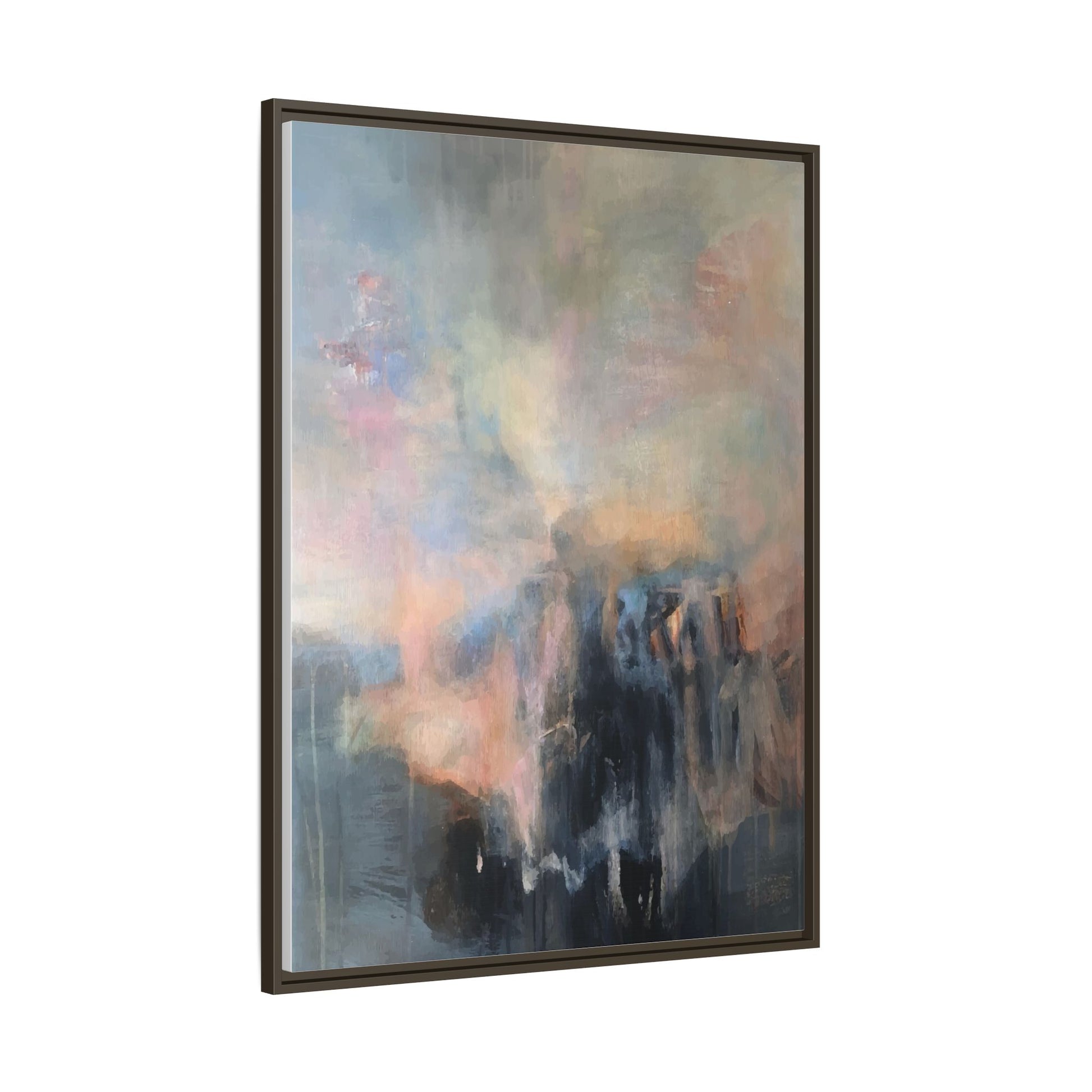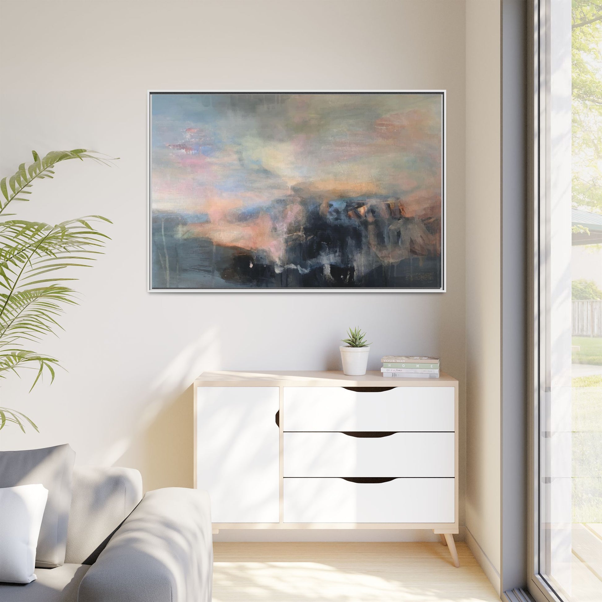 This evocative abstract landscape painting captures a dreamlike atmospheric scene with soft, blended colors and ethereal textures. The artwork employs a muted palette of blues, grays, pinks, and warm oranges, creating a sense of depth and emotional resonance. Blurred, impressionistic forms suggest distant mountains or rocky terrain, with smoky, translucent layers that seem to drift and merge across the canvas. The painting's style evokes a sense of tranquility and introspection, with delicate brushstrokes and a misty, almost luminous quality that blurs the boundaries between sky, land, and horizon. The composition invites contemplation, allowing viewers to interpret the shifting, ephemeral landscape through their own emotional lens.