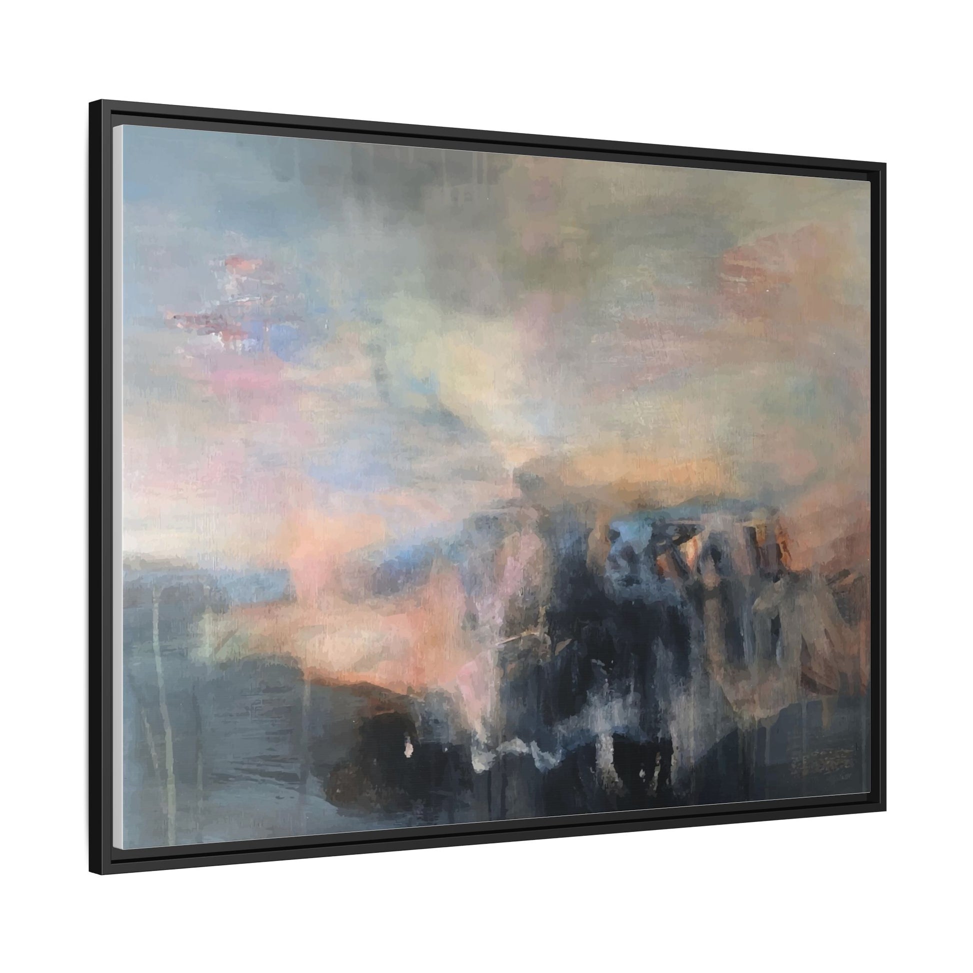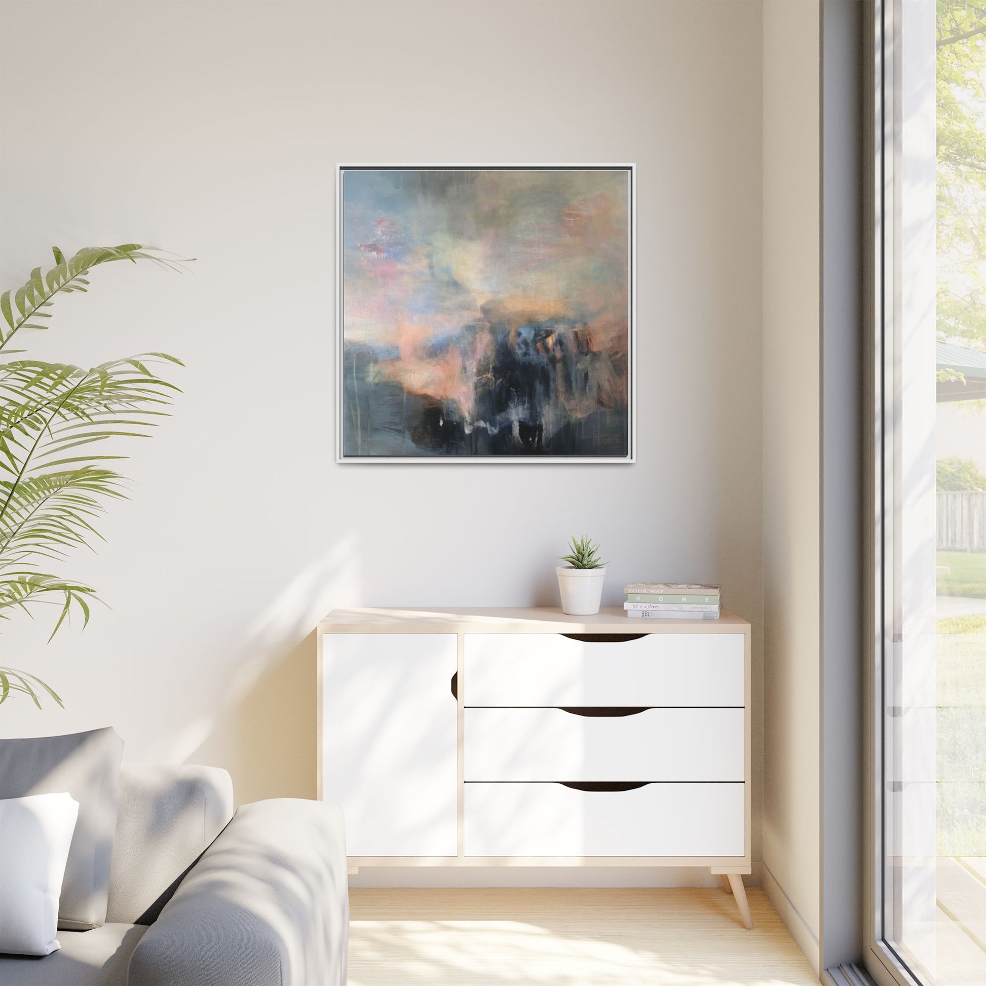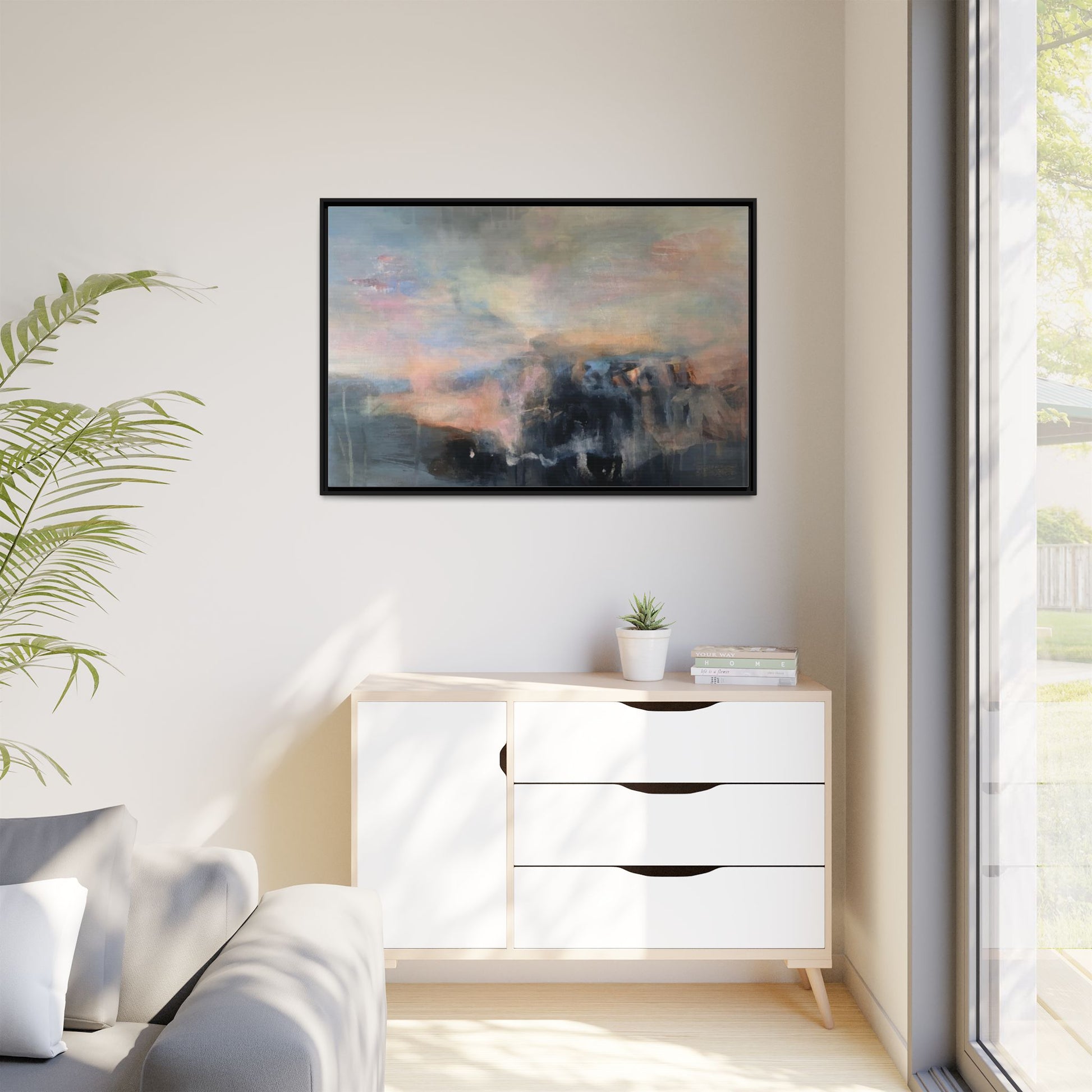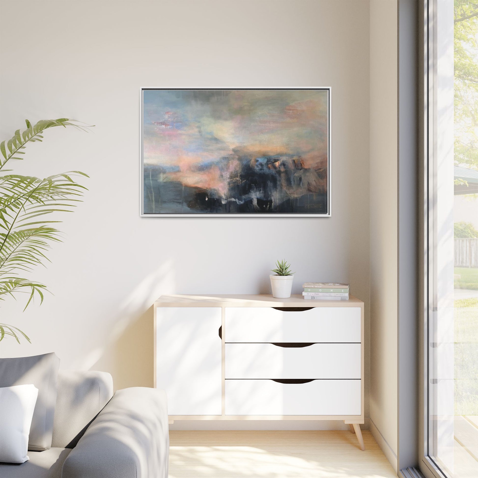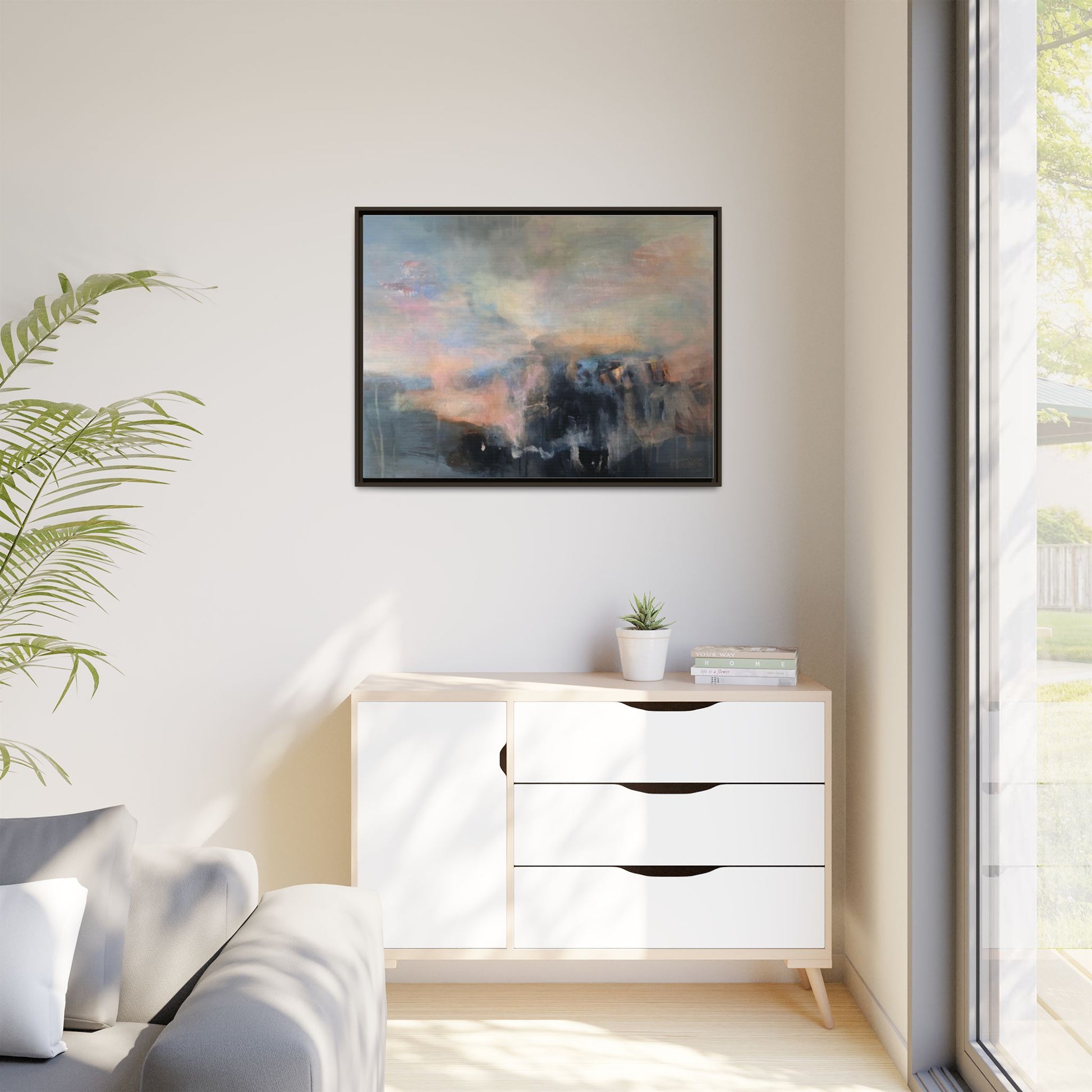 This evocative abstract landscape painting captures a dreamlike atmospheric scene with soft, blended colors and ethereal textures. The artwork employs a muted palette of blues, grays, pinks, and warm oranges, creating a sense of depth and emotional resonance. Blurred, impressionistic forms suggest distant mountains or rocky terrain, with smoky, translucent layers that seem to drift and merge across the canvas. The painting's style evokes a sense of tranquility and introspection, with delicate brushstrokes and a misty, almost luminous quality that blurs the boundaries between sky, land, and horizon. The composition invites contemplation, allowing viewers to interpret the shifting, ephemeral landscape through their own emotional lens.
