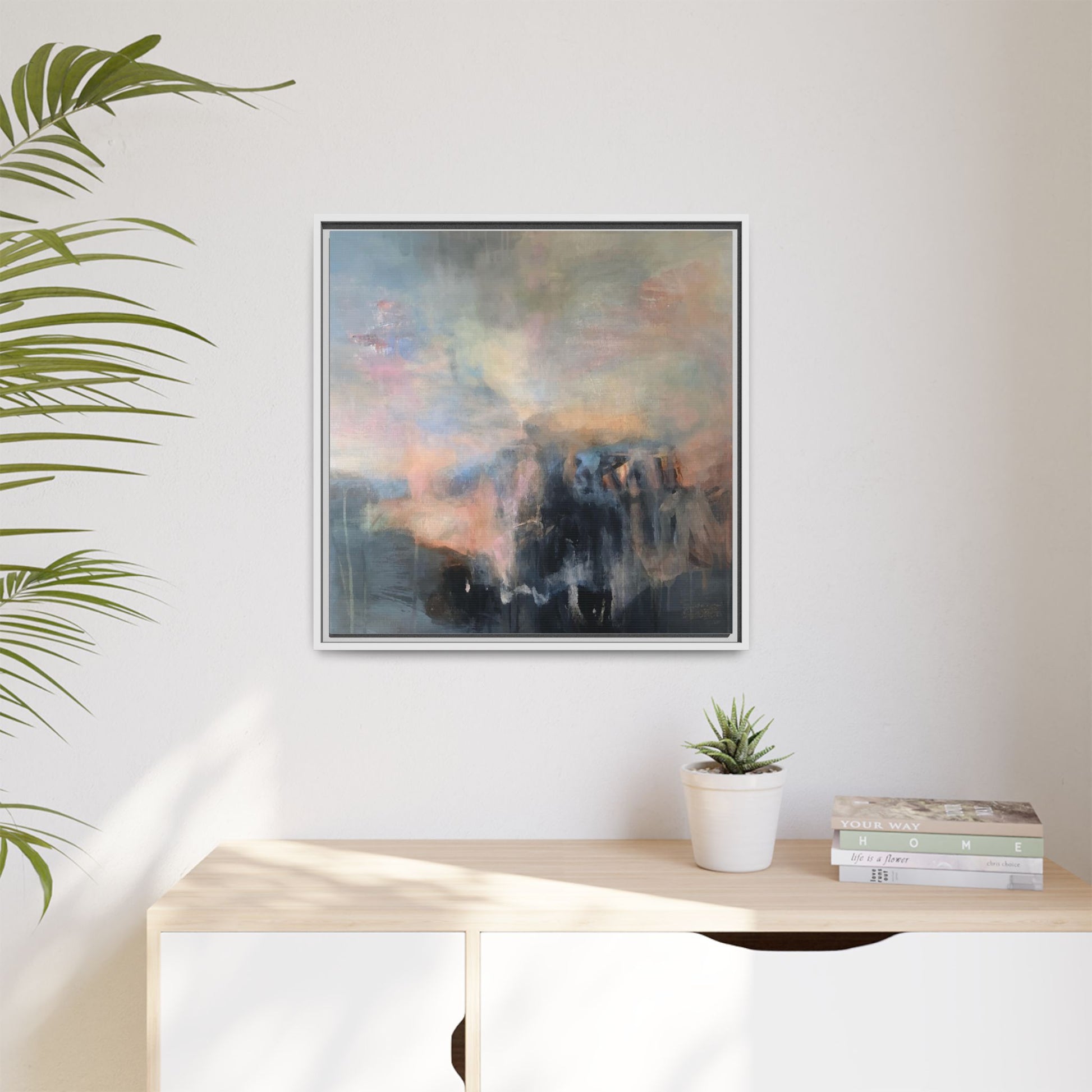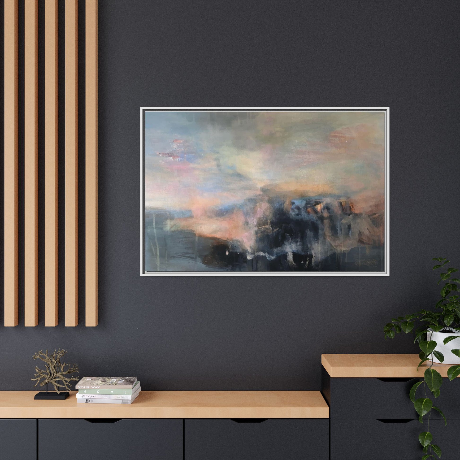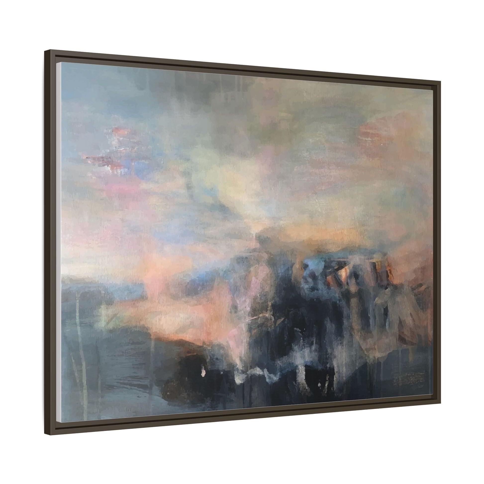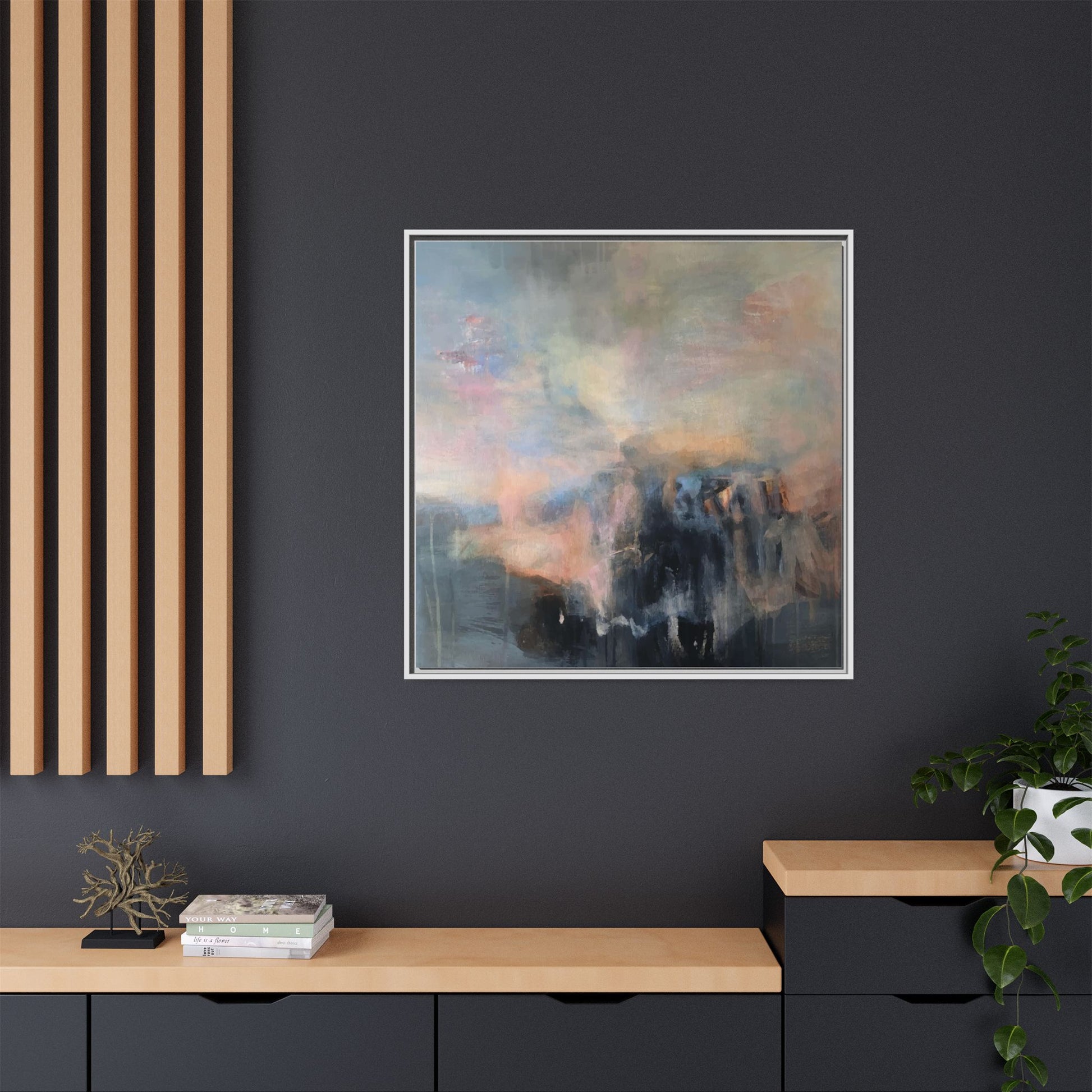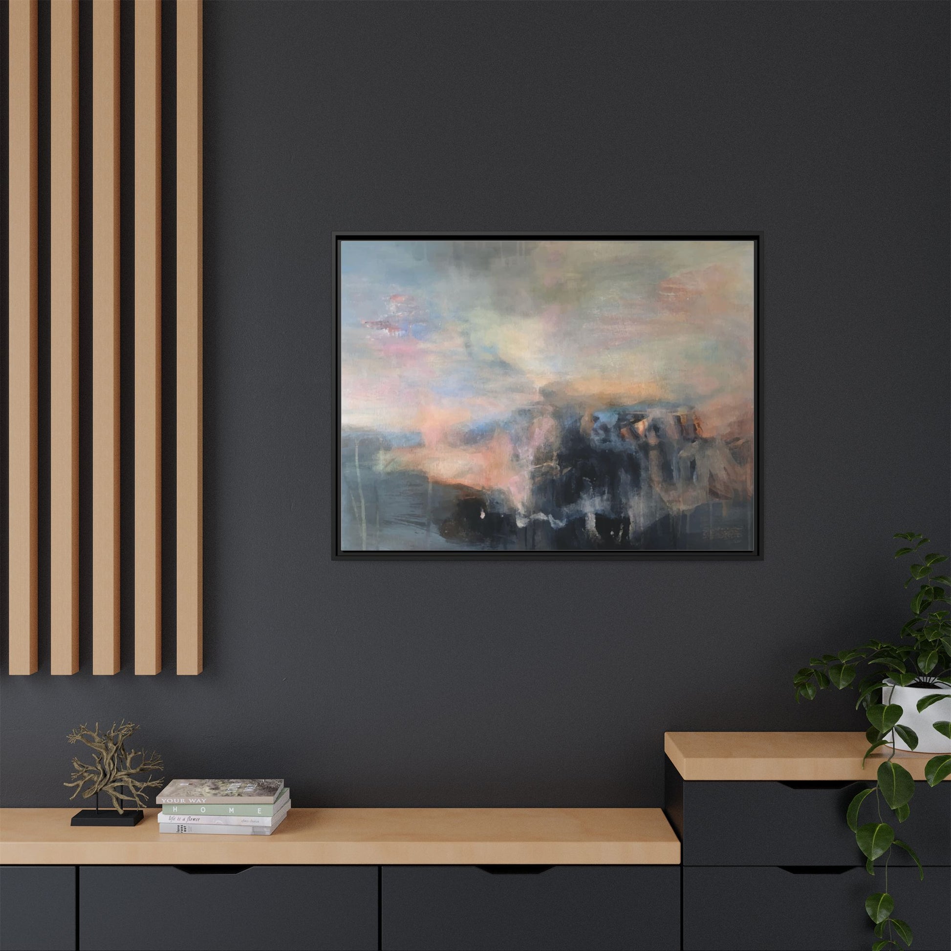 This evocative abstract landscape painting captures a dreamlike atmospheric scene with soft, blended colors and ethereal textures. The artwork employs a muted palette of blues, grays, pinks, and warm oranges, creating a sense of depth and emotional resonance. Blurred, impressionistic forms suggest distant mountains or rocky terrain, with smoky, translucent layers that seem to drift and merge across the canvas. The painting's style evokes a sense of tranquility and introspection, with delicate brushstrokes and a misty, almost luminous quality that blurs the boundaries between sky, land, and horizon. The composition invites contemplation, allowing viewers to interpret the shifting, ephemeral landscape through their own emotional lens.