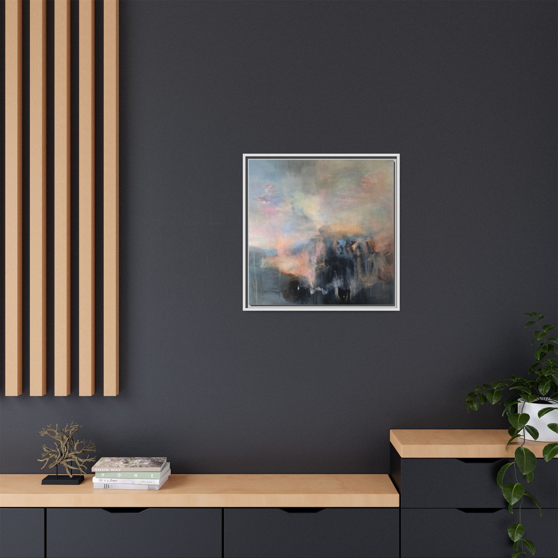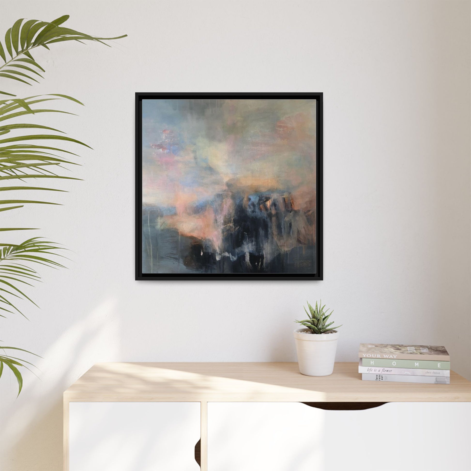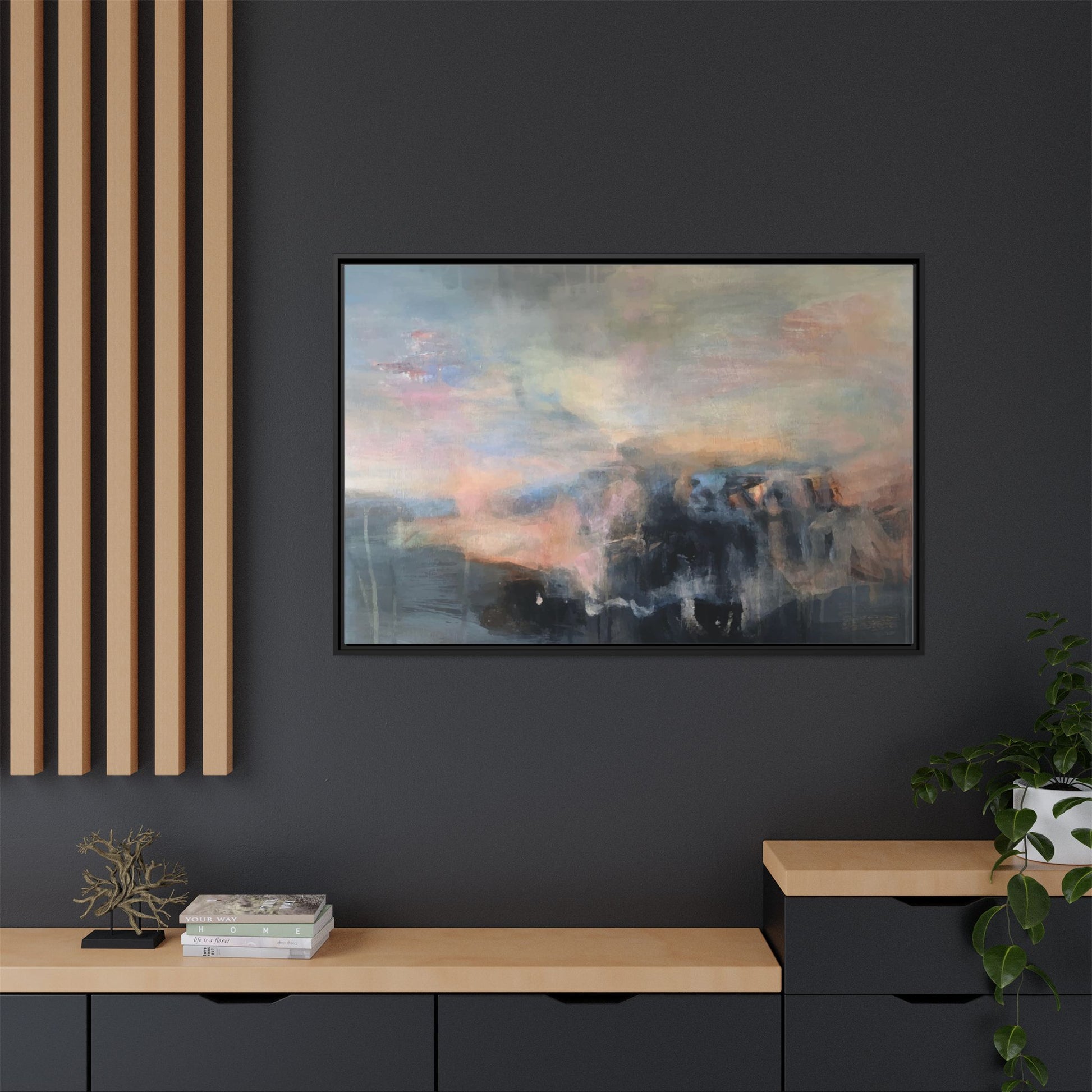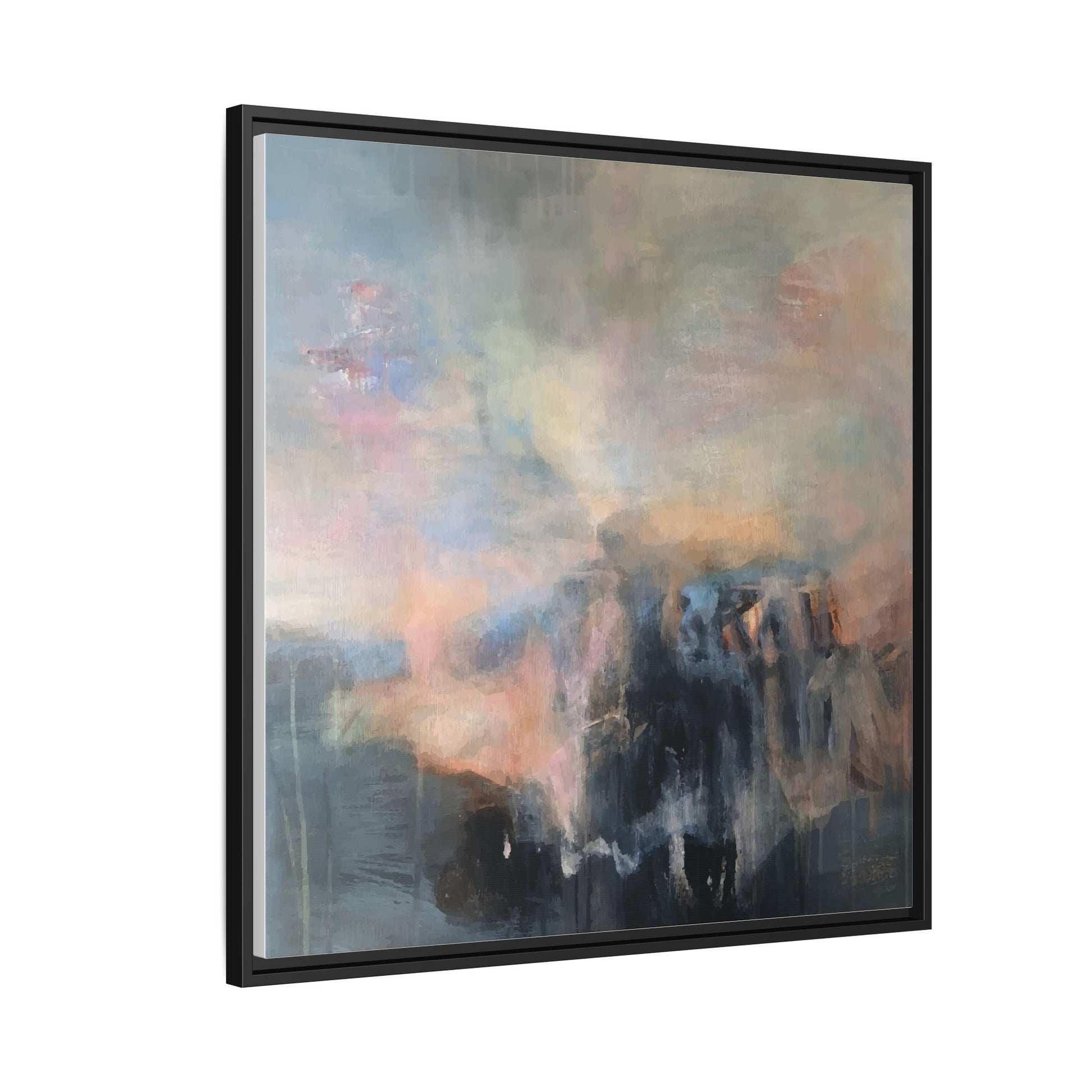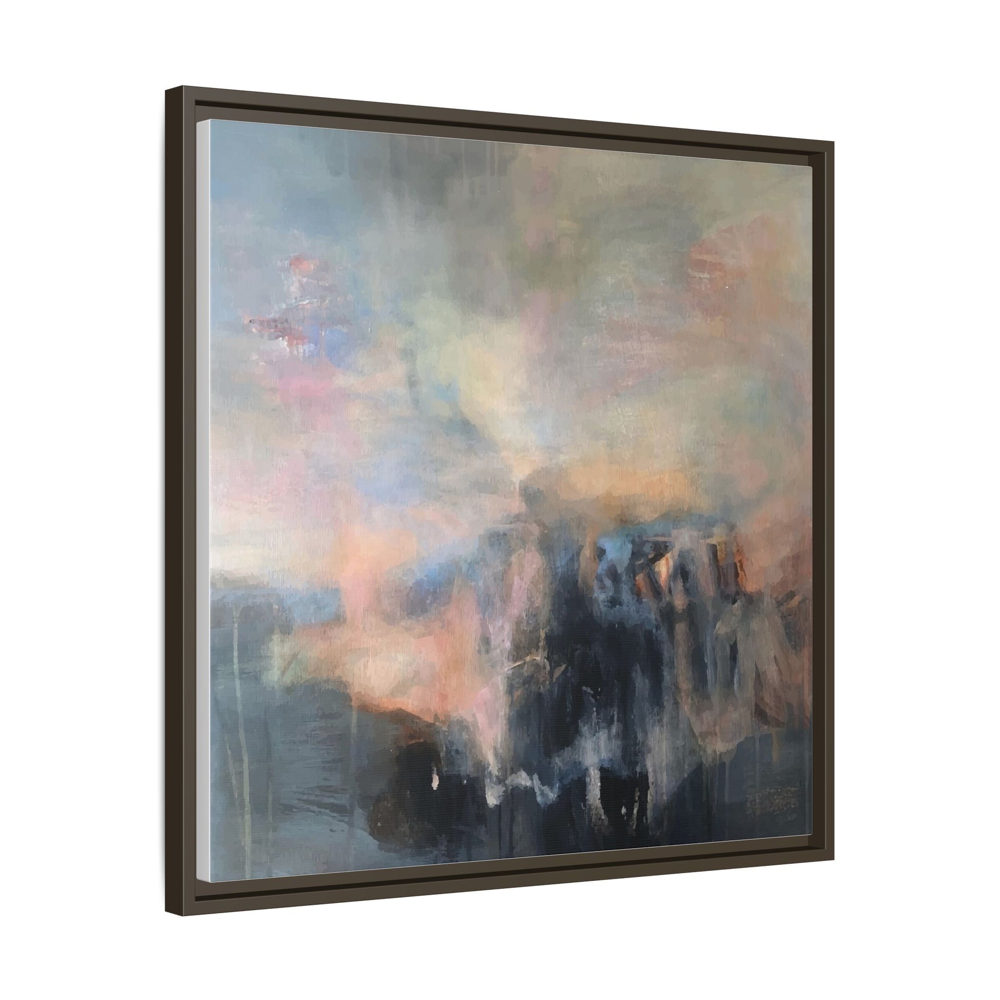 This evocative abstract landscape painting captures a dreamlike atmospheric scene with soft, blended colors and ethereal textures. The artwork employs a muted palette of blues, grays, pinks, and warm oranges, creating a sense of depth and emotional resonance. Blurred, impressionistic forms suggest distant mountains or rocky terrain, with smoky, translucent layers that seem to drift and merge across the canvas. The painting's style evokes a sense of tranquility and introspection, with delicate brushstrokes and a misty, almost luminous quality that blurs the boundaries between sky, land, and horizon. The composition invites contemplation, allowing viewers to interpret the shifting, ephemeral landscape through their own emotional lens.