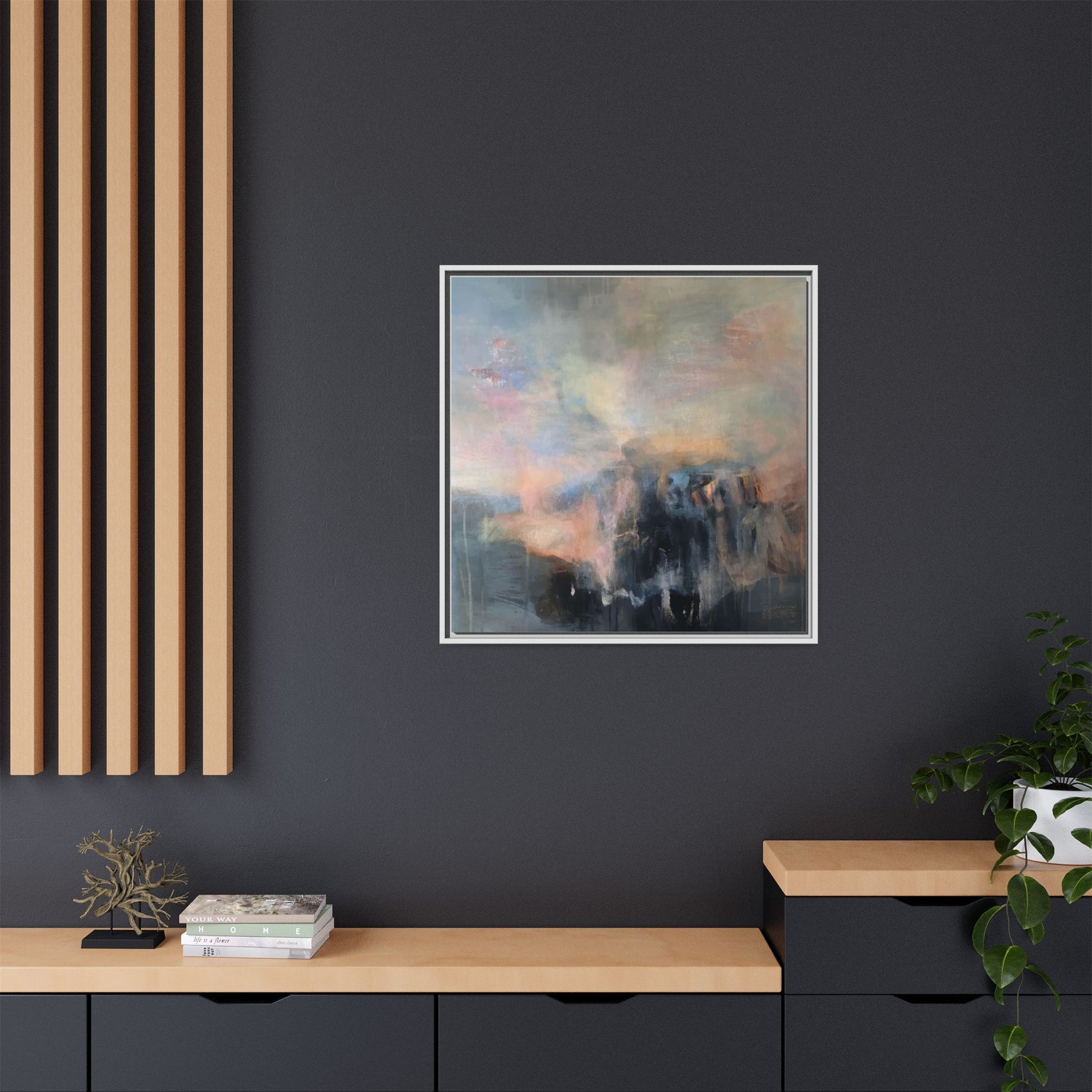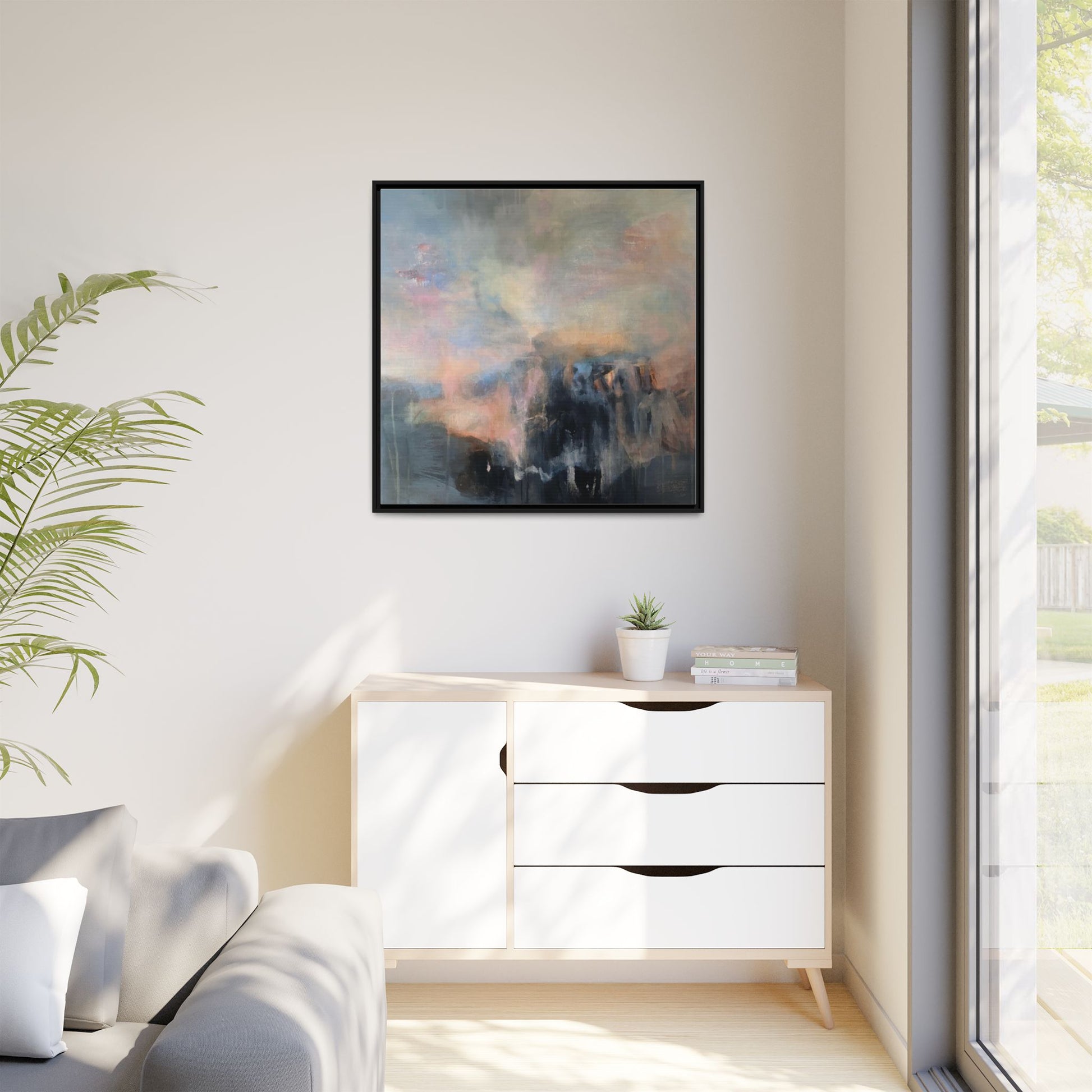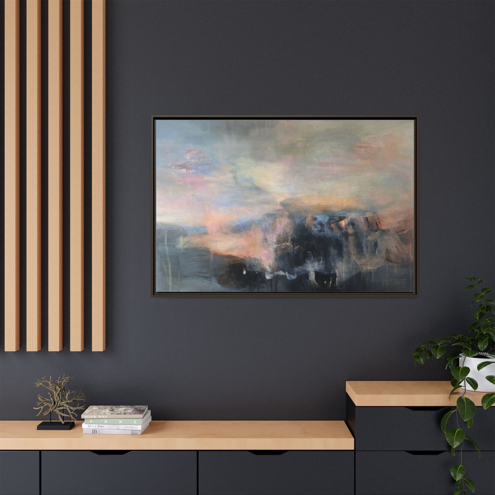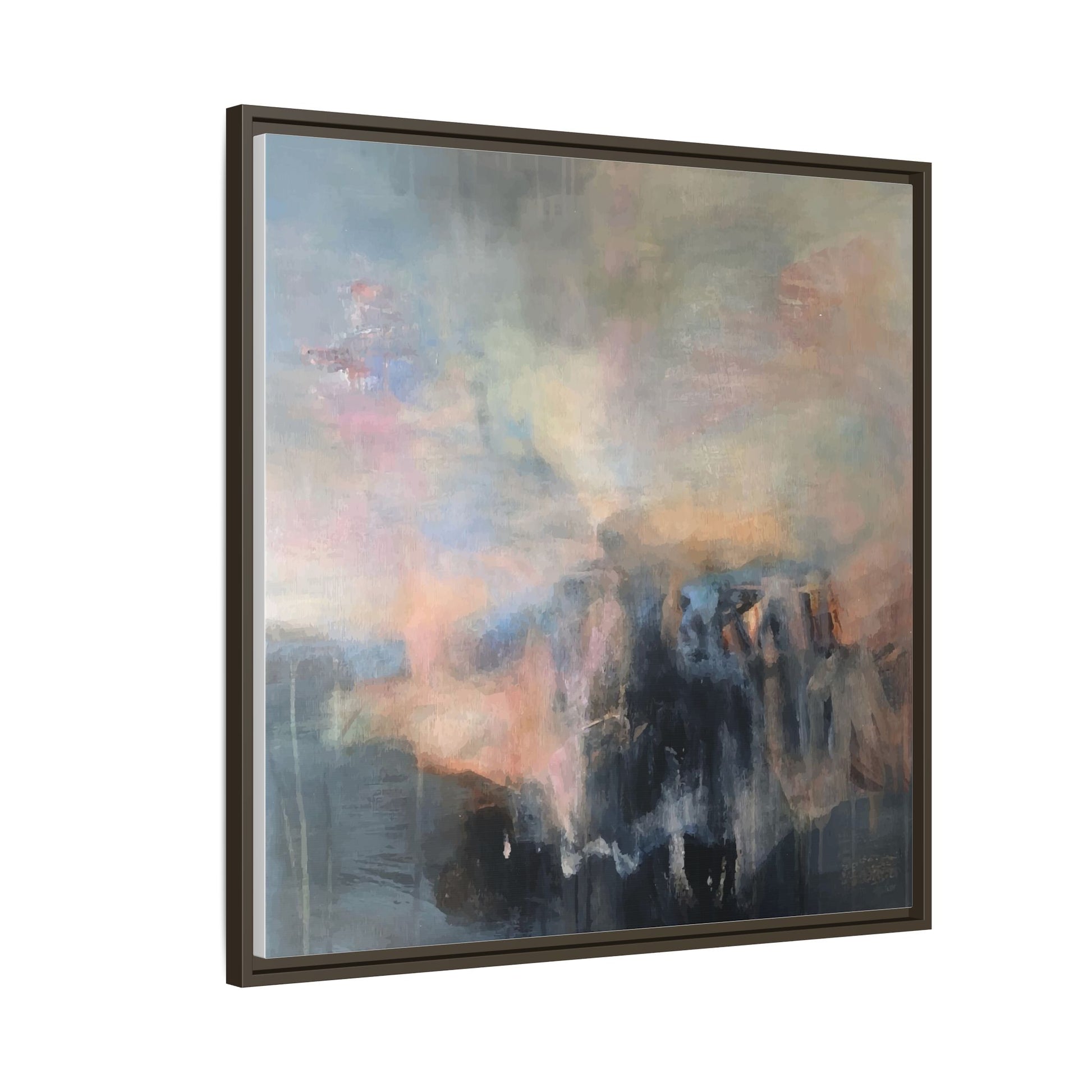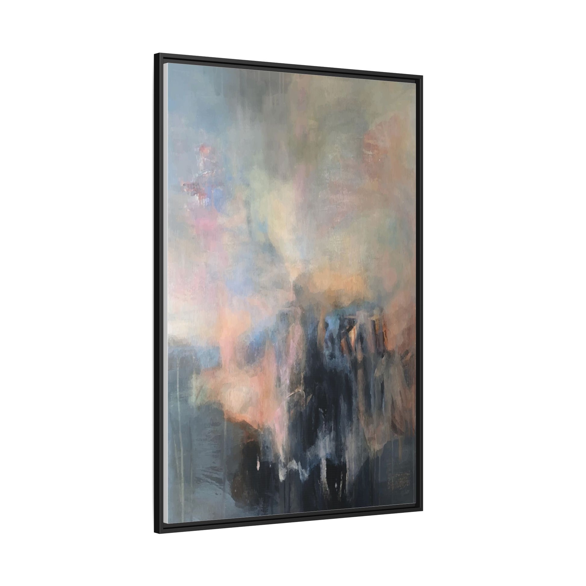 This evocative abstract landscape painting captures a dreamlike atmospheric scene with soft, blended colors and ethereal textures. The artwork employs a muted palette of blues, grays, pinks, and warm oranges, creating a sense of depth and emotional resonance. Blurred, impressionistic forms suggest distant mountains or rocky terrain, with smoky, translucent layers that seem to drift and merge across the canvas. The painting's style evokes a sense of tranquility and introspection, with delicate brushstrokes and a misty, almost luminous quality that blurs the boundaries between sky, land, and horizon. The composition invites contemplation, allowing viewers to interpret the shifting, ephemeral landscape through their own emotional lens.