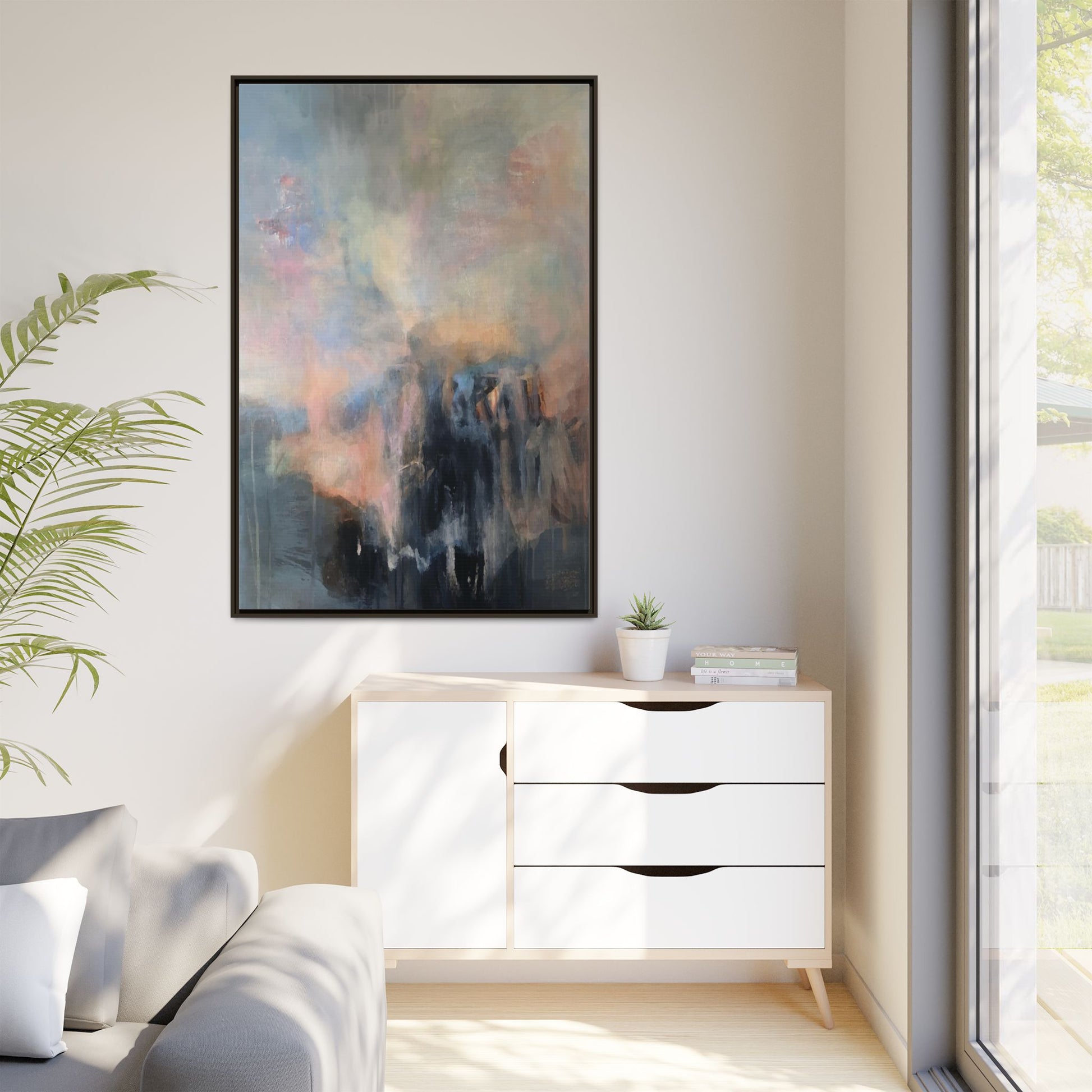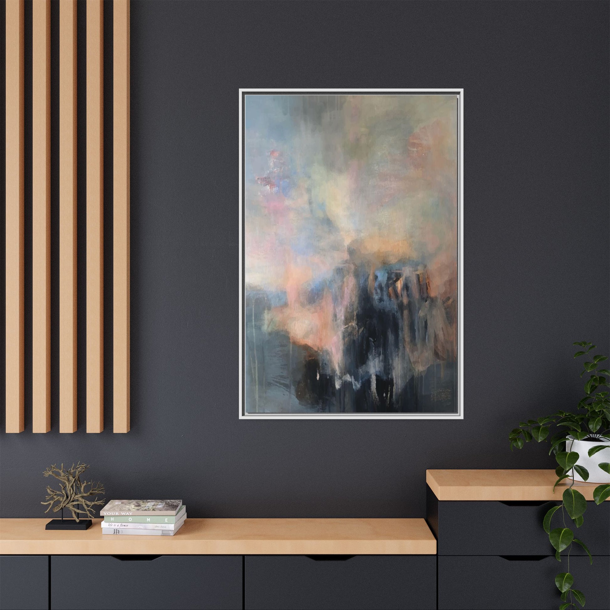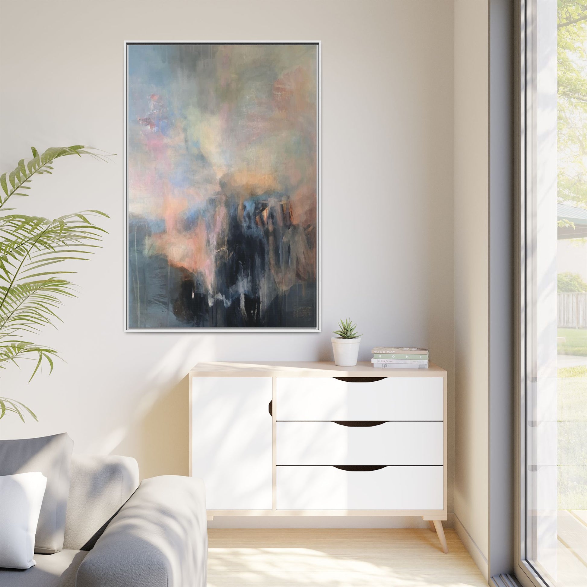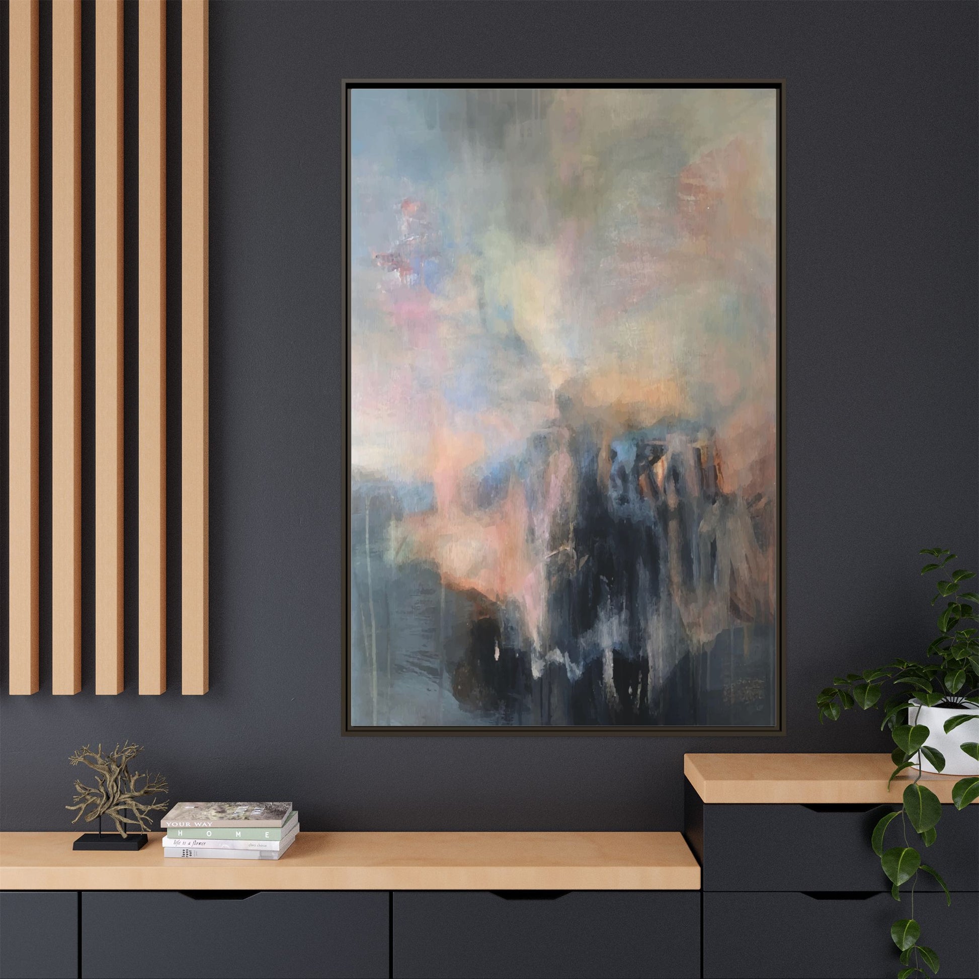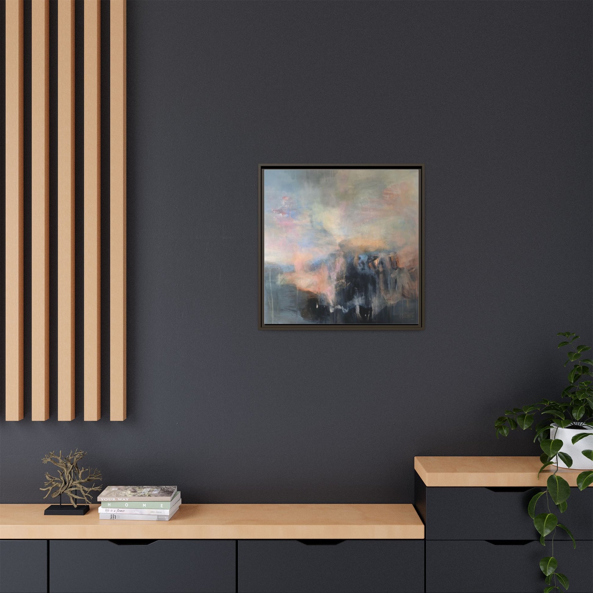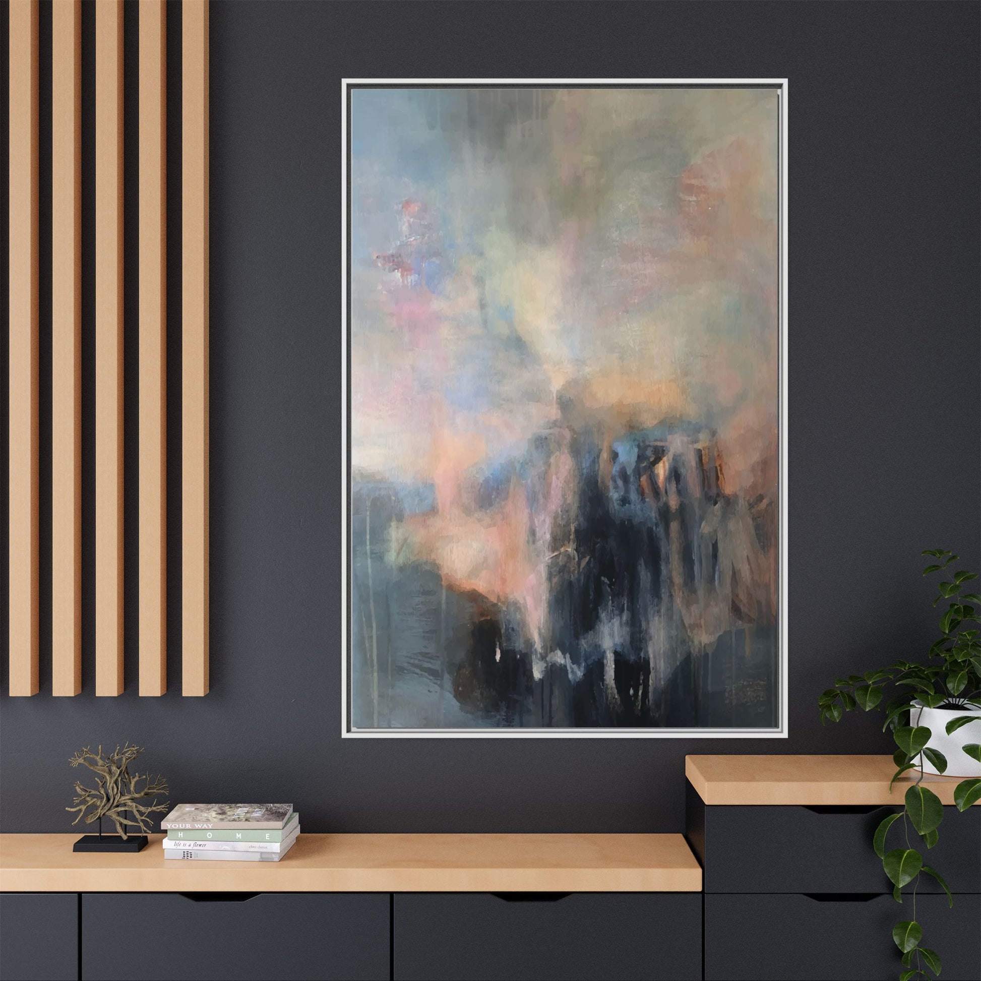 This evocative abstract landscape painting captures a dreamlike atmospheric scene with soft, blended colors and ethereal textures. The artwork employs a muted palette of blues, grays, pinks, and warm oranges, creating a sense of depth and emotional resonance. Blurred, impressionistic forms suggest distant mountains or rocky terrain, with smoky, translucent layers that seem to drift and merge across the canvas. The painting's style evokes a sense of tranquility and introspection, with delicate brushstrokes and a misty, almost luminous quality that blurs the boundaries between sky, land, and horizon. The composition invites contemplation, allowing viewers to interpret the shifting, ephemeral landscape through their own emotional lens.