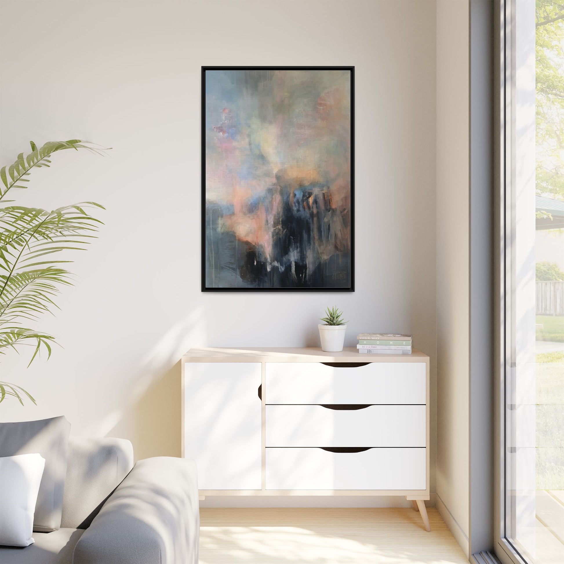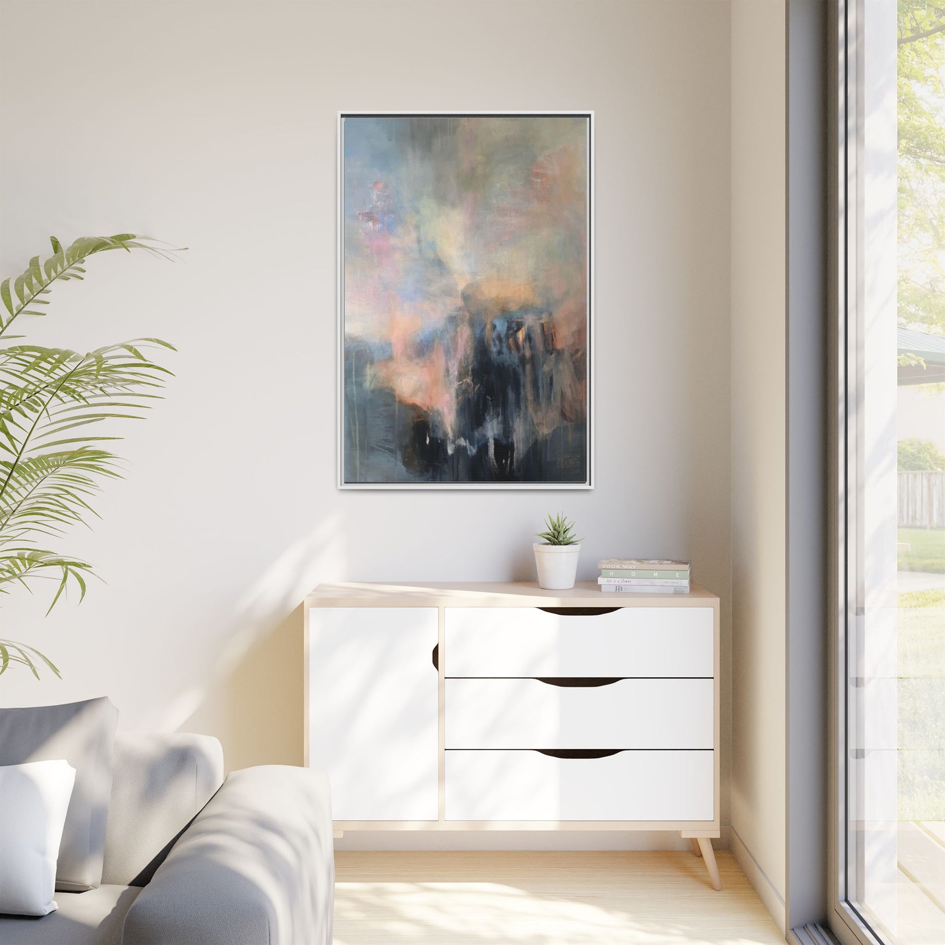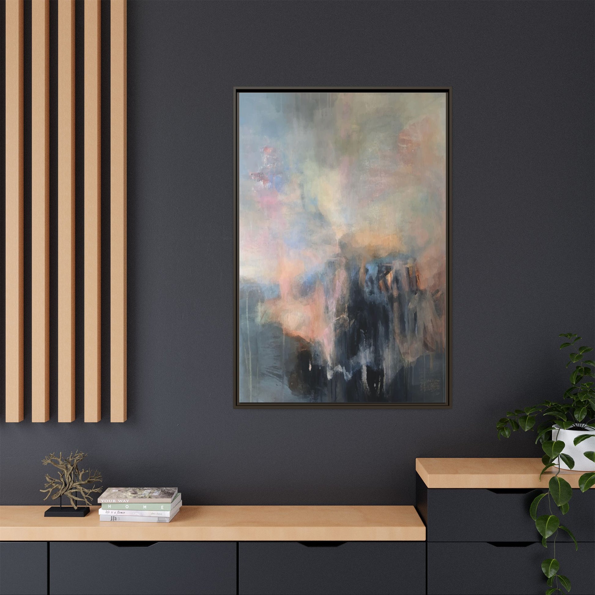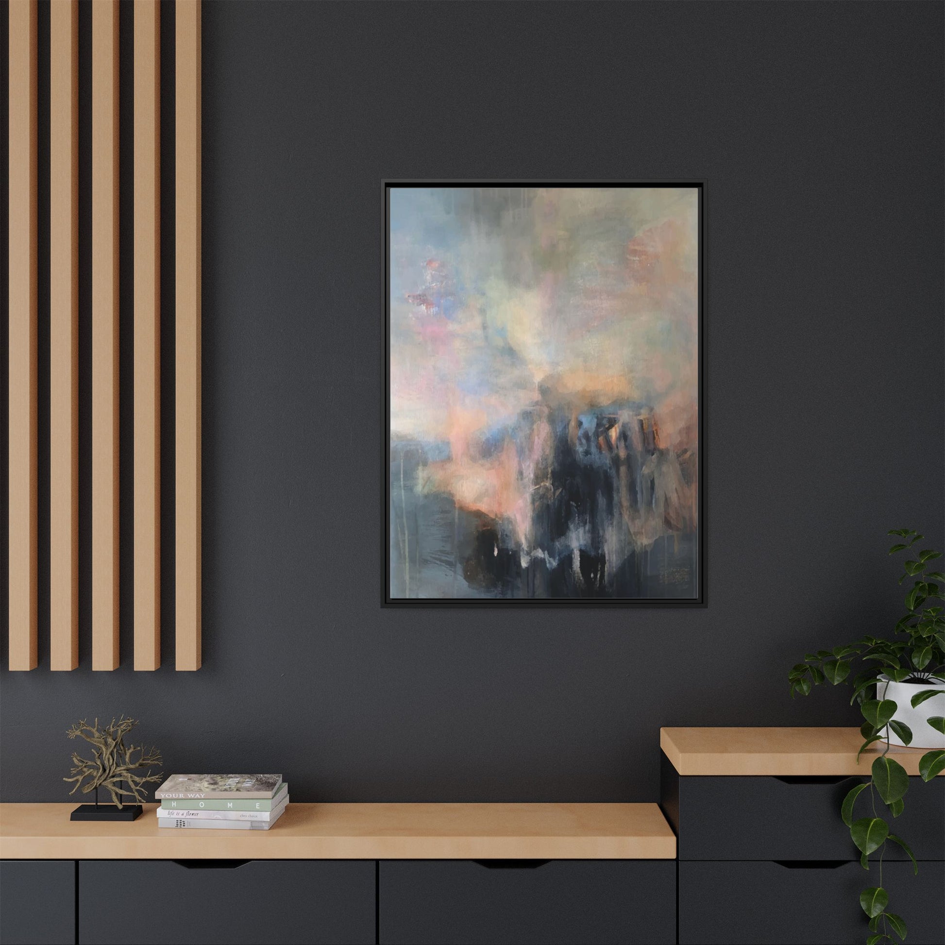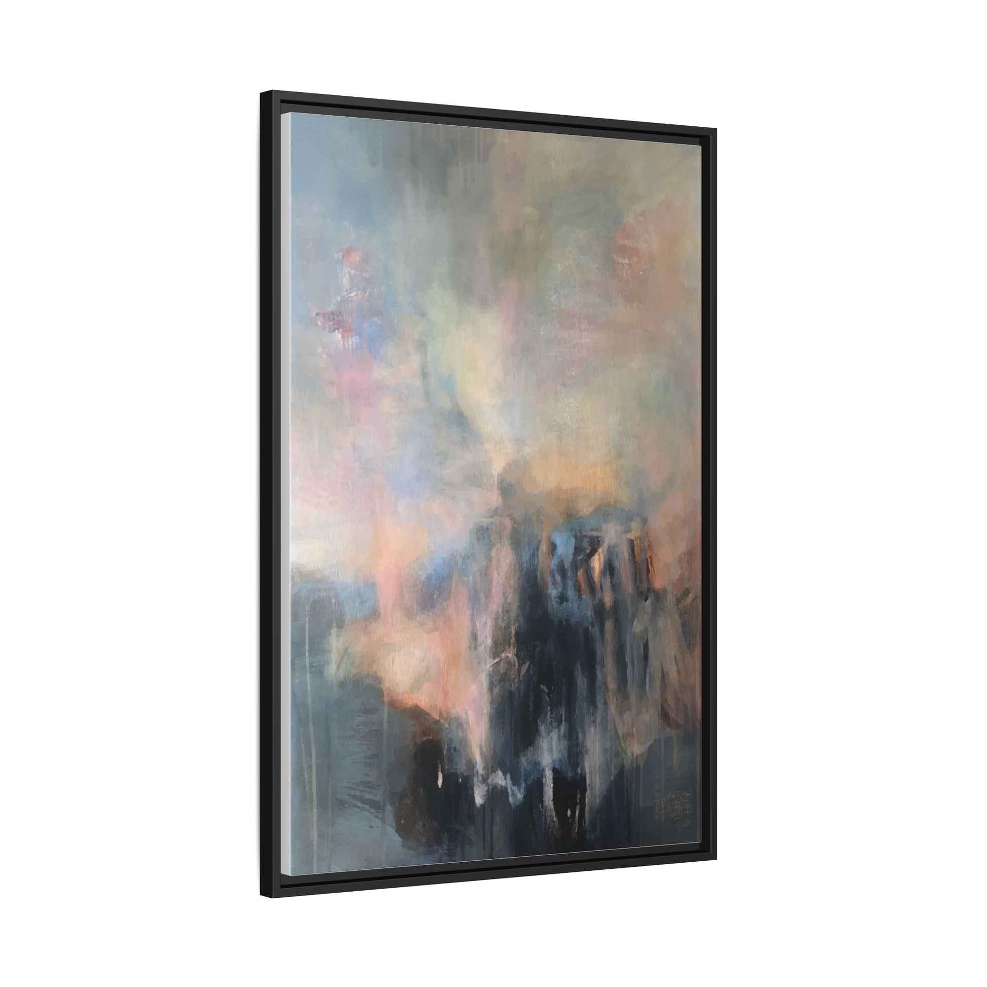 This evocative abstract landscape painting captures a dreamlike atmospheric scene with soft, blended colors and ethereal textures. The artwork employs a muted palette of blues, grays, pinks, and warm oranges, creating a sense of depth and emotional resonance. Blurred, impressionistic forms suggest distant mountains or rocky terrain, with smoky, translucent layers that seem to drift and merge across the canvas. The painting's style evokes a sense of tranquility and introspection, with delicate brushstrokes and a misty, almost luminous quality that blurs the boundaries between sky, land, and horizon. The composition invites contemplation, allowing viewers to interpret the shifting, ephemeral landscape through their own emotional lens.