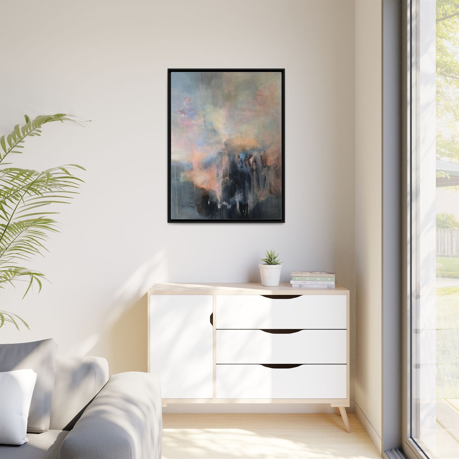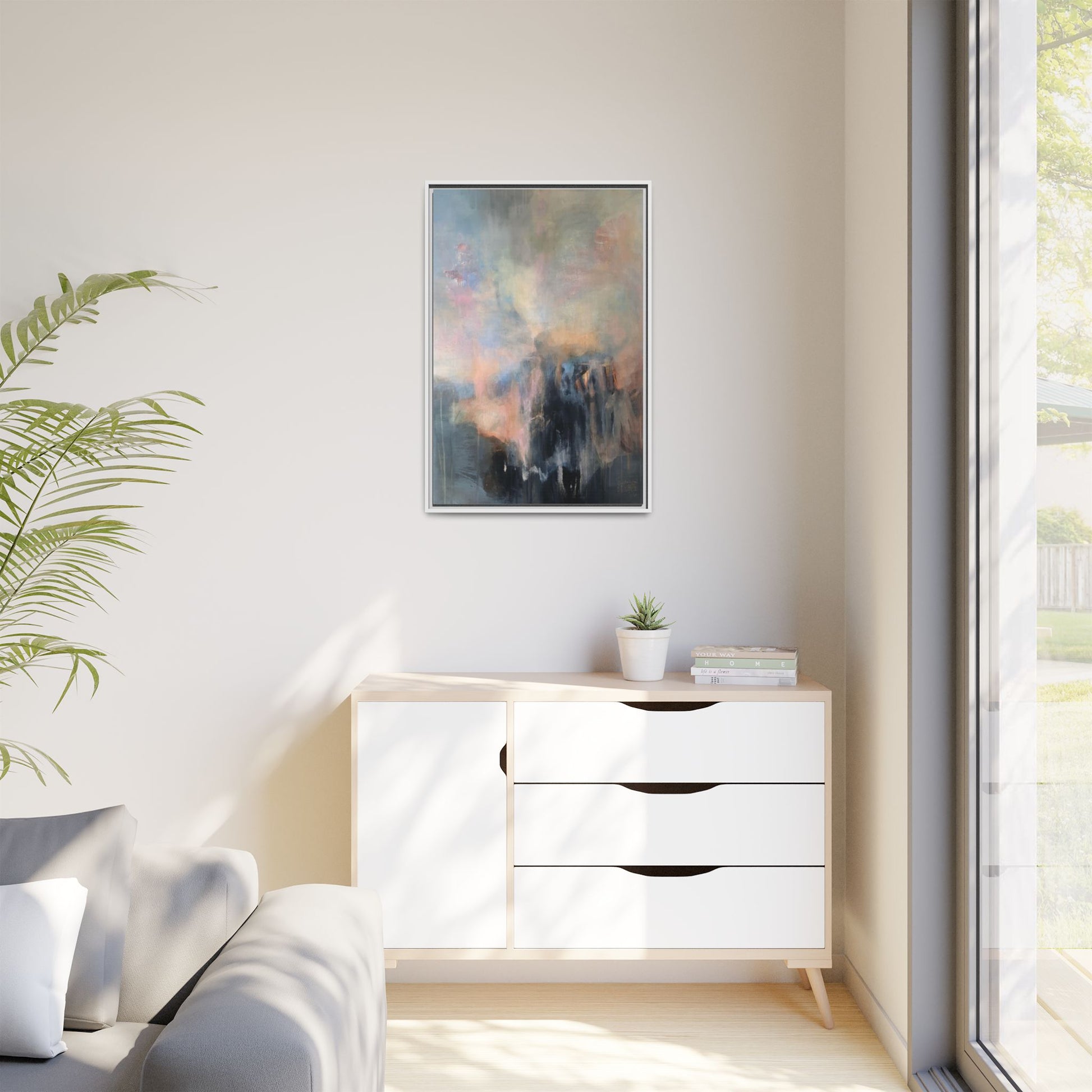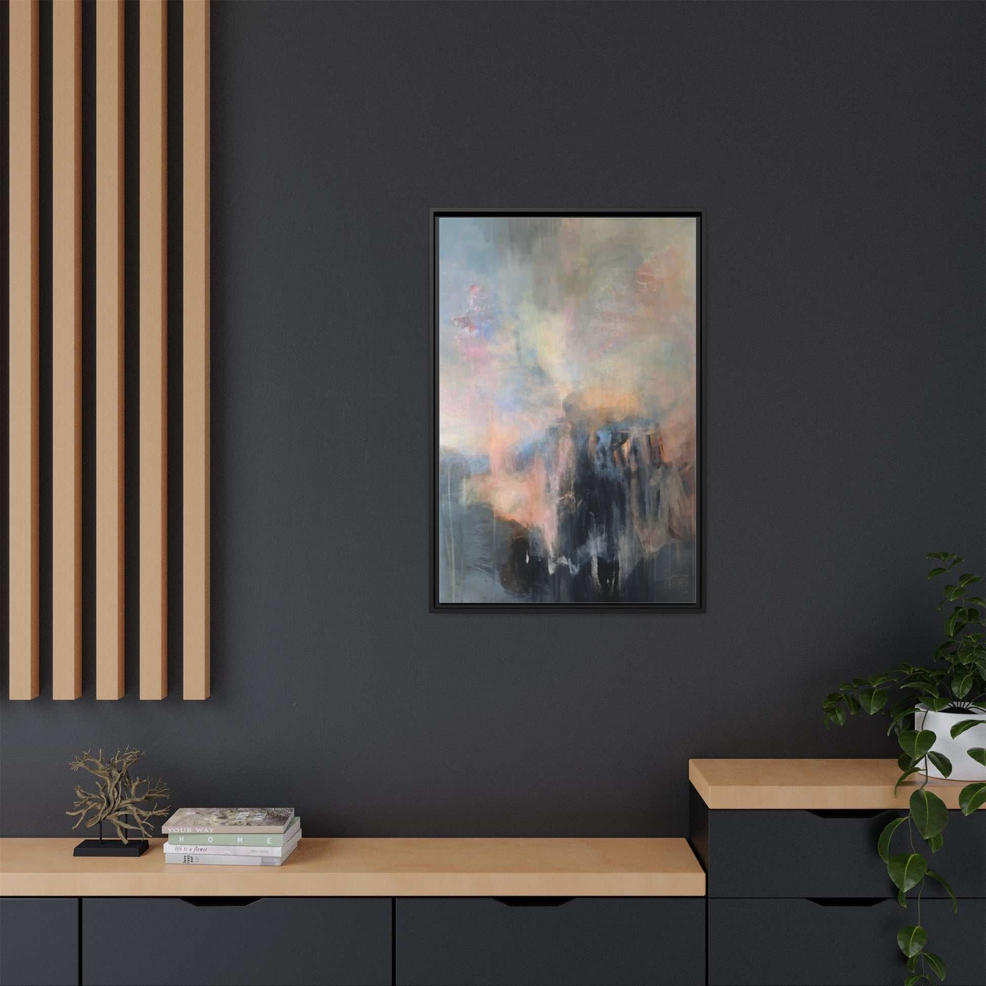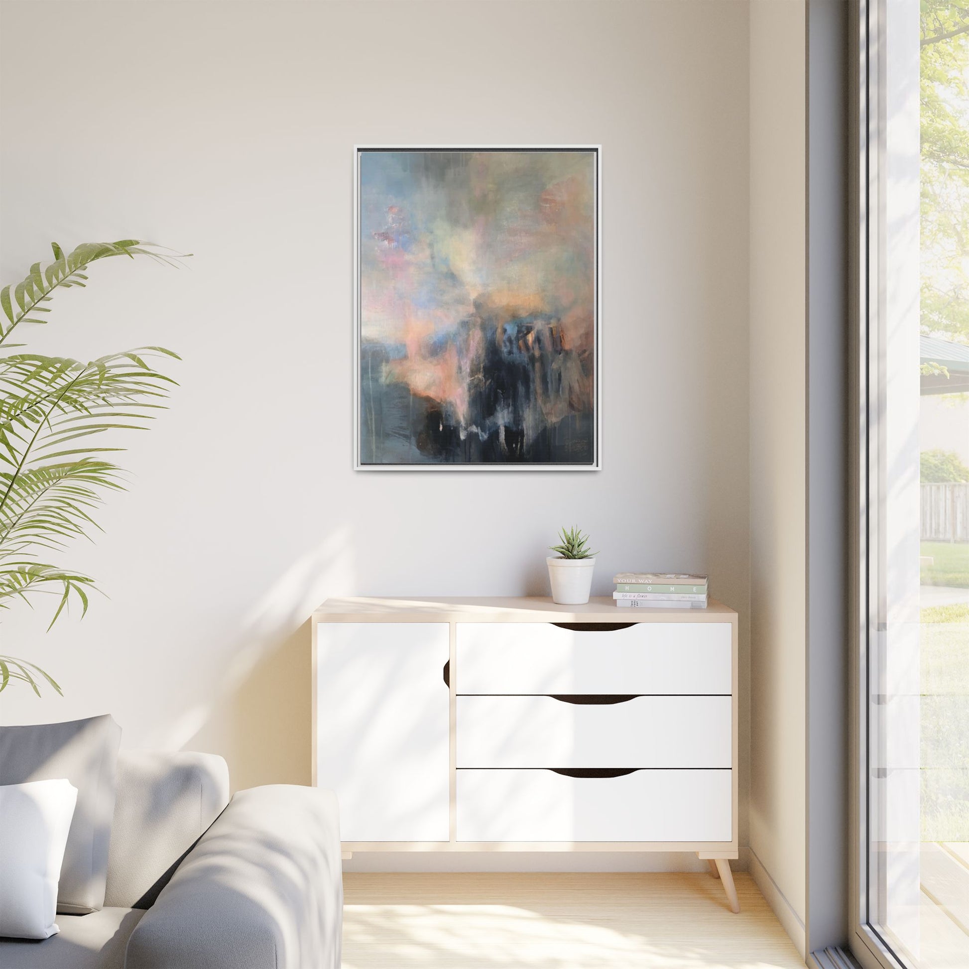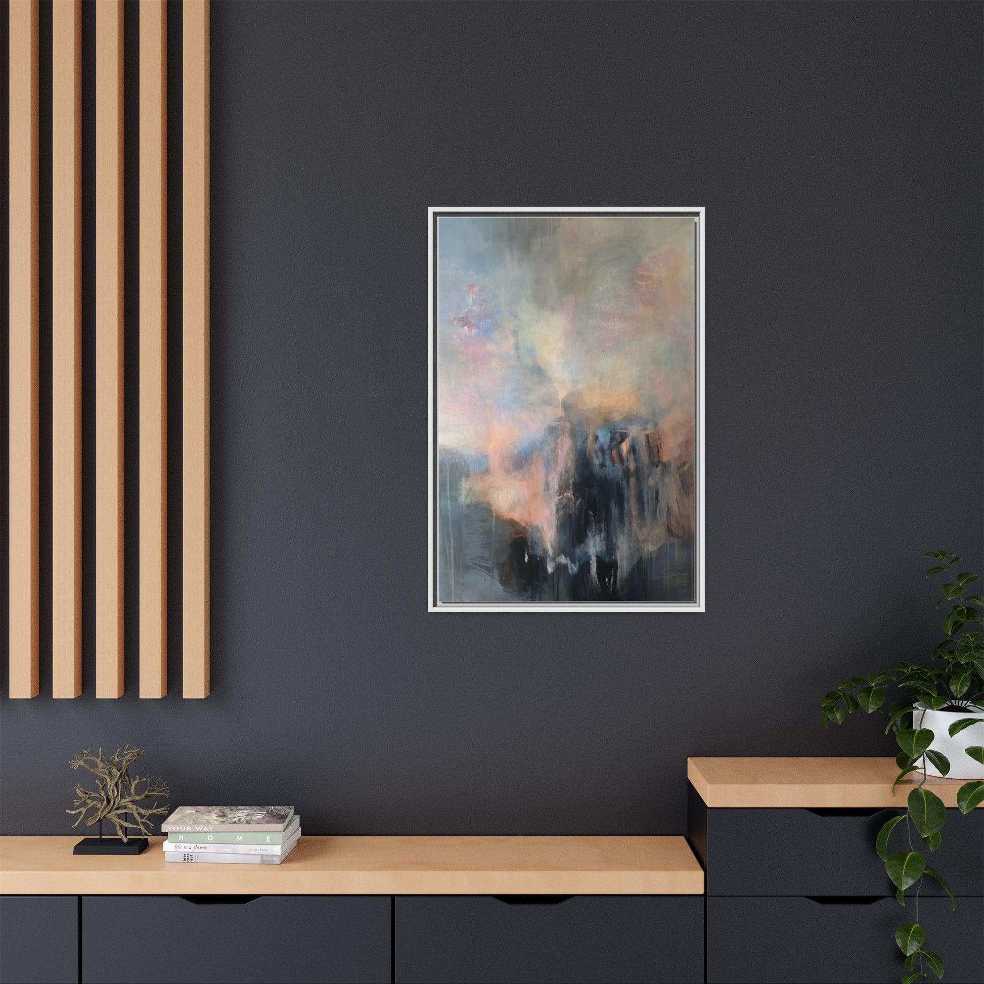 This evocative abstract landscape painting captures a dreamlike atmospheric scene with soft, blended colors and ethereal textures. The artwork employs a muted palette of blues, grays, pinks, and warm oranges, creating a sense of depth and emotional resonance. Blurred, impressionistic forms suggest distant mountains or rocky terrain, with smoky, translucent layers that seem to drift and merge across the canvas. The painting's style evokes a sense of tranquility and introspection, with delicate brushstrokes and a misty, almost luminous quality that blurs the boundaries between sky, land, and horizon. The composition invites contemplation, allowing viewers to interpret the shifting, ephemeral landscape through their own emotional lens.