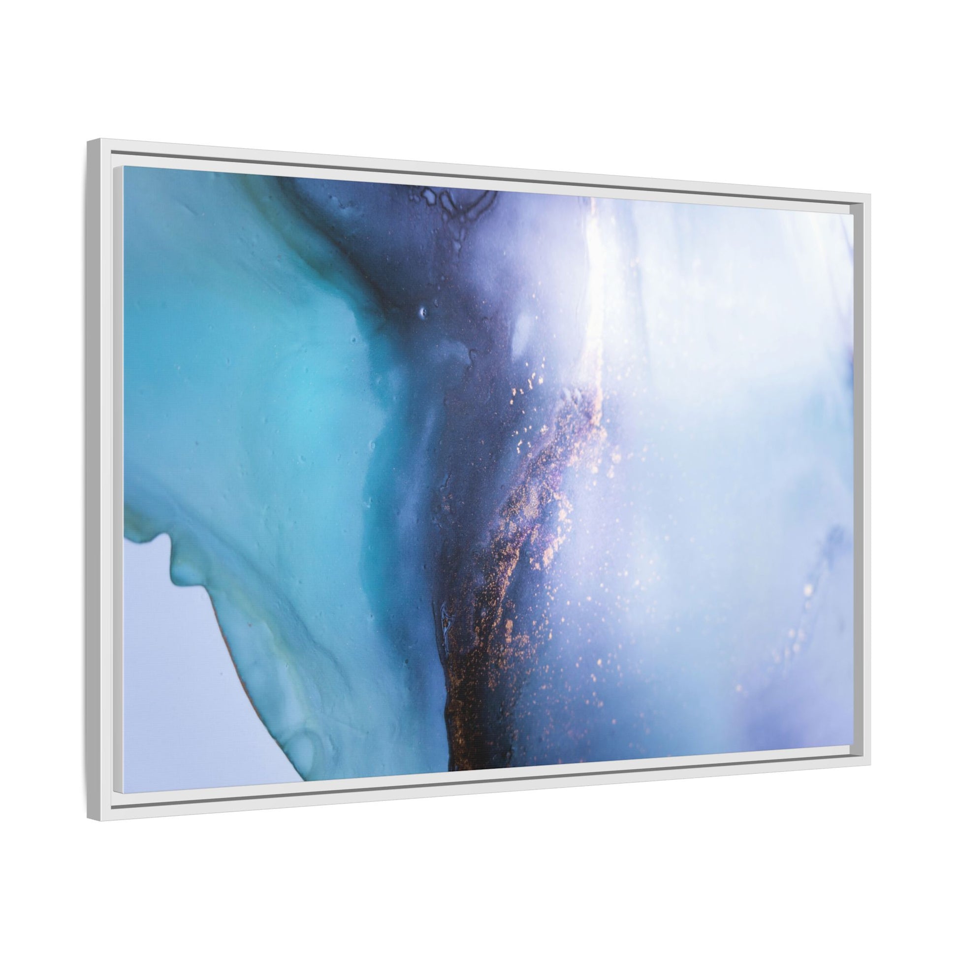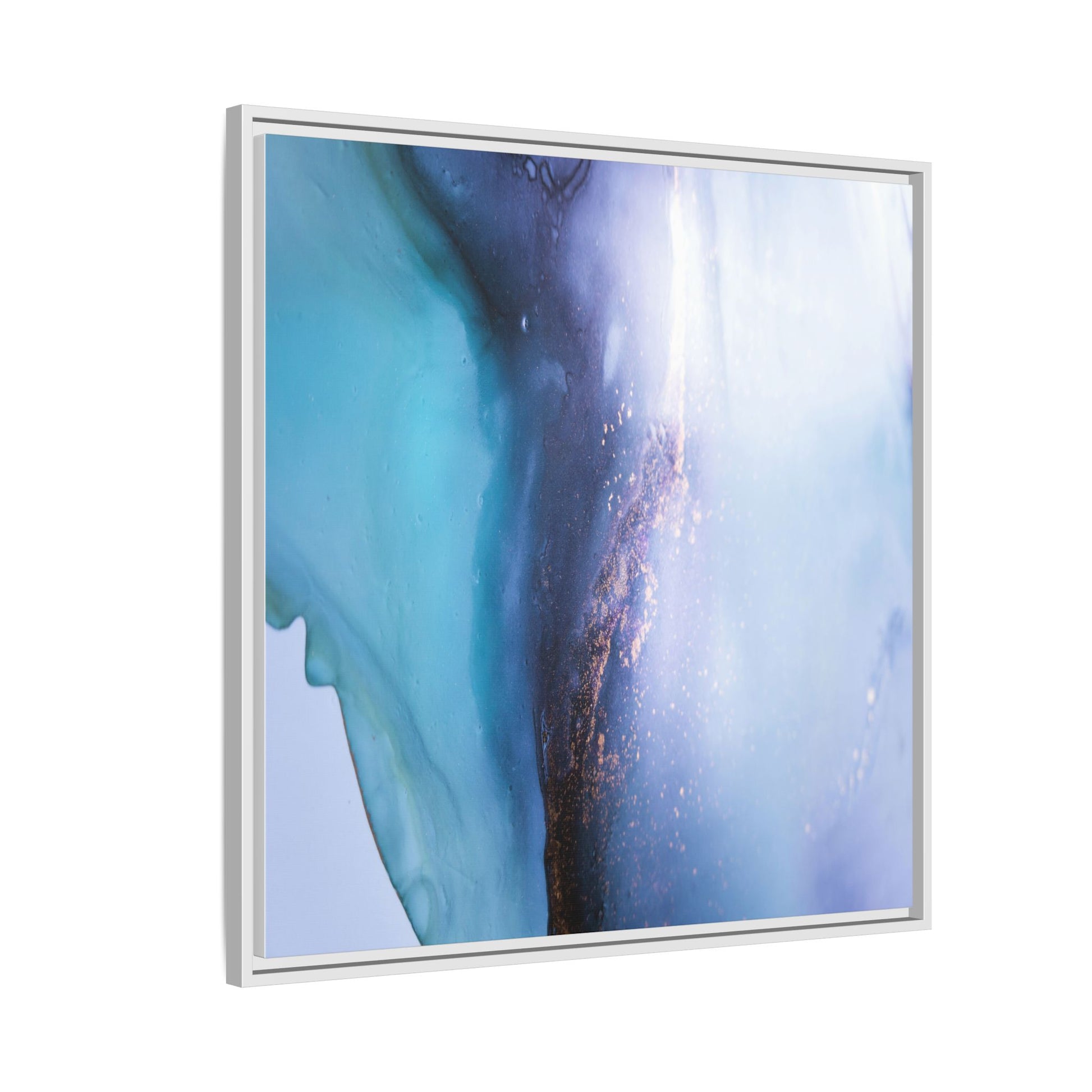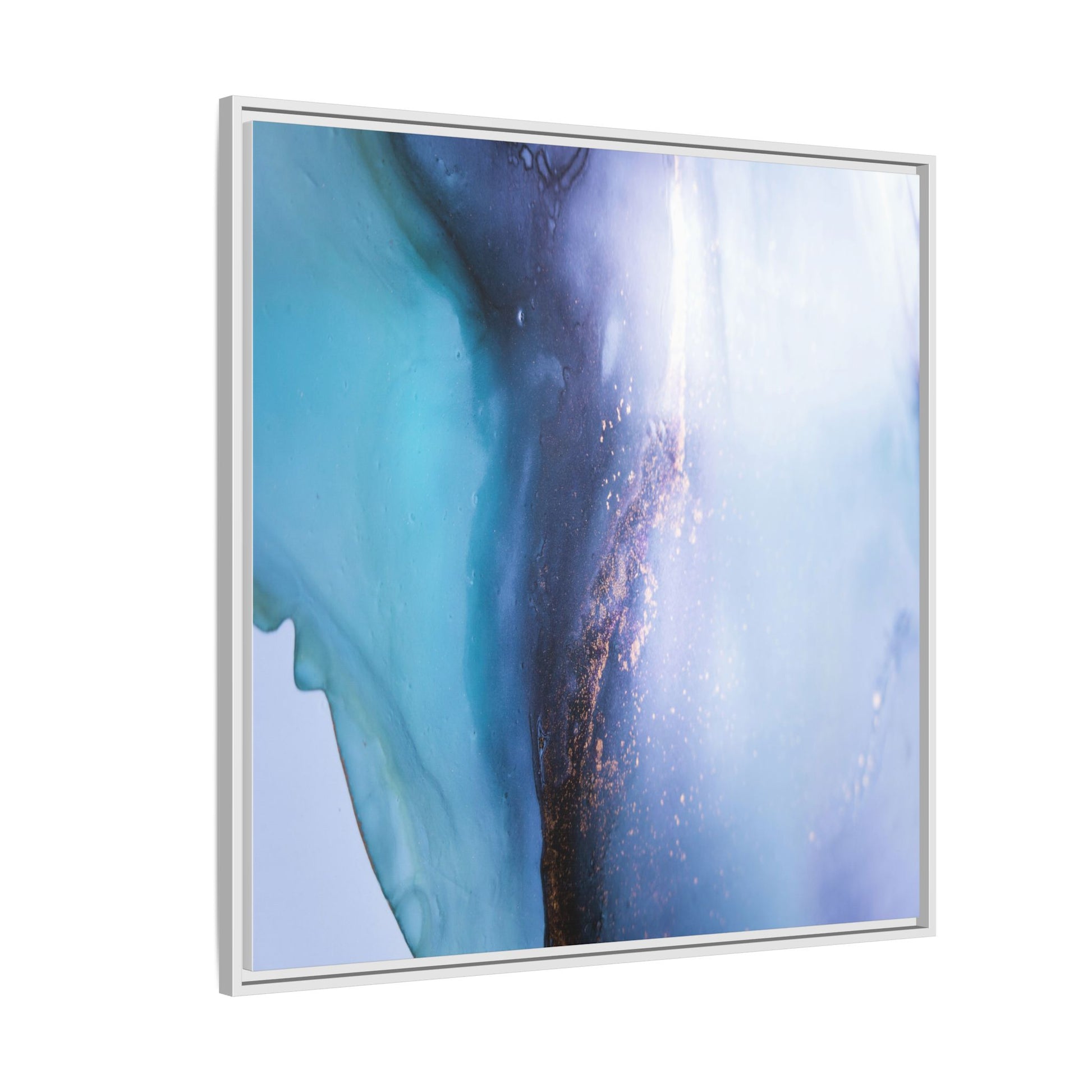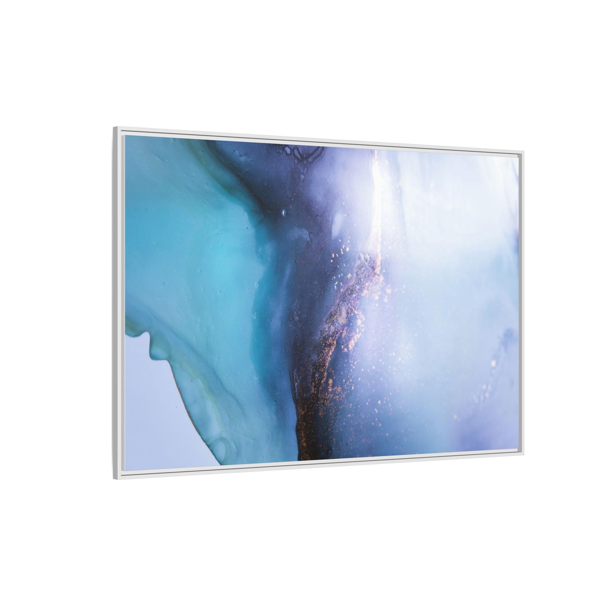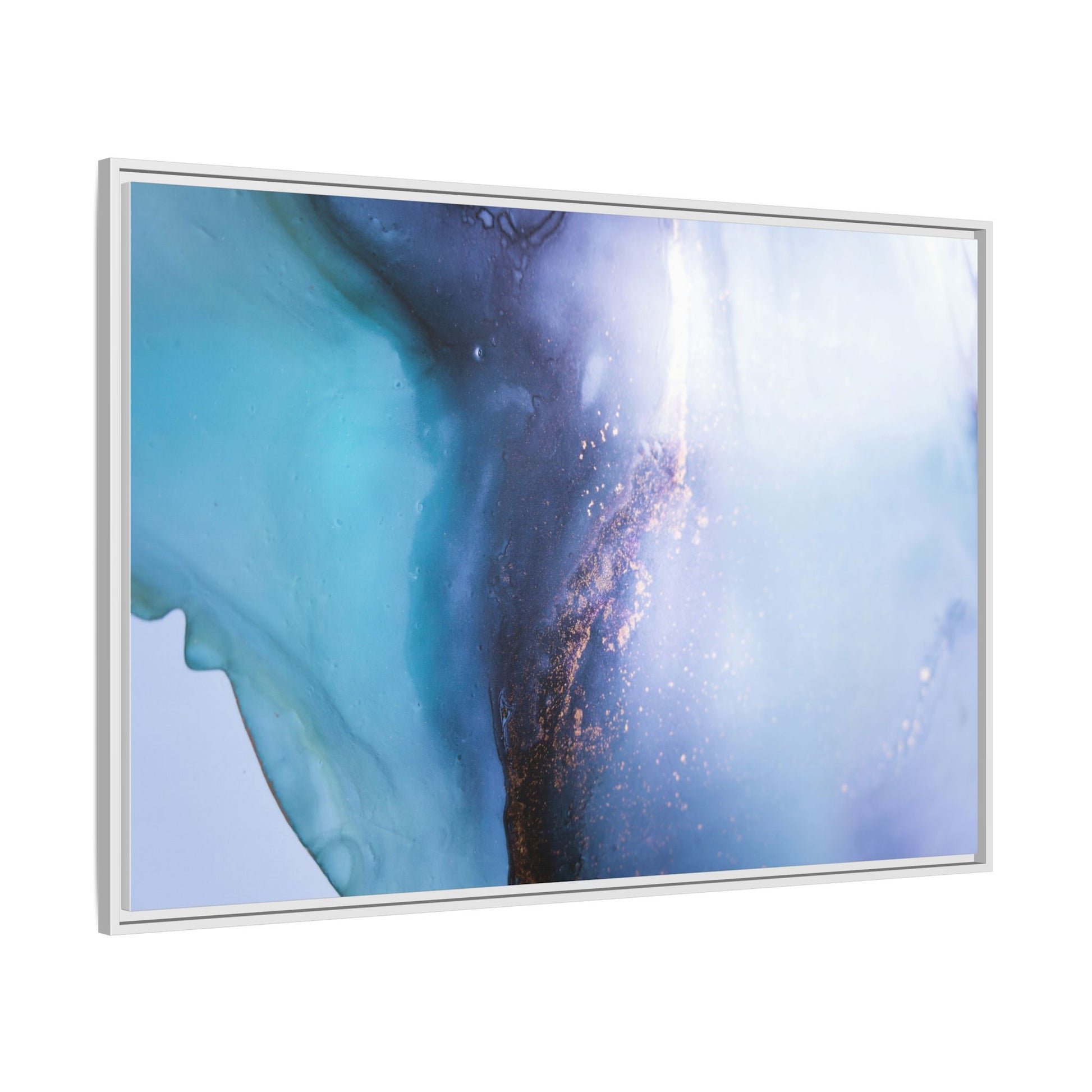 This mesmerizing abstract image captures a stunning liquid landscape of blue and turquoise hues, blending seamlessly with ethereal wisps of soft white and delicate copper-gold speckles. The composition resembles an otherworldly seascape or cosmic vista, with fluid edges that seem to flow and merge organically. Translucent layers create depth and movement, with subtle droplets and textures adding intricate detail to the dreamy visual experience. The color palette evokes a sense of tranquility and mystery, transitioning from cool aquamarine tones to luminous pale blues and warm metallic accents. The image appears to be created using fluid art or alcohol ink techniques, resulting in a breathtaking, almost microscopic view of color and texture.