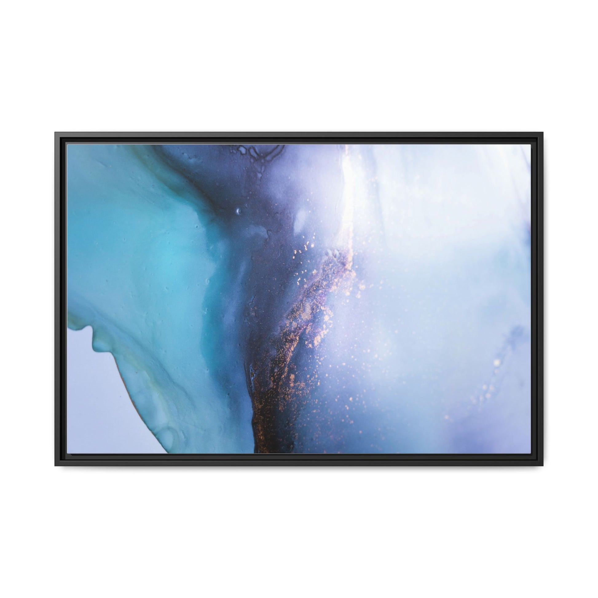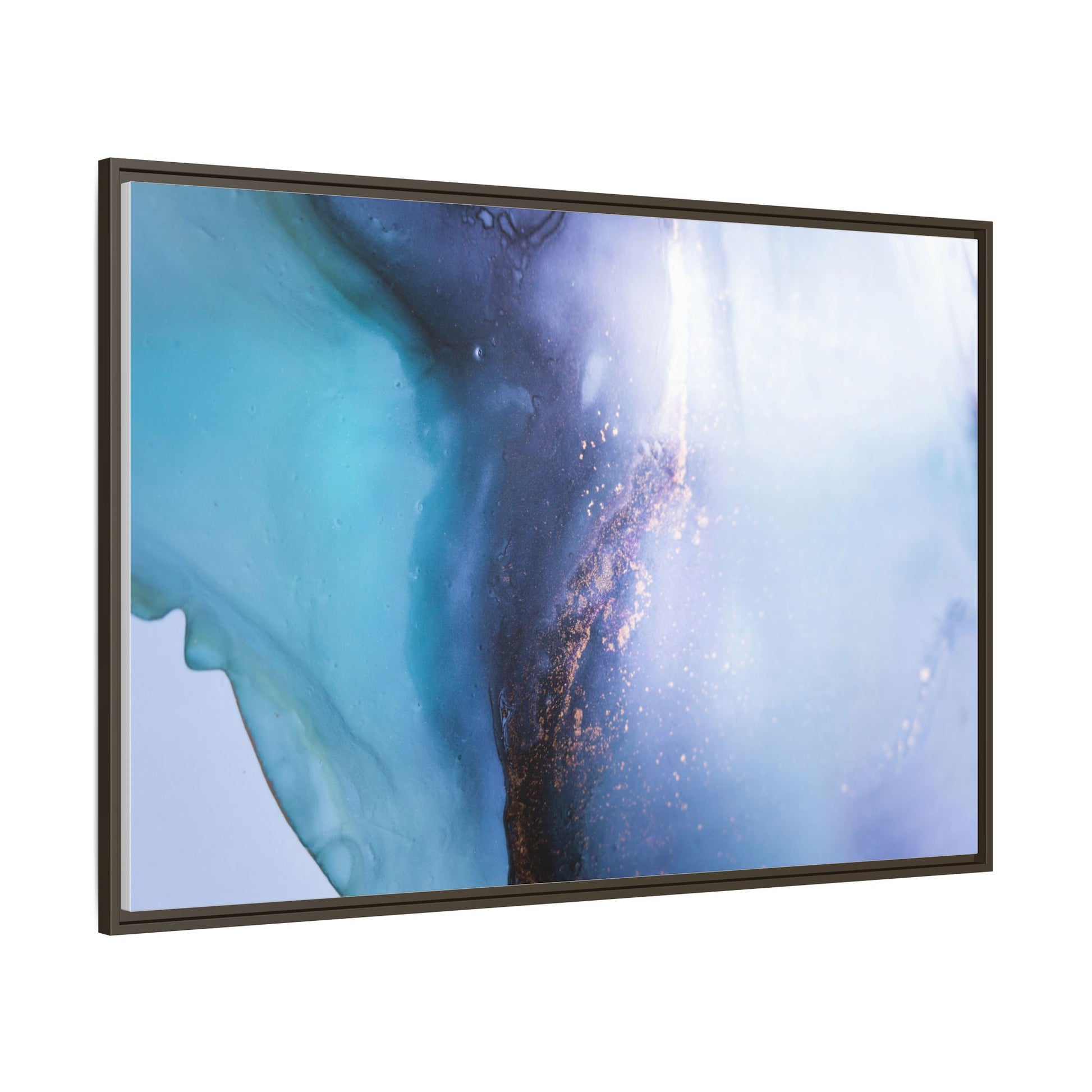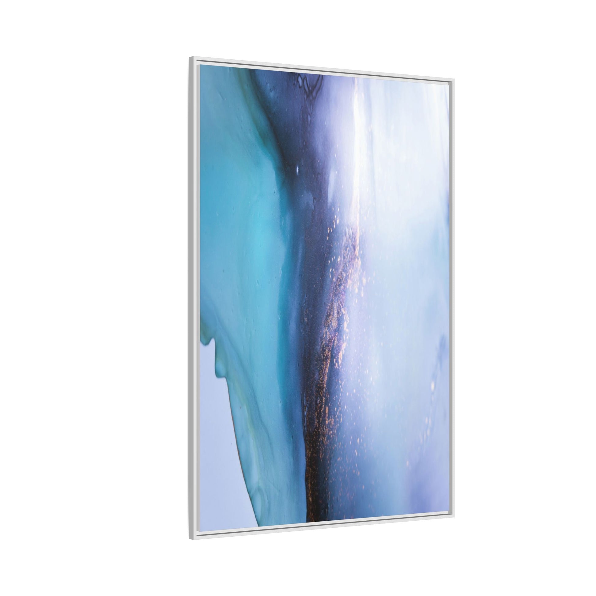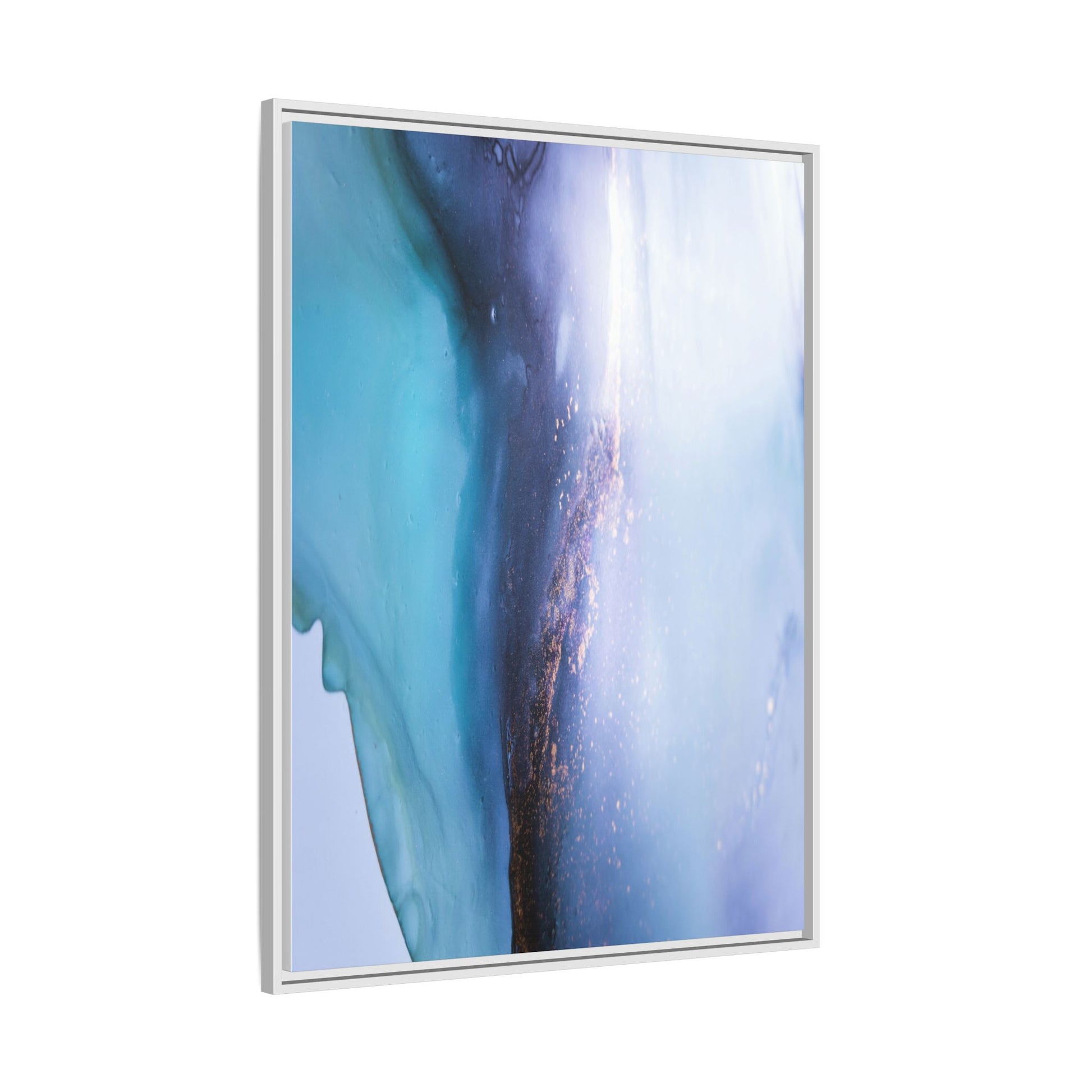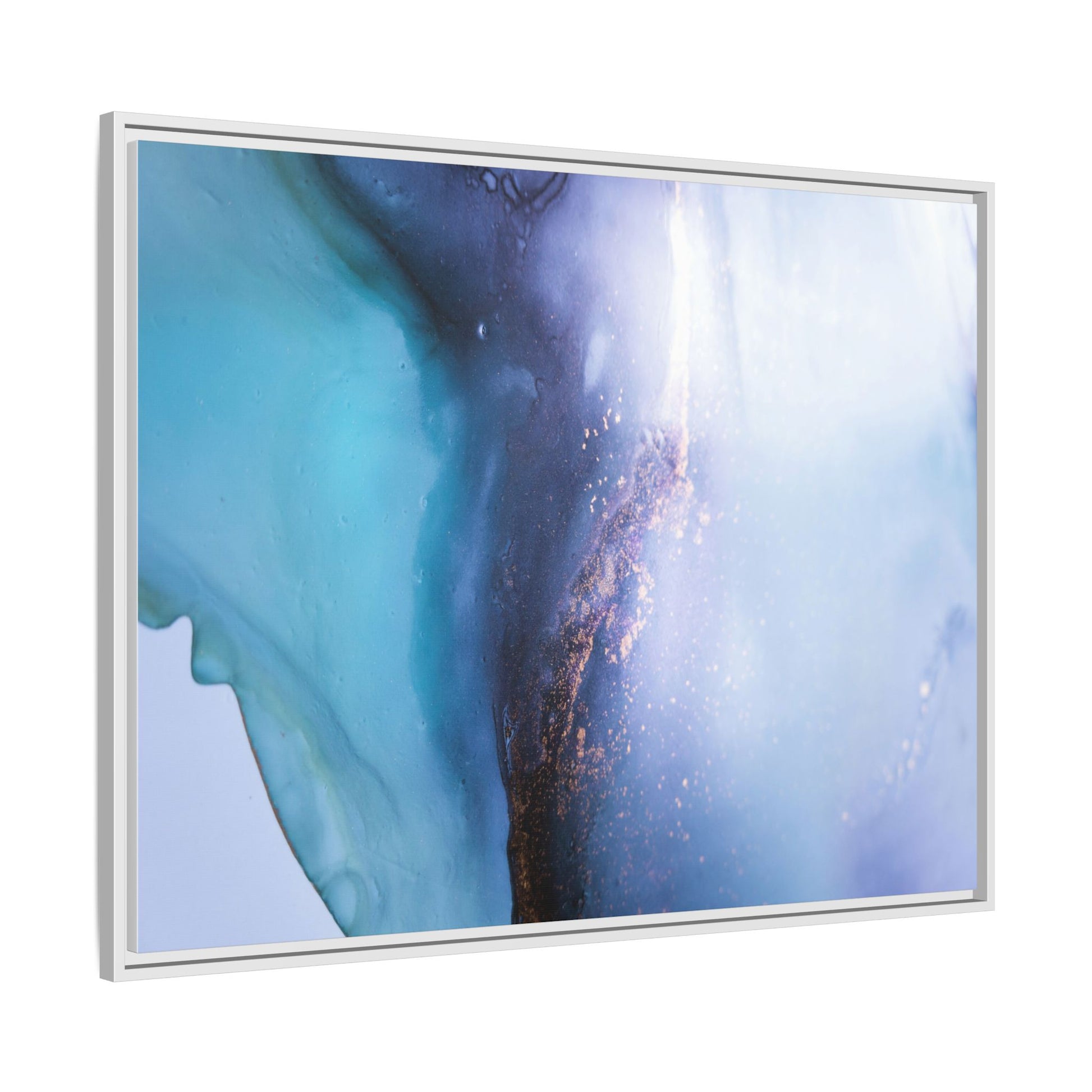 This mesmerizing abstract image captures a stunning liquid landscape of blue and turquoise hues, blending seamlessly with ethereal wisps of soft white and delicate copper-gold speckles. The composition resembles an otherworldly seascape or cosmic vista, with fluid edges that seem to flow and merge organically. Translucent layers create depth and movement, with subtle droplets and textures adding intricate detail to the dreamy visual experience. The color palette evokes a sense of tranquility and mystery, transitioning from cool aquamarine tones to luminous pale blues and warm metallic accents. The image appears to be created using fluid art or alcohol ink techniques, resulting in a breathtaking, almost microscopic view of color and texture.
