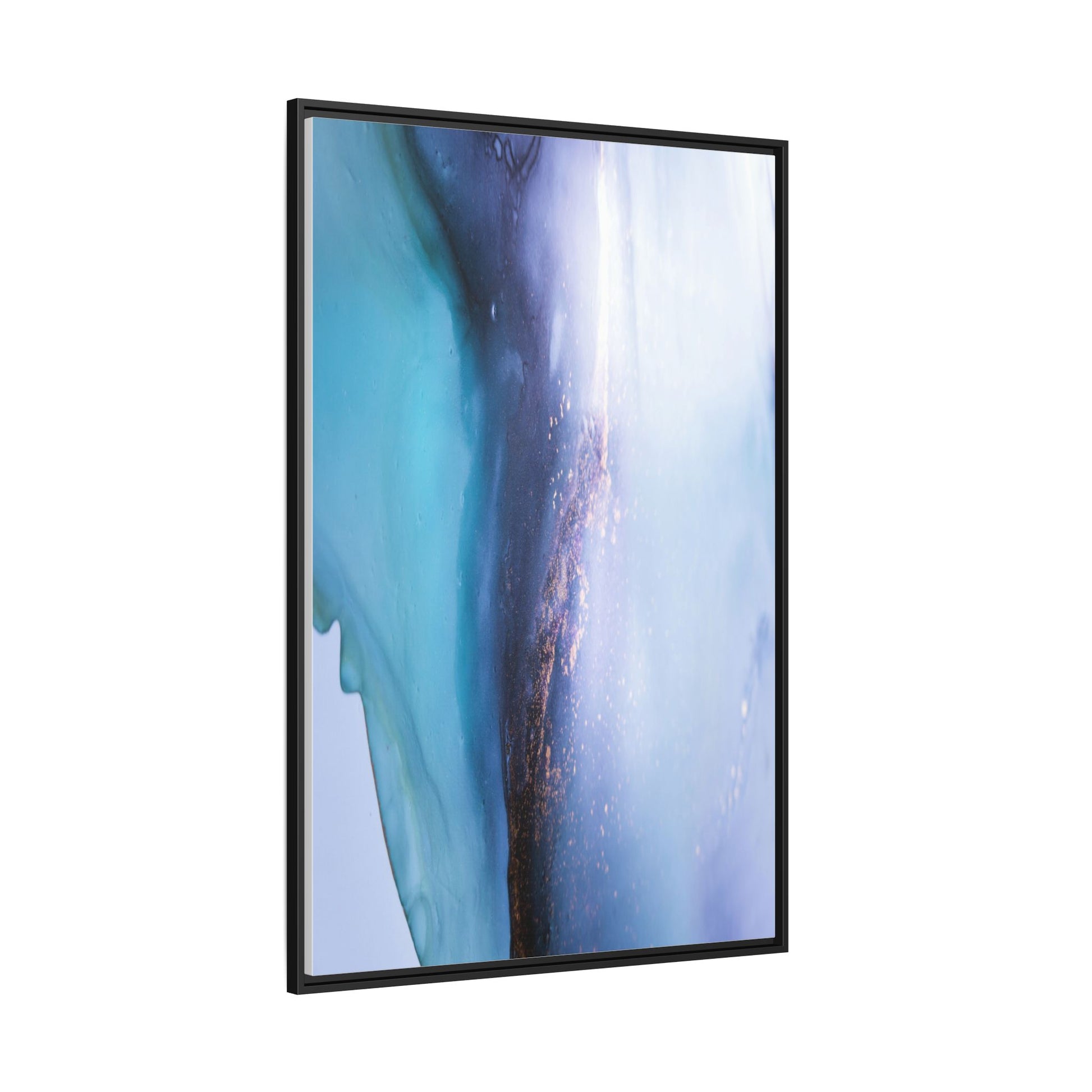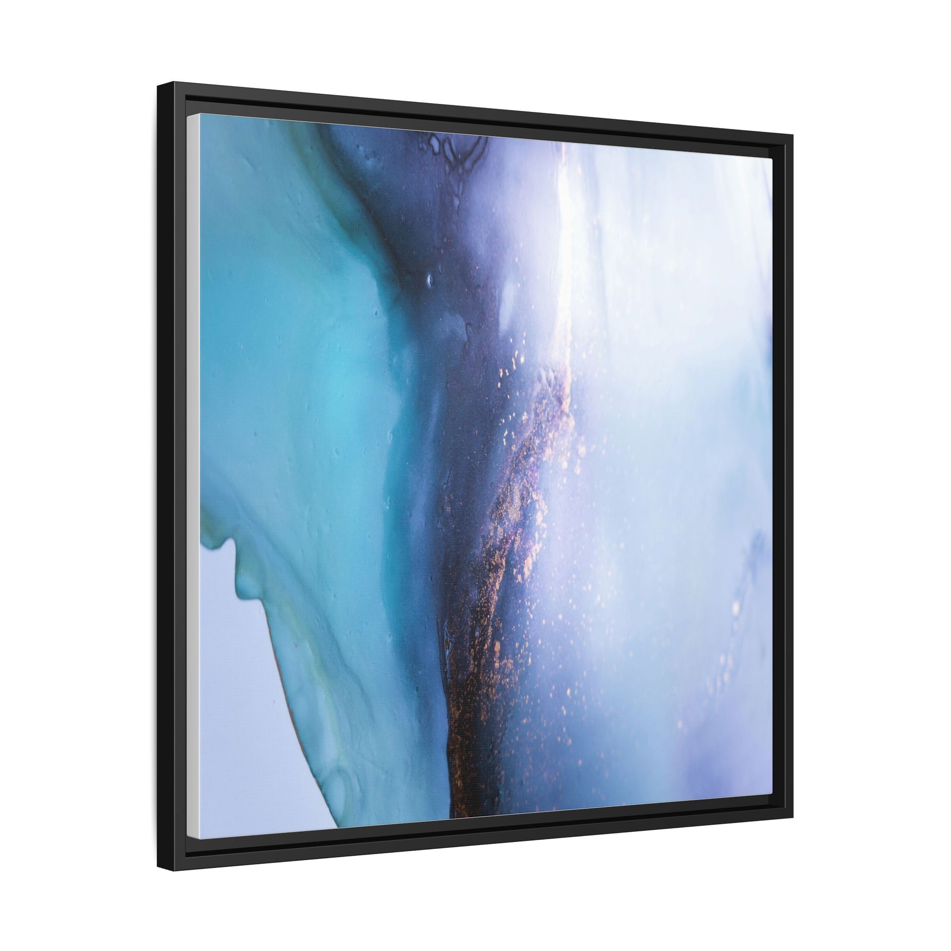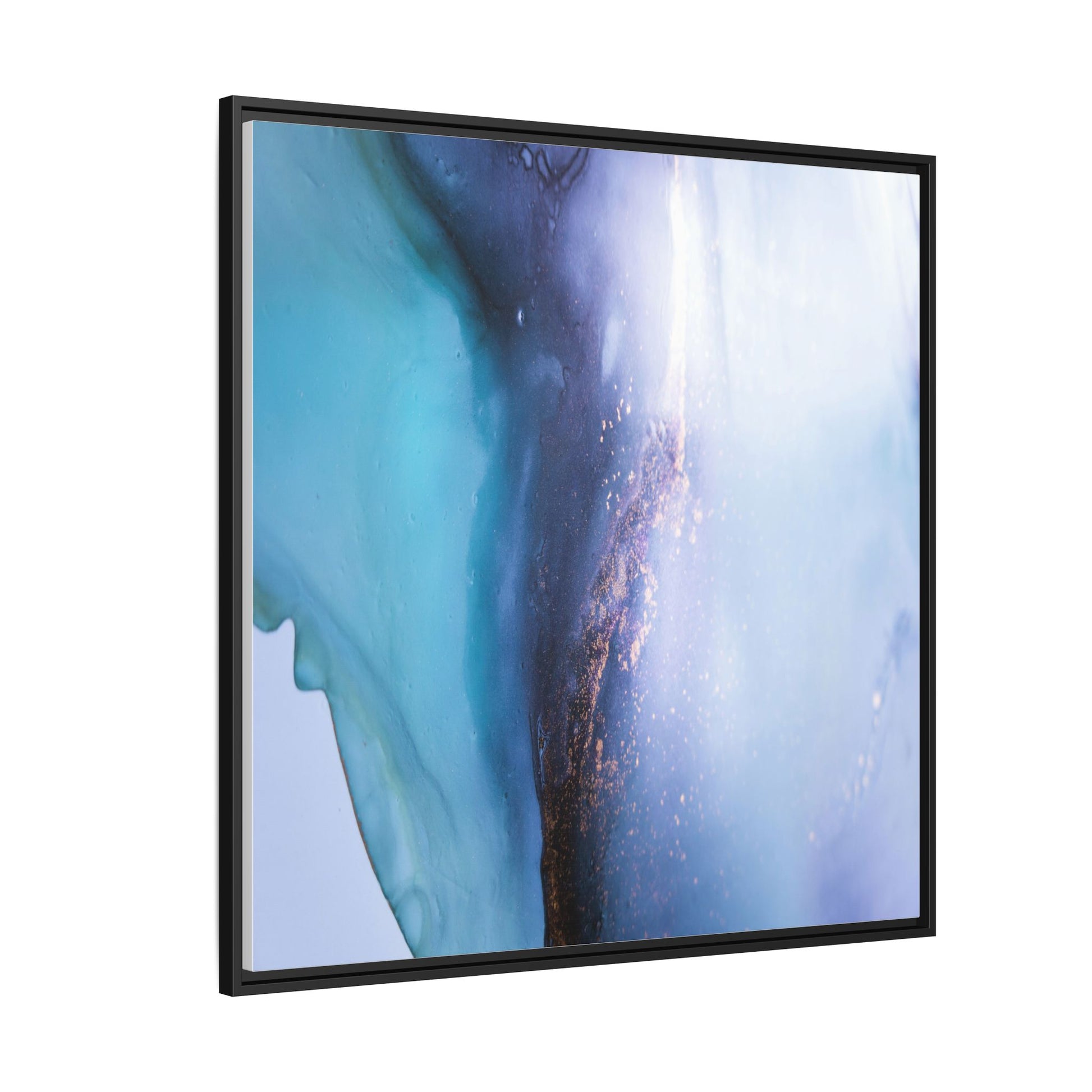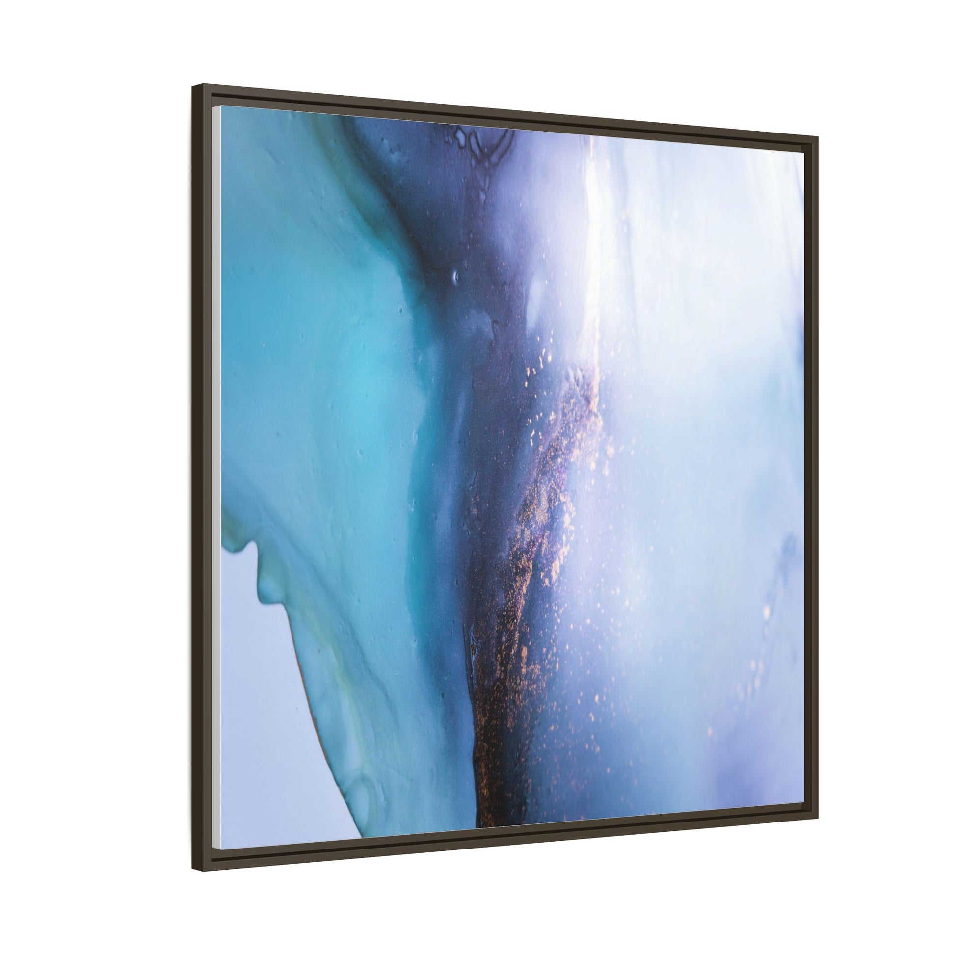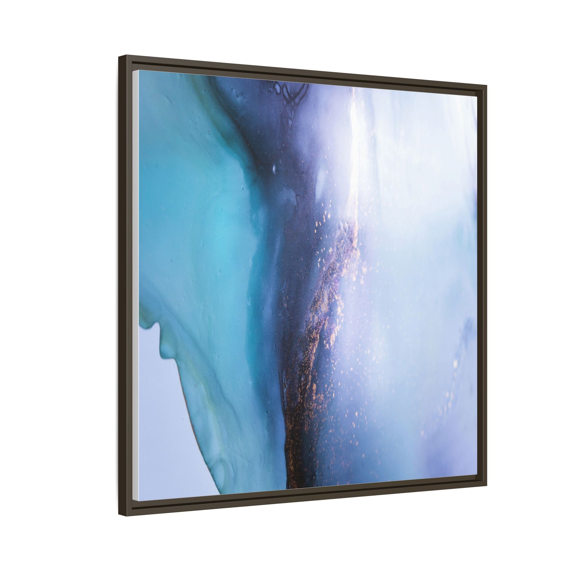 This mesmerizing abstract image captures a stunning liquid landscape of blue and turquoise hues, blending seamlessly with ethereal wisps of soft white and delicate copper-gold speckles. The composition resembles an otherworldly seascape or cosmic vista, with fluid edges that seem to flow and merge organically. Translucent layers create depth and movement, with subtle droplets and textures adding intricate detail to the dreamy visual experience. The color palette evokes a sense of tranquility and mystery, transitioning from cool aquamarine tones to luminous pale blues and warm metallic accents. The image appears to be created using fluid art or alcohol ink techniques, resulting in a breathtaking, almost microscopic view of color and texture.