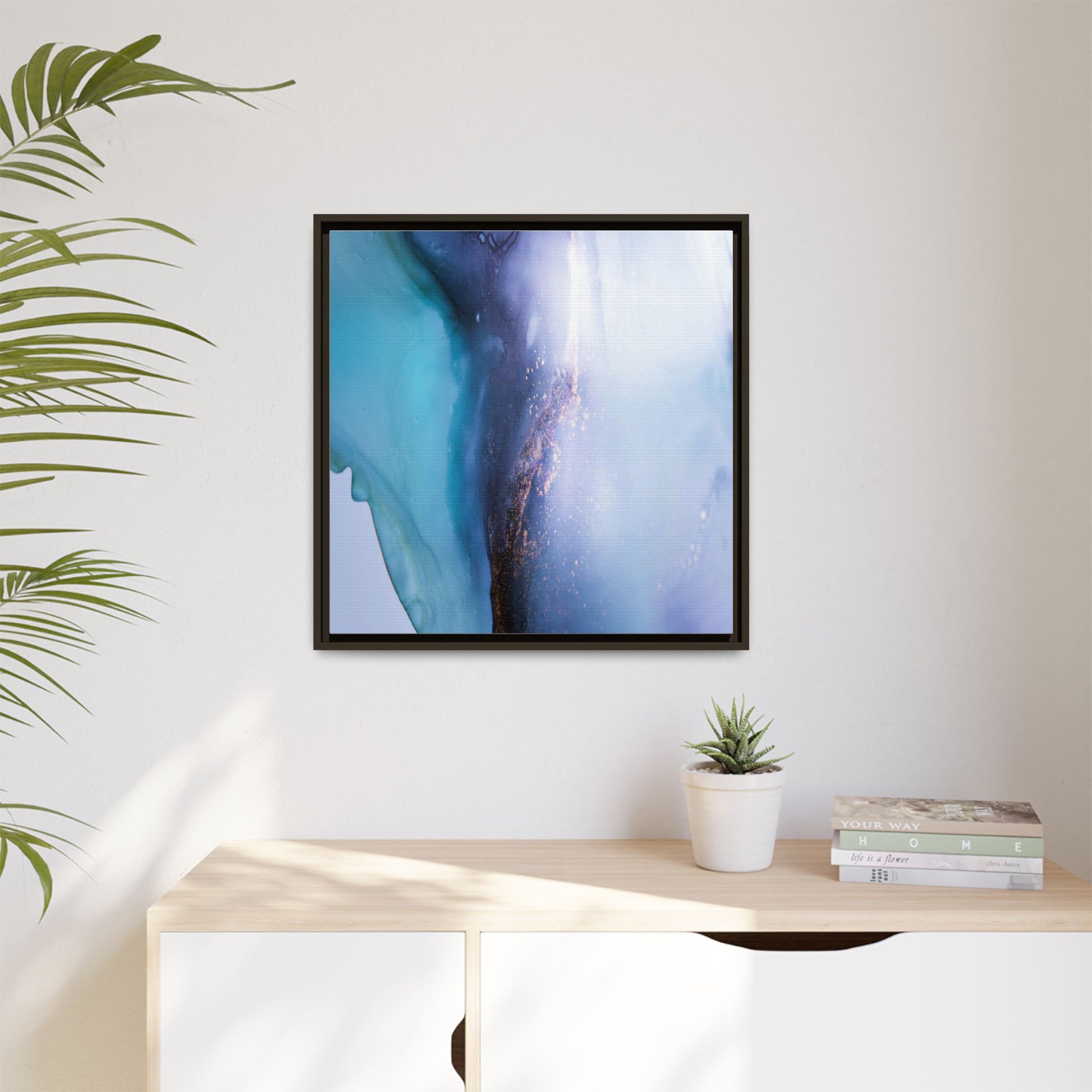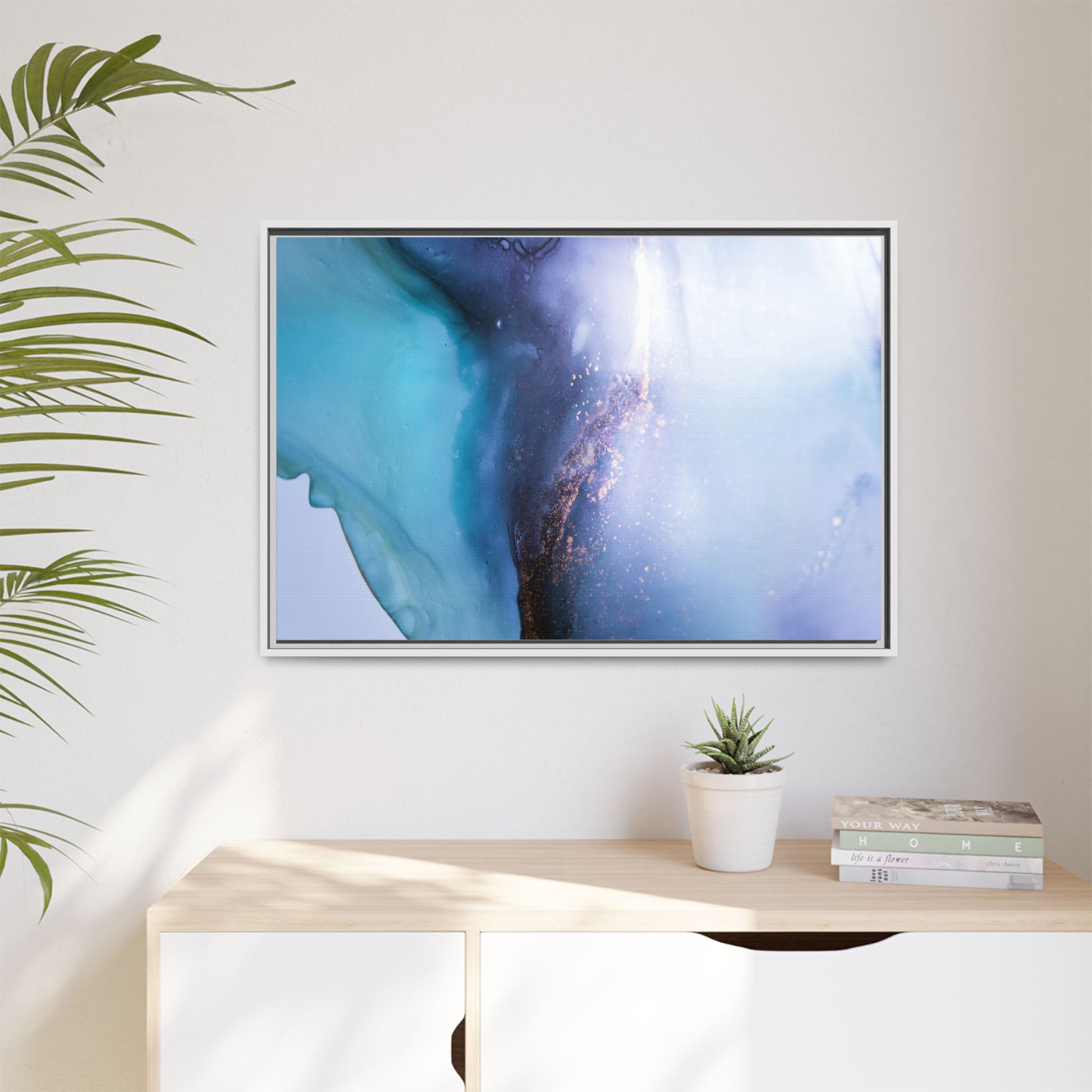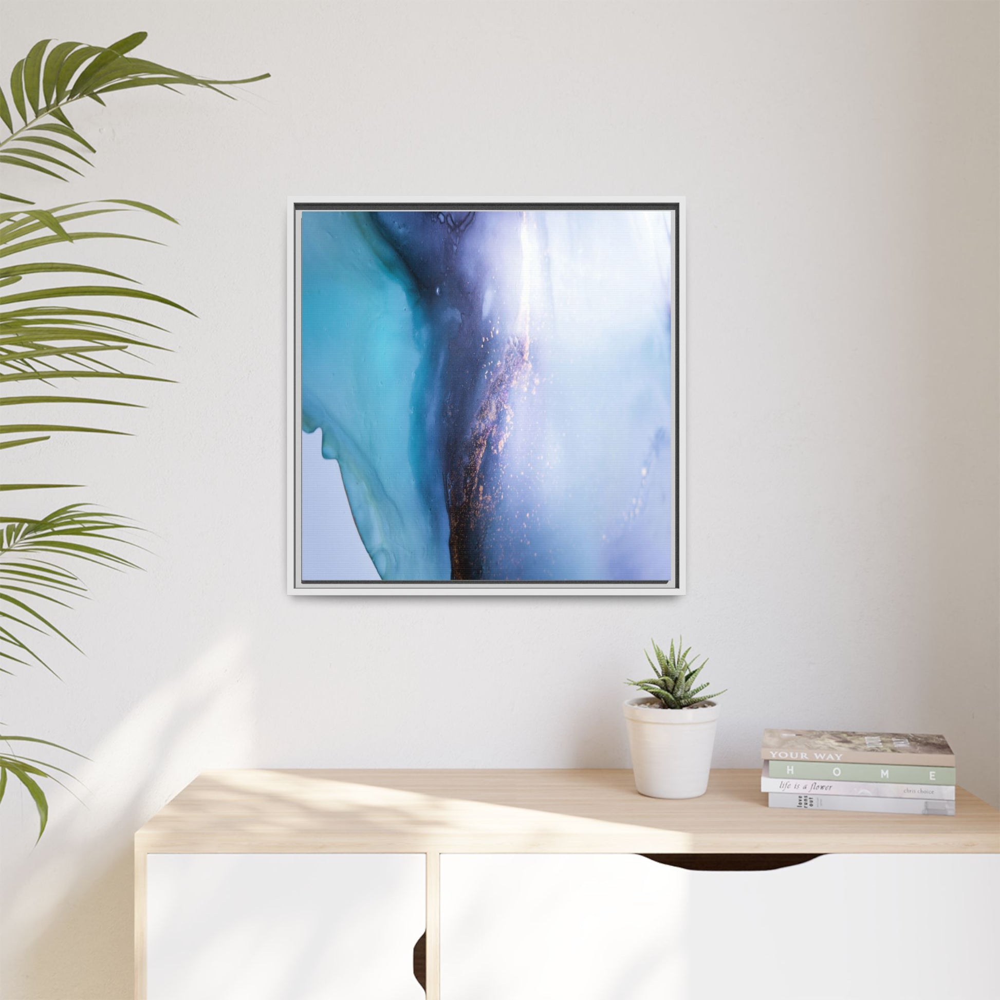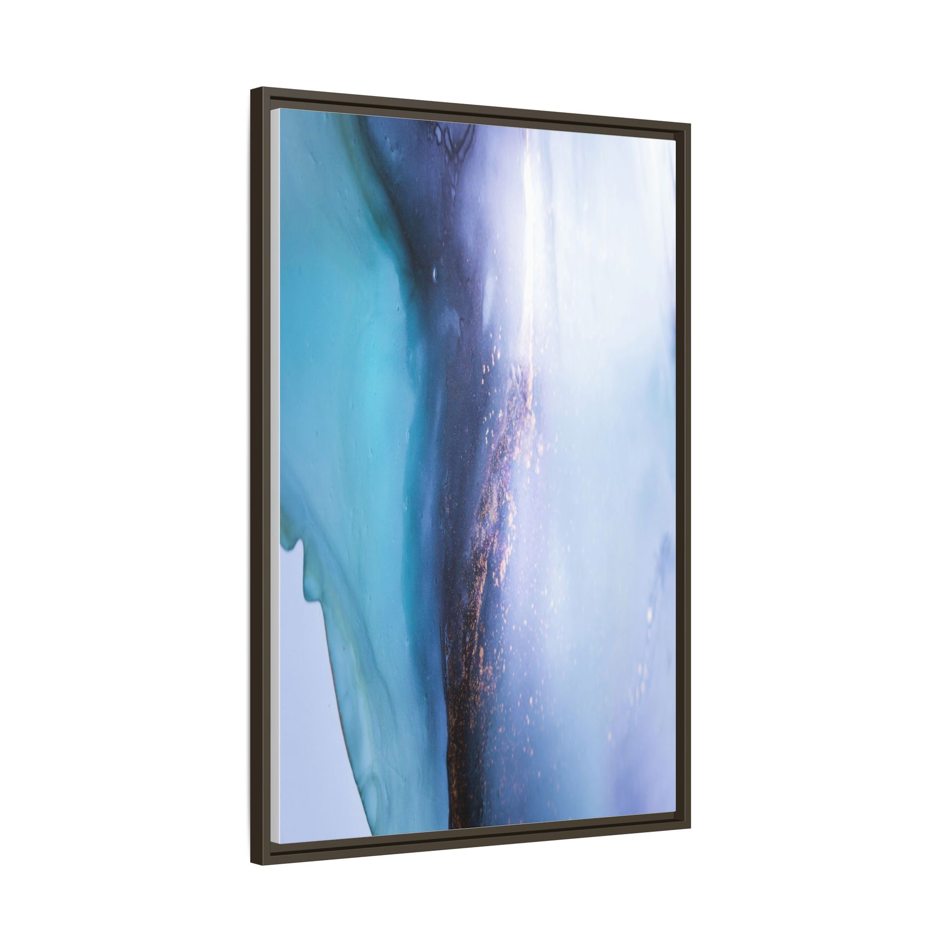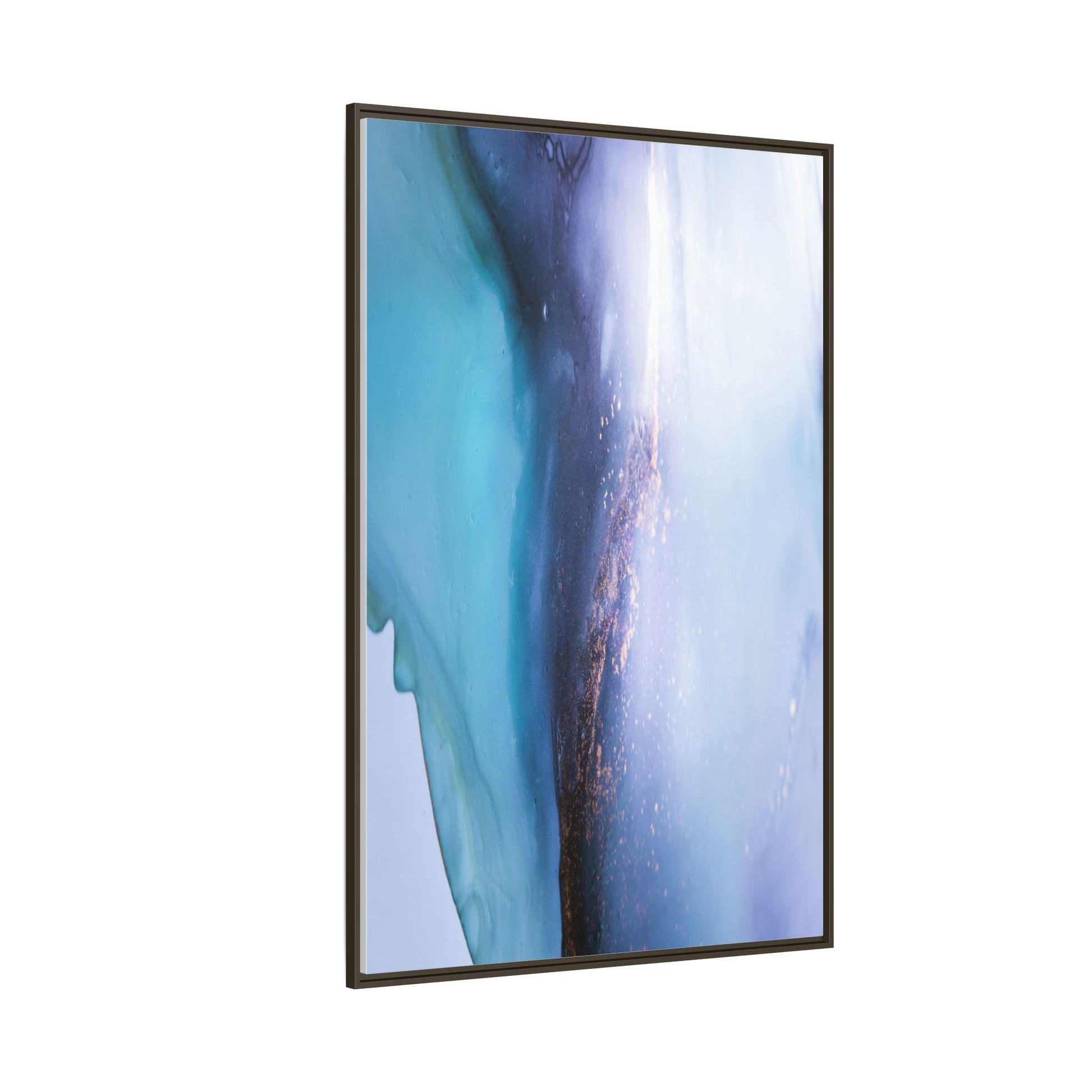This mesmerizing abstract image captures a stunning liquid landscape of blue and turquoise hues, blending seamlessly with ethereal wisps of soft white and delicate copper-gold speckles. The composition resembles an otherworldly seascape or cosmic vista, with fluid edges that seem to flow and merge organically. Translucent layers create depth and movement, with subtle droplets and textures adding intricate detail to the dreamy visual experience. The color palette evokes a sense of tranquility and mystery, transitioning from cool aquamarine tones to luminous pale blues and warm metallic accents. The image appears to be created using fluid art or alcohol ink techniques, resulting in a breathtaking, almost microscopic view of color and texture.