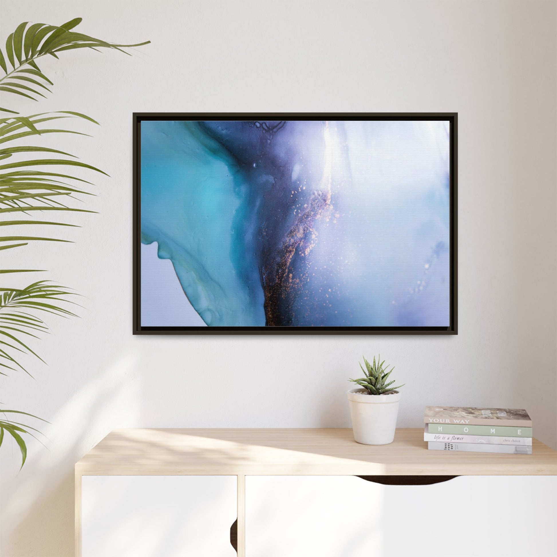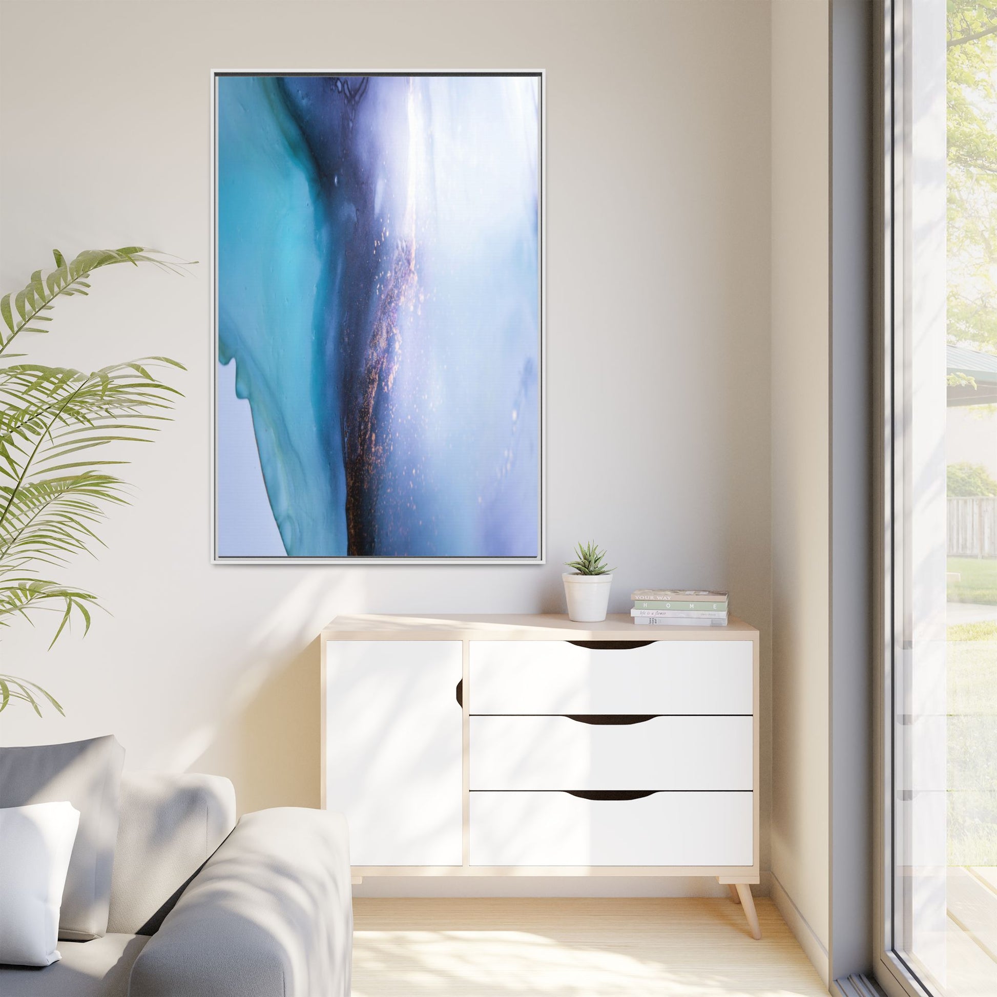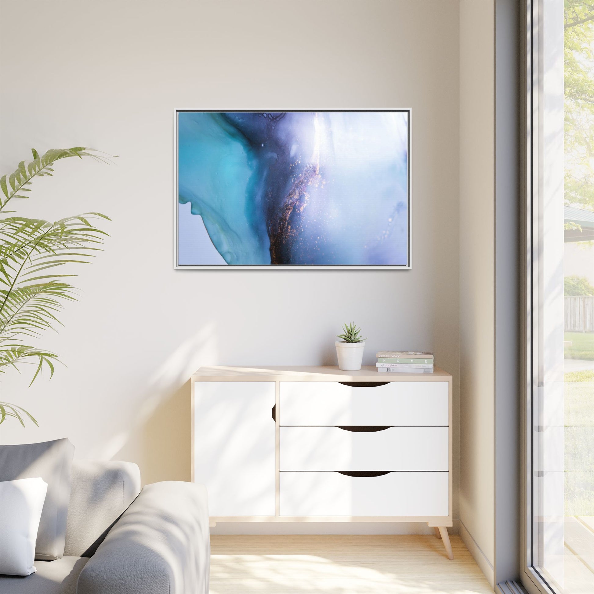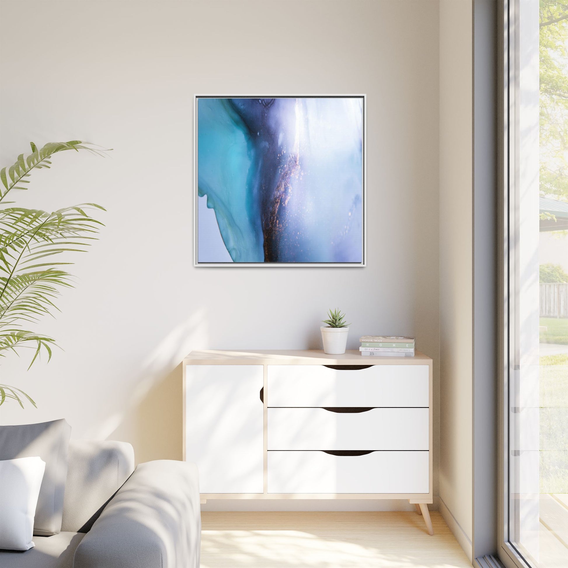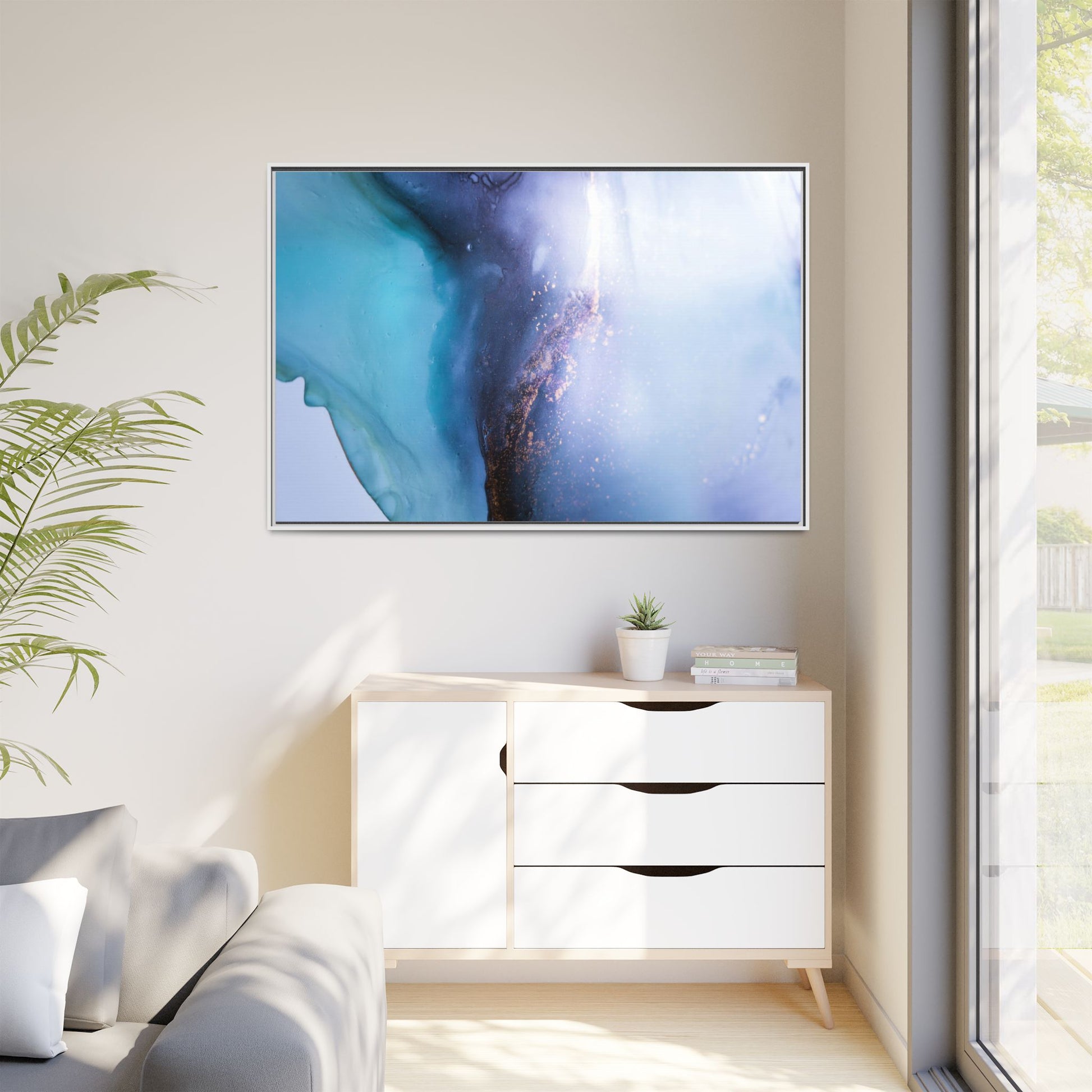 This mesmerizing abstract image captures a stunning liquid landscape of blue and turquoise hues, blending seamlessly with ethereal wisps of soft white and delicate copper-gold speckles. The composition resembles an otherworldly seascape or cosmic vista, with fluid edges that seem to flow and merge organically. Translucent layers create depth and movement, with subtle droplets and textures adding intricate detail to the dreamy visual experience. The color palette evokes a sense of tranquility and mystery, transitioning from cool aquamarine tones to luminous pale blues and warm metallic accents. The image appears to be created using fluid art or alcohol ink techniques, resulting in a breathtaking, almost microscopic view of color and texture.