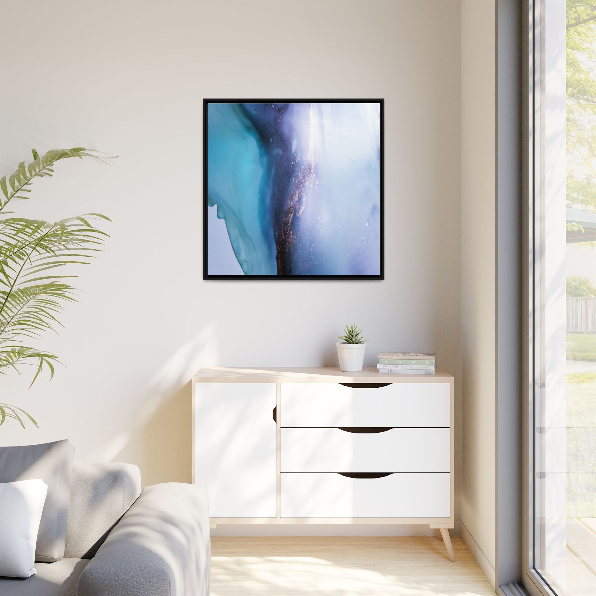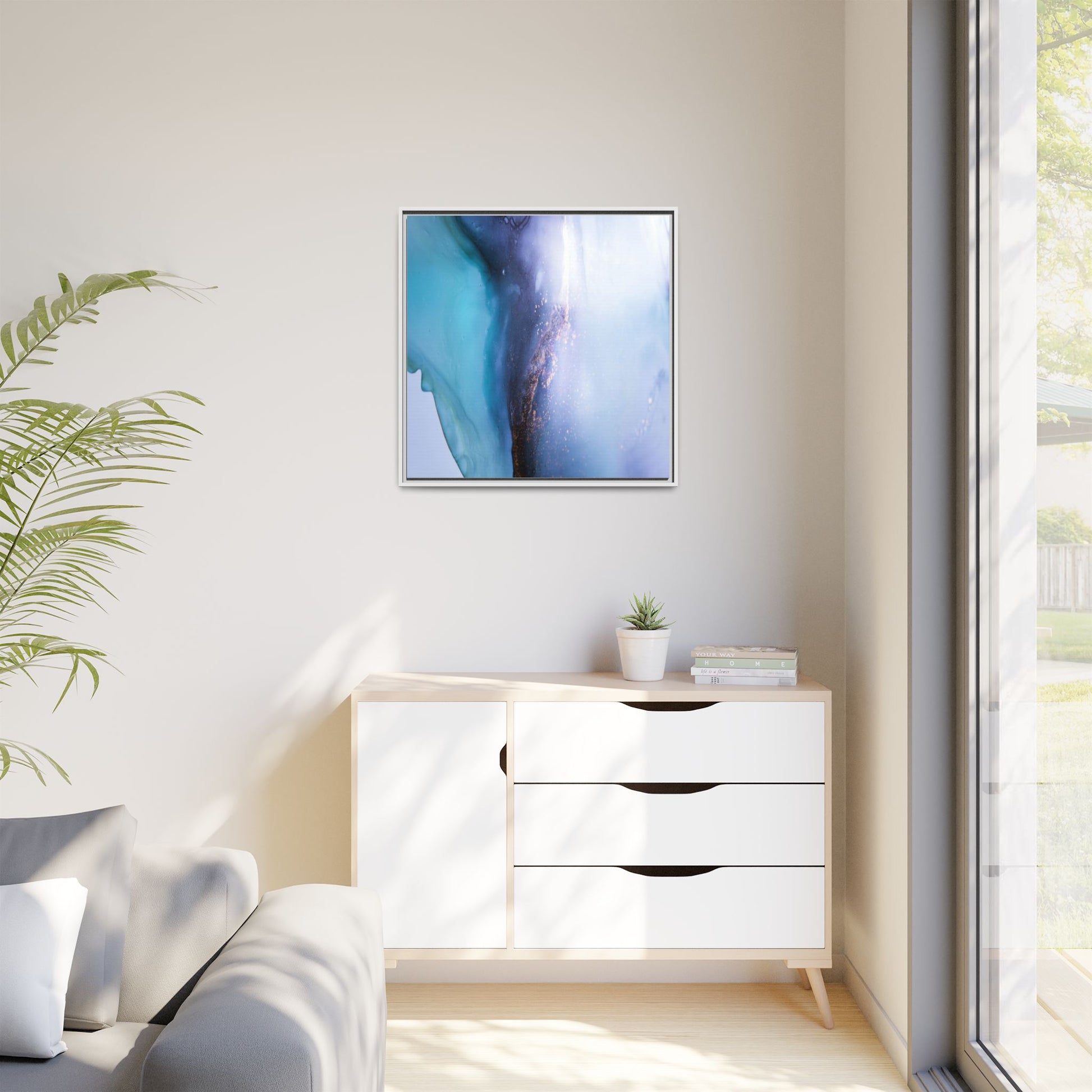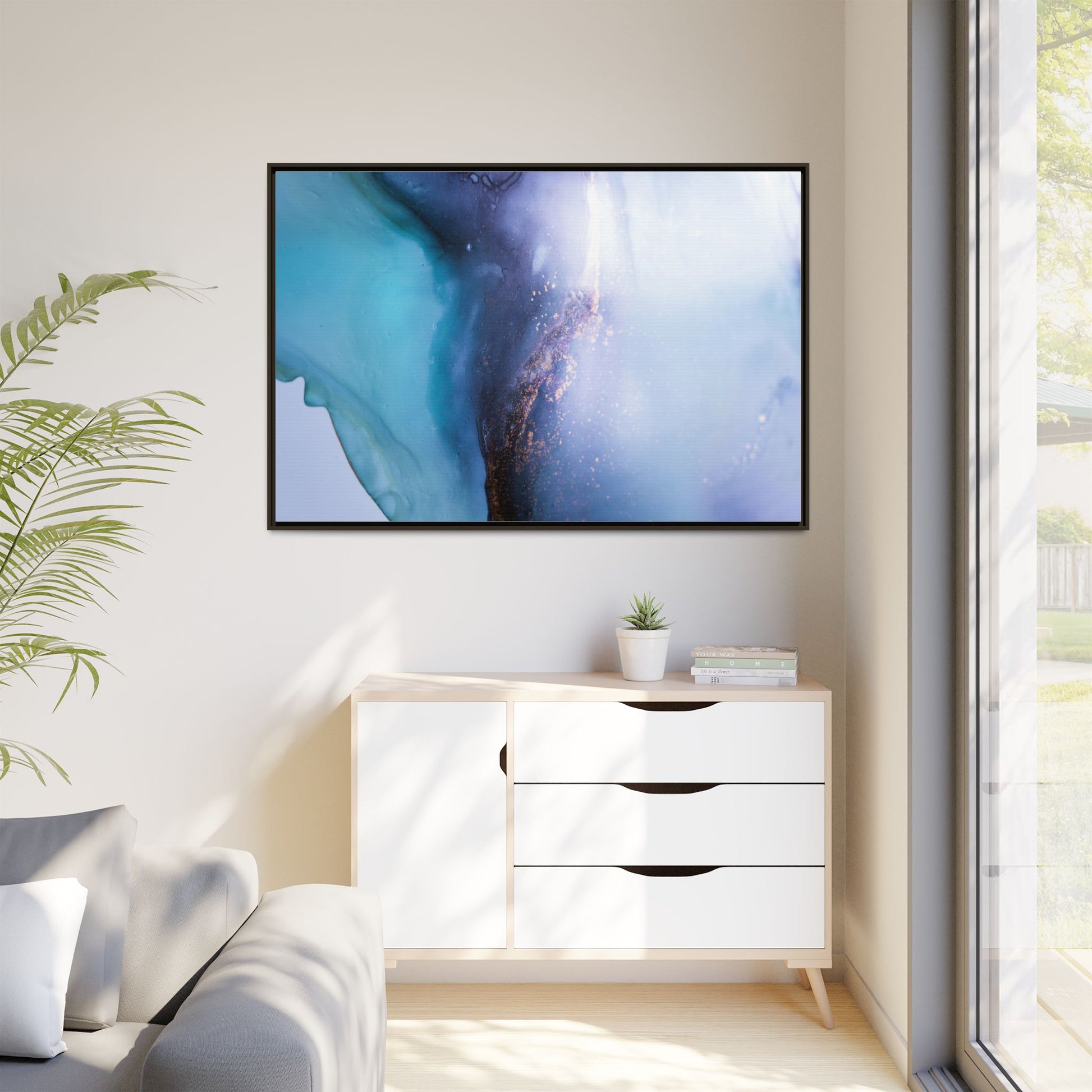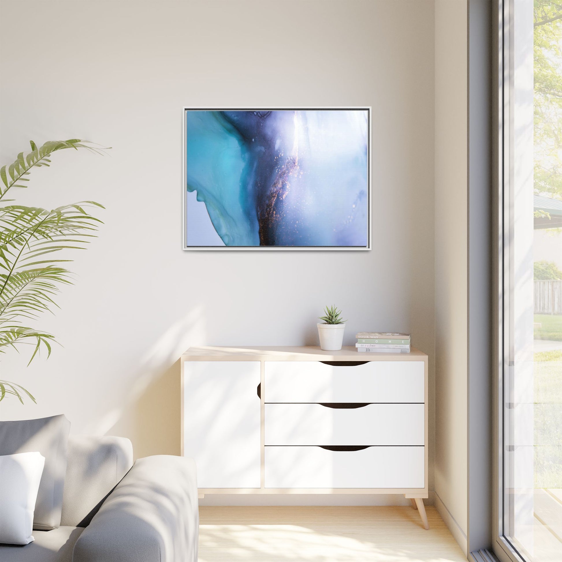 This mesmerizing abstract image captures a stunning liquid landscape of blue and turquoise hues, blending seamlessly with ethereal wisps of soft white and delicate copper-gold speckles. The composition resembles an otherworldly seascape or cosmic vista, with fluid edges that seem to flow and merge organically. Translucent layers create depth and movement, with subtle droplets and textures adding intricate detail to the dreamy visual experience. The color palette evokes a sense of tranquility and mystery, transitioning from cool aquamarine tones to luminous pale blues and warm metallic accents. The image appears to be created using fluid art or alcohol ink techniques, resulting in a breathtaking, almost microscopic view of color and texture.