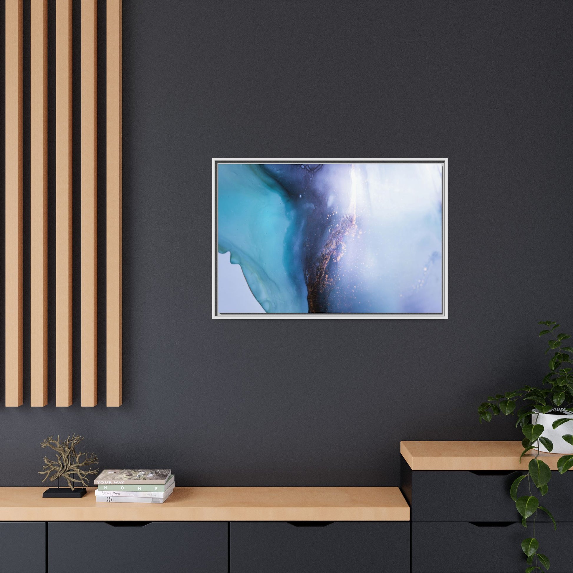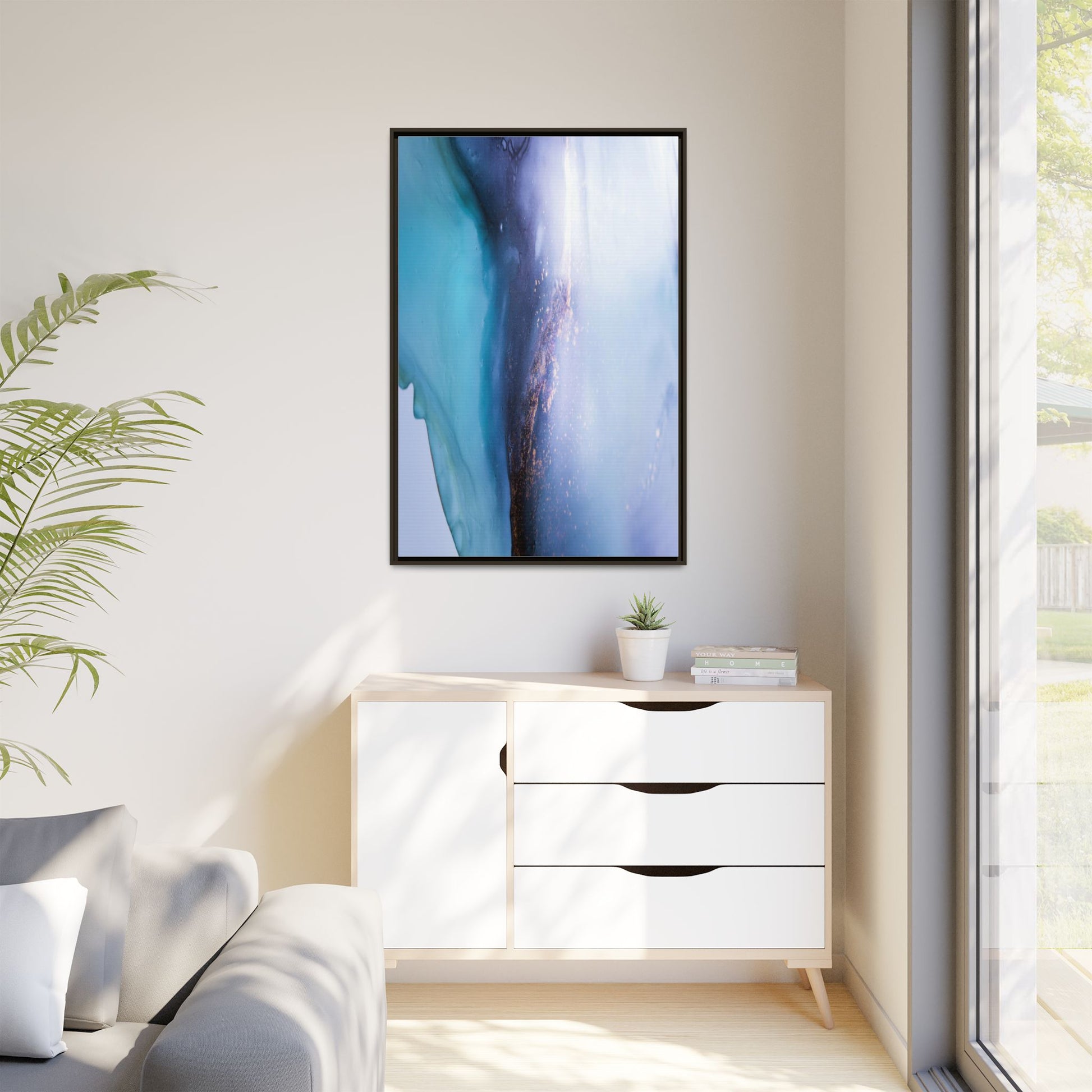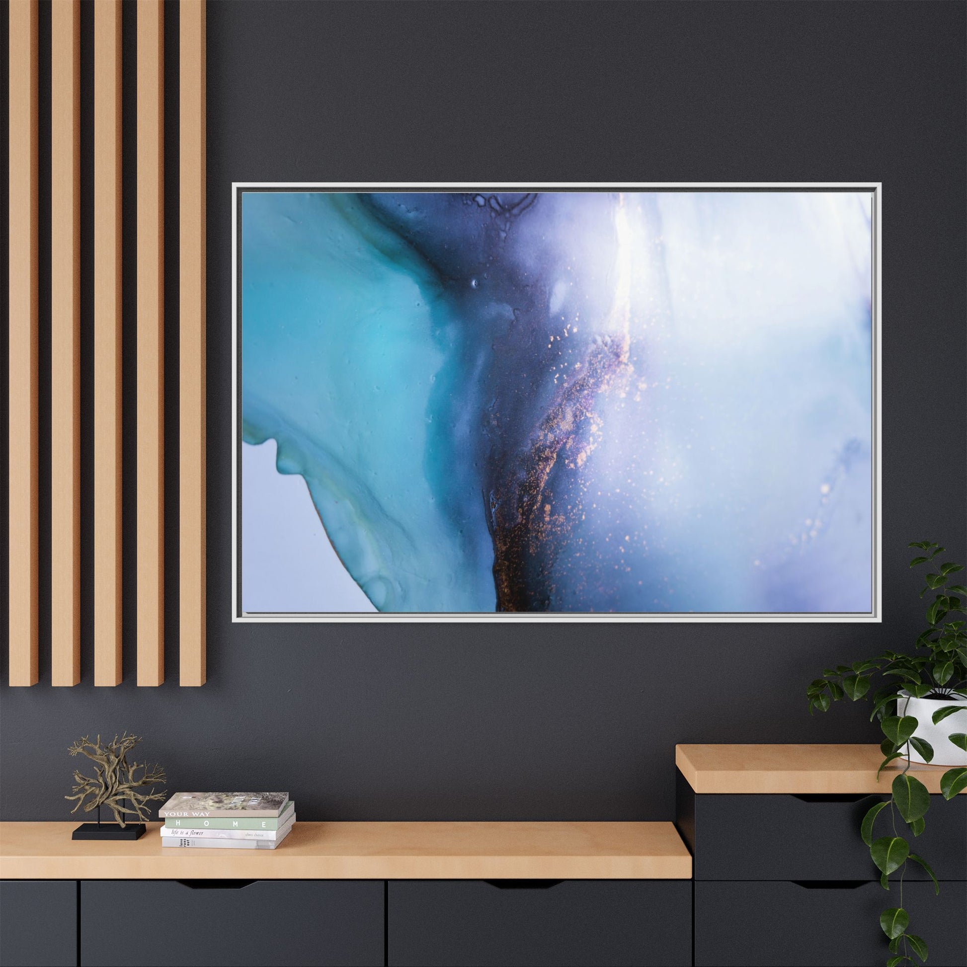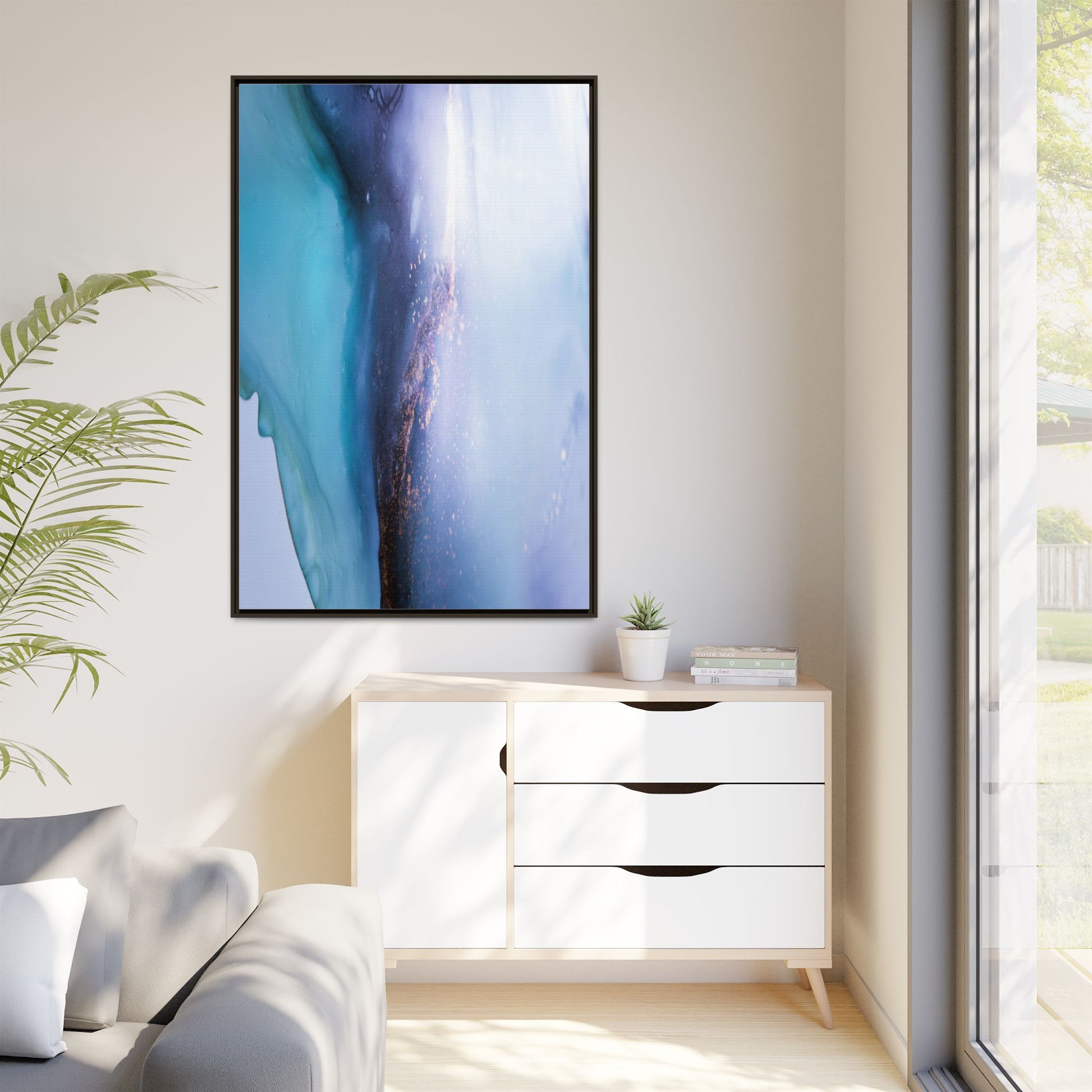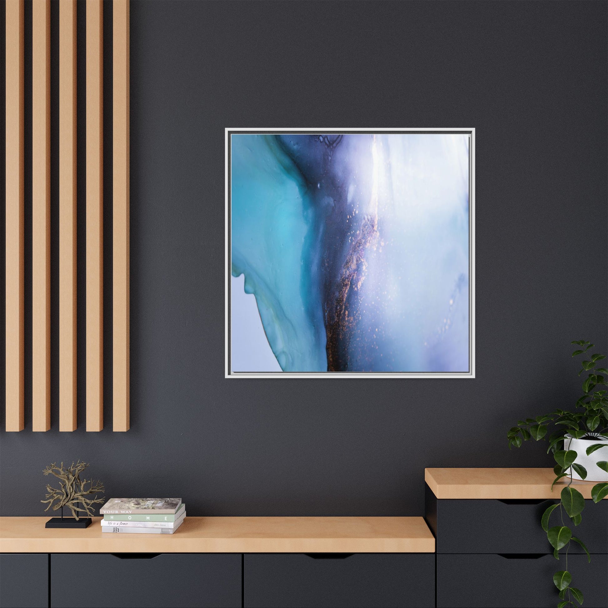 This mesmerizing abstract image captures a stunning liquid landscape of blue and turquoise hues, blending seamlessly with ethereal wisps of soft white and delicate copper-gold speckles. The composition resembles an otherworldly seascape or cosmic vista, with fluid edges that seem to flow and merge organically. Translucent layers create depth and movement, with subtle droplets and textures adding intricate detail to the dreamy visual experience. The color palette evokes a sense of tranquility and mystery, transitioning from cool aquamarine tones to luminous pale blues and warm metallic accents. The image appears to be created using fluid art or alcohol ink techniques, resulting in a breathtaking, almost microscopic view of color and texture.