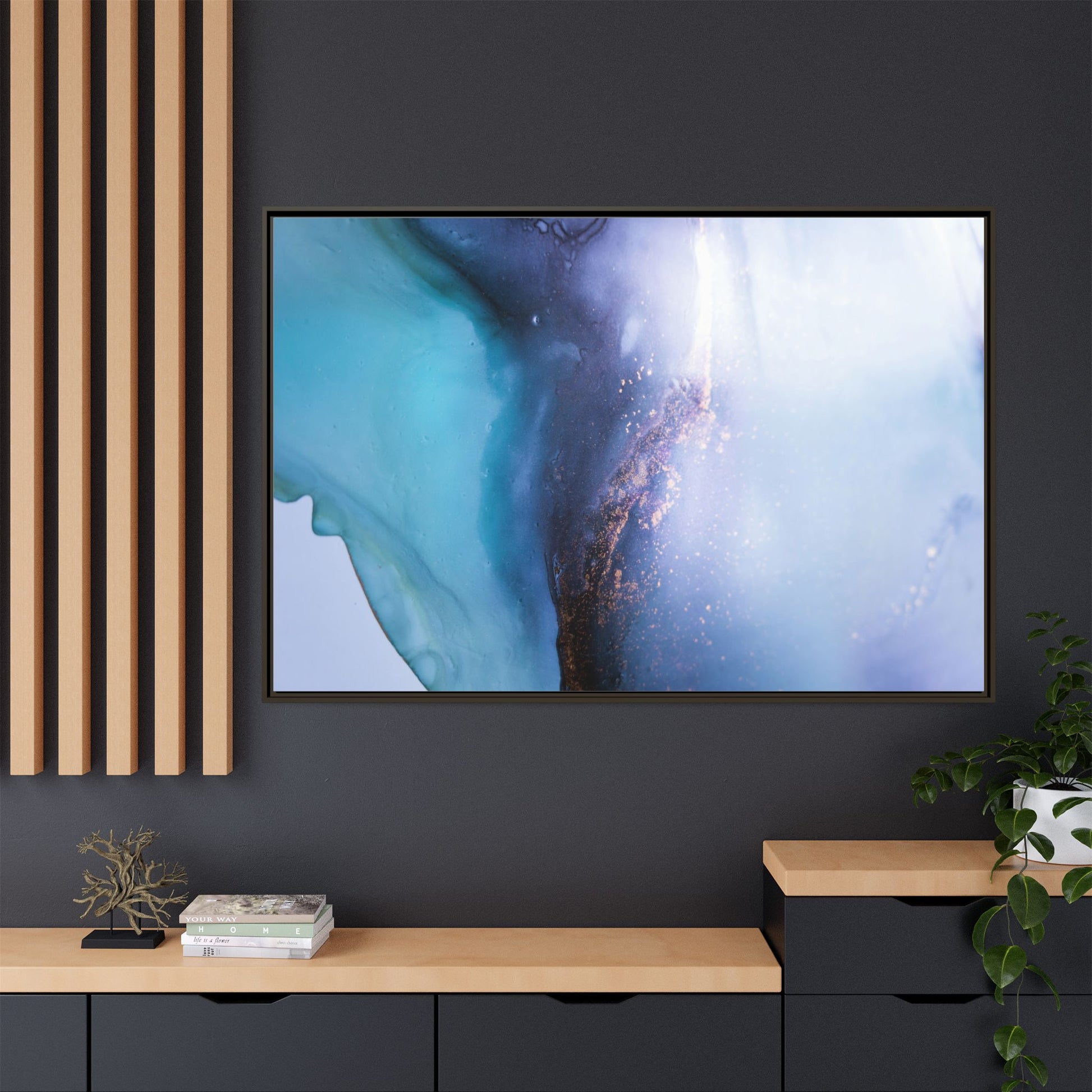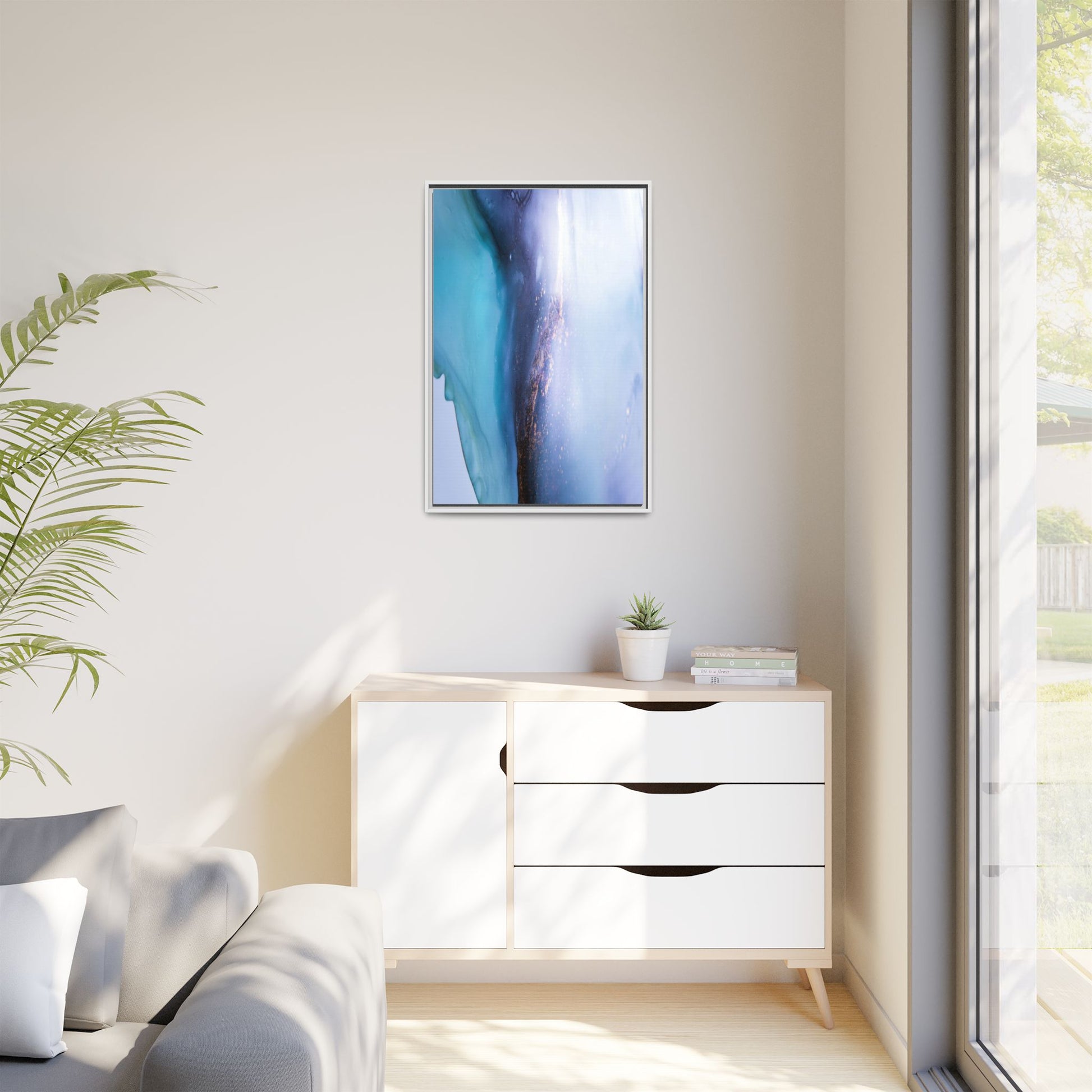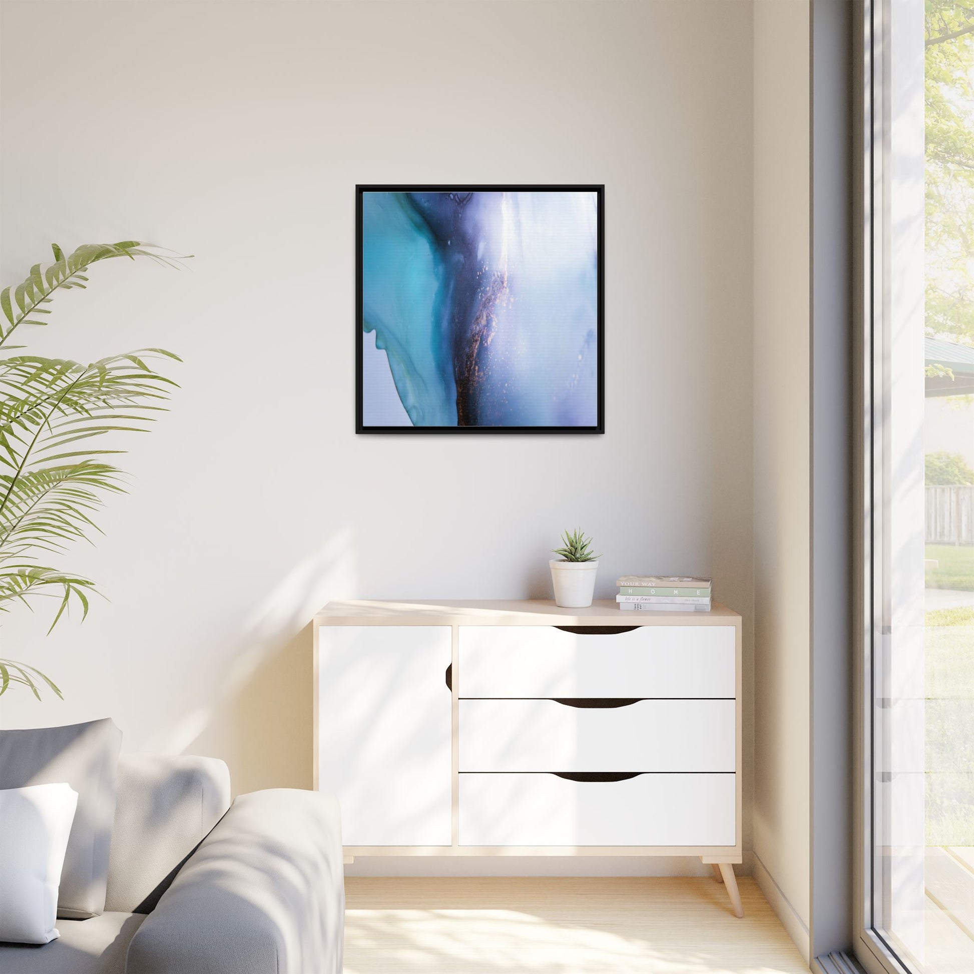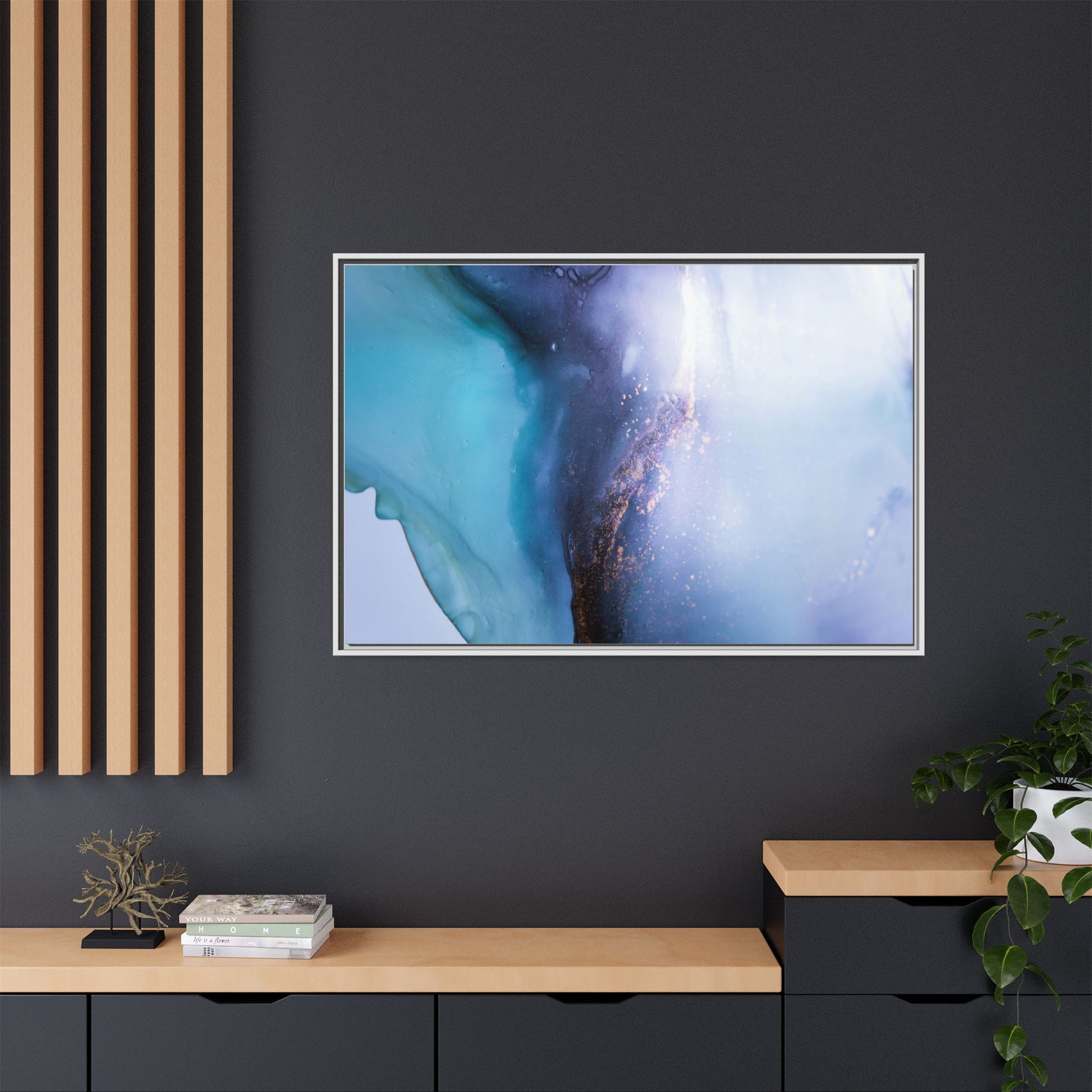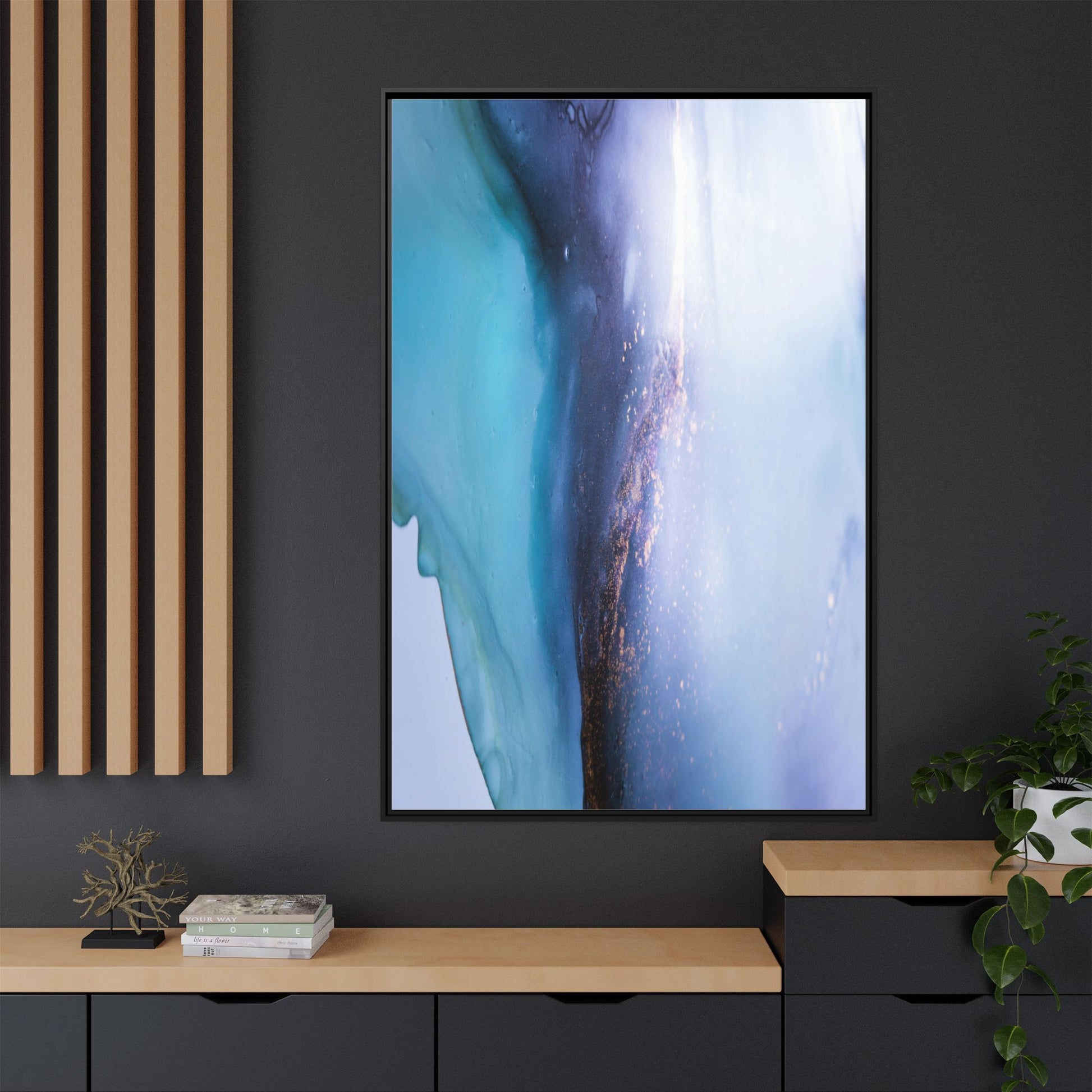 This mesmerizing abstract image captures a stunning liquid landscape of blue and turquoise hues, blending seamlessly with ethereal wisps of soft white and delicate copper-gold speckles. The composition resembles an otherworldly seascape or cosmic vista, with fluid edges that seem to flow and merge organically. Translucent layers create depth and movement, with subtle droplets and textures adding intricate detail to the dreamy visual experience. The color palette evokes a sense of tranquility and mystery, transitioning from cool aquamarine tones to luminous pale blues and warm metallic accents. The image appears to be created using fluid art or alcohol ink techniques, resulting in a breathtaking, almost microscopic view of color and texture.