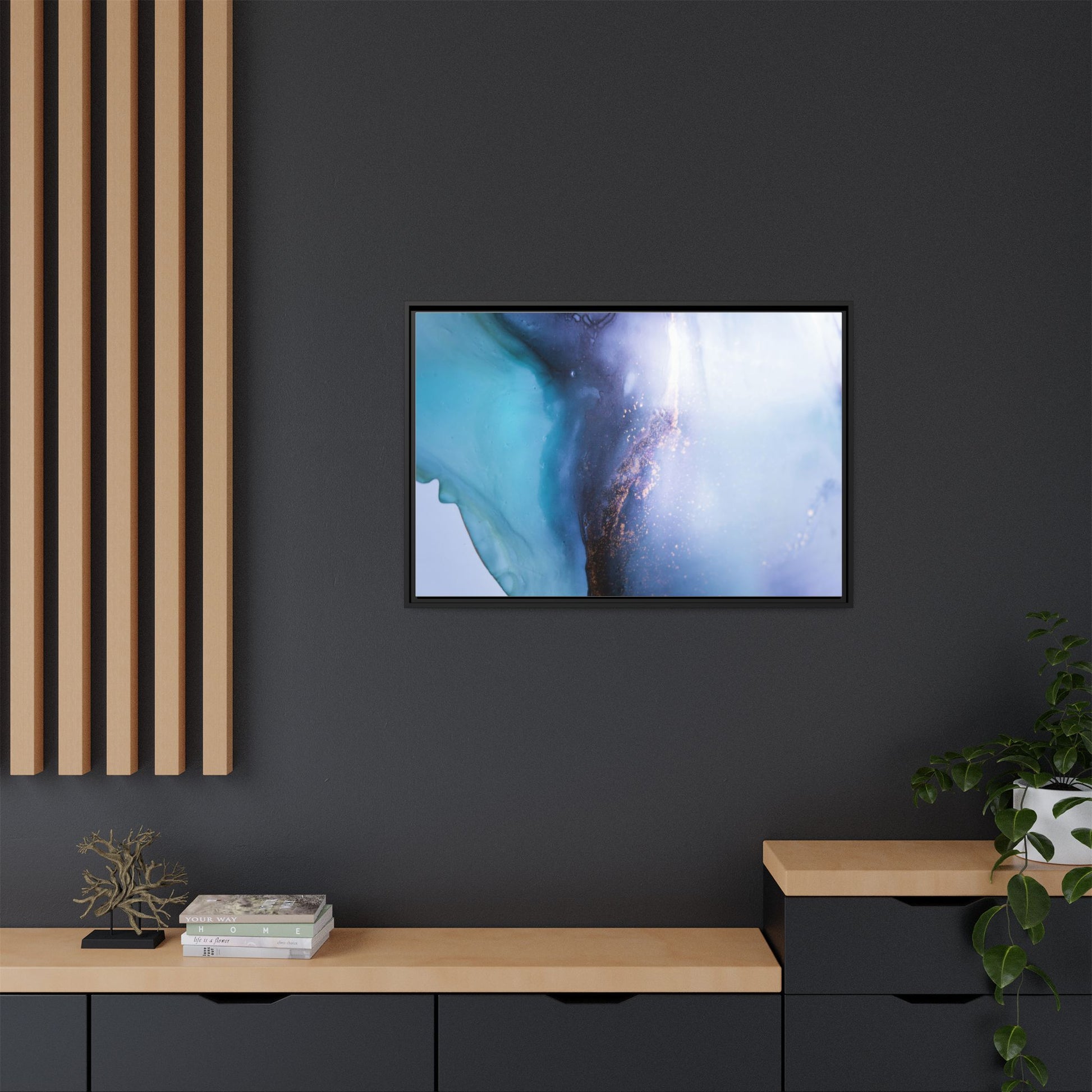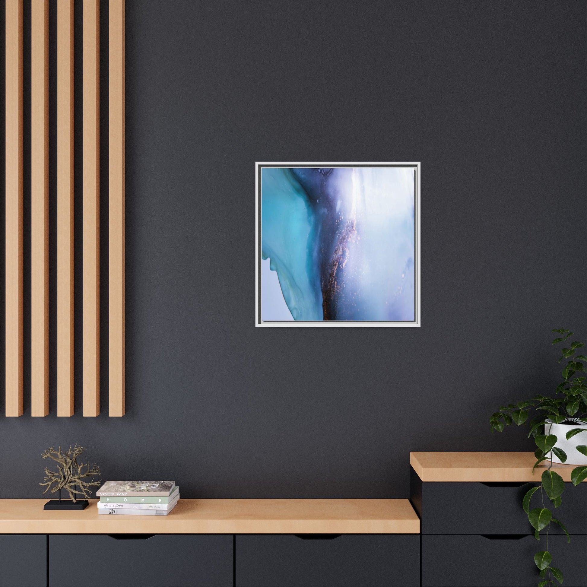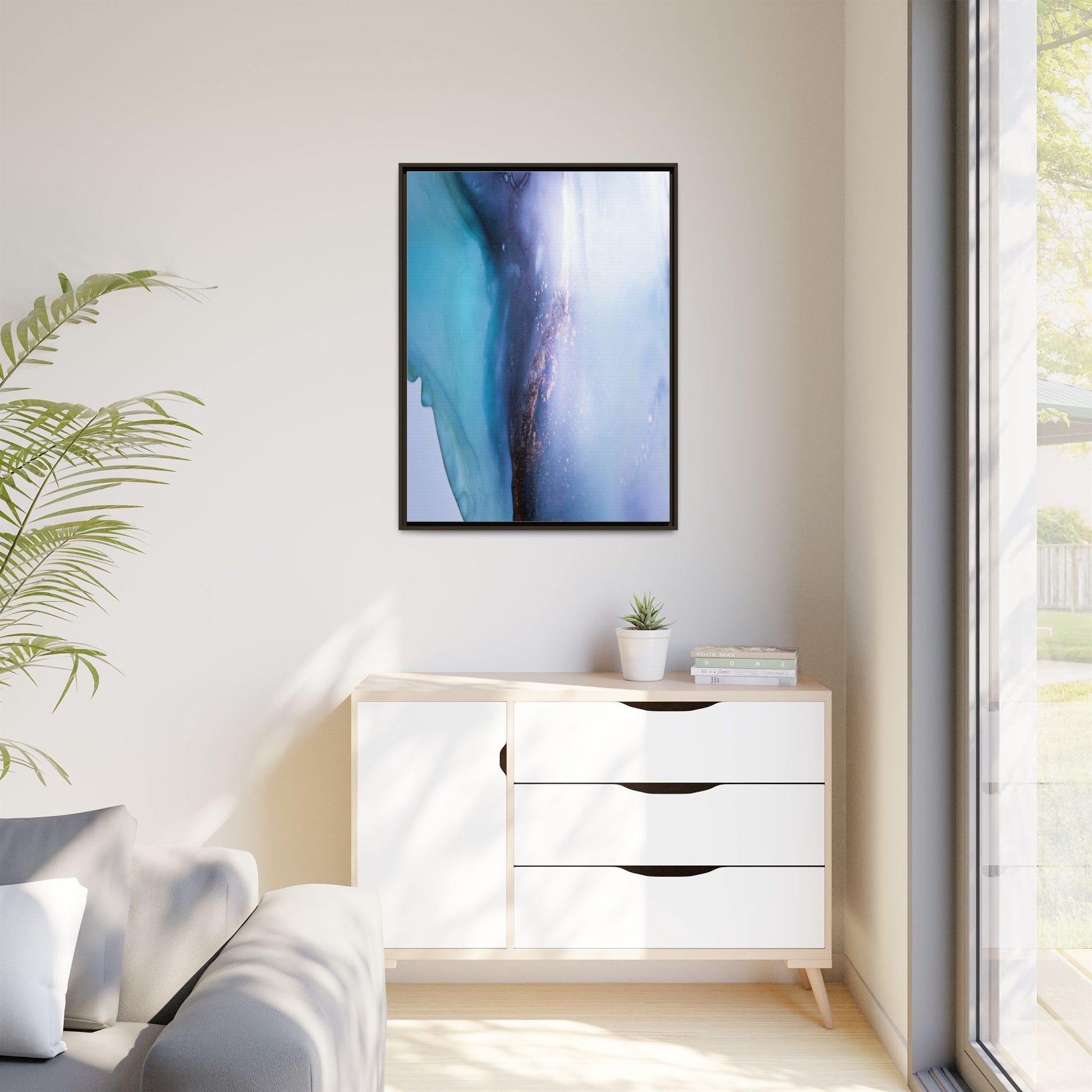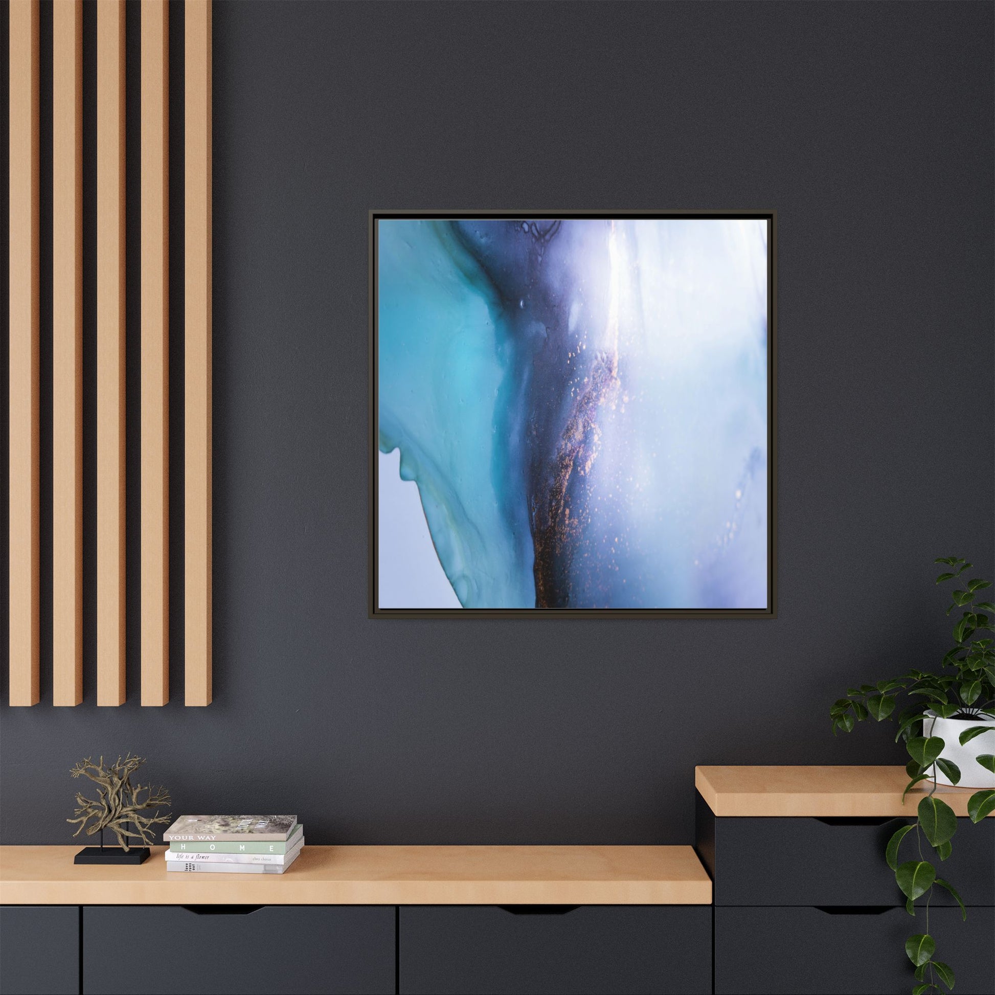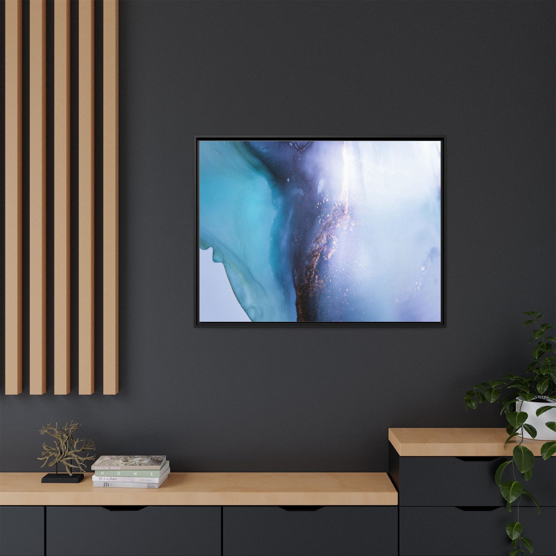 This mesmerizing abstract image captures a stunning liquid landscape of blue and turquoise hues, blending seamlessly with ethereal wisps of soft white and delicate copper-gold speckles. The composition resembles an otherworldly seascape or cosmic vista, with fluid edges that seem to flow and merge organically. Translucent layers create depth and movement, with subtle droplets and textures adding intricate detail to the dreamy visual experience. The color palette evokes a sense of tranquility and mystery, transitioning from cool aquamarine tones to luminous pale blues and warm metallic accents. The image appears to be created using fluid art or alcohol ink techniques, resulting in a breathtaking, almost microscopic view of color and texture.