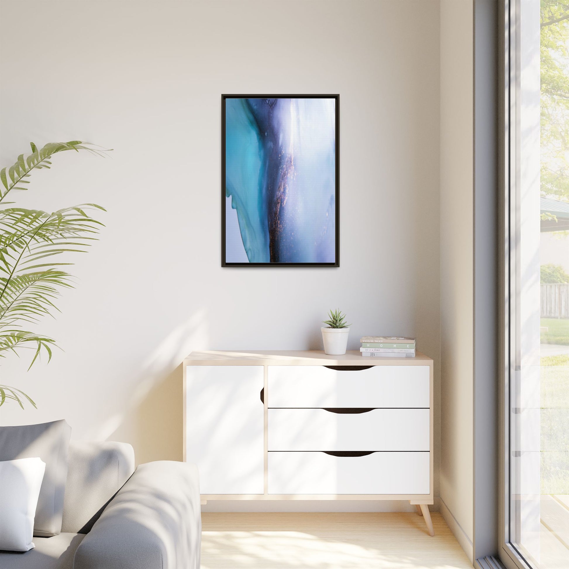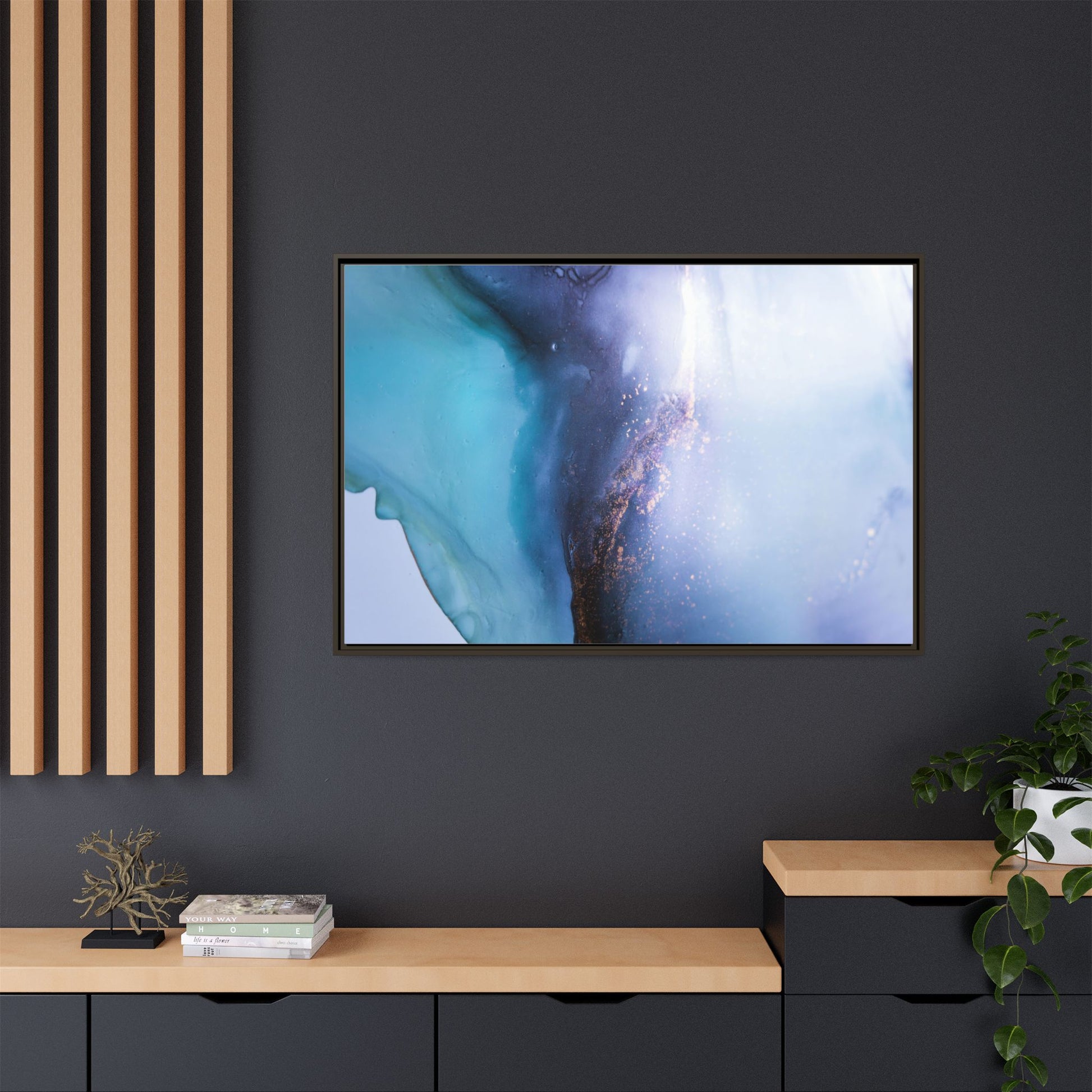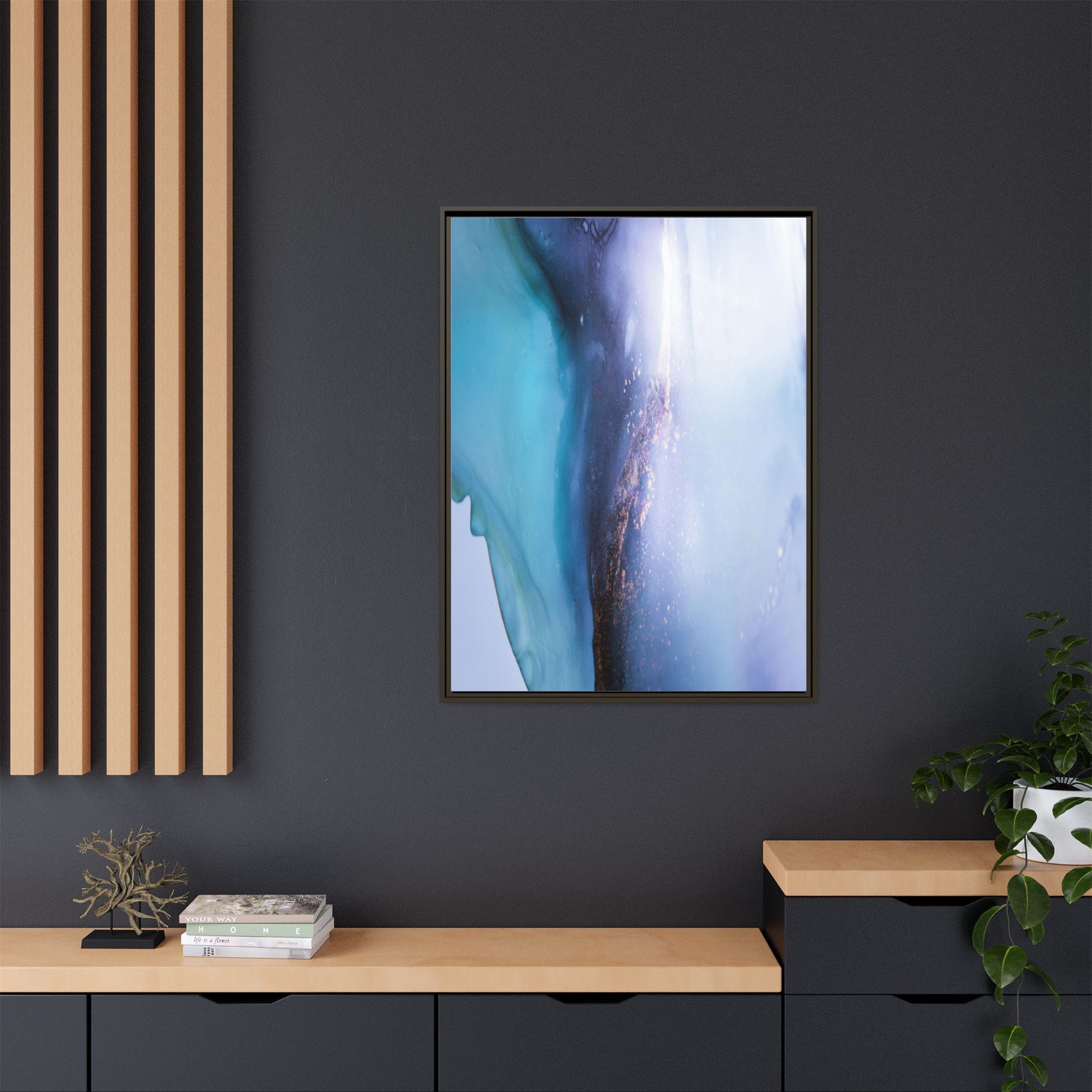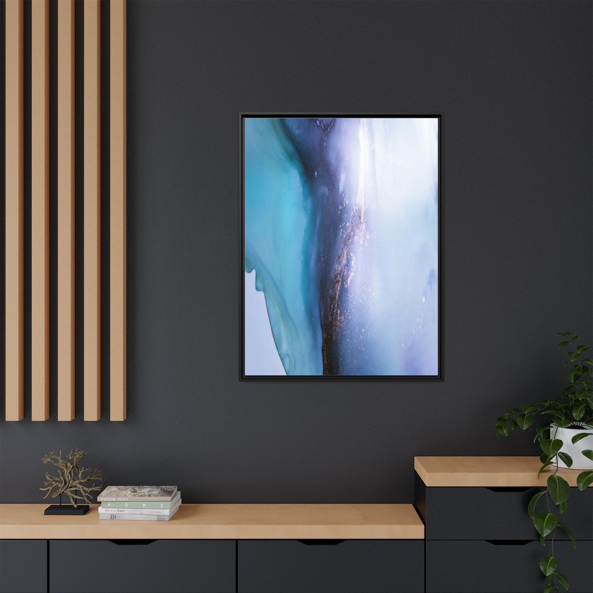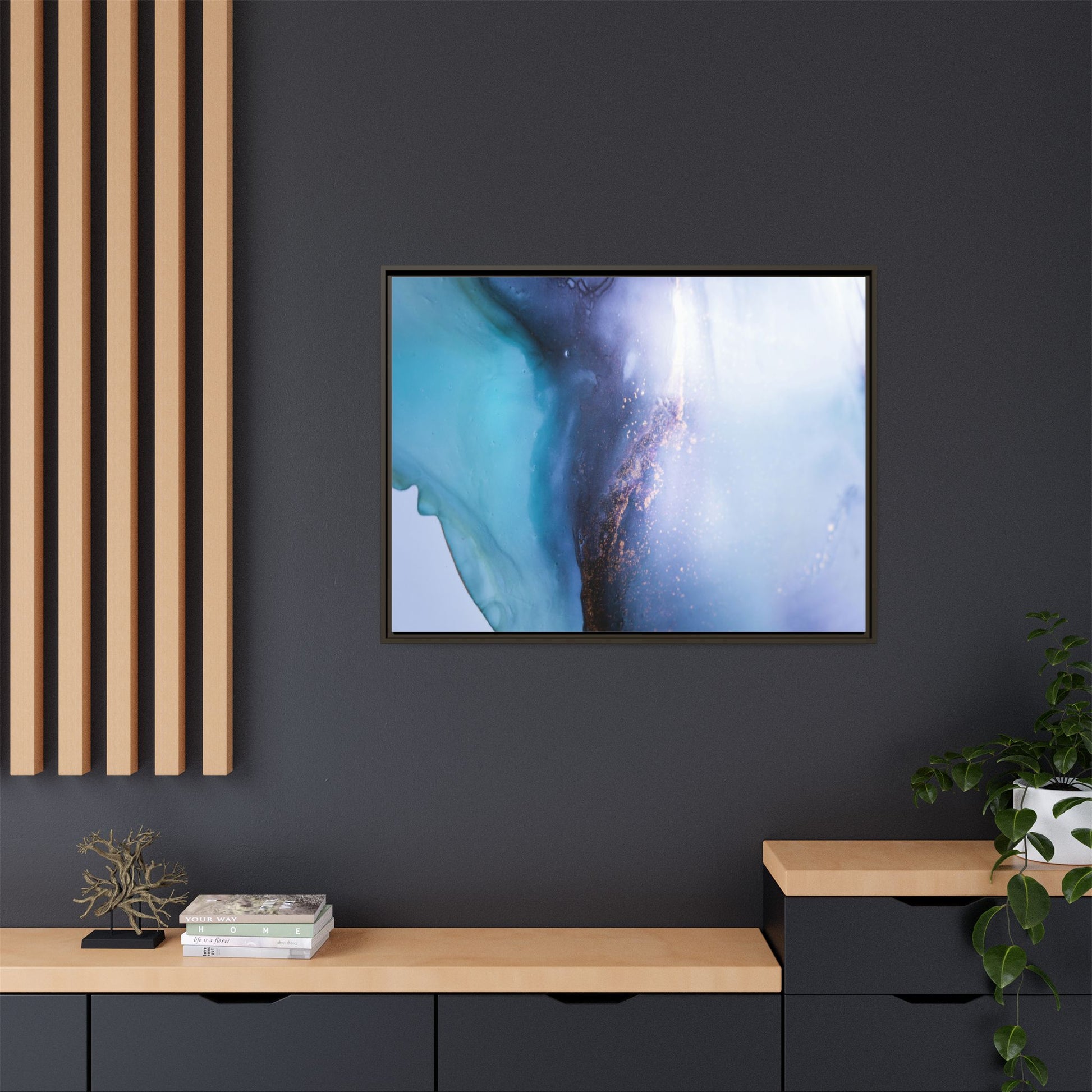 This mesmerizing abstract image captures a stunning liquid landscape of blue and turquoise hues, blending seamlessly with ethereal wisps of soft white and delicate copper-gold speckles. The composition resembles an otherworldly seascape or cosmic vista, with fluid edges that seem to flow and merge organically. Translucent layers create depth and movement, with subtle droplets and textures adding intricate detail to the dreamy visual experience. The color palette evokes a sense of tranquility and mystery, transitioning from cool aquamarine tones to luminous pale blues and warm metallic accents. The image appears to be created using fluid art or alcohol ink techniques, resulting in a breathtaking, almost microscopic view of color and texture.