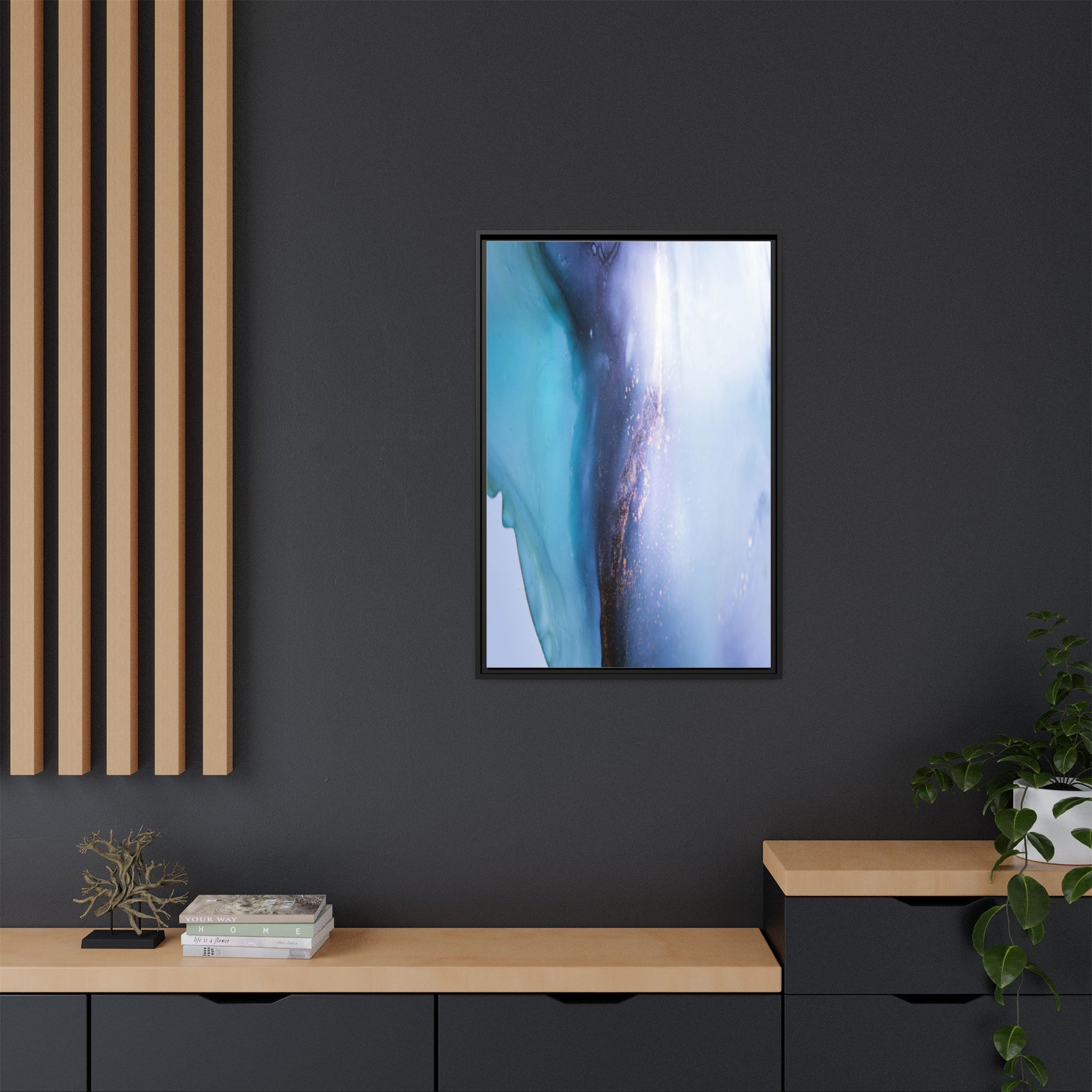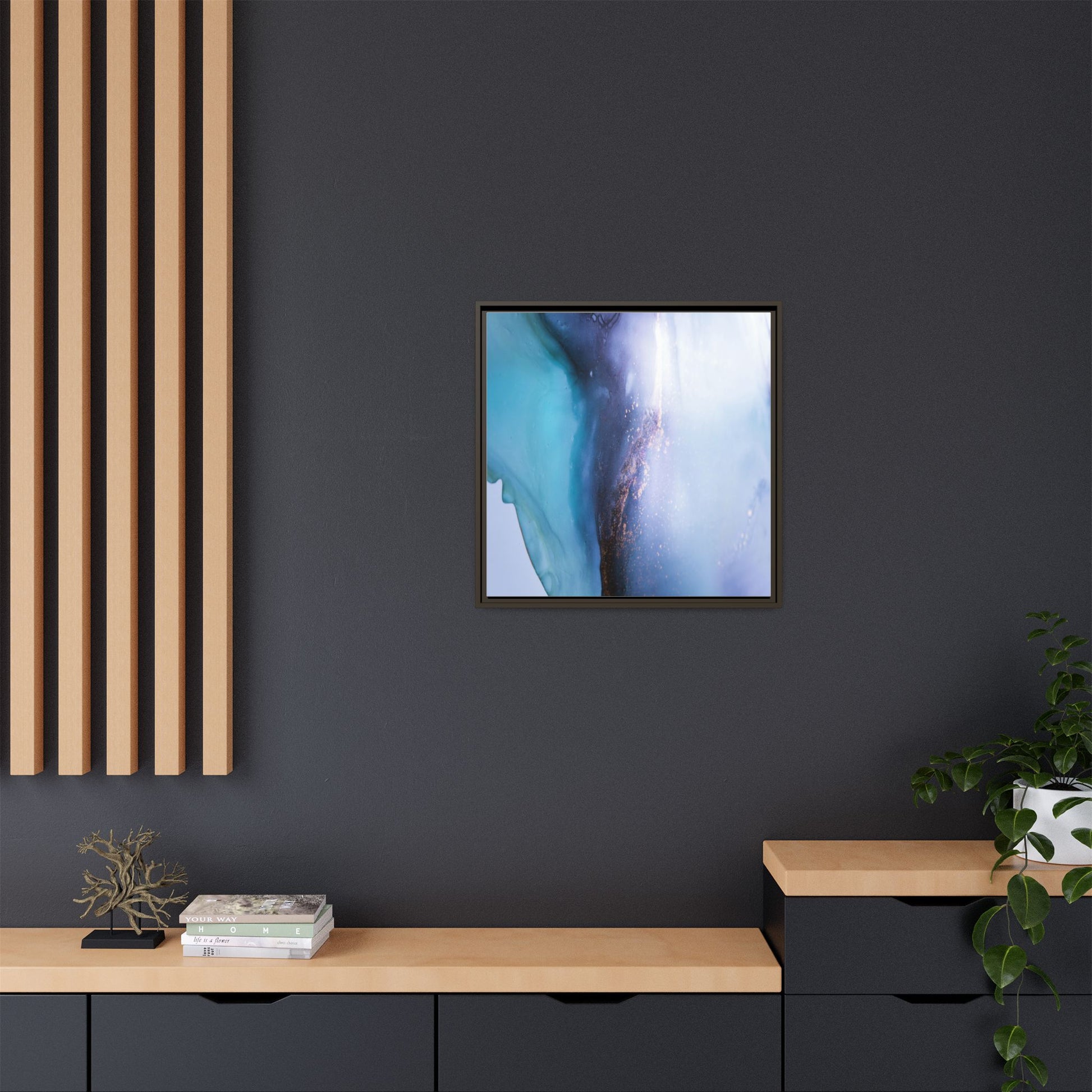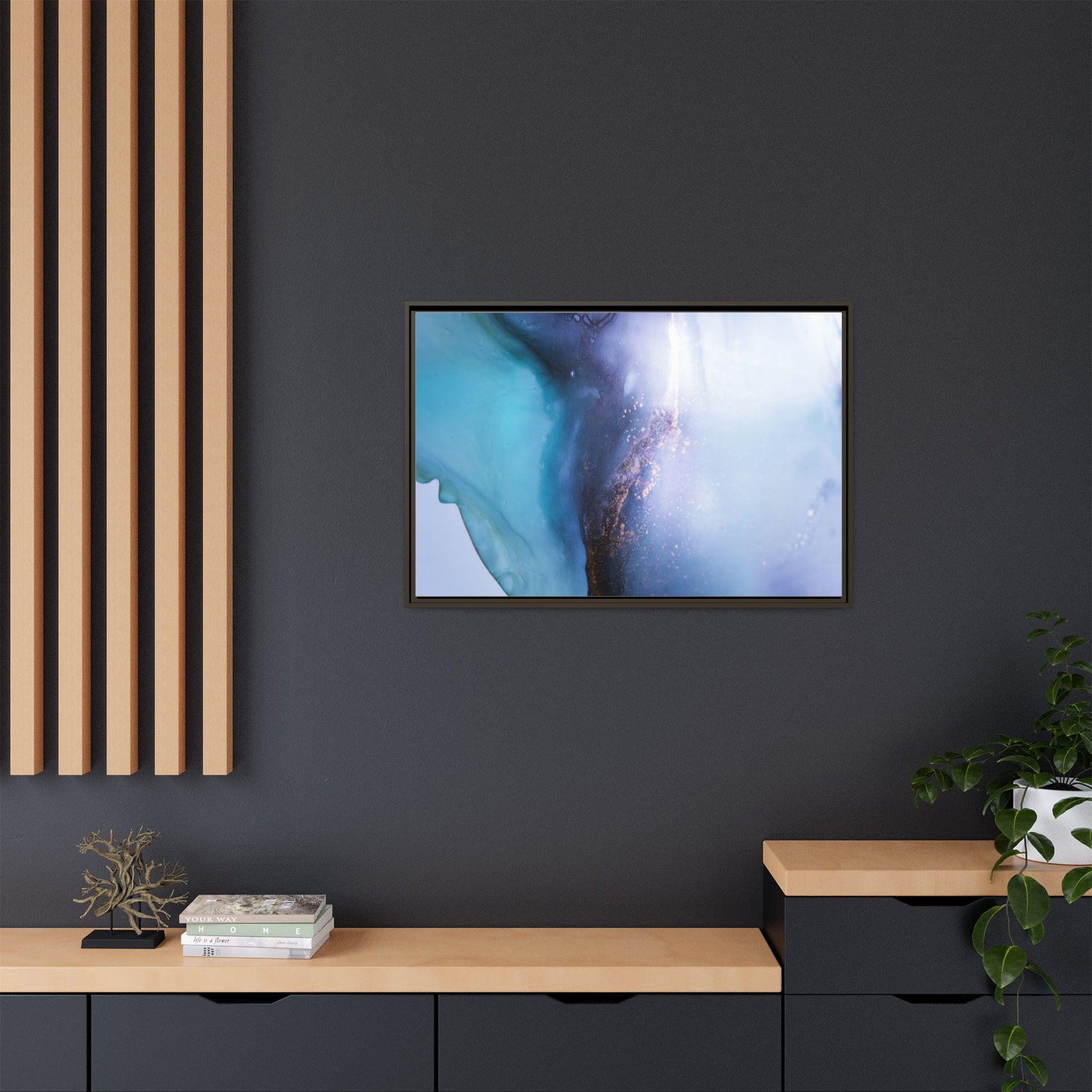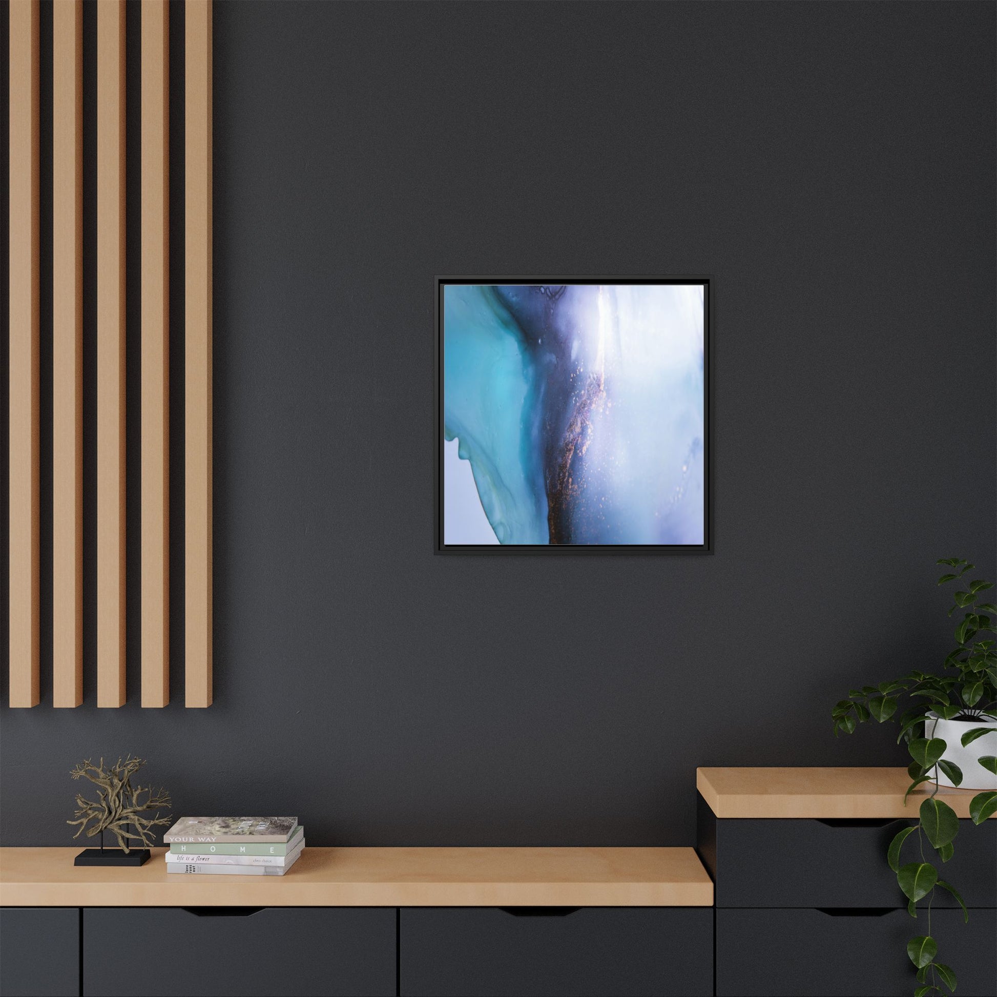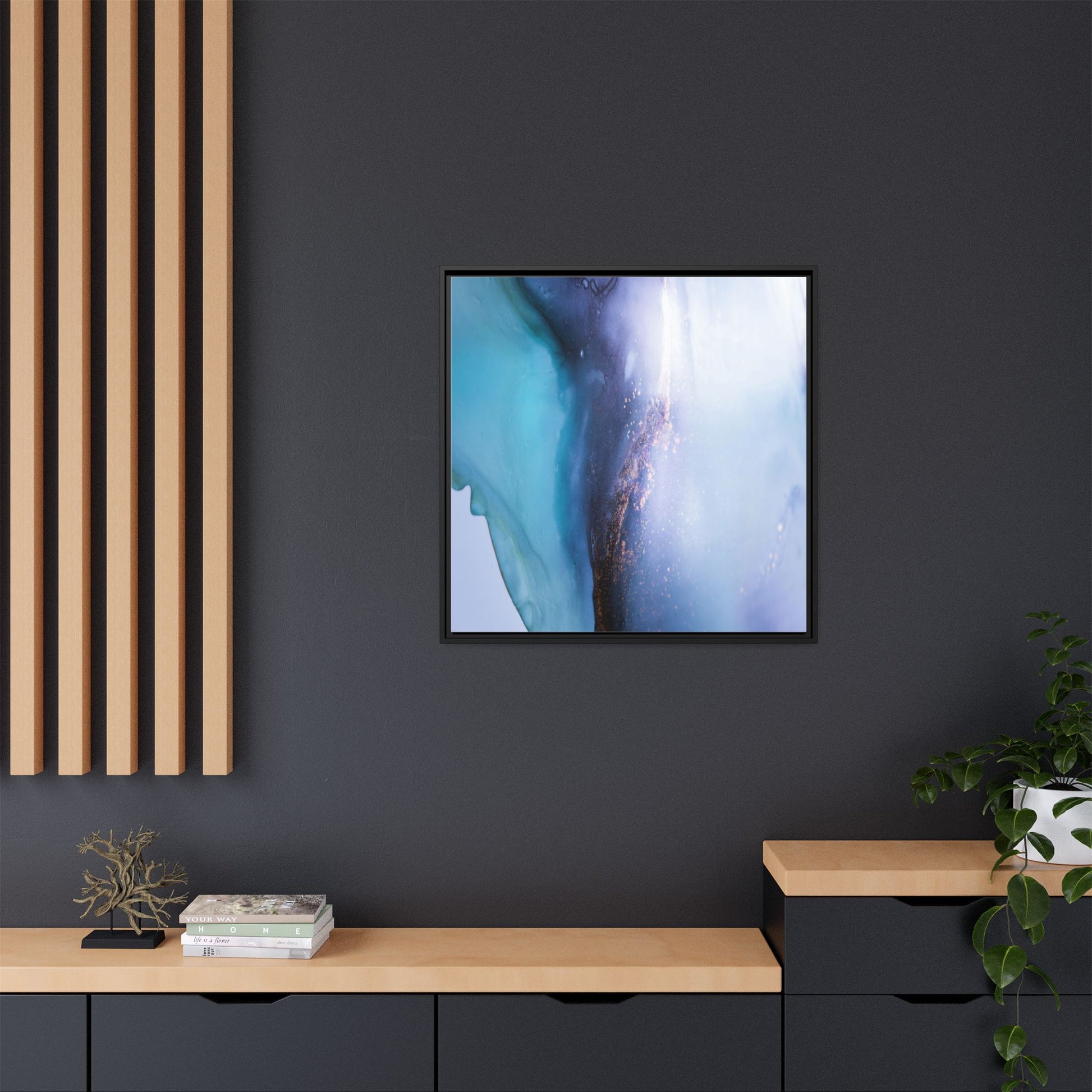 This mesmerizing abstract image captures a stunning liquid landscape of blue and turquoise hues, blending seamlessly with ethereal wisps of soft white and delicate copper-gold speckles. The composition resembles an otherworldly seascape or cosmic vista, with fluid edges that seem to flow and merge organically. Translucent layers create depth and movement, with subtle droplets and textures adding intricate detail to the dreamy visual experience. The color palette evokes a sense of tranquility and mystery, transitioning from cool aquamarine tones to luminous pale blues and warm metallic accents. The image appears to be created using fluid art or alcohol ink techniques, resulting in a breathtaking, almost microscopic view of color and texture.