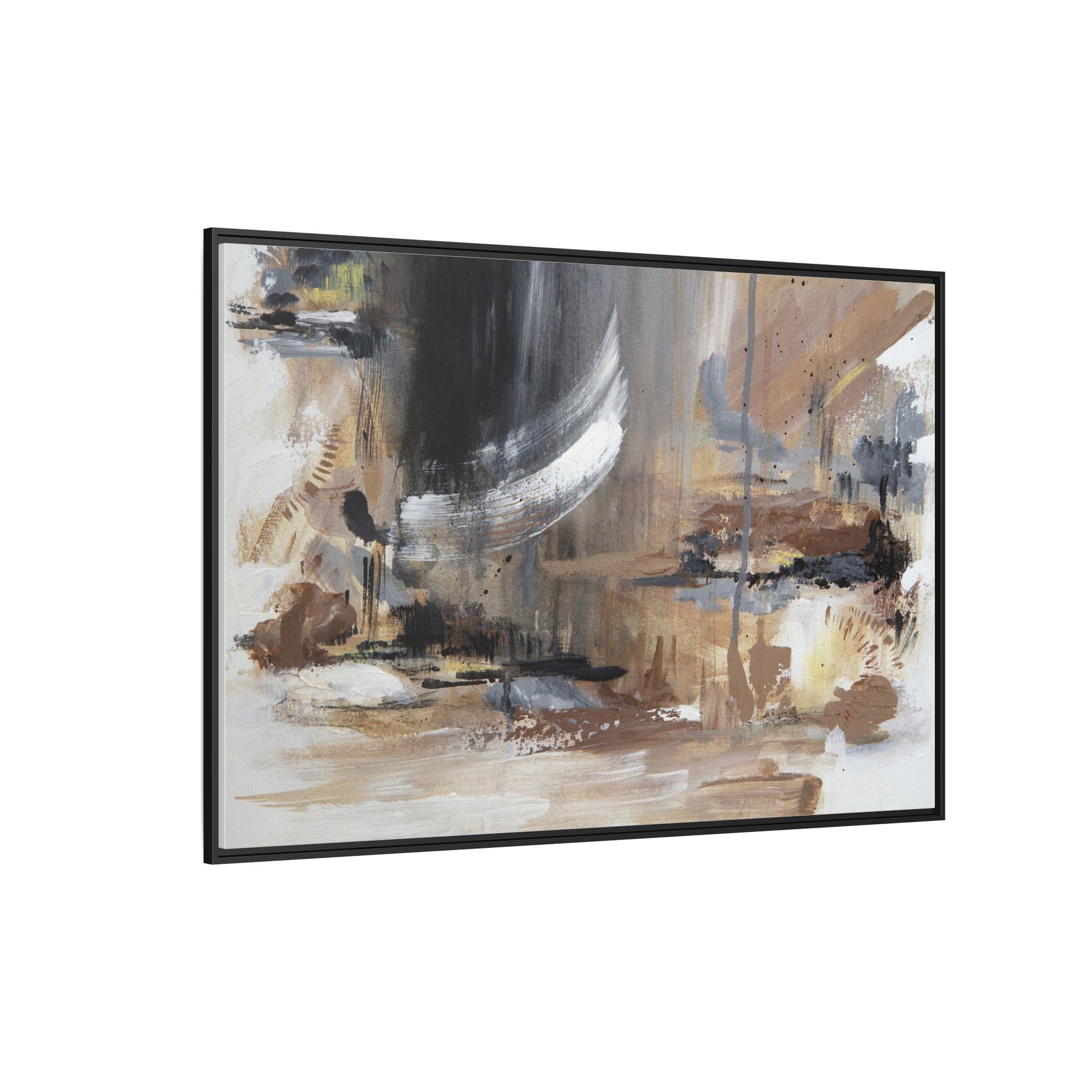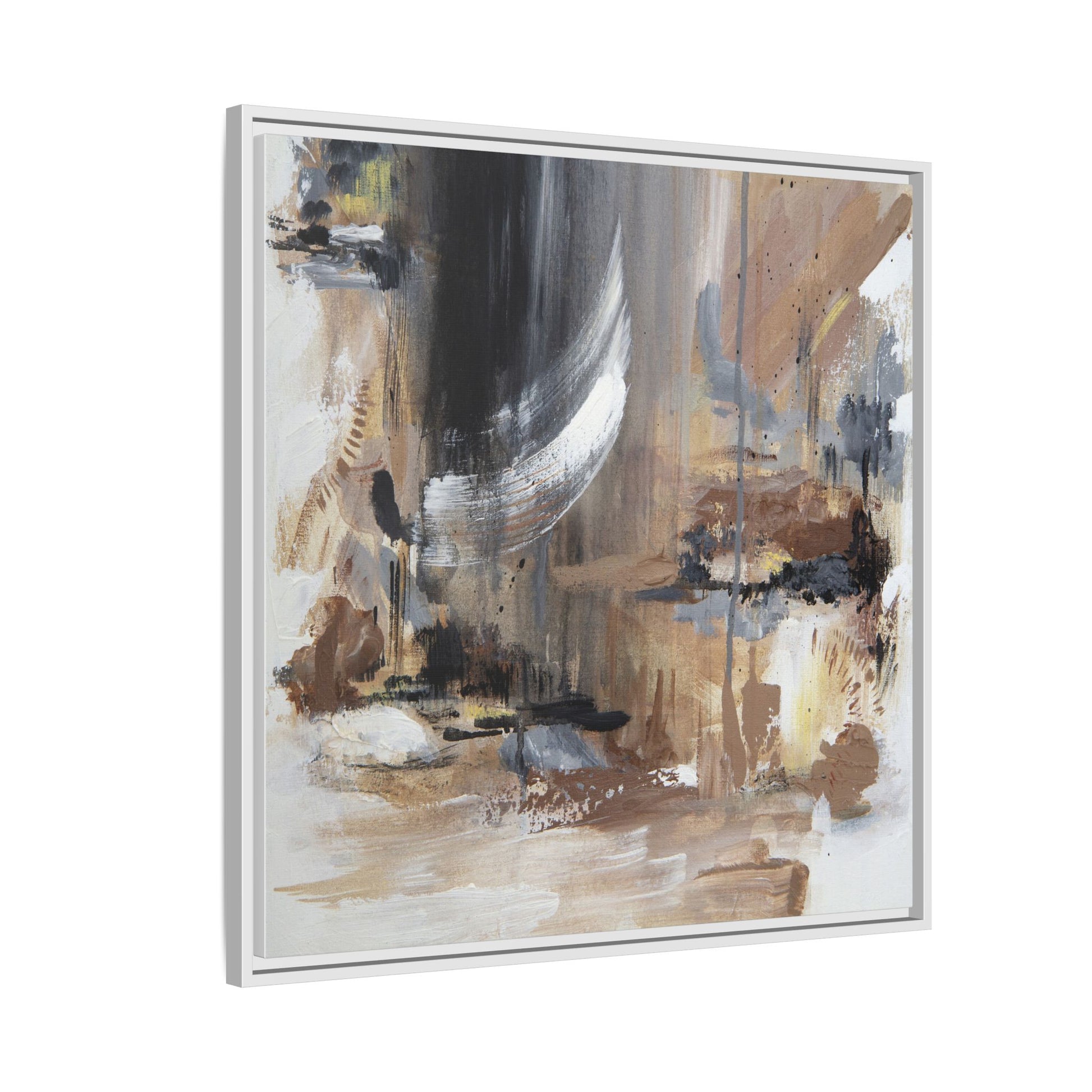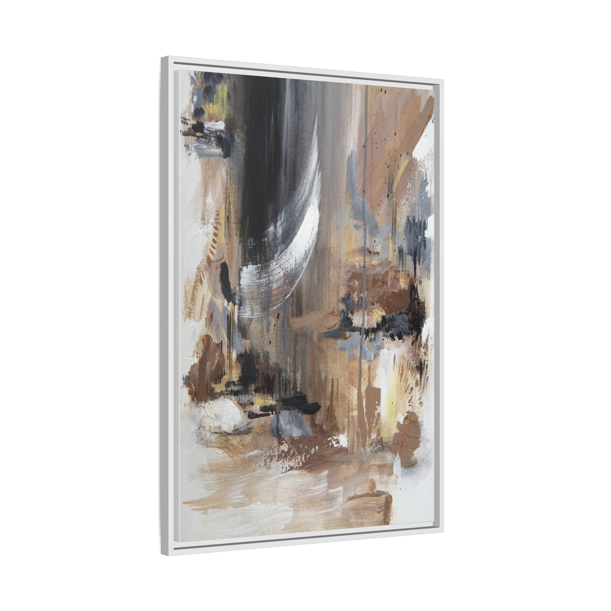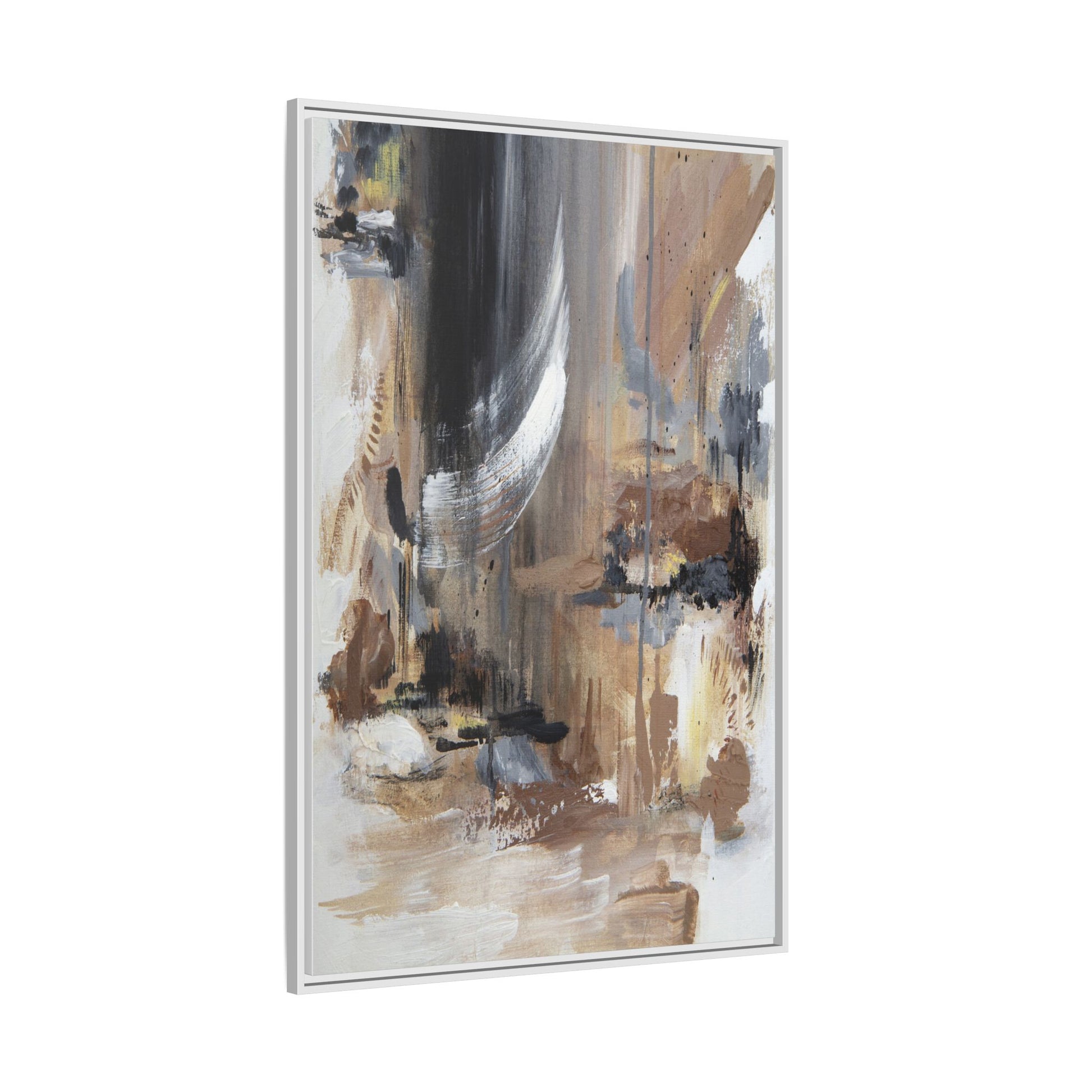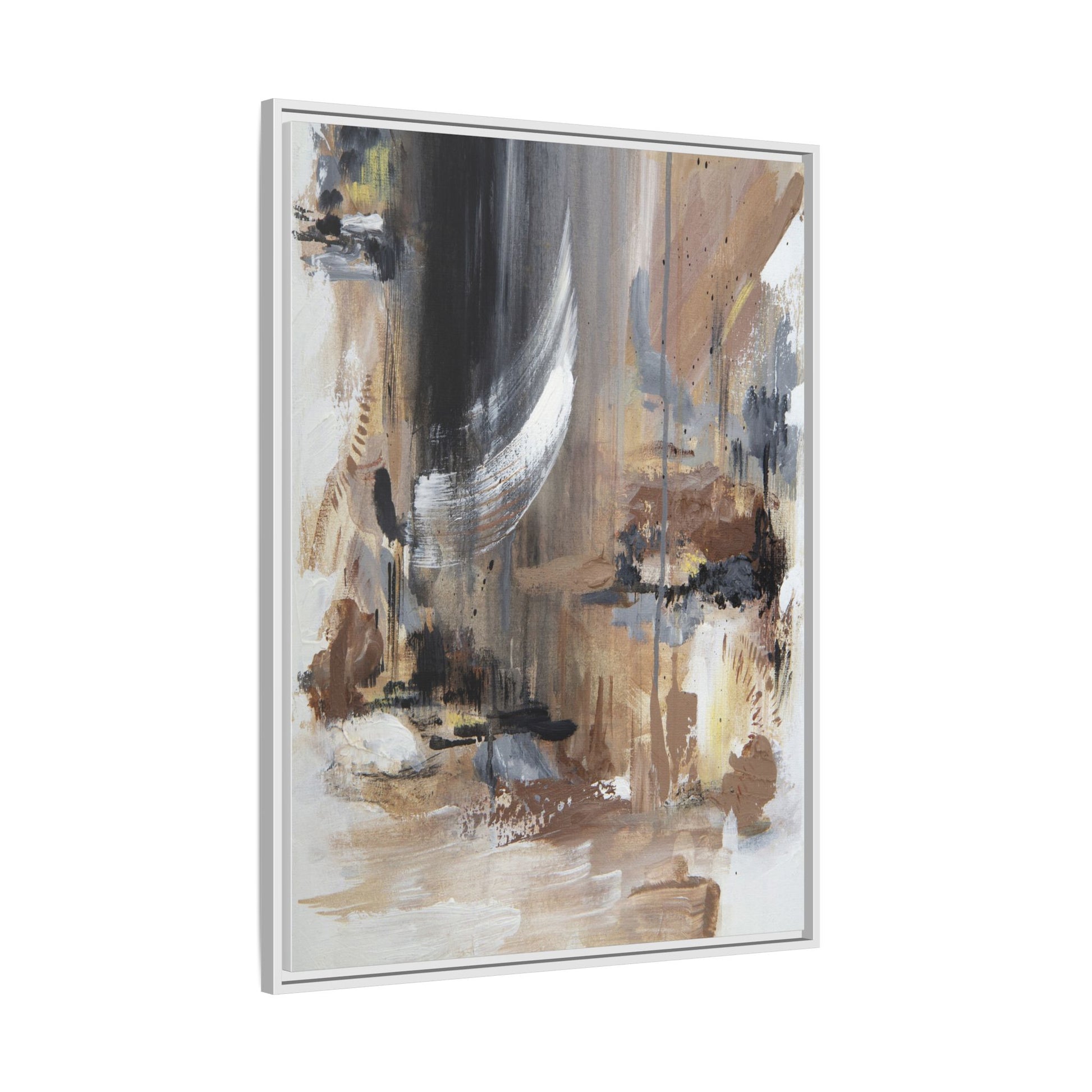 This captivating abstract painting features a dynamic composition of muted earth tones and grayscale colors, blending organic shapes and fluid brushstrokes. A prominent white wing-like form emerges from a dark, swirling background, creating a sense of movement and ethereal energy. The artwork employs a mixed media technique with layers of paint that create depth, texture, and subtle variations in tone, ranging from soft beiges and browns to stark blacks and whites. Drips, splatters, and gestural marks contribute to the painting's emotional and spontaneous feel, suggesting a landscape or dreamscape that exists between representation and abstraction. The overall effect is contemplative and atmospheric, inviting viewers to interpret the image through their own emotional and visual lens.