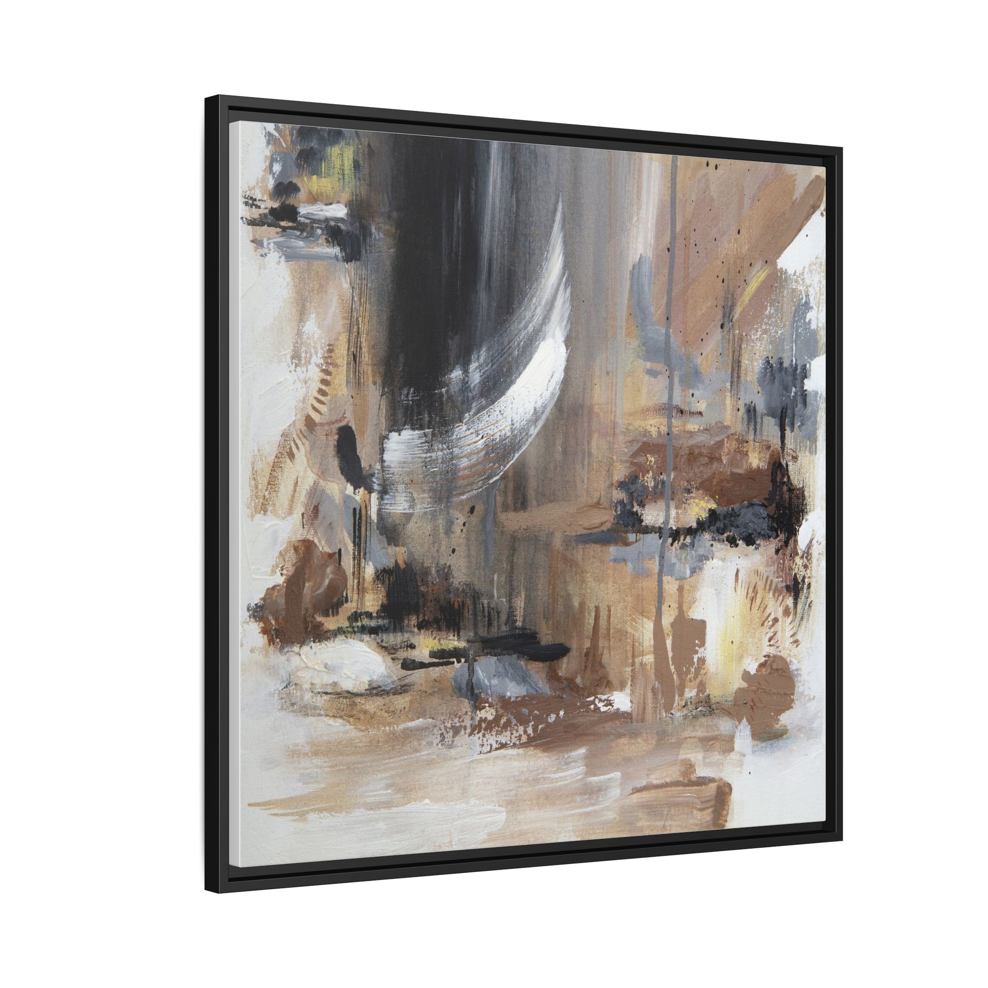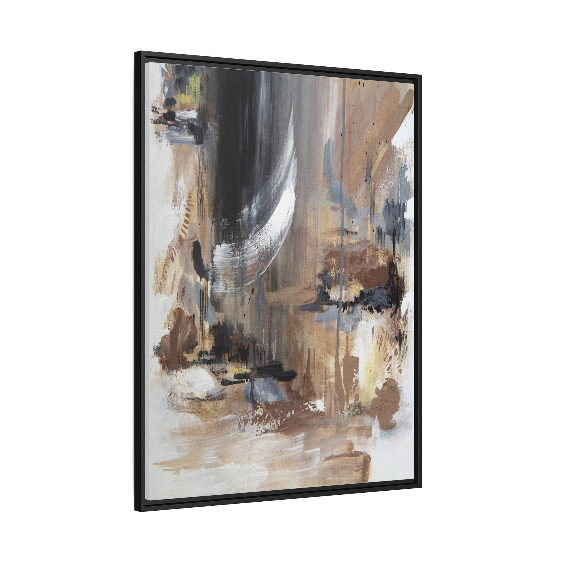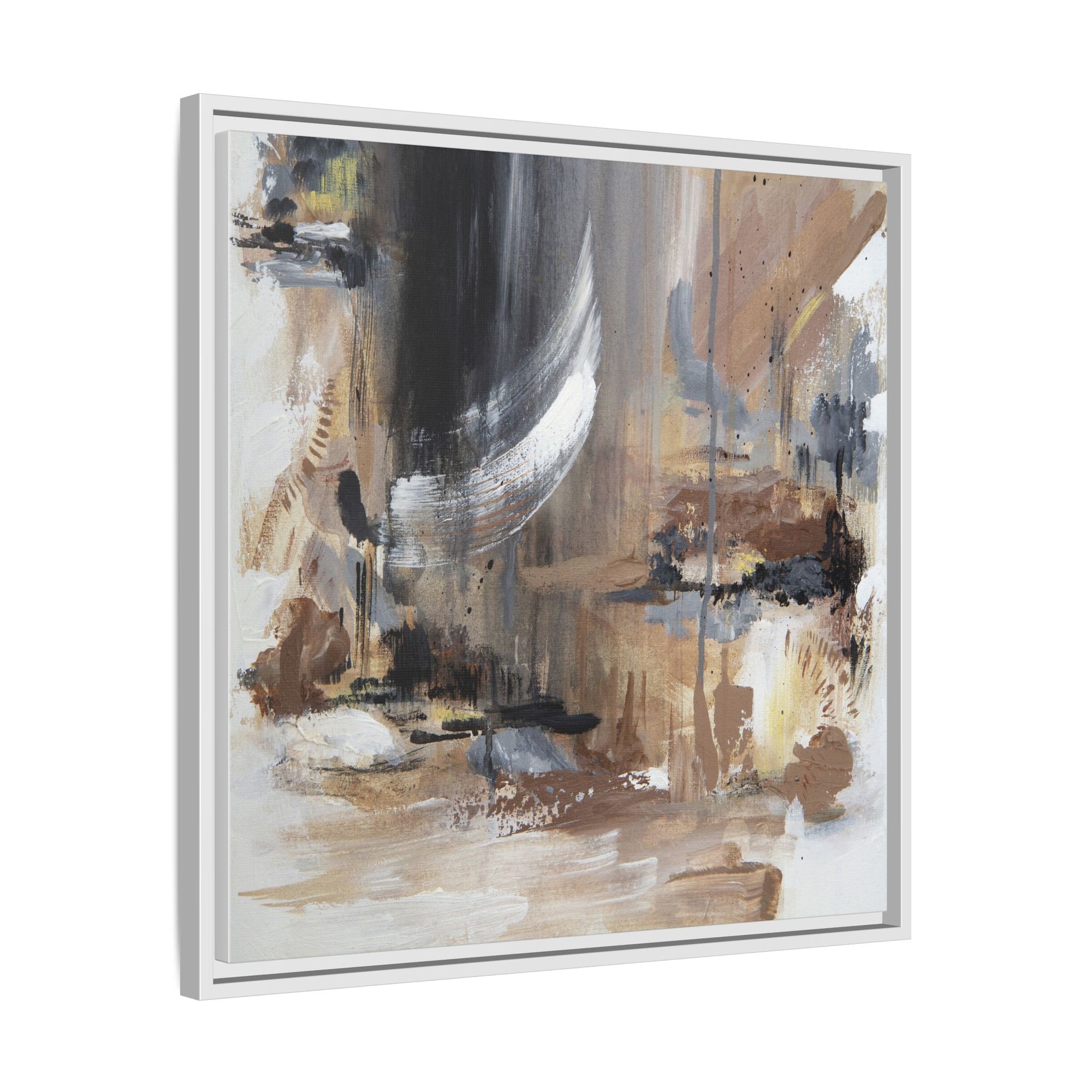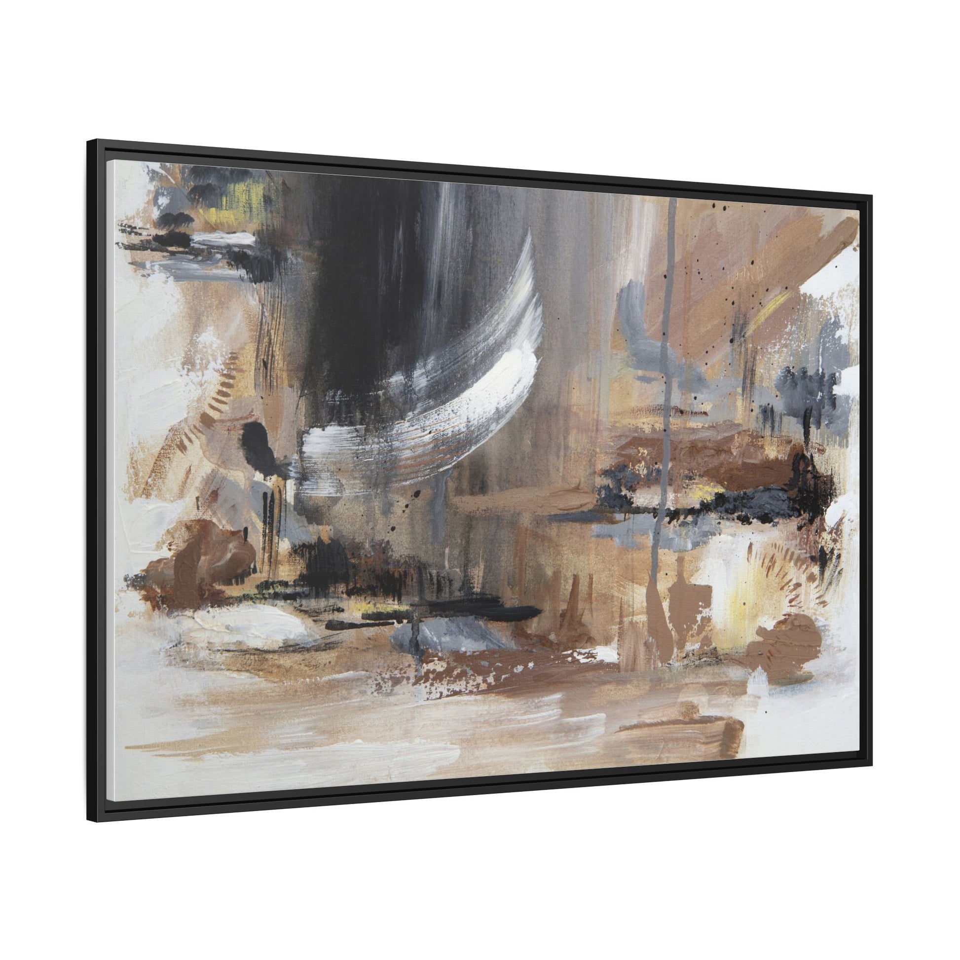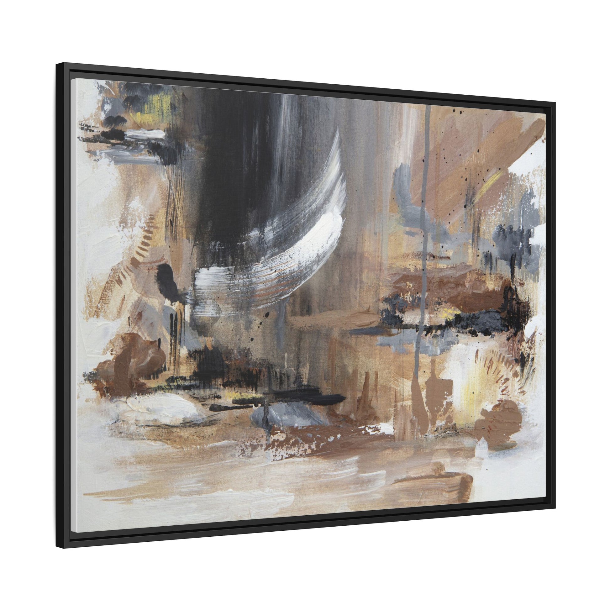 This captivating abstract painting features a dynamic composition of muted earth tones and grayscale colors, blending organic shapes and fluid brushstrokes. A prominent white wing-like form emerges from a dark, swirling background, creating a sense of movement and ethereal energy. The artwork employs a mixed media technique with layers of paint that create depth, texture, and subtle variations in tone, ranging from soft beiges and browns to stark blacks and whites. Drips, splatters, and gestural marks contribute to the painting's emotional and spontaneous feel, suggesting a landscape or dreamscape that exists between representation and abstraction. The overall effect is contemplative and atmospheric, inviting viewers to interpret the image through their own emotional and visual lens.