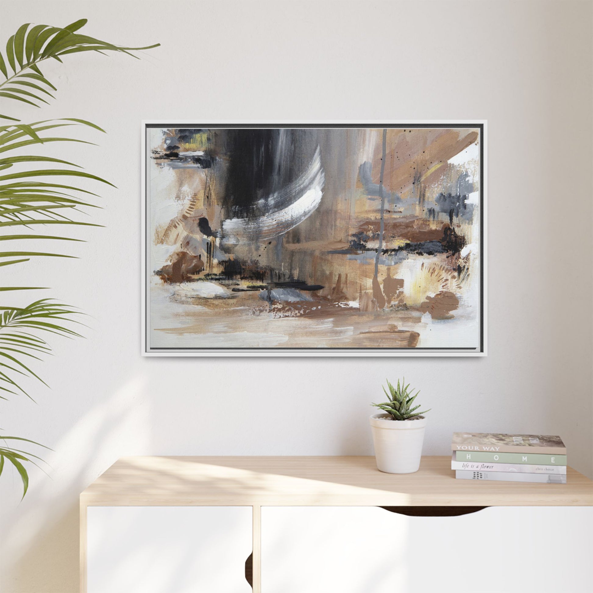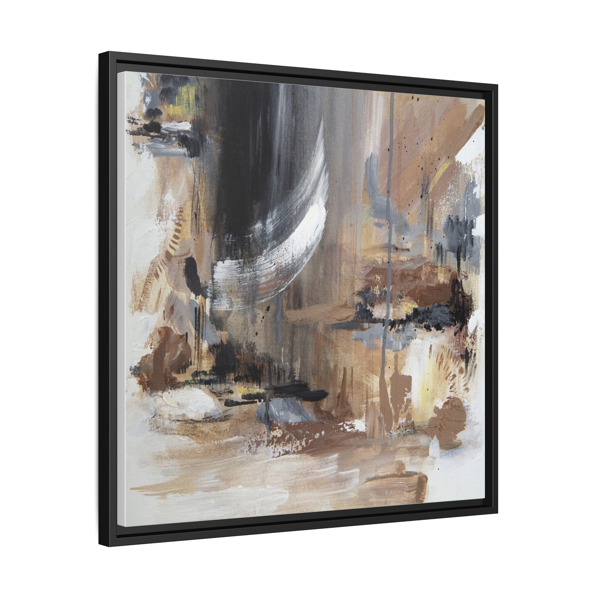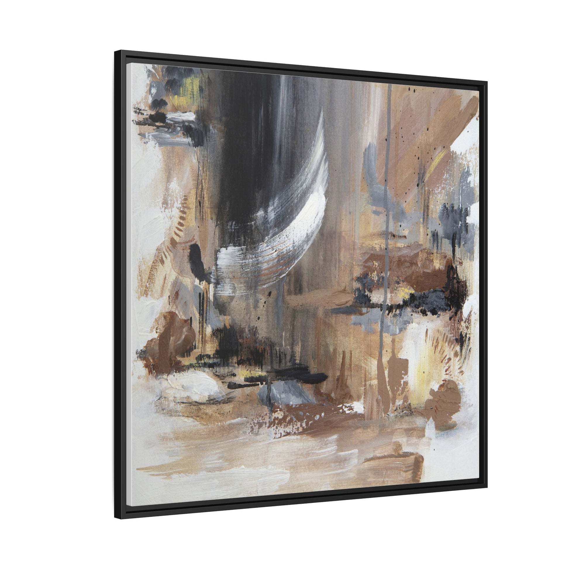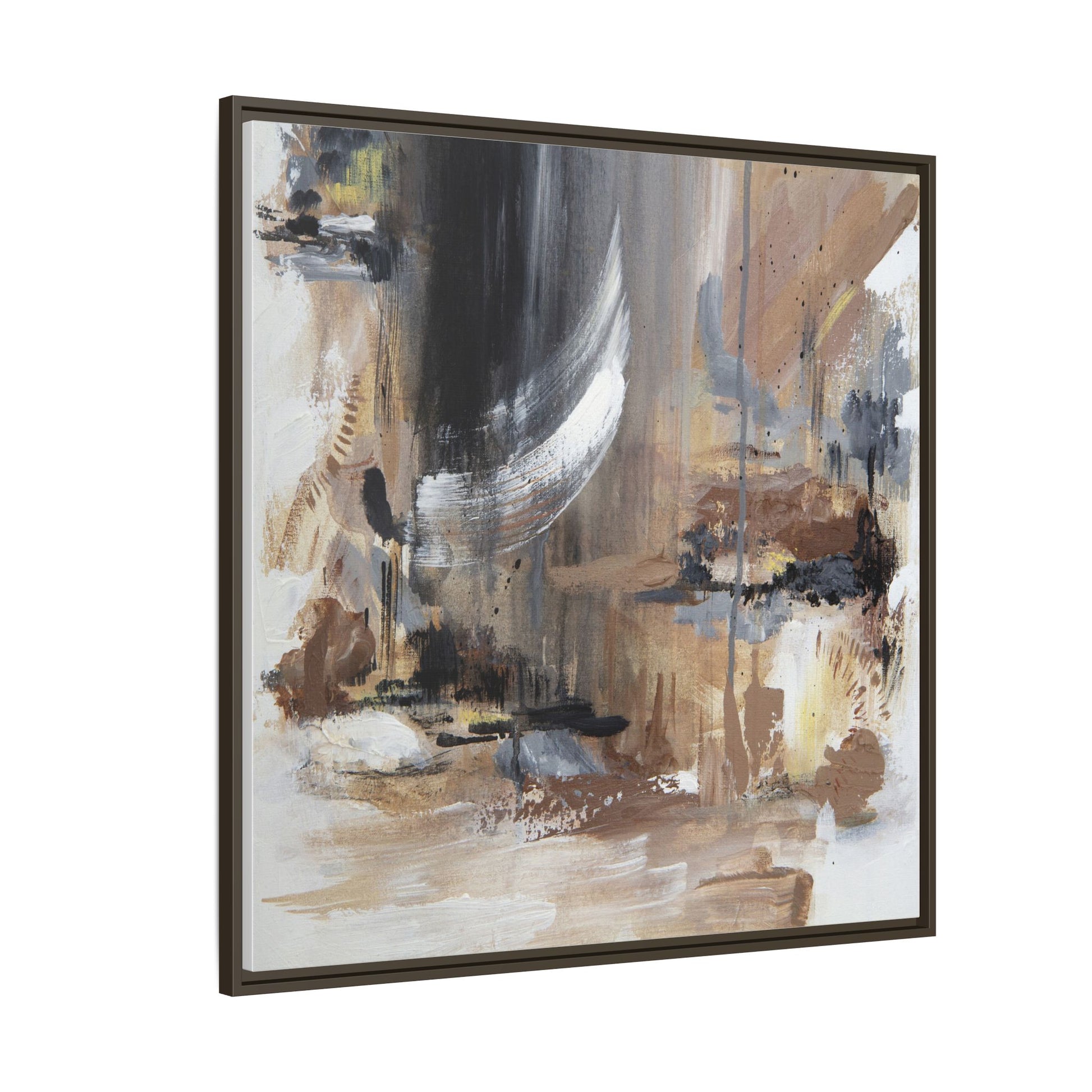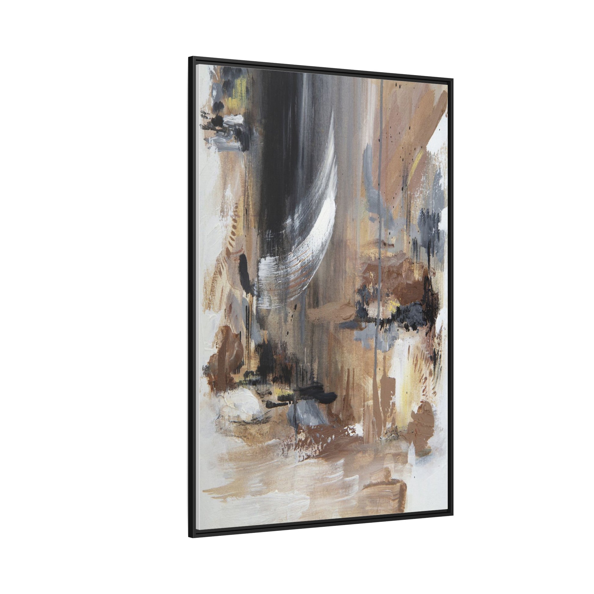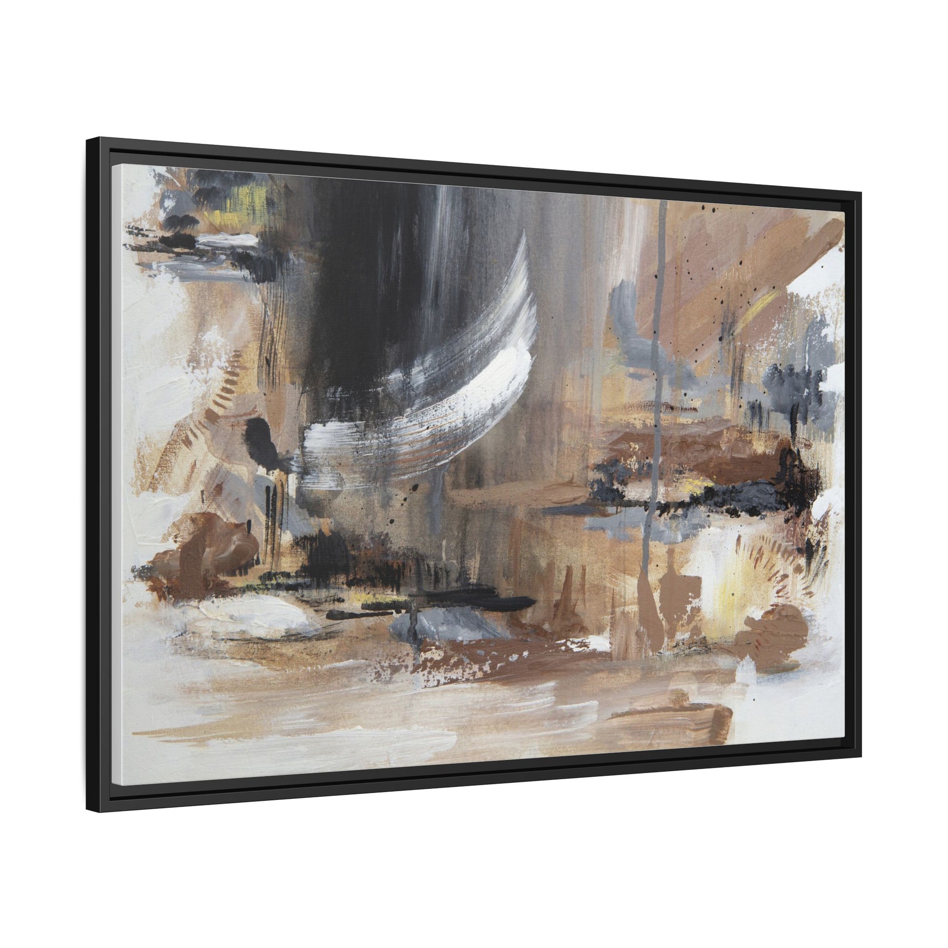 This captivating abstract painting features a dynamic composition of muted earth tones and grayscale colors, blending organic shapes and fluid brushstrokes. A prominent white wing-like form emerges from a dark, swirling background, creating a sense of movement and ethereal energy. The artwork employs a mixed media technique with layers of paint that create depth, texture, and subtle variations in tone, ranging from soft beiges and browns to stark blacks and whites. Drips, splatters, and gestural marks contribute to the painting's emotional and spontaneous feel, suggesting a landscape or dreamscape that exists between representation and abstraction. The overall effect is contemplative and atmospheric, inviting viewers to interpret the image through their own emotional and visual lens.