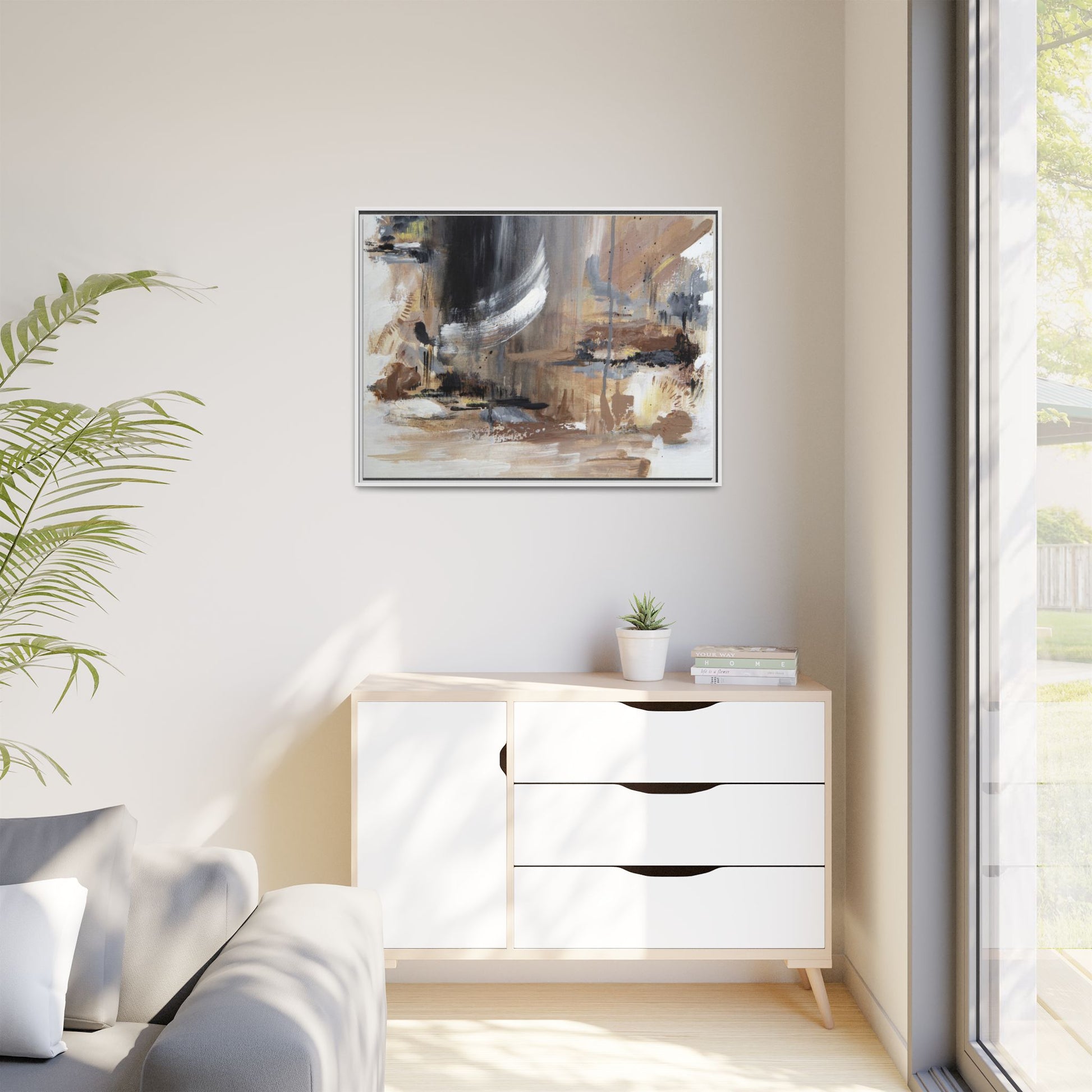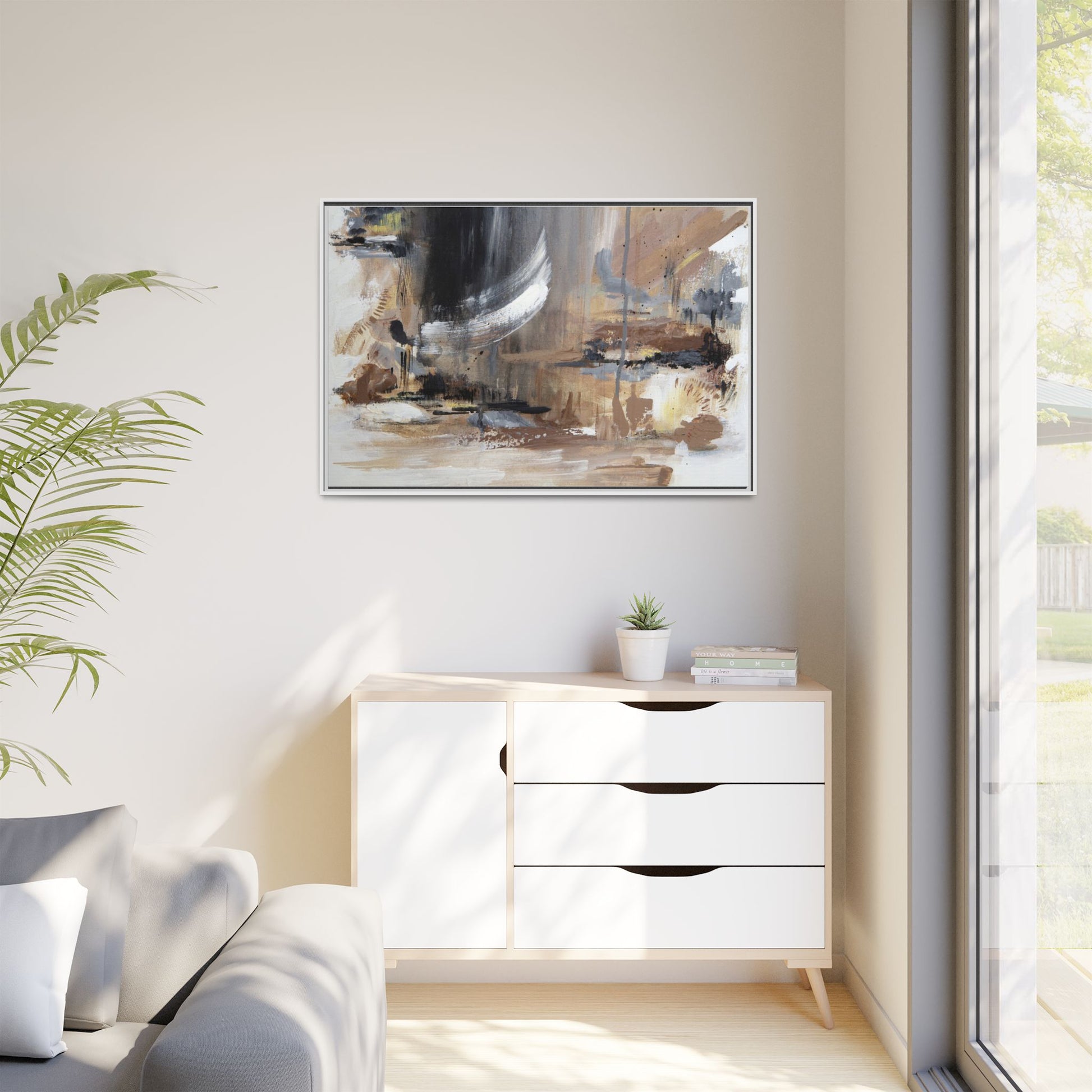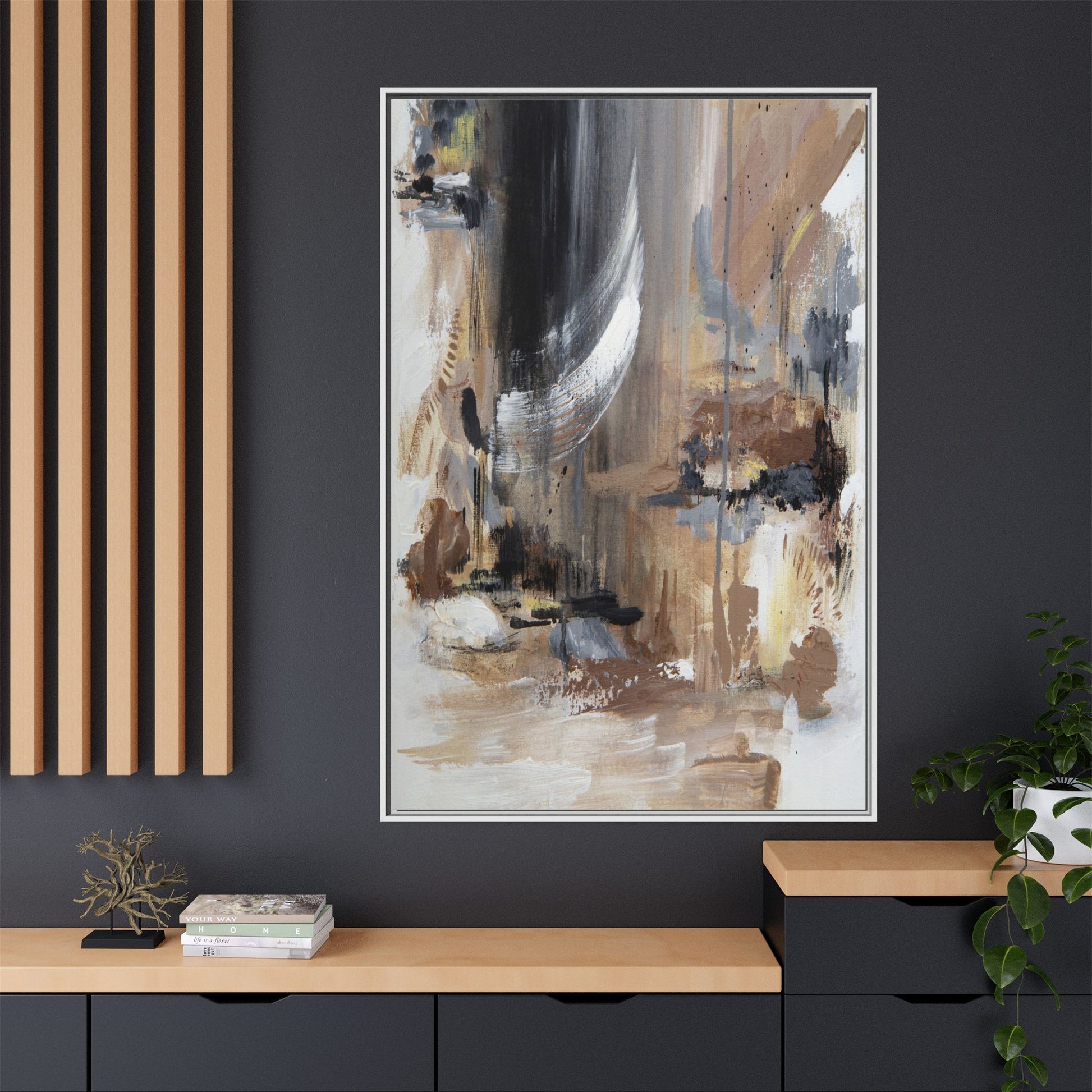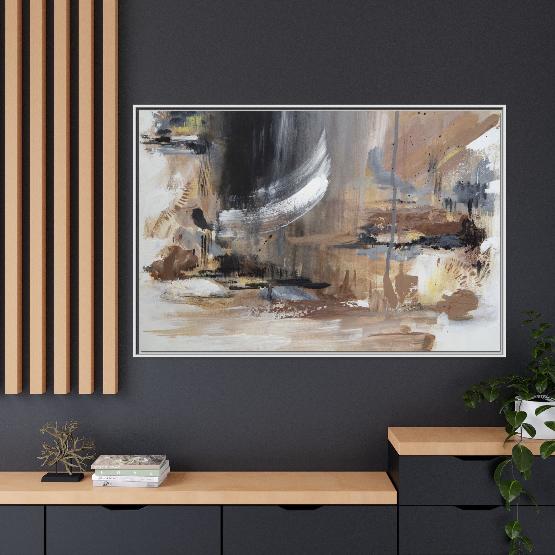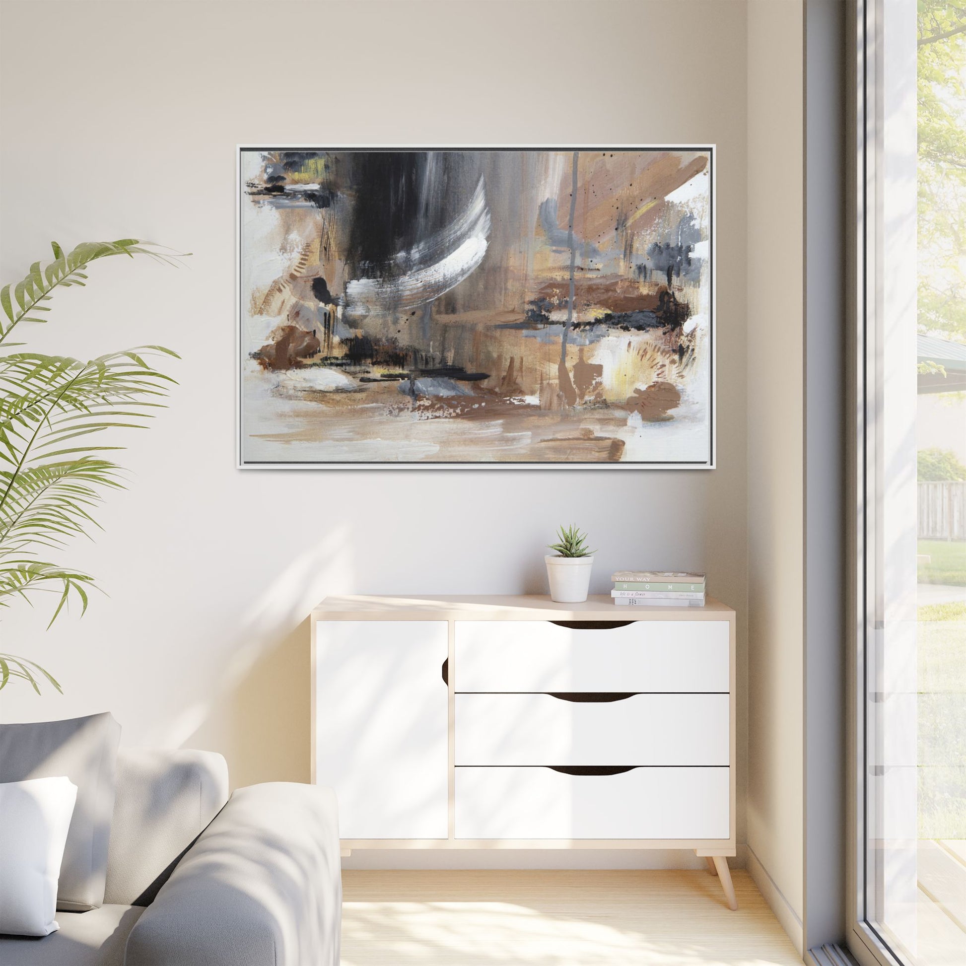 This captivating abstract painting features a dynamic composition of muted earth tones and grayscale colors, blending organic shapes and fluid brushstrokes. A prominent white wing-like form emerges from a dark, swirling background, creating a sense of movement and ethereal energy. The artwork employs a mixed media technique with layers of paint that create depth, texture, and subtle variations in tone, ranging from soft beiges and browns to stark blacks and whites. Drips, splatters, and gestural marks contribute to the painting's emotional and spontaneous feel, suggesting a landscape or dreamscape that exists between representation and abstraction. The overall effect is contemplative and atmospheric, inviting viewers to interpret the image through their own emotional and visual lens.