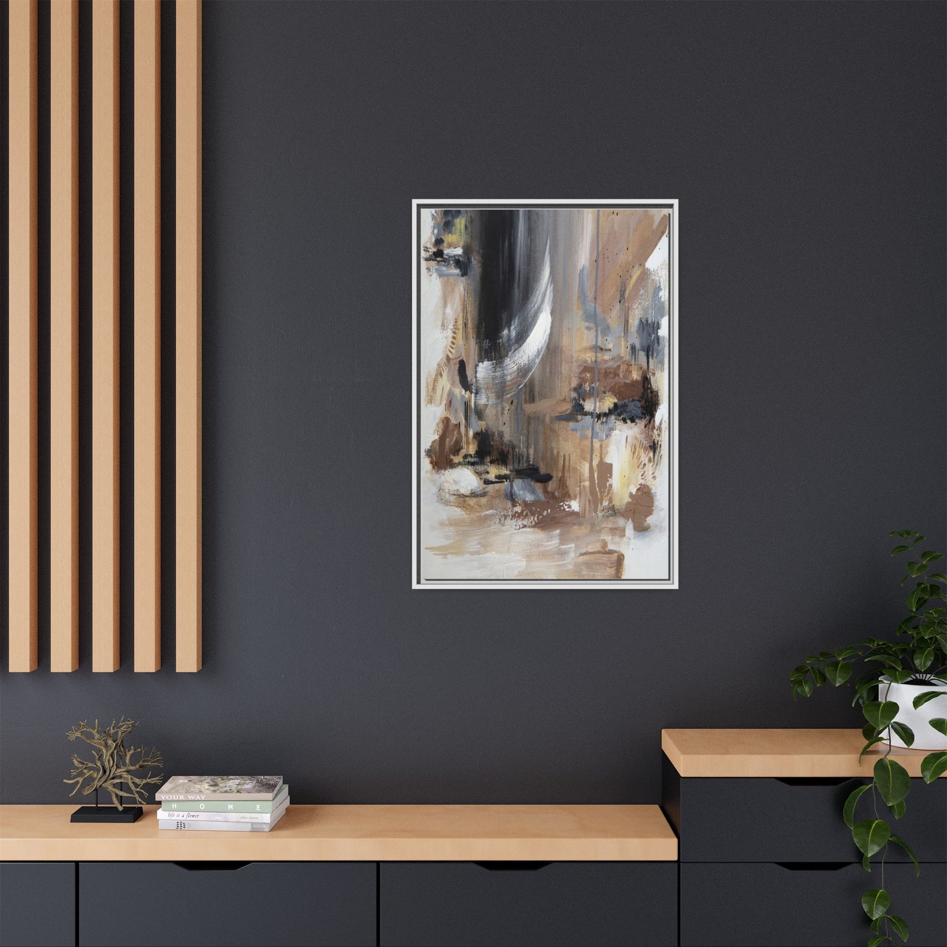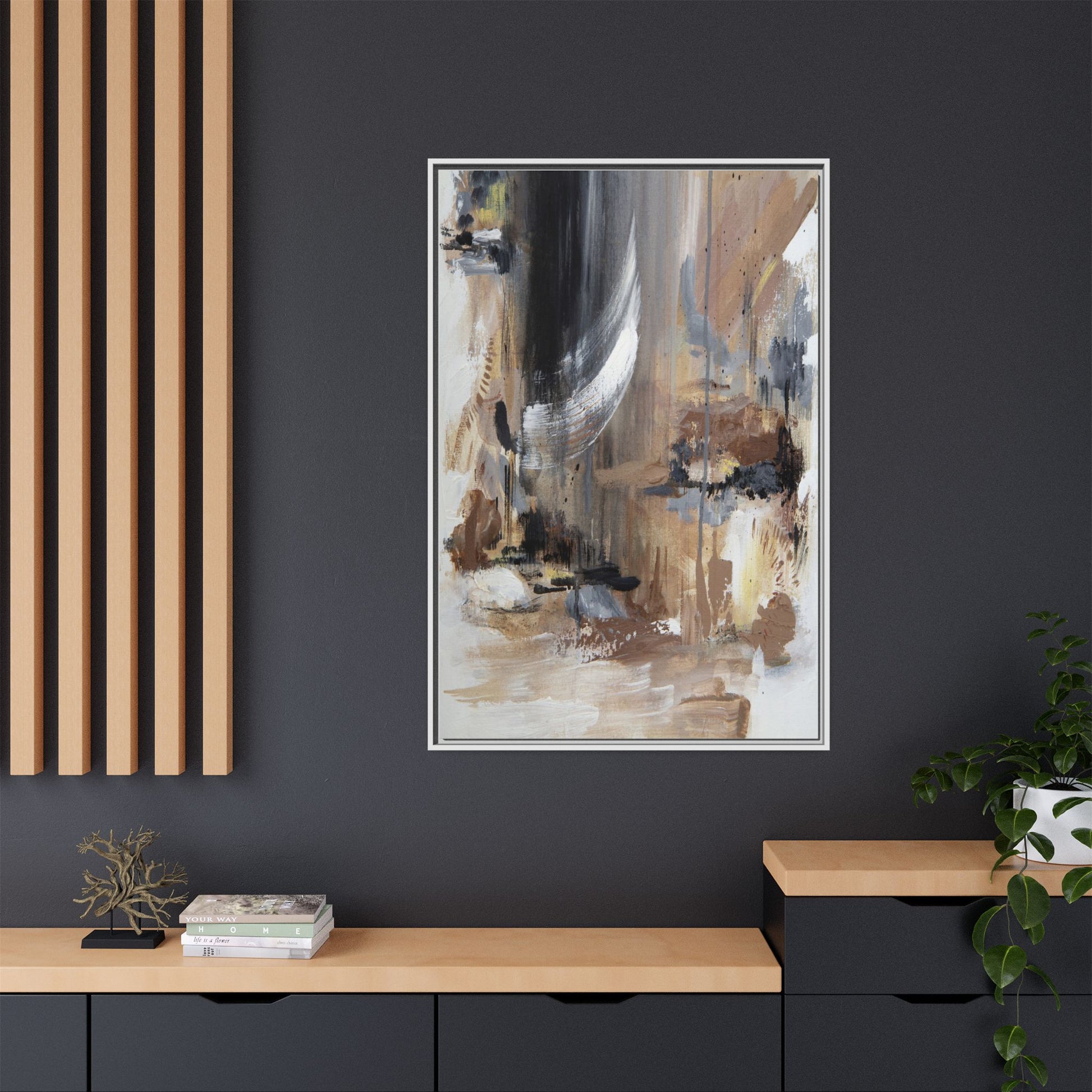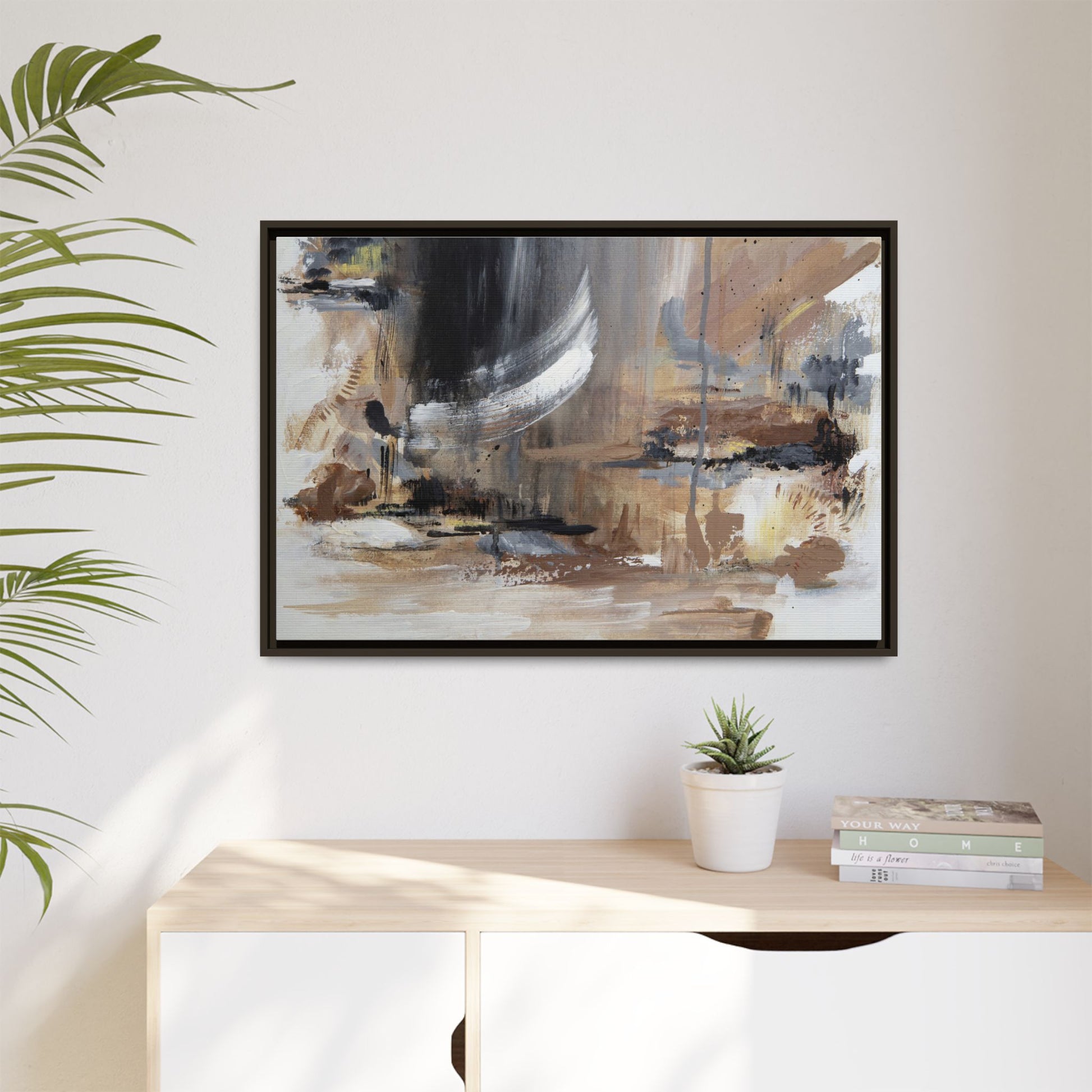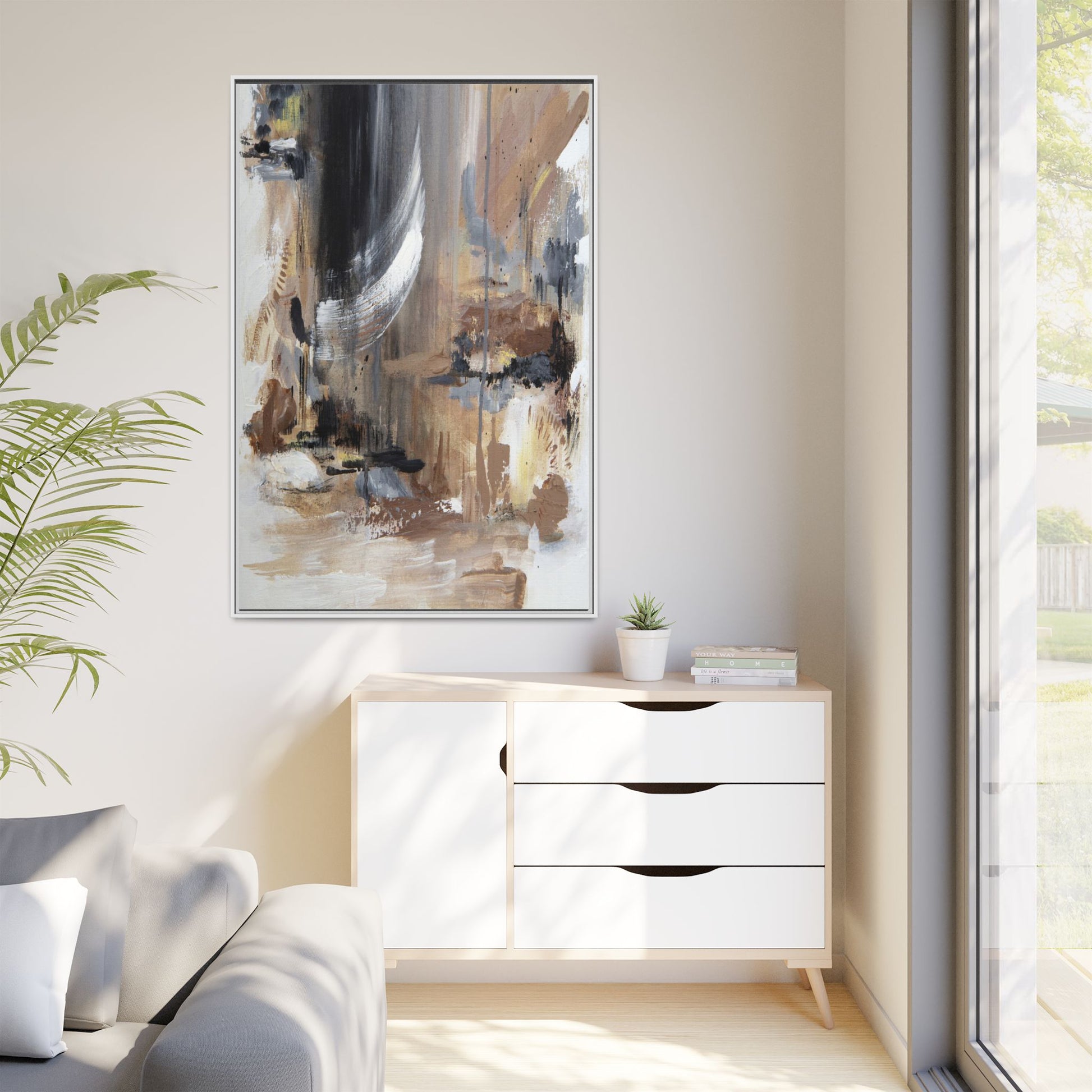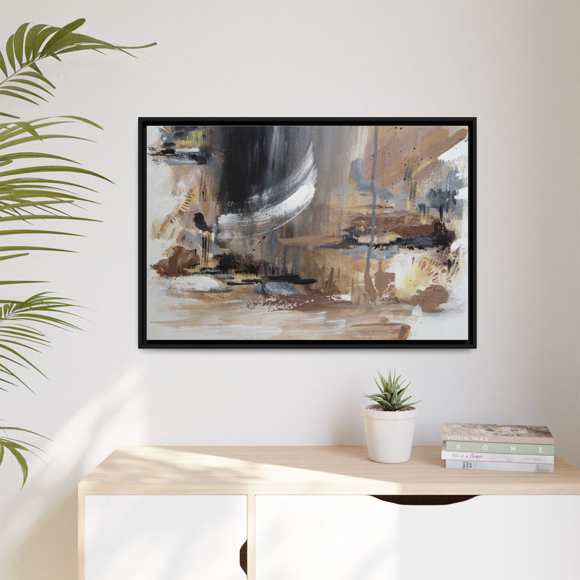 This captivating abstract painting features a dynamic composition of muted earth tones and grayscale colors, blending organic shapes and fluid brushstrokes. A prominent white wing-like form emerges from a dark, swirling background, creating a sense of movement and ethereal energy. The artwork employs a mixed media technique with layers of paint that create depth, texture, and subtle variations in tone, ranging from soft beiges and browns to stark blacks and whites. Drips, splatters, and gestural marks contribute to the painting's emotional and spontaneous feel, suggesting a landscape or dreamscape that exists between representation and abstraction. The overall effect is contemplative and atmospheric, inviting viewers to interpret the image through their own emotional and visual lens.