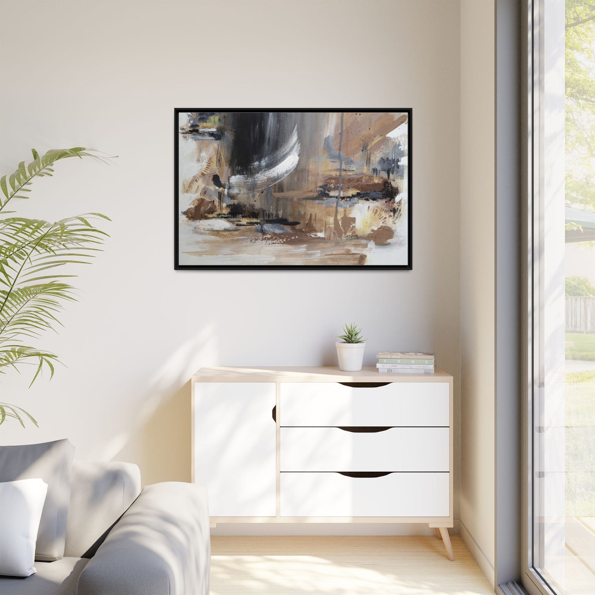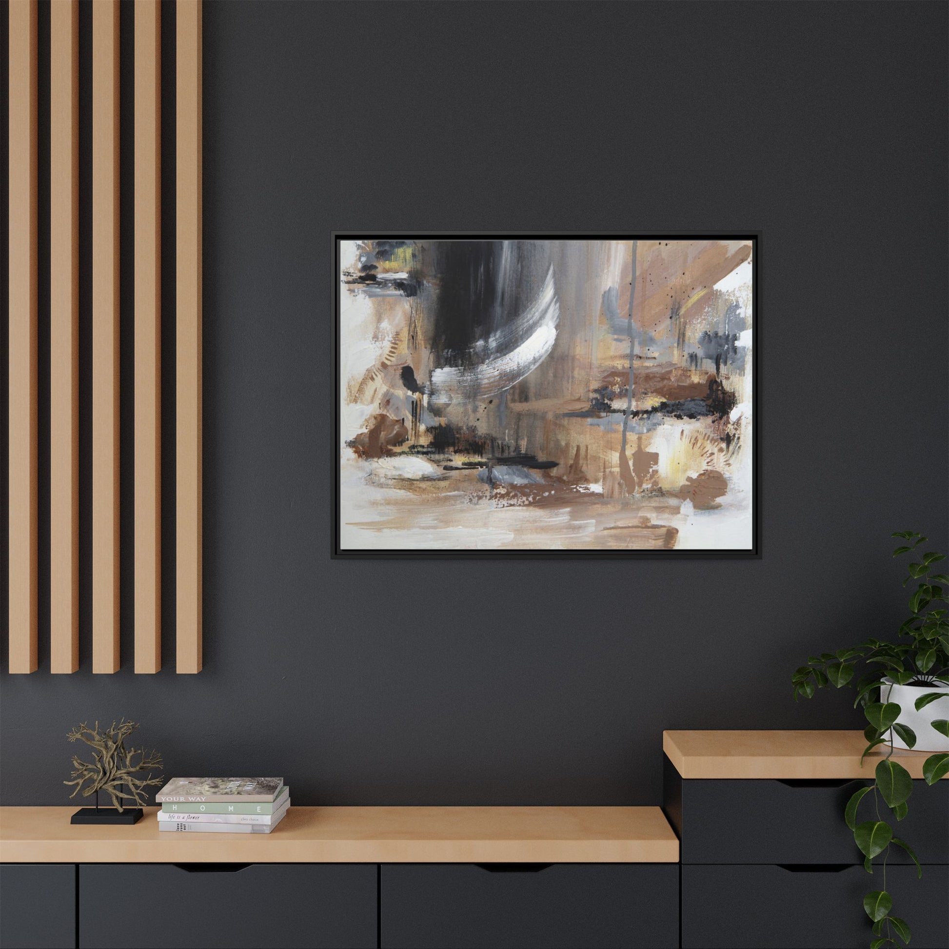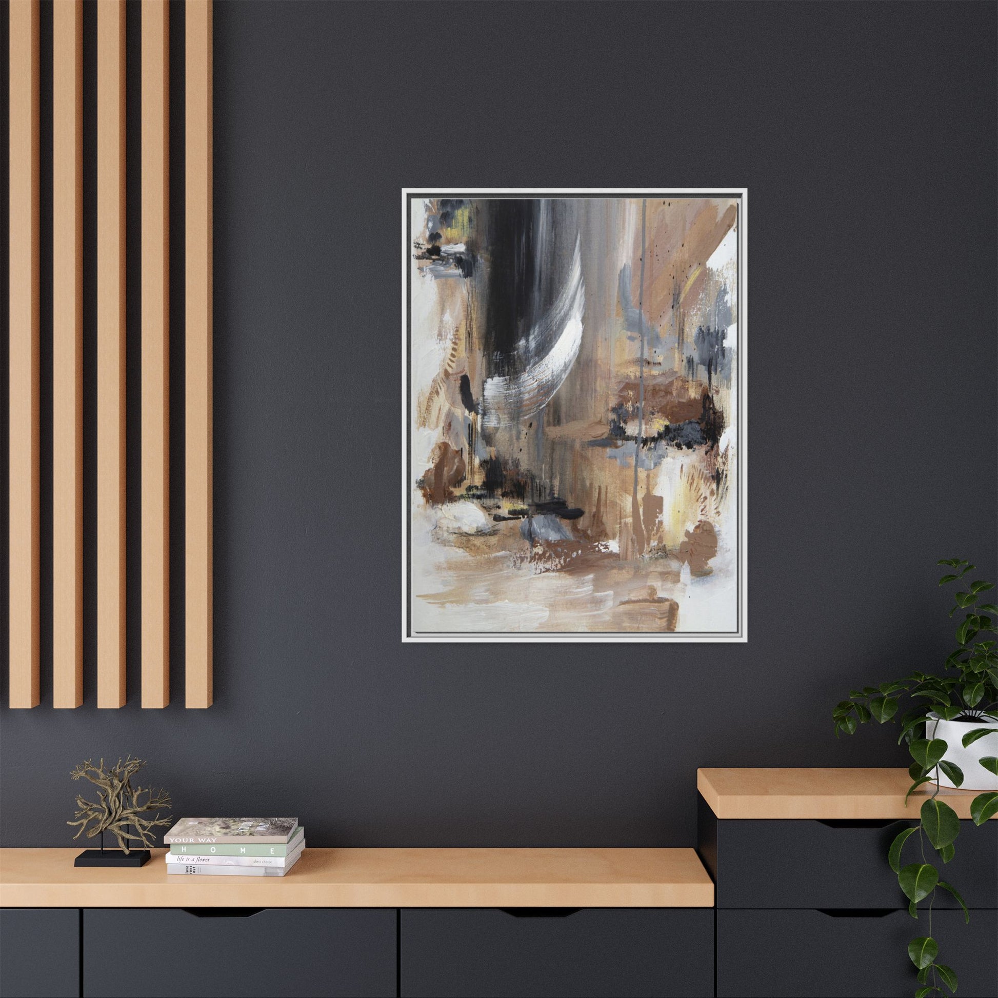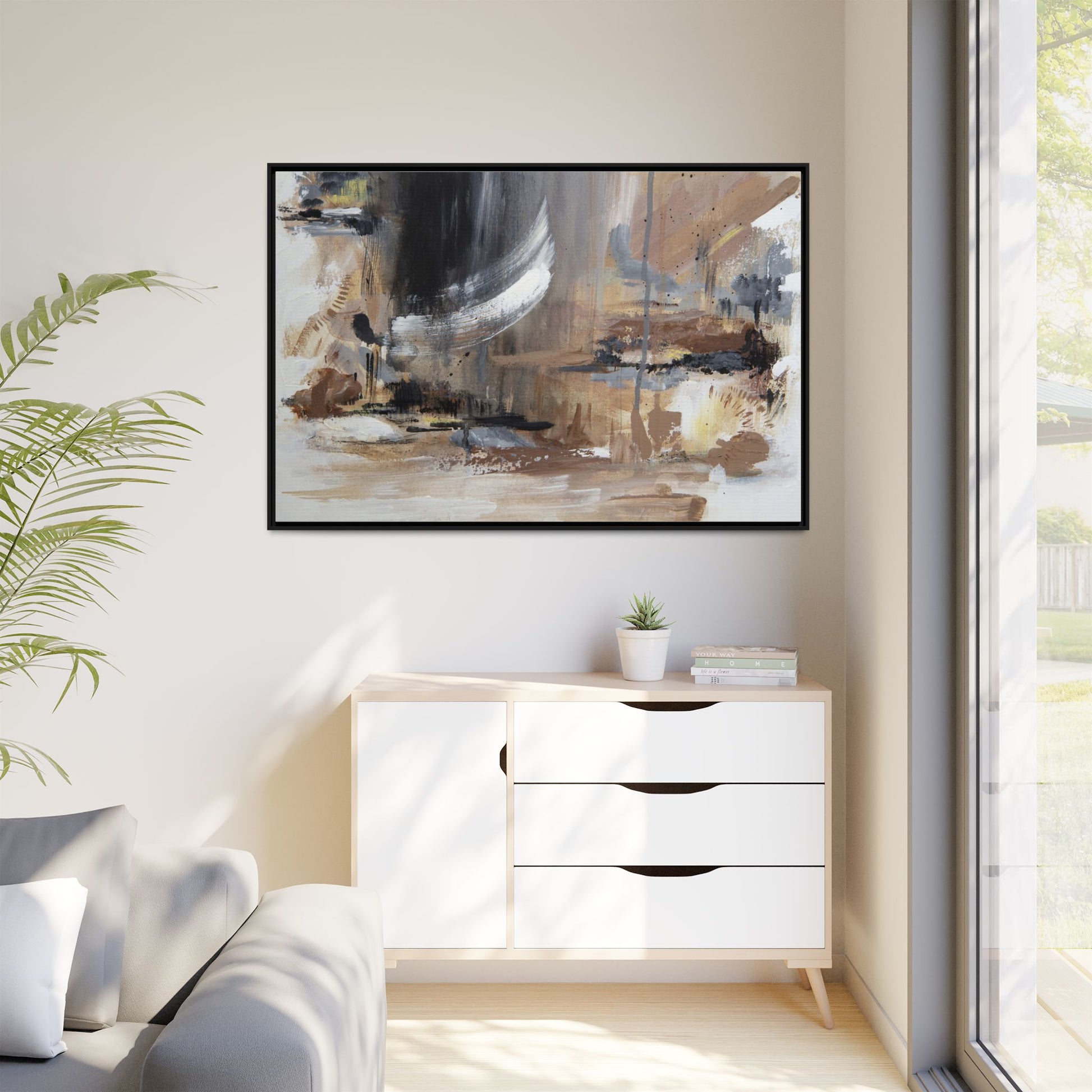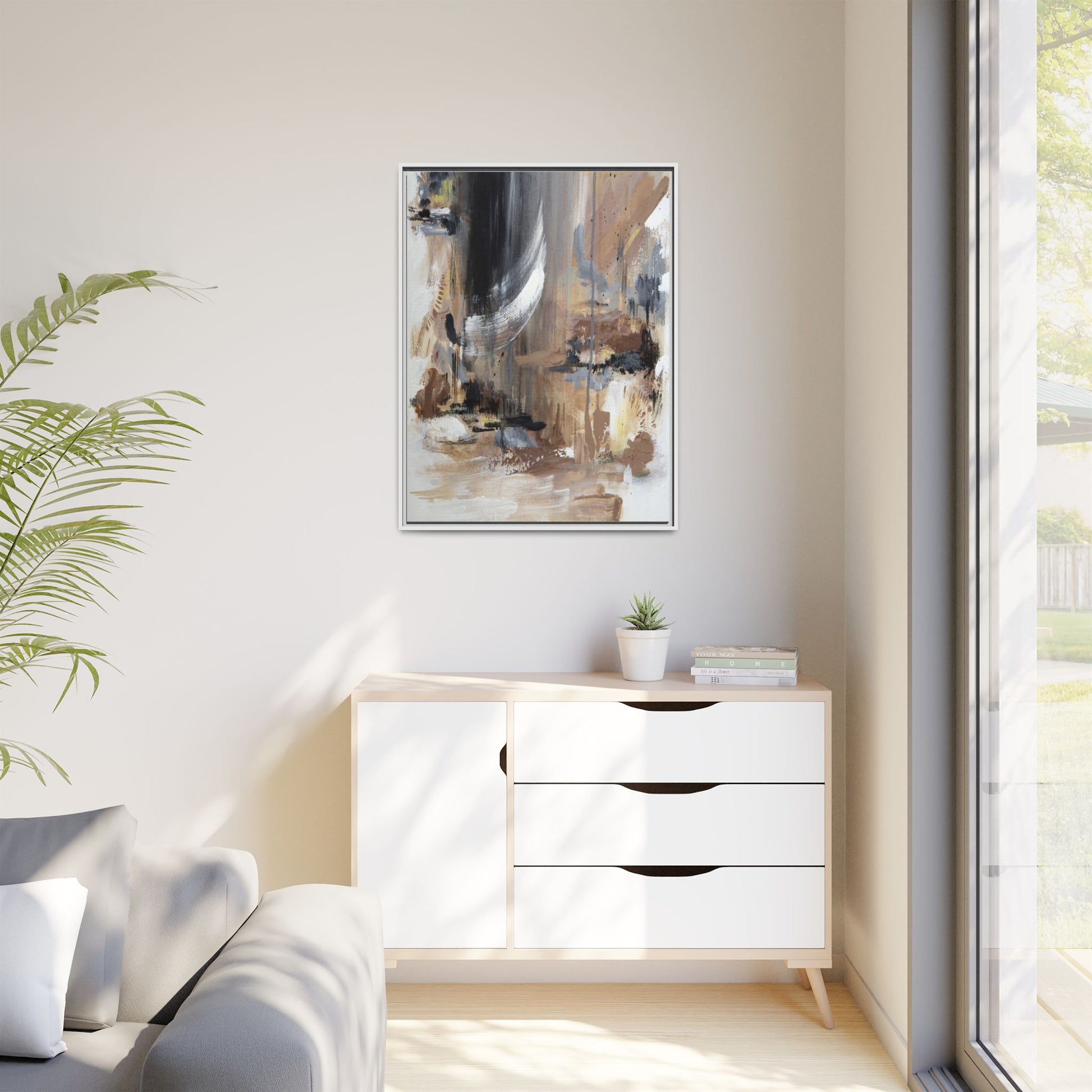 This captivating abstract painting features a dynamic composition of muted earth tones and grayscale colors, blending organic shapes and fluid brushstrokes. A prominent white wing-like form emerges from a dark, swirling background, creating a sense of movement and ethereal energy. The artwork employs a mixed media technique with layers of paint that create depth, texture, and subtle variations in tone, ranging from soft beiges and browns to stark blacks and whites. Drips, splatters, and gestural marks contribute to the painting's emotional and spontaneous feel, suggesting a landscape or dreamscape that exists between representation and abstraction. The overall effect is contemplative and atmospheric, inviting viewers to interpret the image through their own emotional and visual lens.
