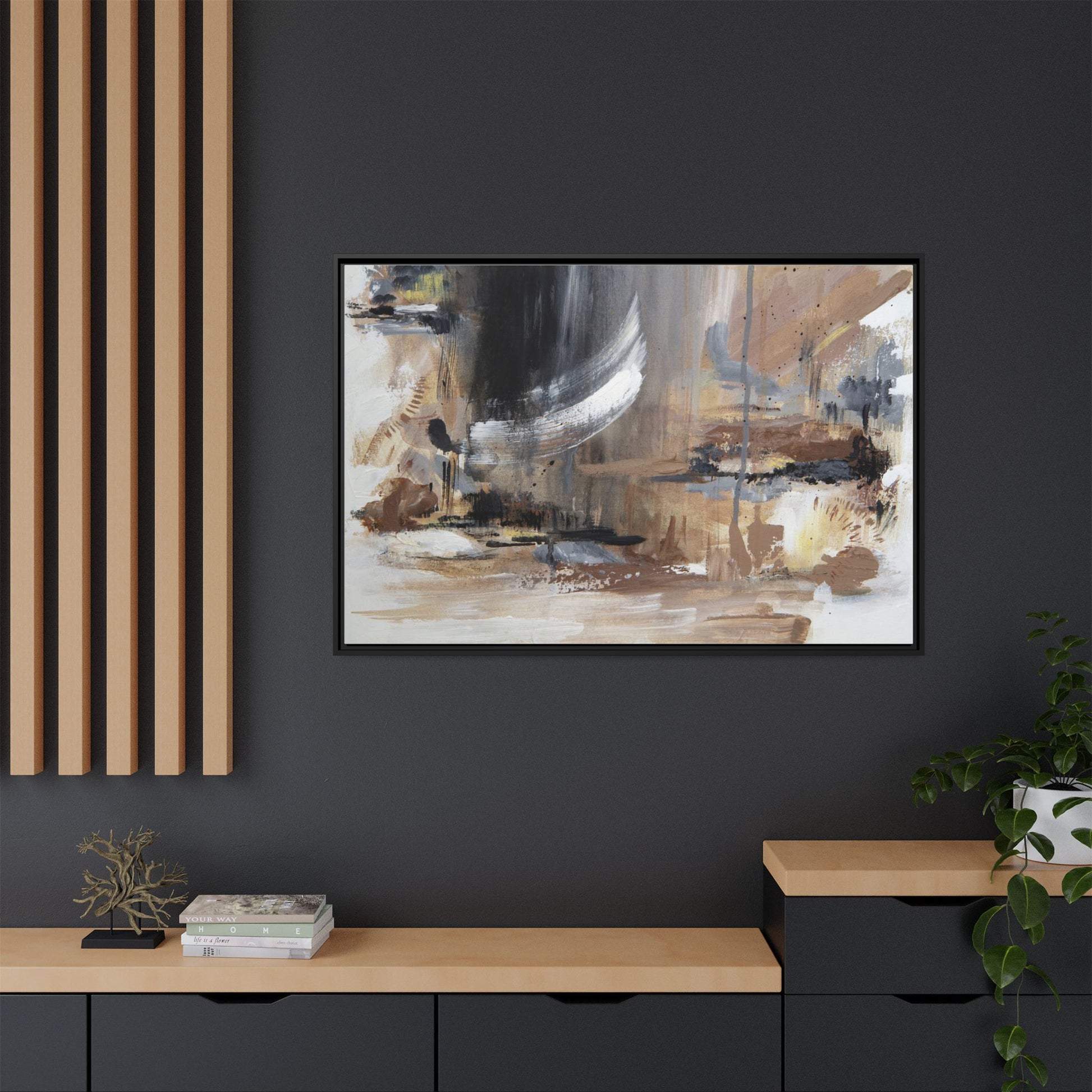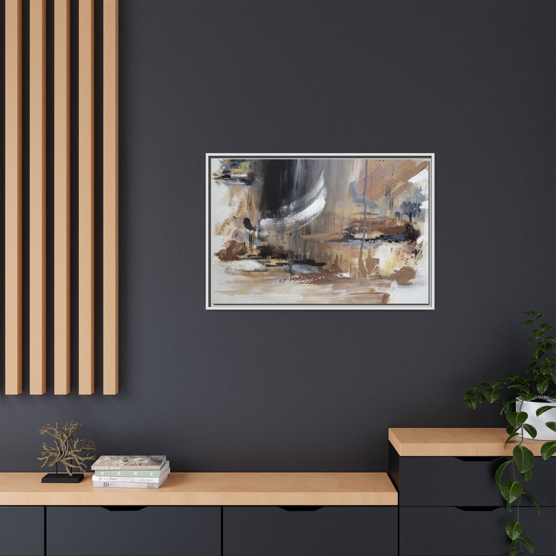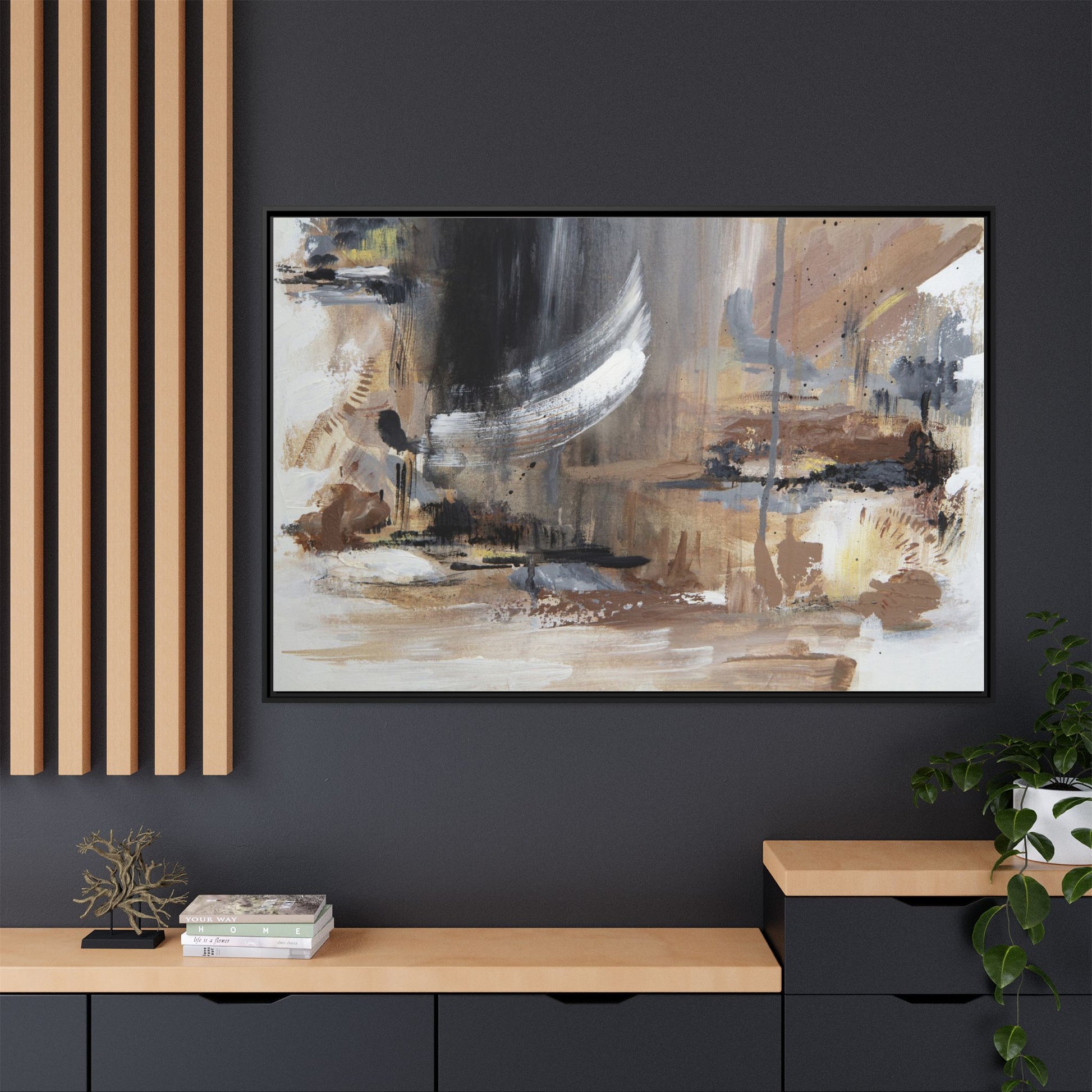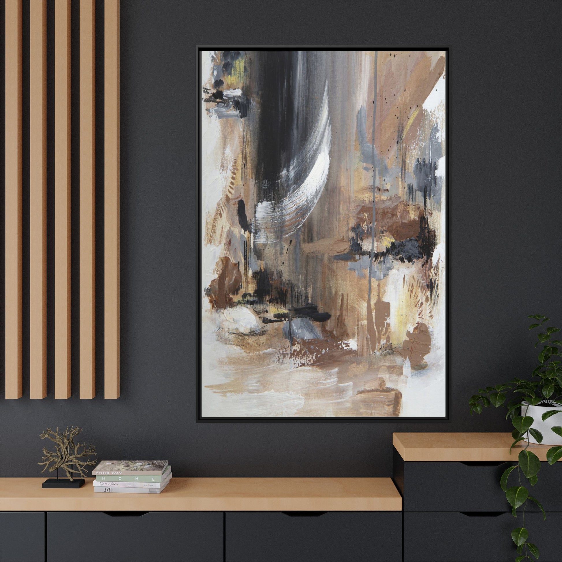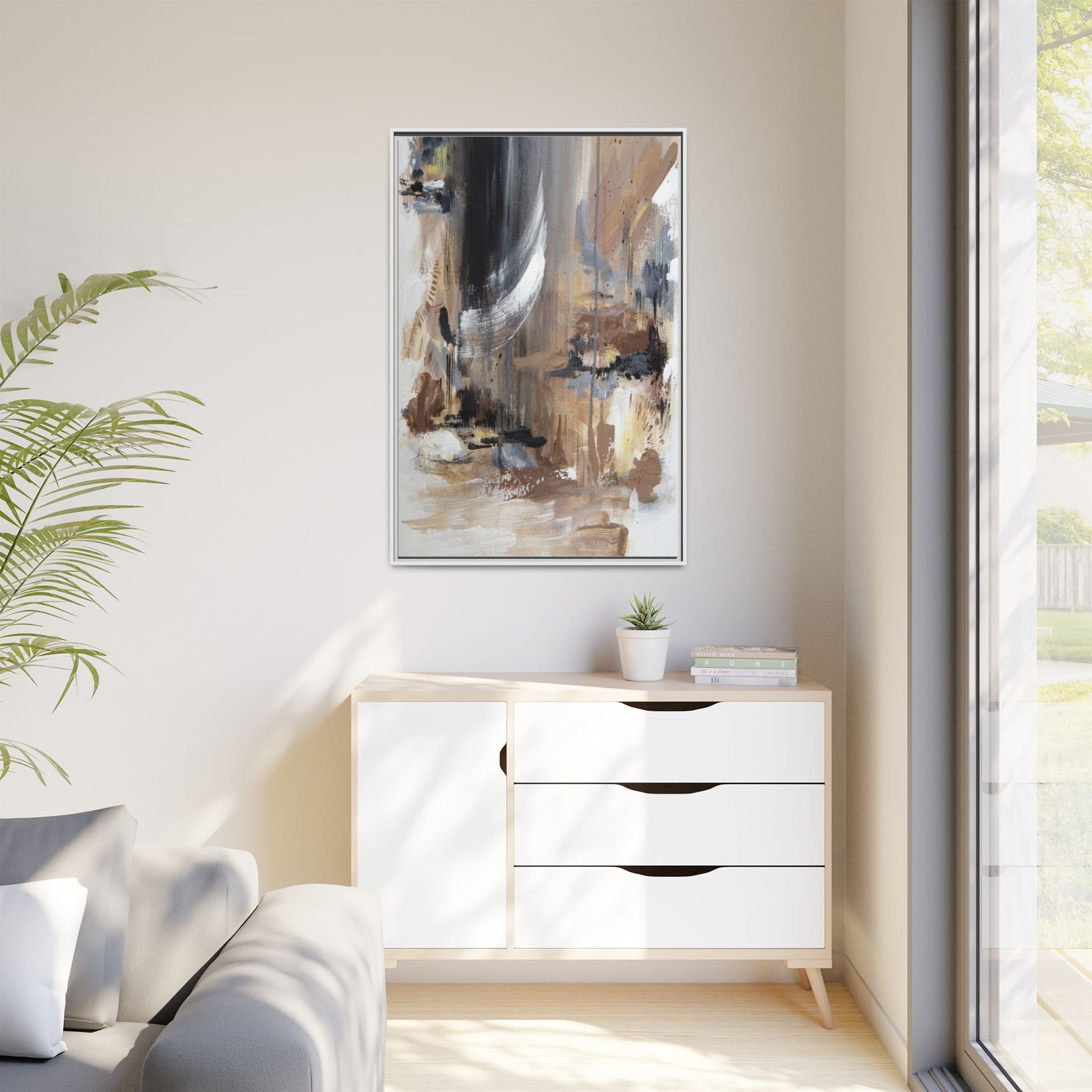 This captivating abstract painting features a dynamic composition of muted earth tones and grayscale colors, blending organic shapes and fluid brushstrokes. A prominent white wing-like form emerges from a dark, swirling background, creating a sense of movement and ethereal energy. The artwork employs a mixed media technique with layers of paint that create depth, texture, and subtle variations in tone, ranging from soft beiges and browns to stark blacks and whites. Drips, splatters, and gestural marks contribute to the painting's emotional and spontaneous feel, suggesting a landscape or dreamscape that exists between representation and abstraction. The overall effect is contemplative and atmospheric, inviting viewers to interpret the image through their own emotional and visual lens.