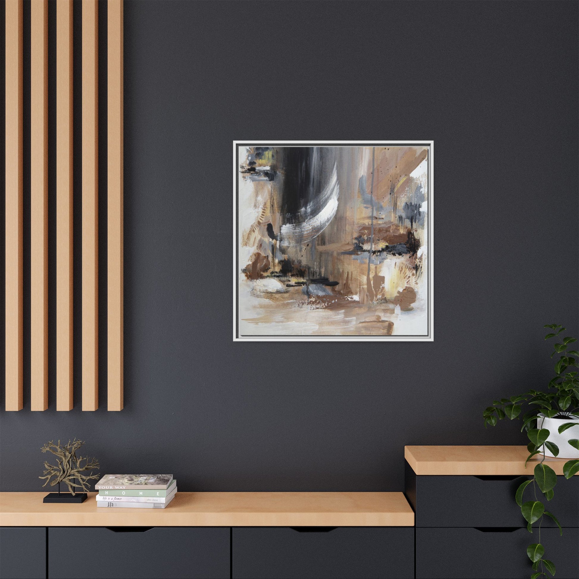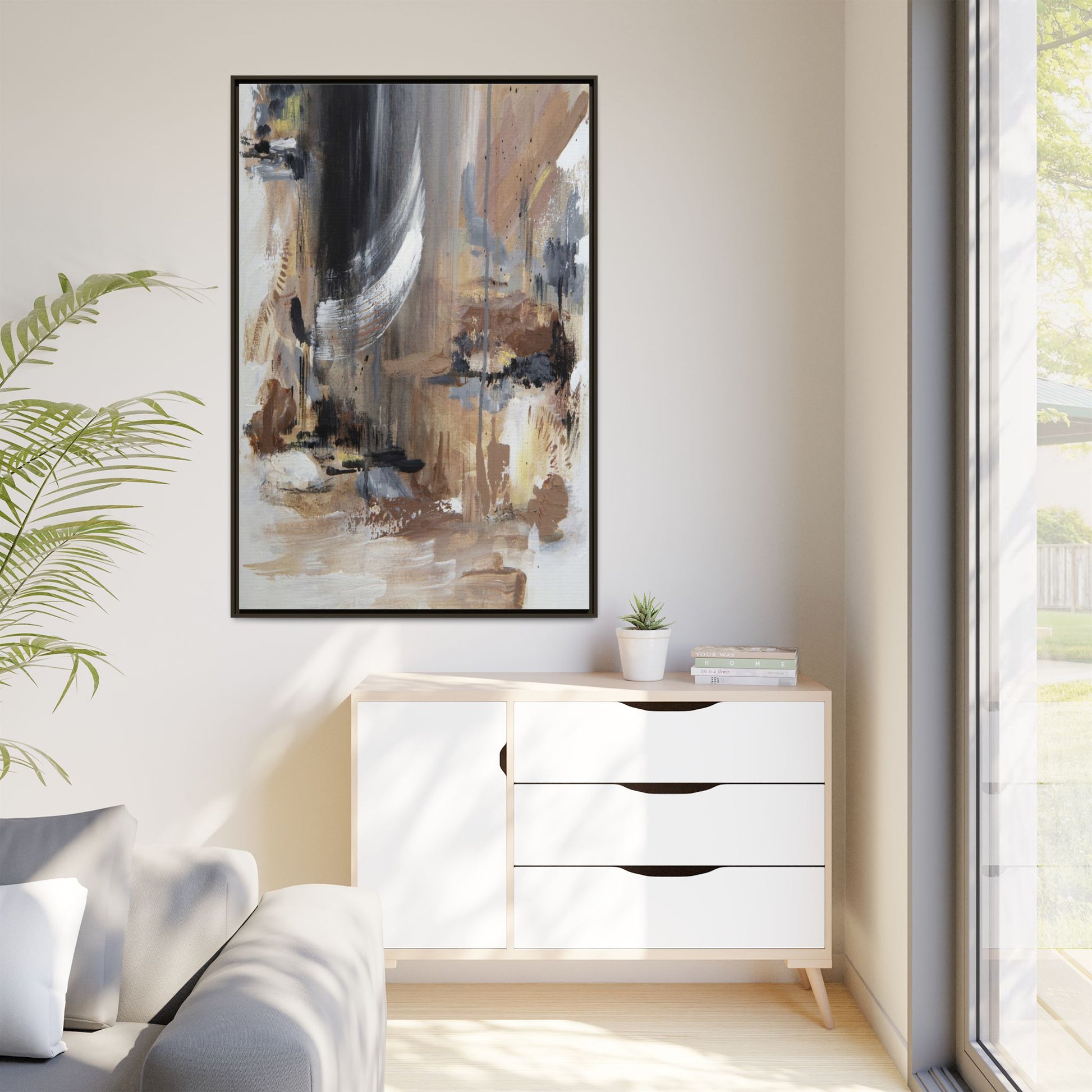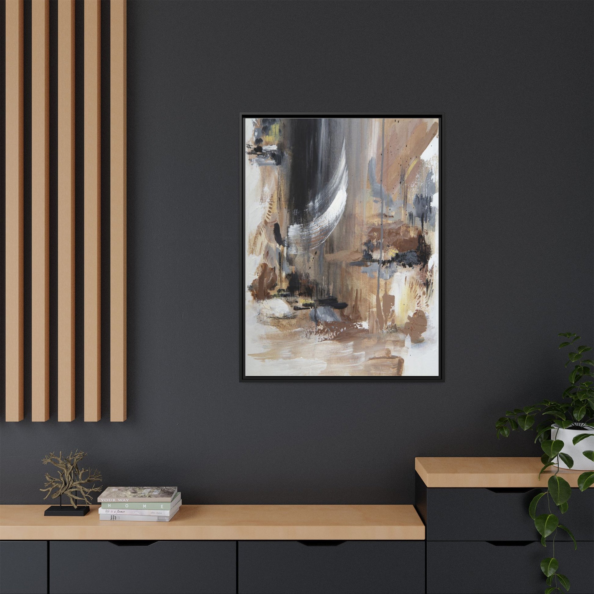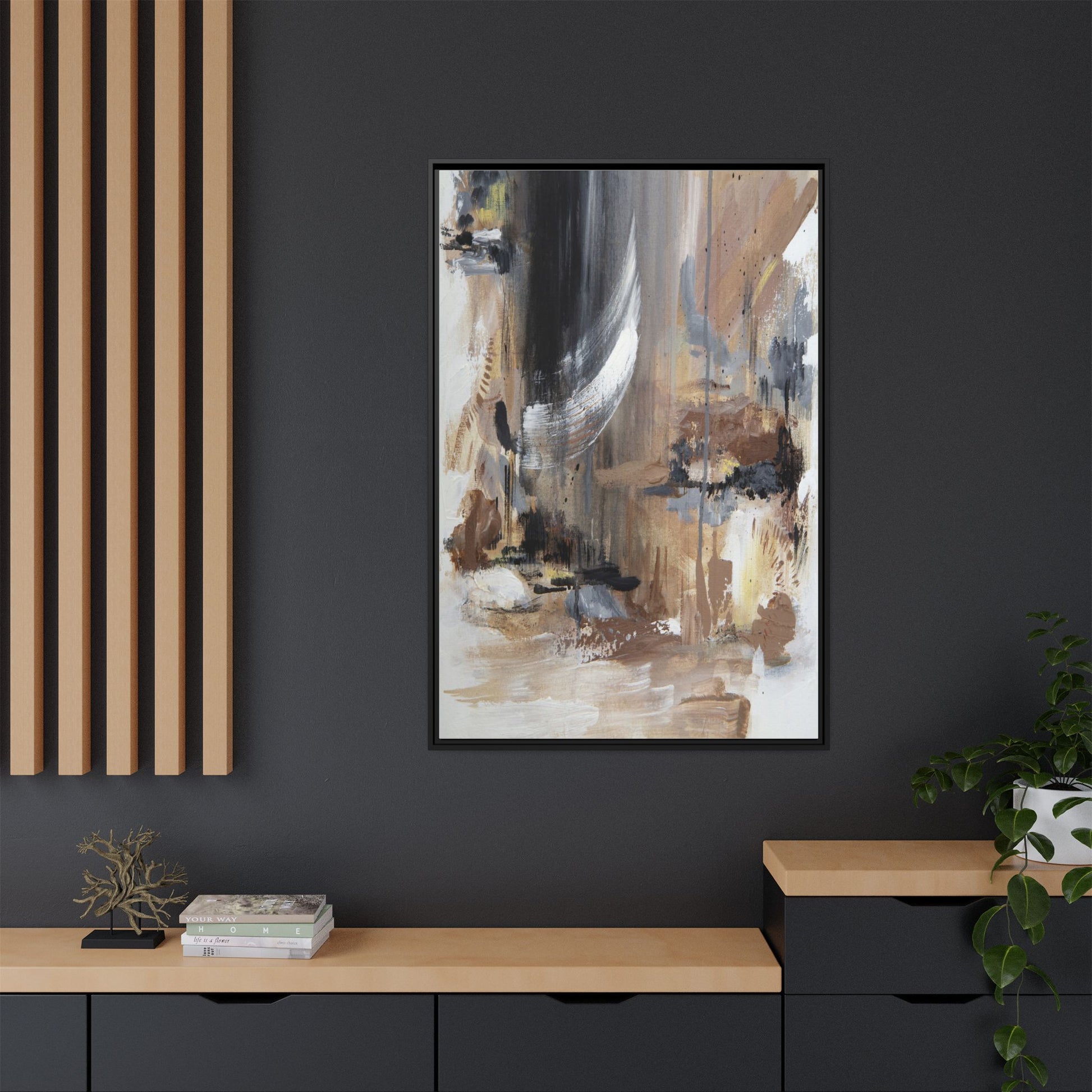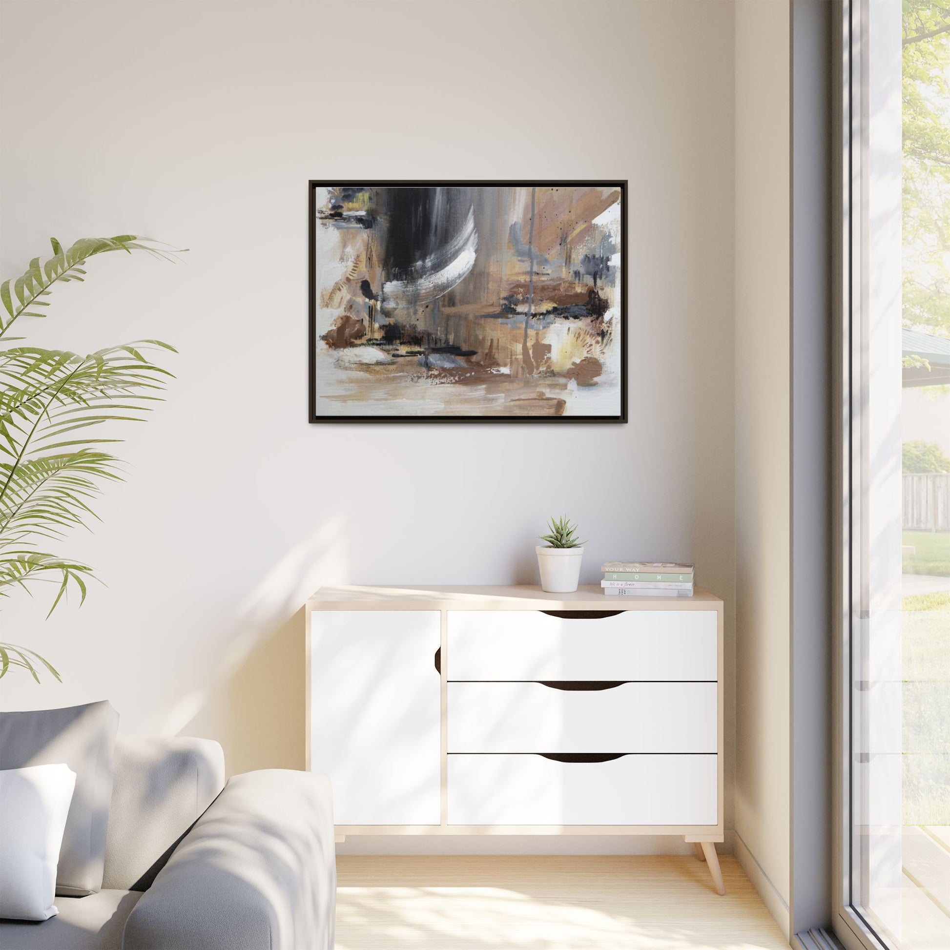 This captivating abstract painting features a dynamic composition of muted earth tones and grayscale colors, blending organic shapes and fluid brushstrokes. A prominent white wing-like form emerges from a dark, swirling background, creating a sense of movement and ethereal energy. The artwork employs a mixed media technique with layers of paint that create depth, texture, and subtle variations in tone, ranging from soft beiges and browns to stark blacks and whites. Drips, splatters, and gestural marks contribute to the painting's emotional and spontaneous feel, suggesting a landscape or dreamscape that exists between representation and abstraction. The overall effect is contemplative and atmospheric, inviting viewers to interpret the image through their own emotional and visual lens.
