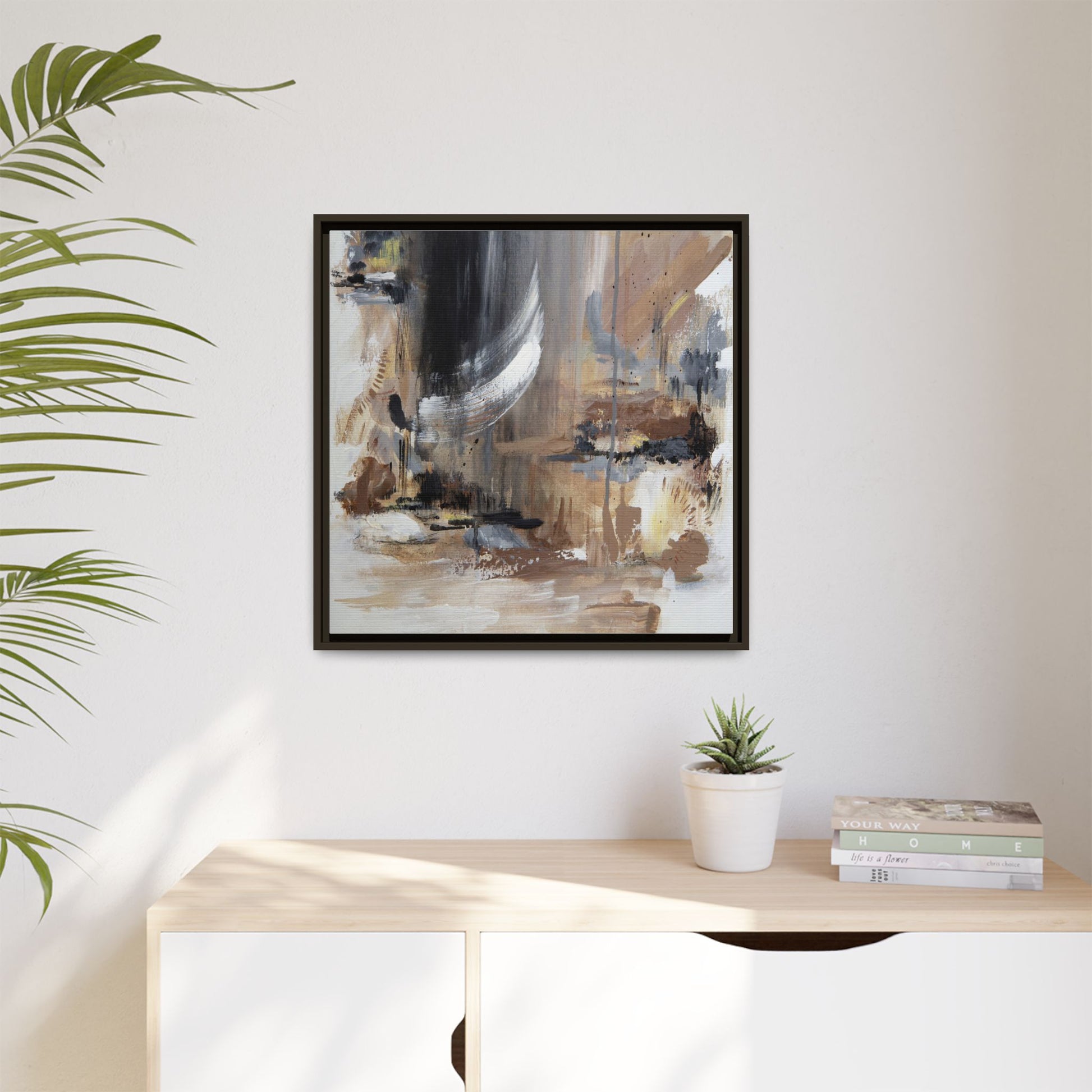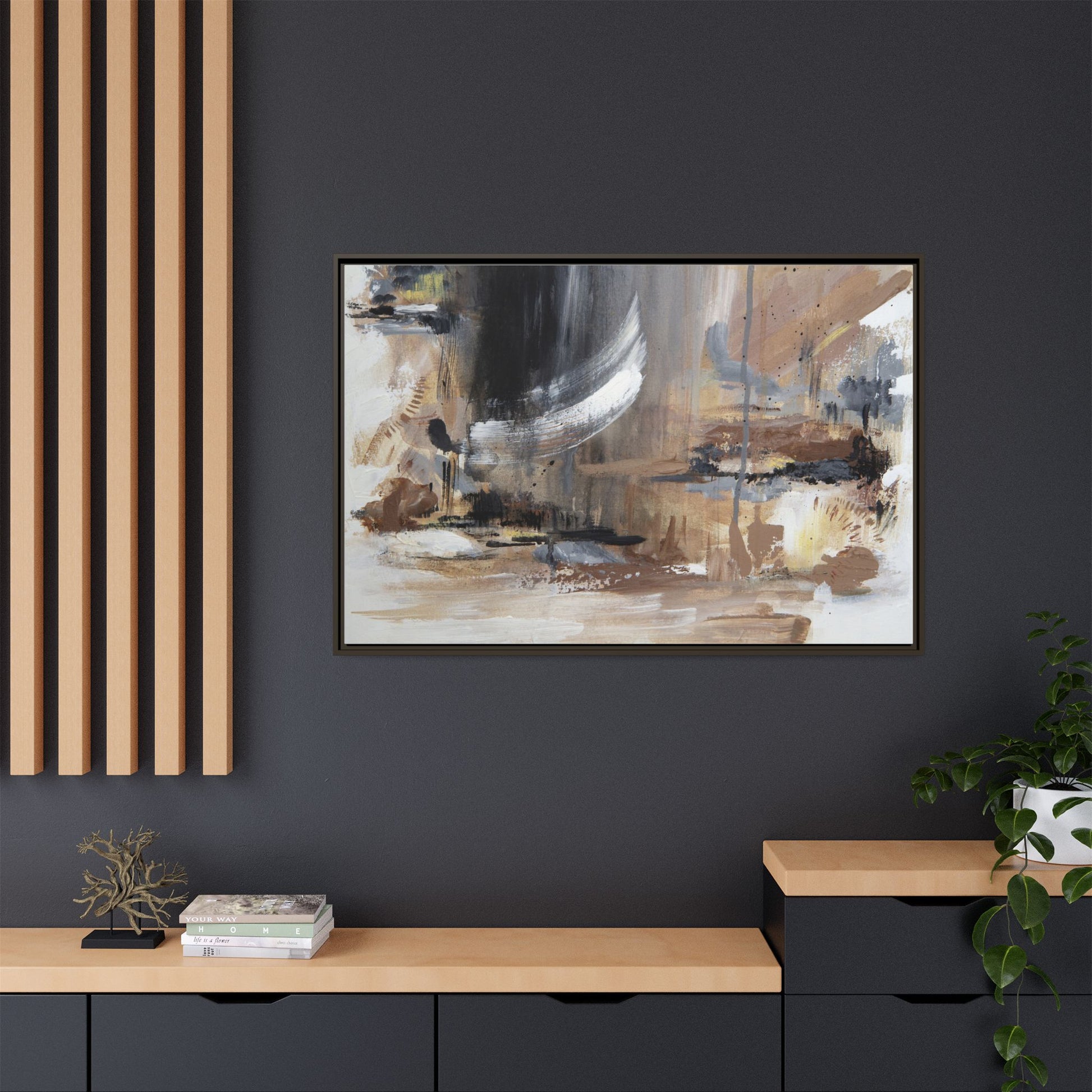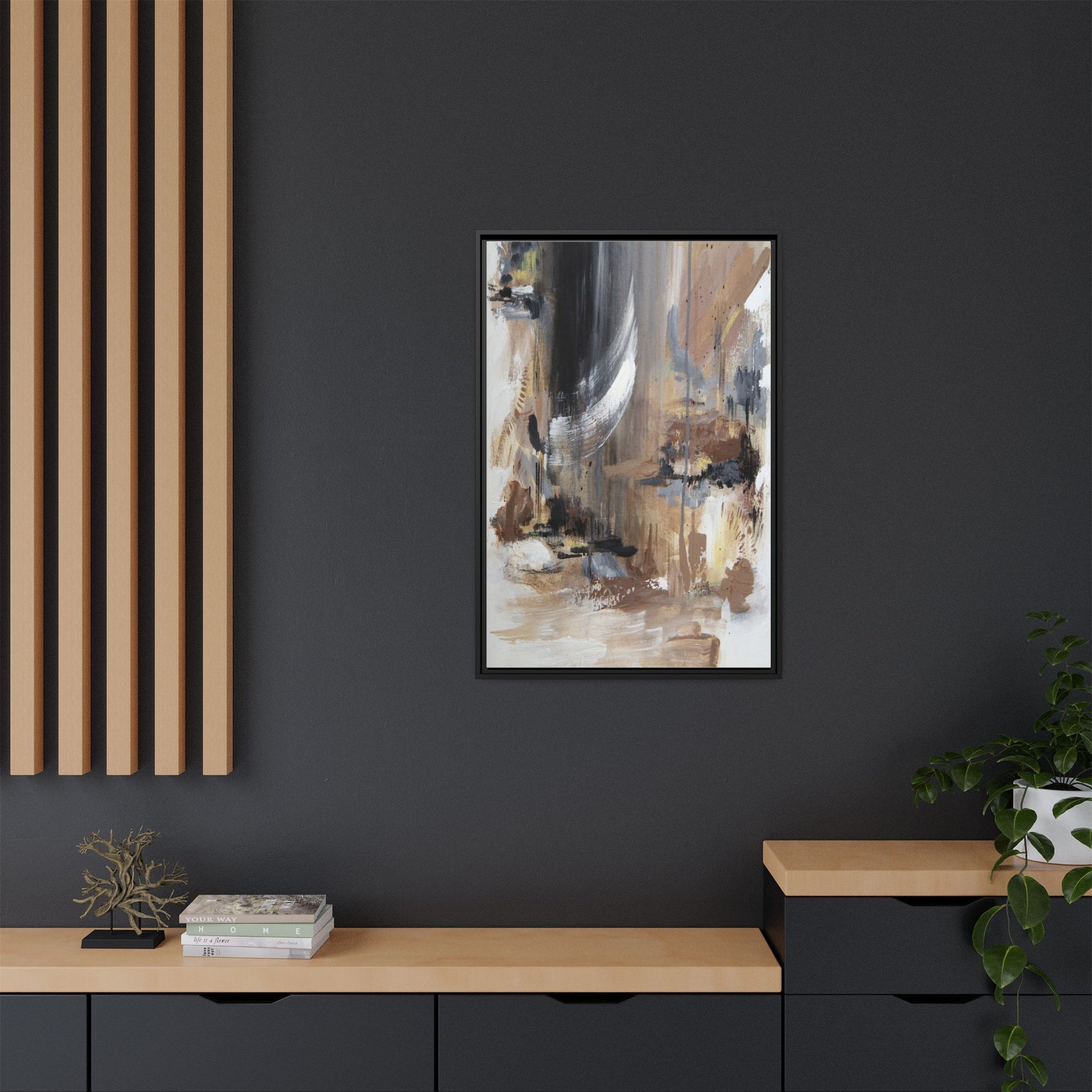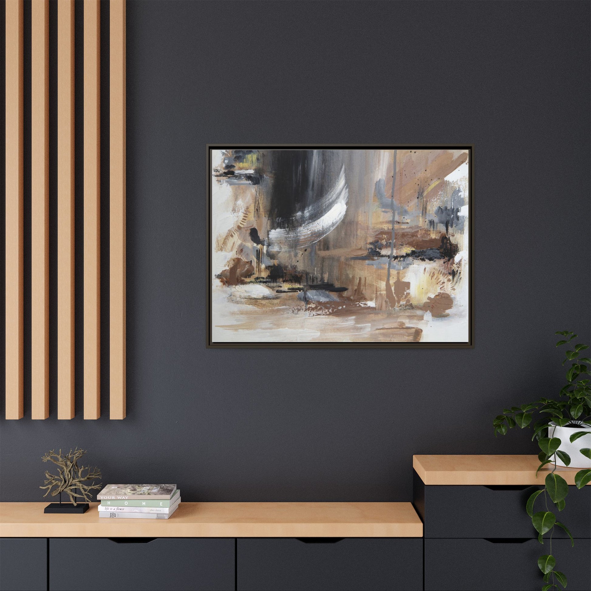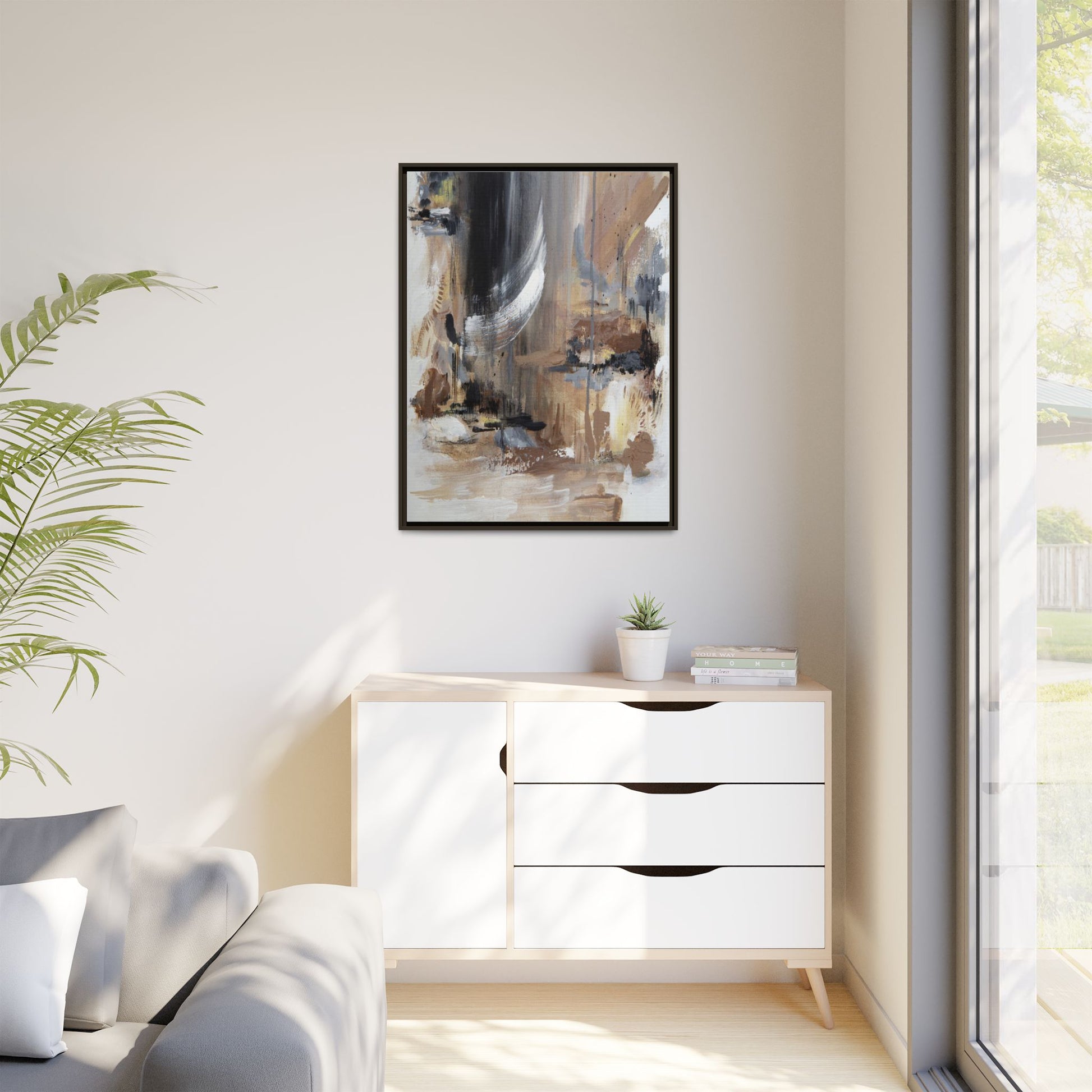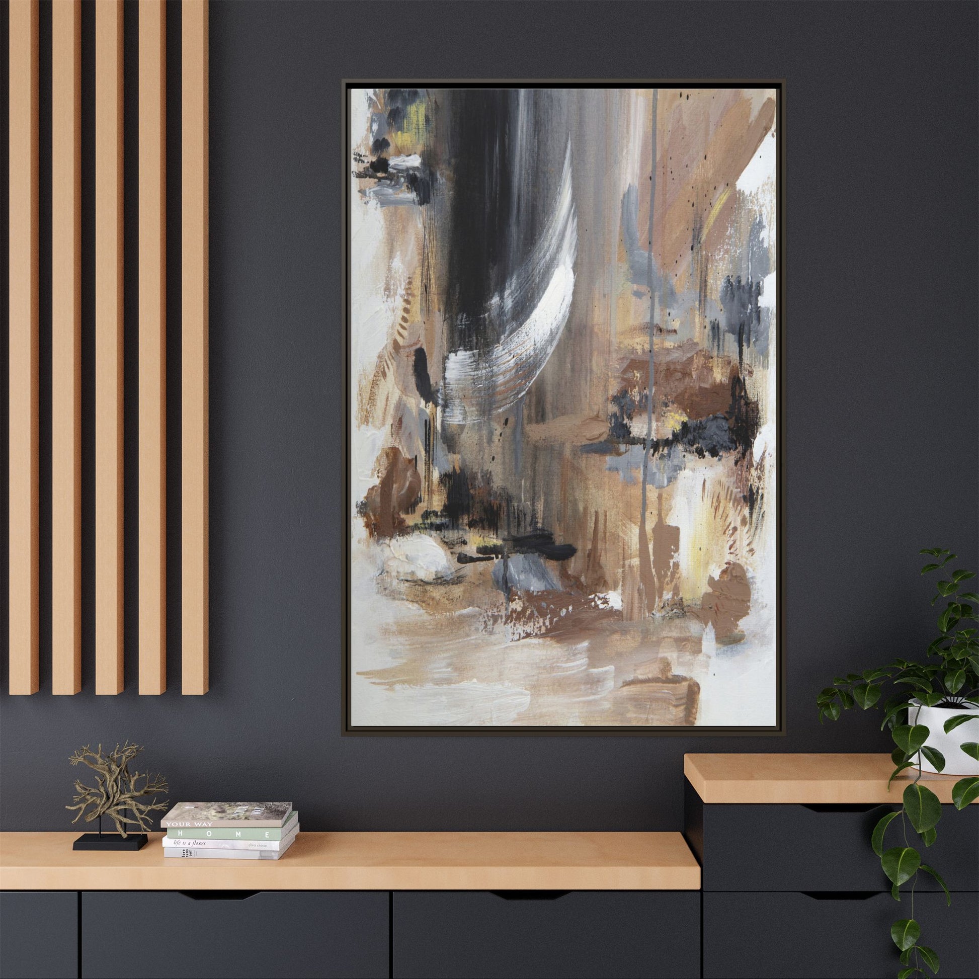 This captivating abstract painting features a dynamic composition of muted earth tones and grayscale colors, blending organic shapes and fluid brushstrokes. A prominent white wing-like form emerges from a dark, swirling background, creating a sense of movement and ethereal energy. The artwork employs a mixed media technique with layers of paint that create depth, texture, and subtle variations in tone, ranging from soft beiges and browns to stark blacks and whites. Drips, splatters, and gestural marks contribute to the painting's emotional and spontaneous feel, suggesting a landscape or dreamscape that exists between representation and abstraction. The overall effect is contemplative and atmospheric, inviting viewers to interpret the image through their own emotional and visual lens.